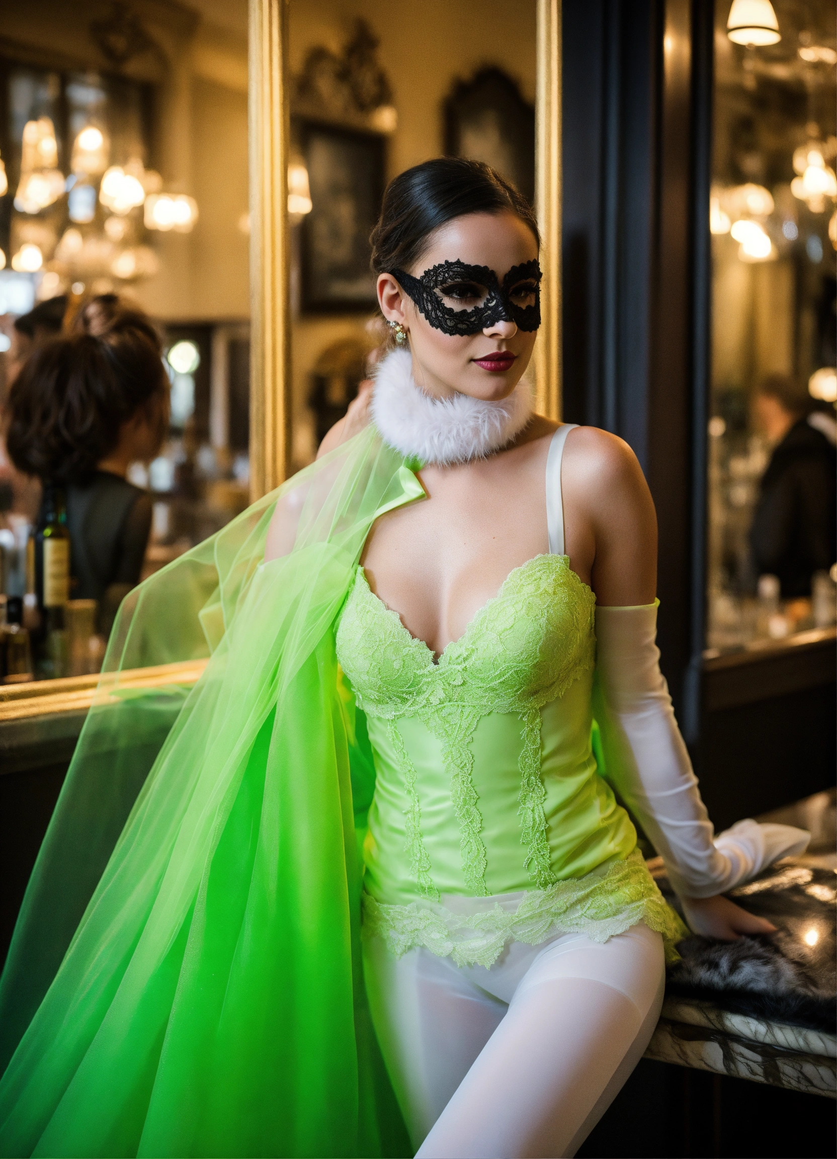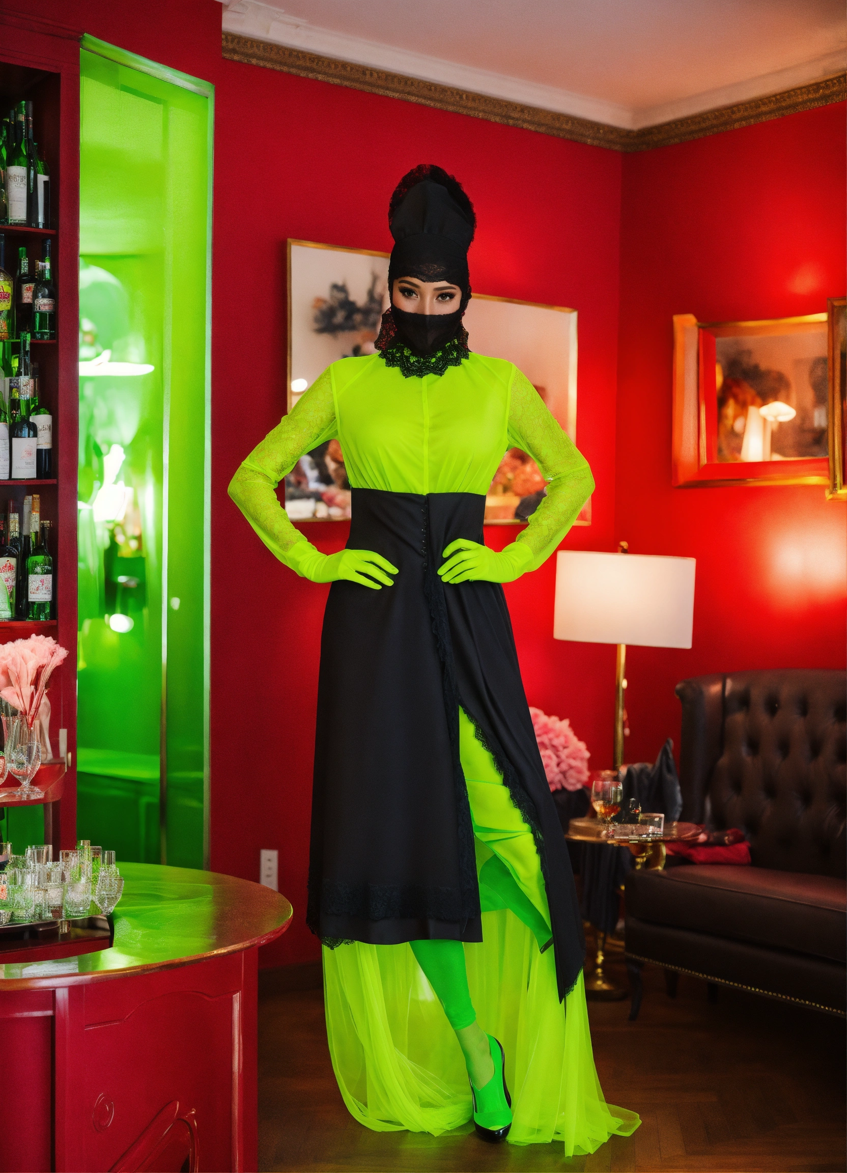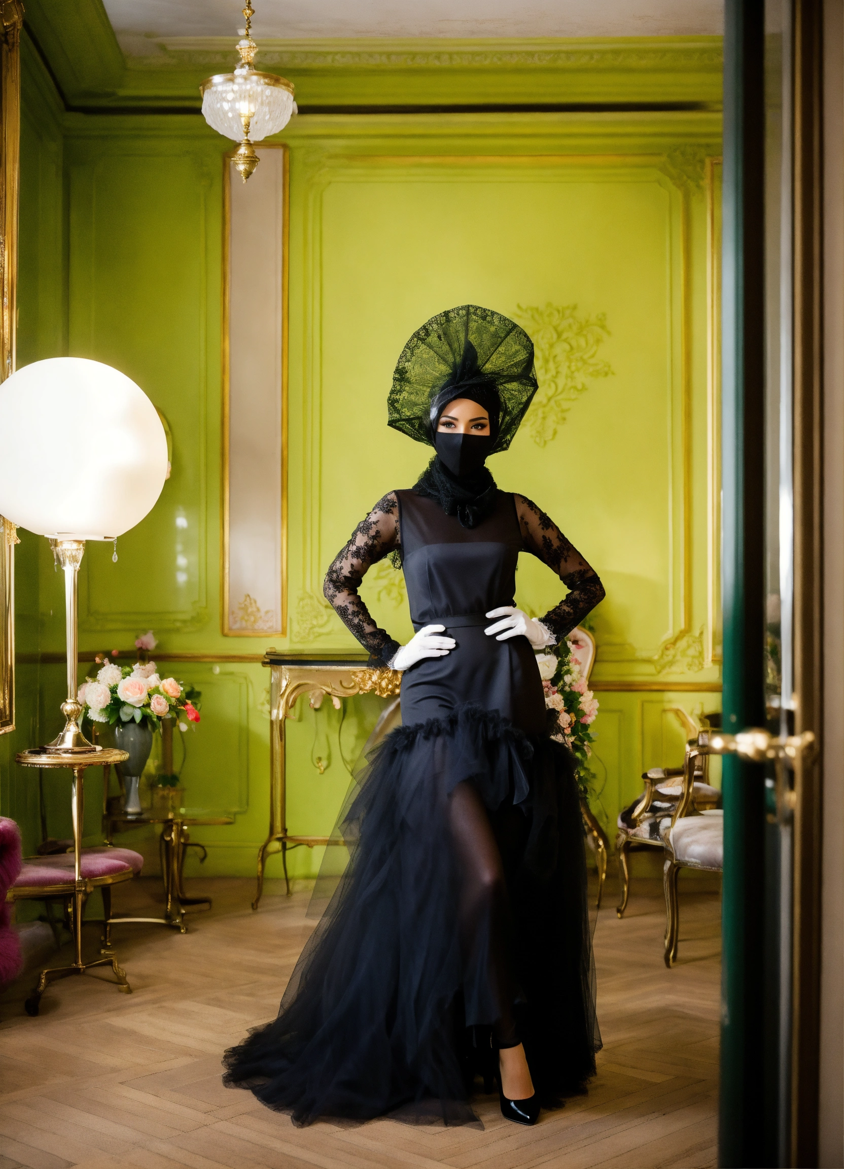 Basques, girdles, lace-edged slips, petticoats, black pearl, black gloves, touch of leoperd, tule vail, high heels, parisian salon, boutique, montaigne avenue, bright space well lit suit, bar suit, le new look, white walls, fluorescent green fur, tule voile veil sheer lace niqab mask