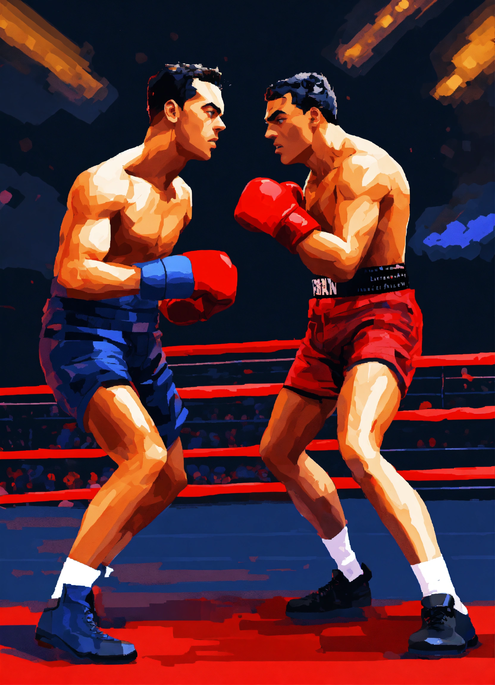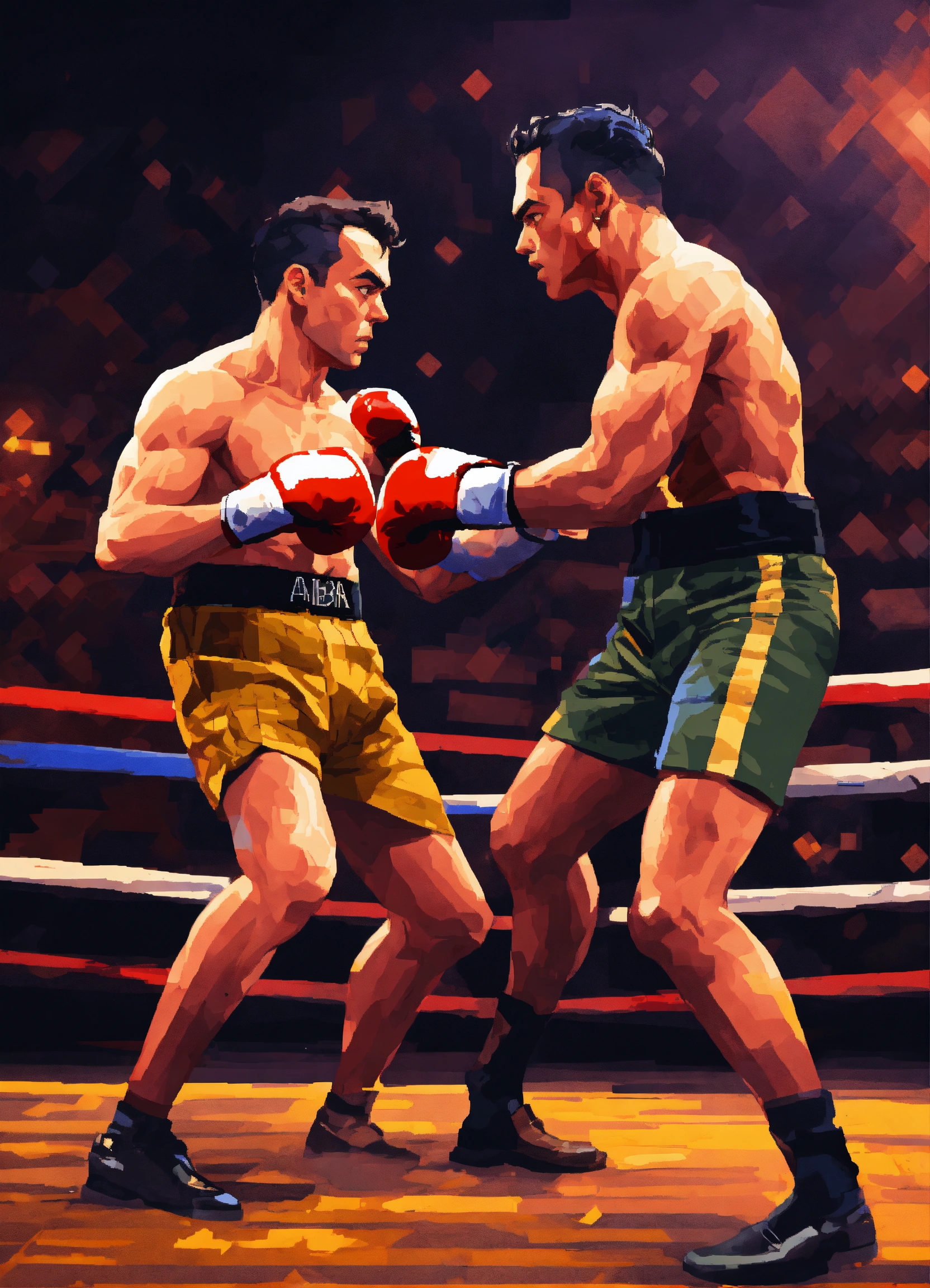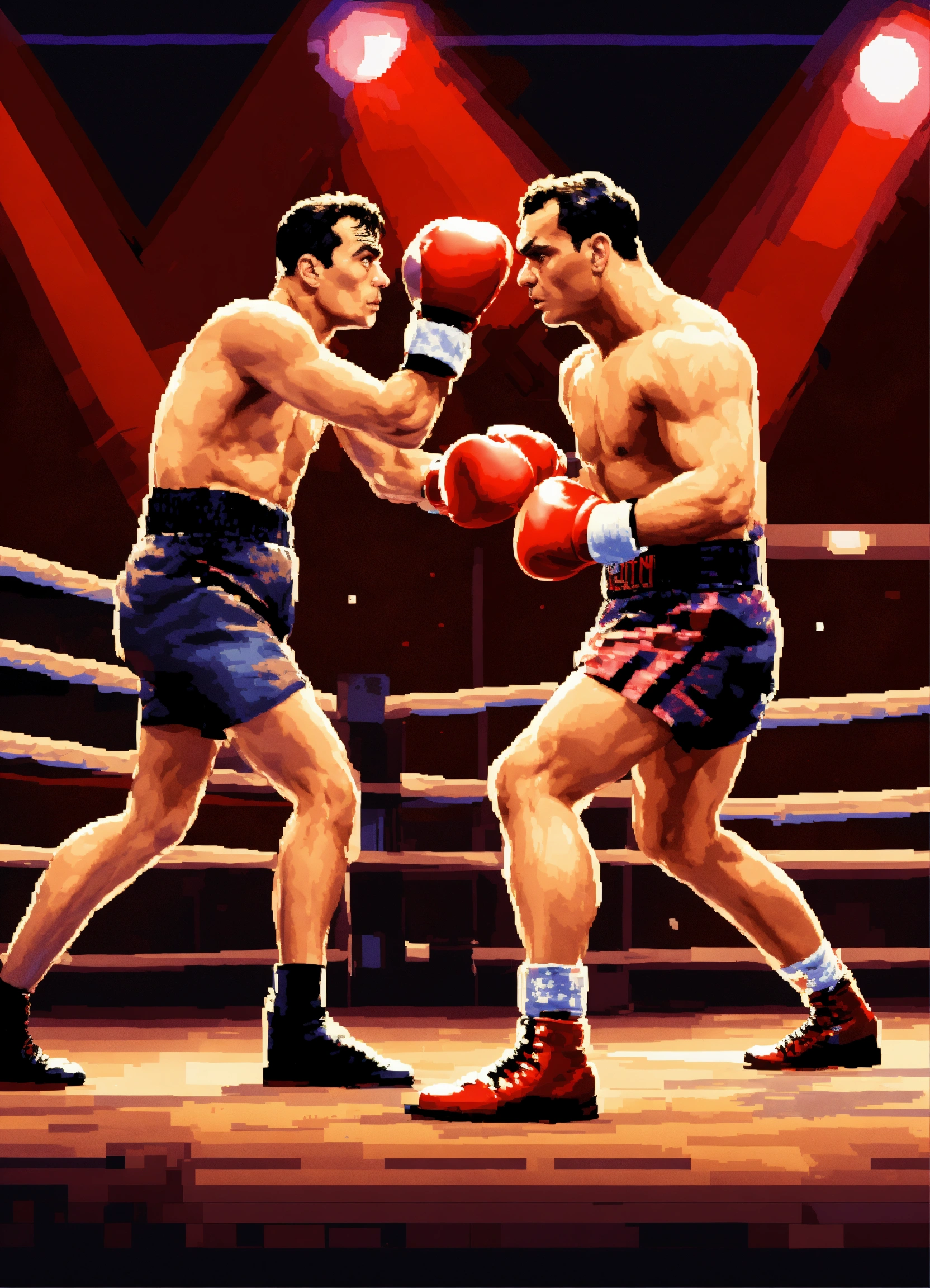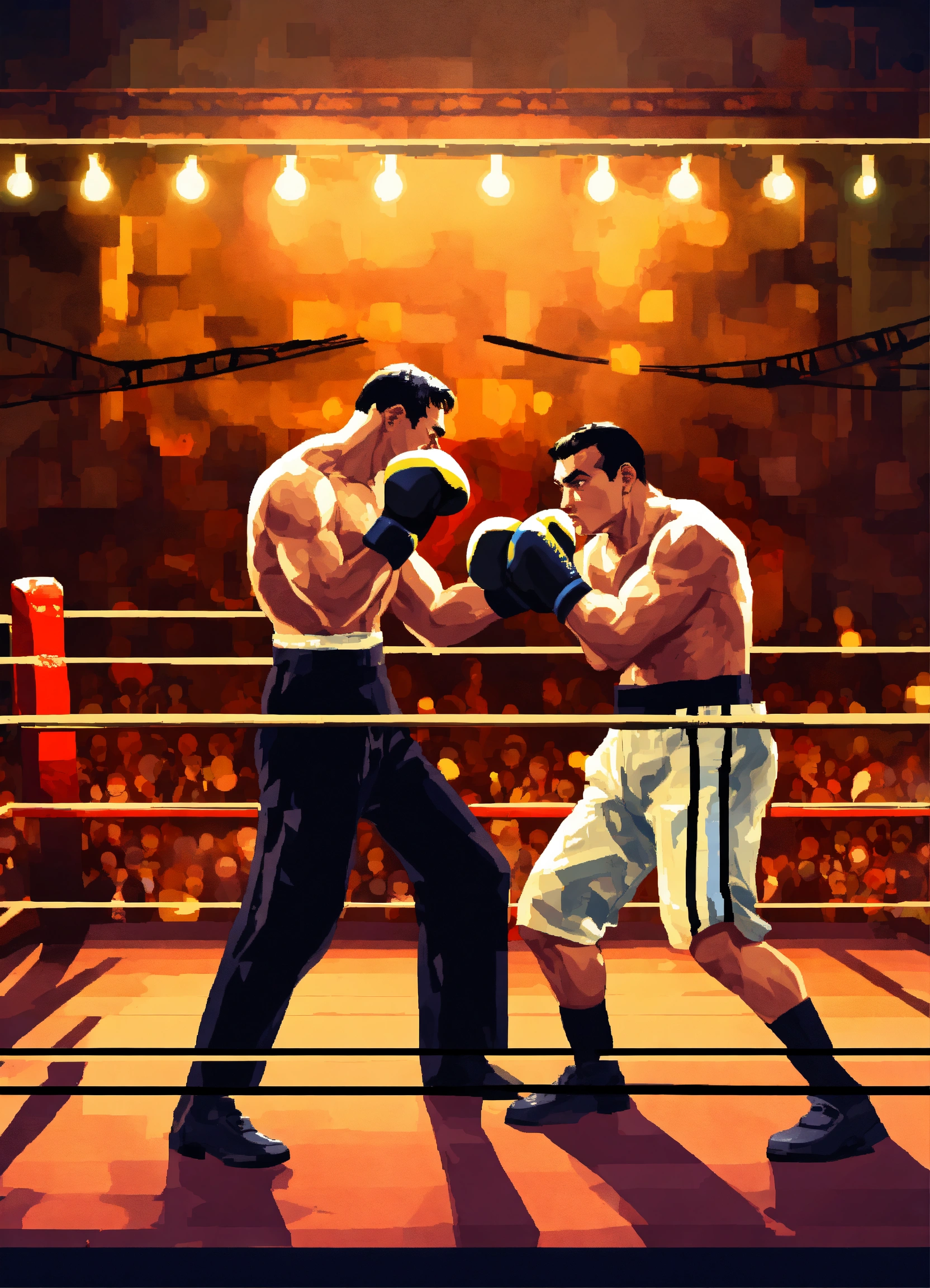 Digital art of buster keaton and amr diab engaged in a fierce boxing match inside a ring, dramatic lighting, intense action, pixel art style, motion blur effect, dynamic composition, modern reinterpretation, 16-bit graphics, epic showdown