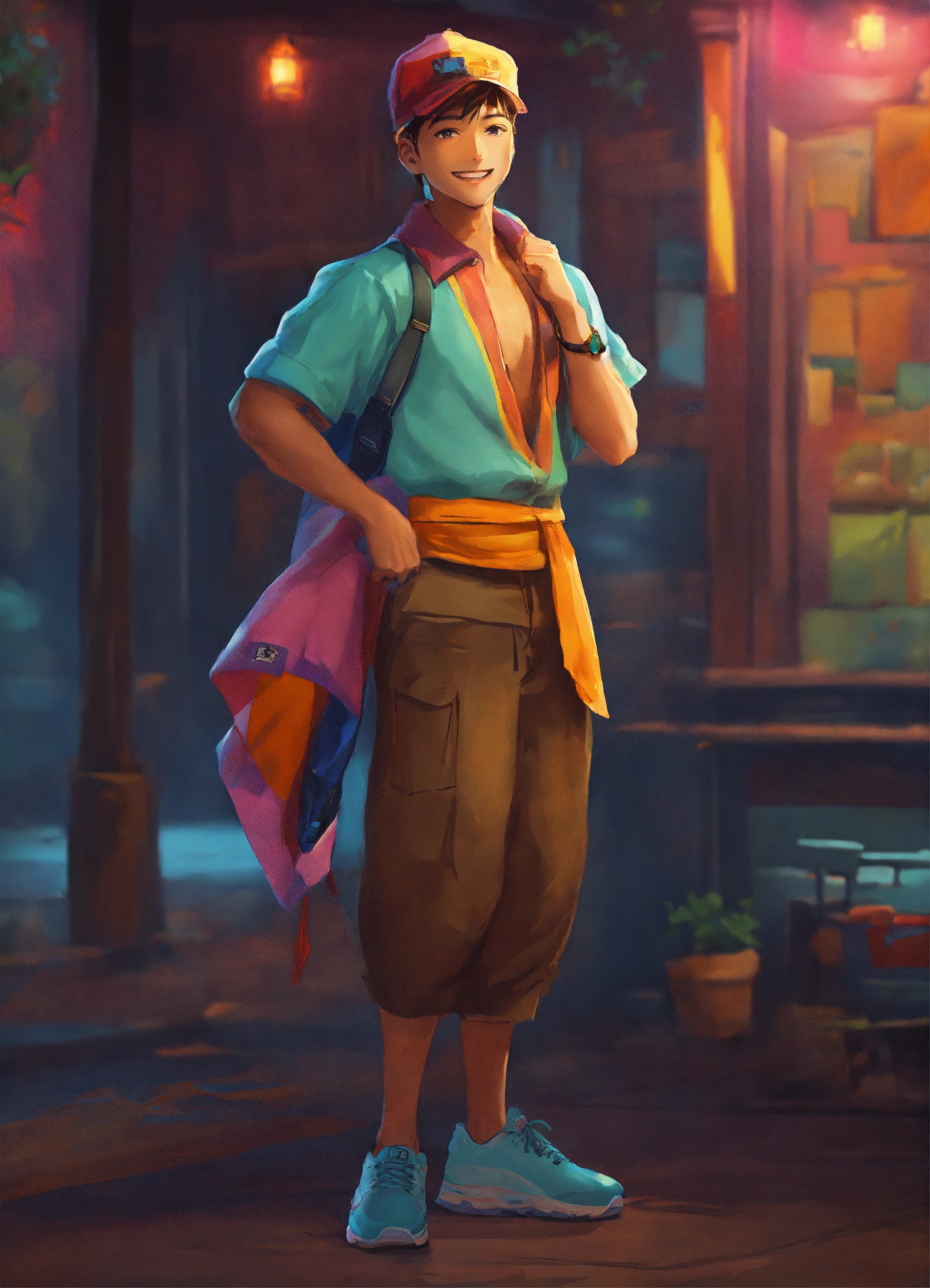 Draw the following character in 2d 1. appearance the entertainer could have a dynamic and expressive appearance, with bright colors and clothing that reflects their positive energy. 2. expressive face his face could sport a wide smile, sparkling eyes and expressive expressions to show his joy and enthusiasm. 3. clothing he could wear casual clothes, such as a colorful t-shirt, sneakers, and maybe a fun cap or hat.