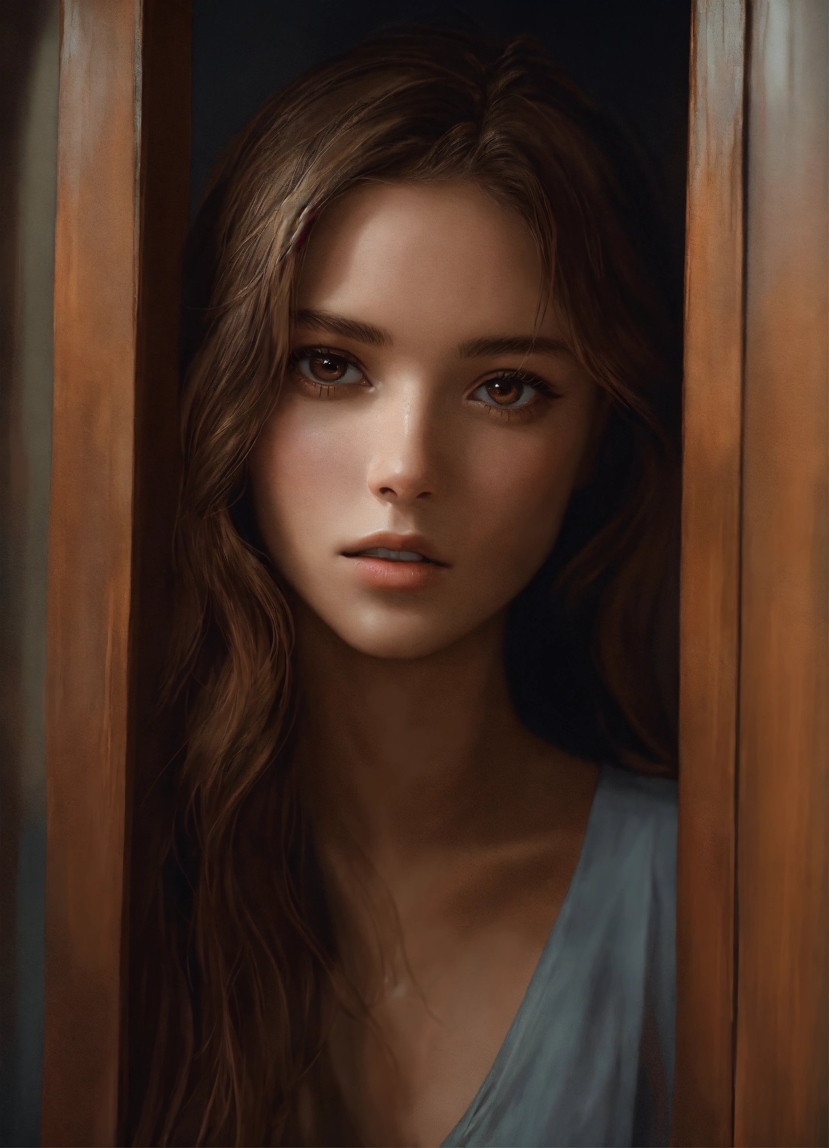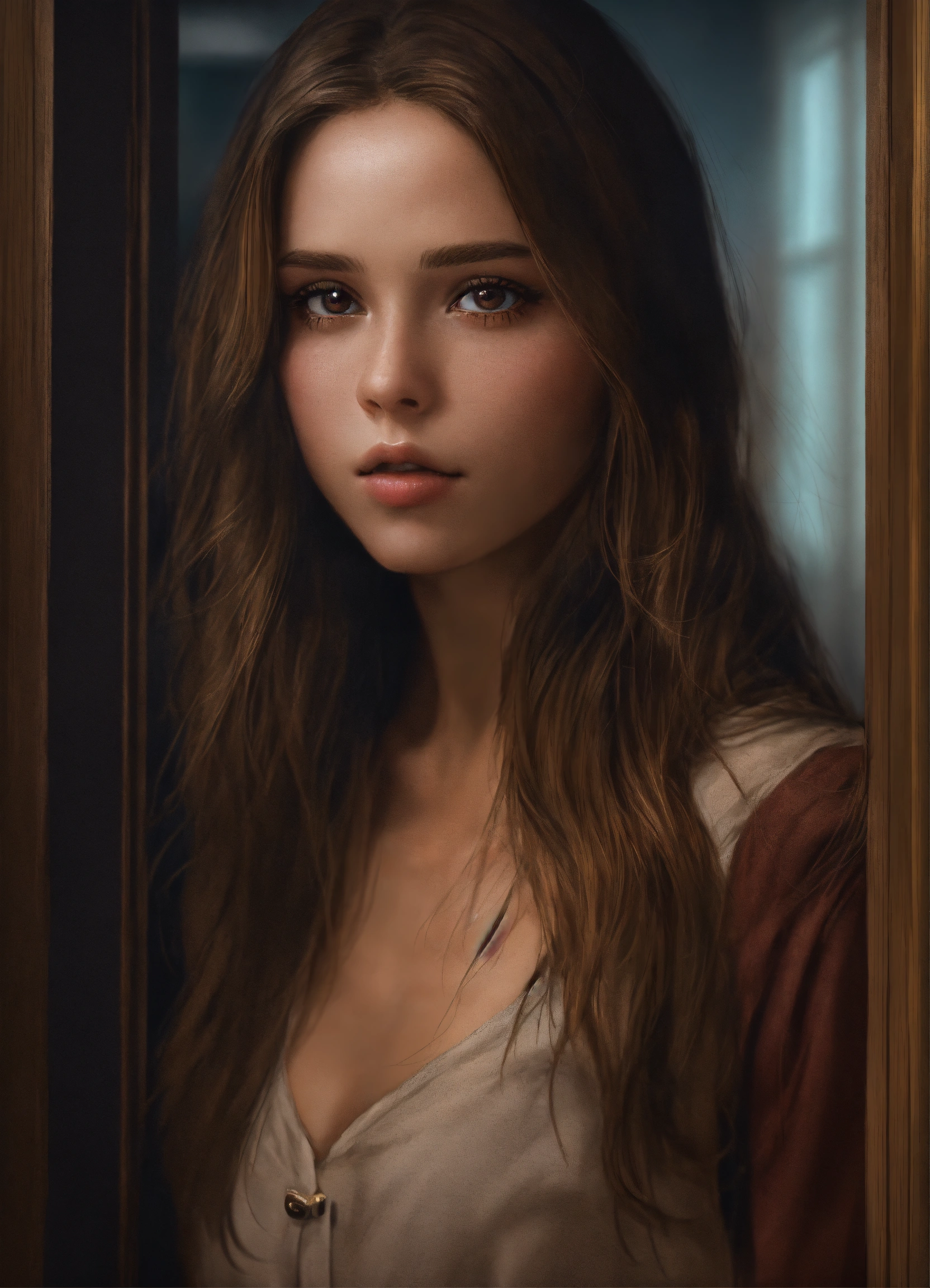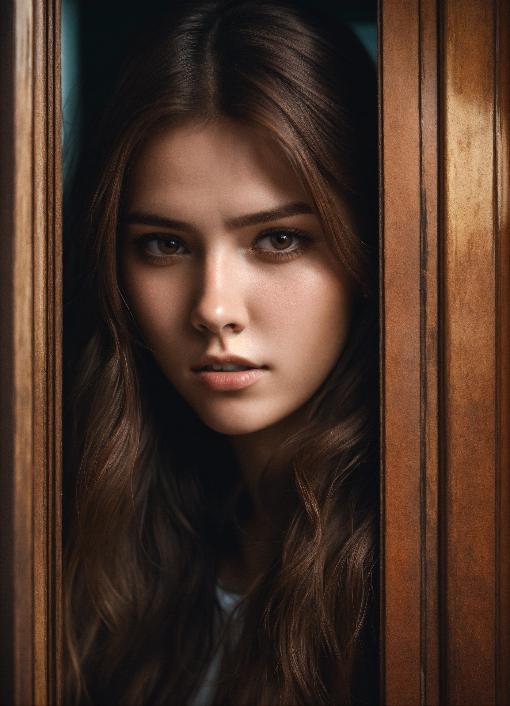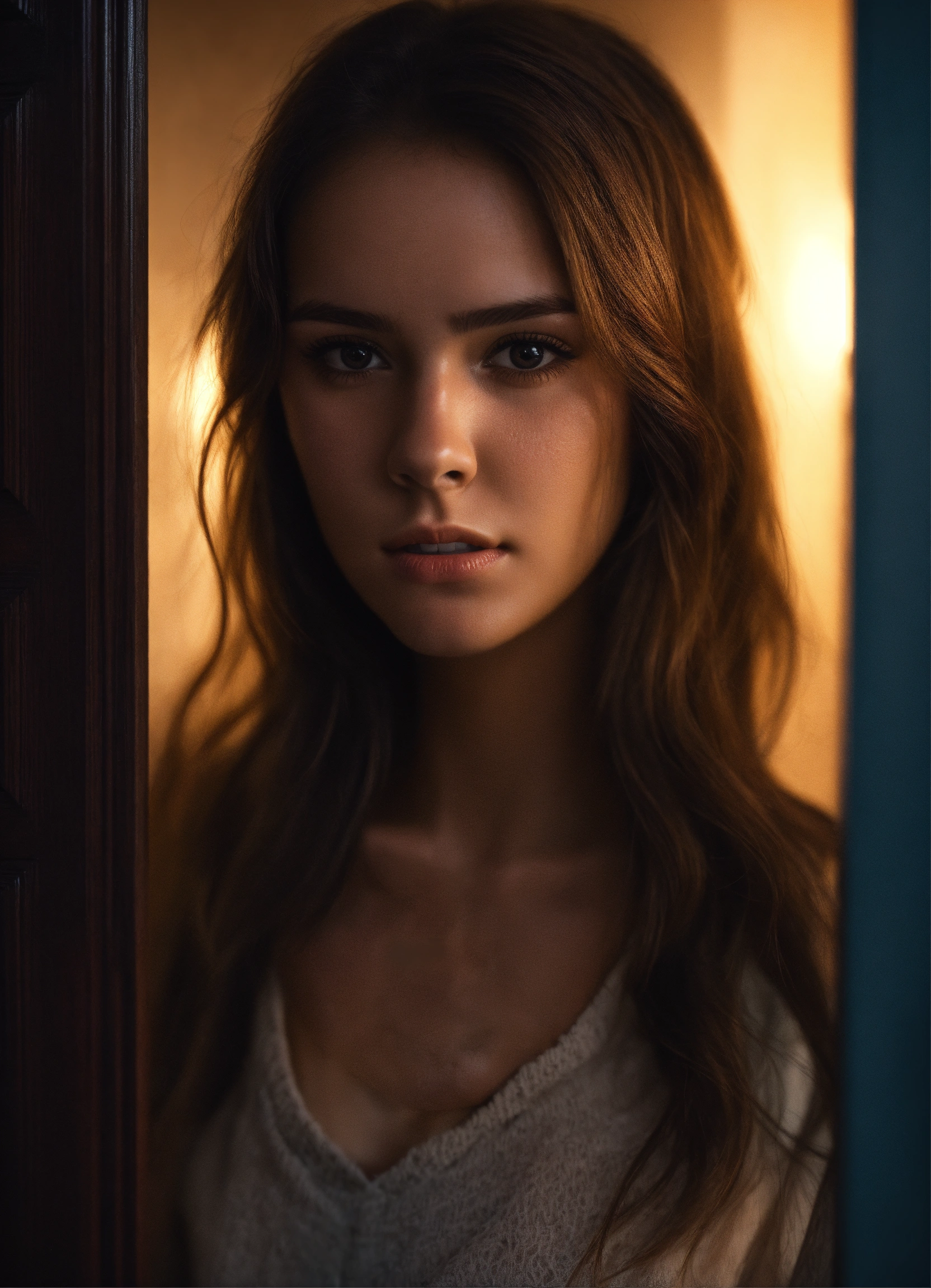 The girl is standing in the doorway and half of her face is demonic, a beautiful girl with brown hair, clear facial features, detailed image, realistic, real, realistic facial features, realistic photography