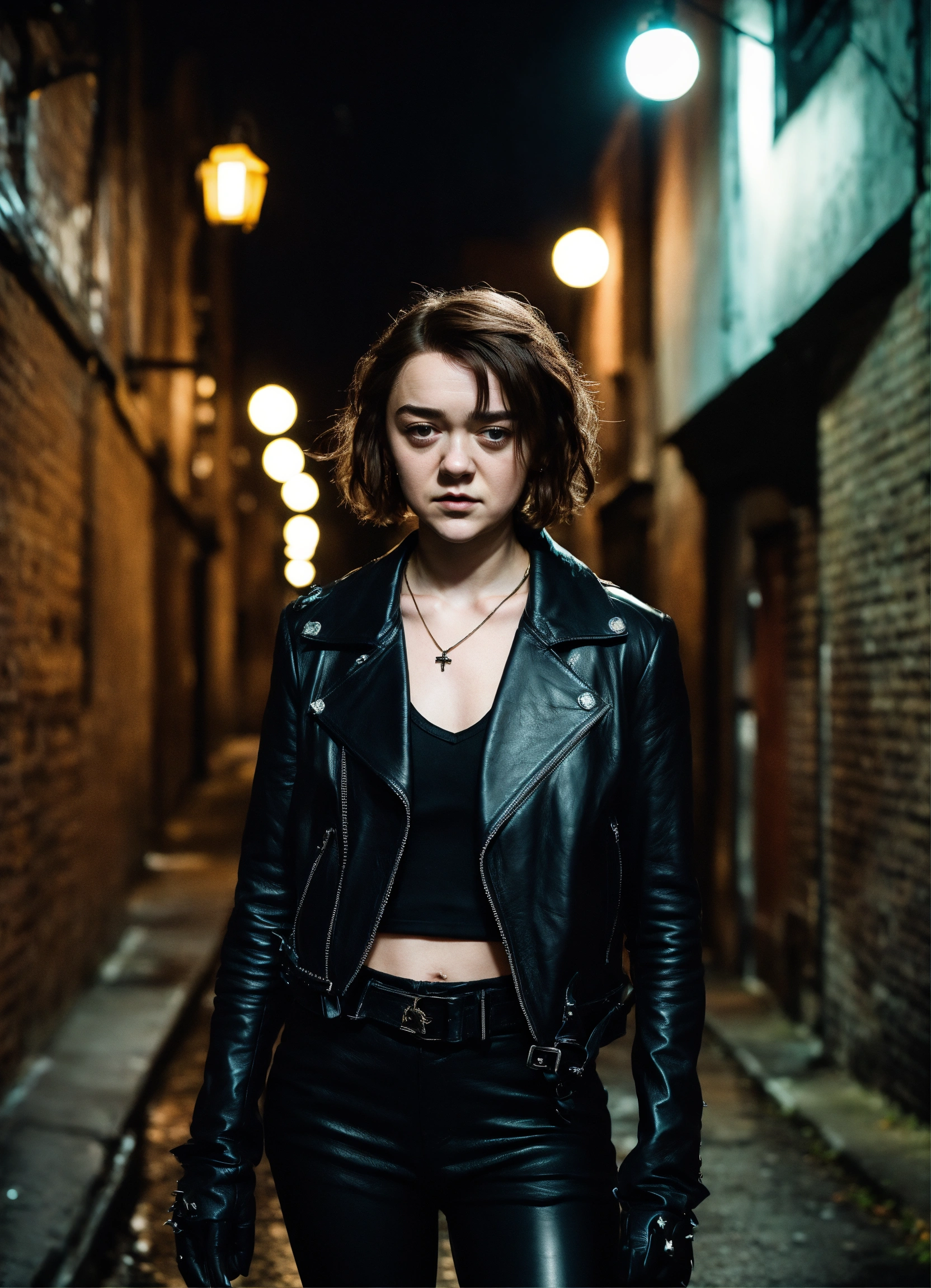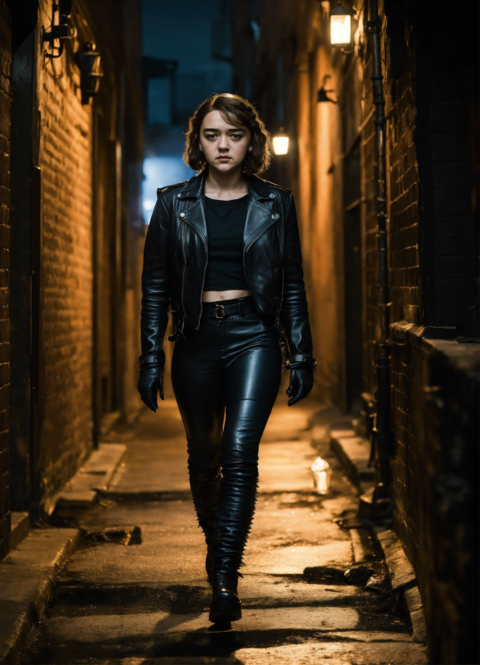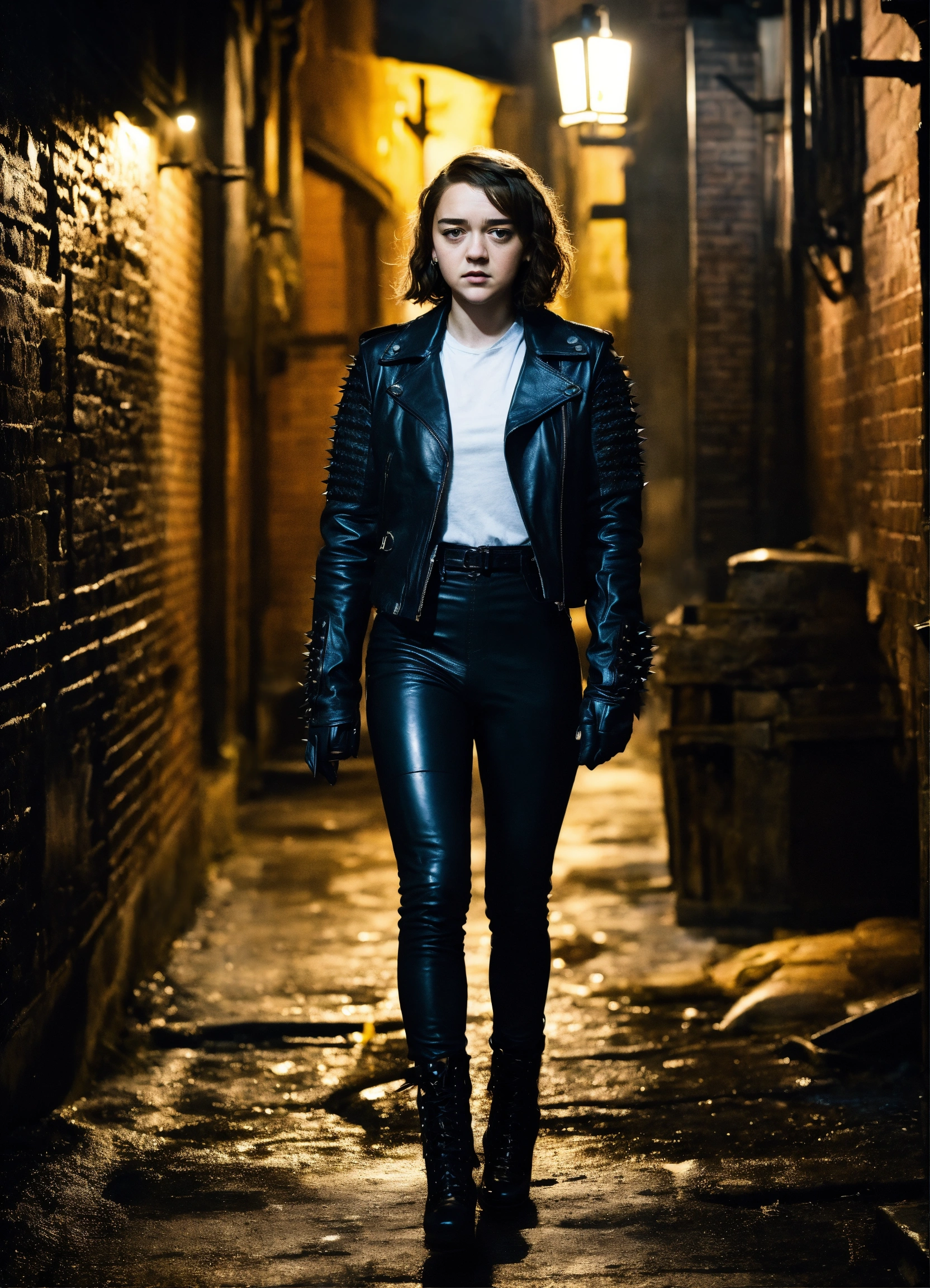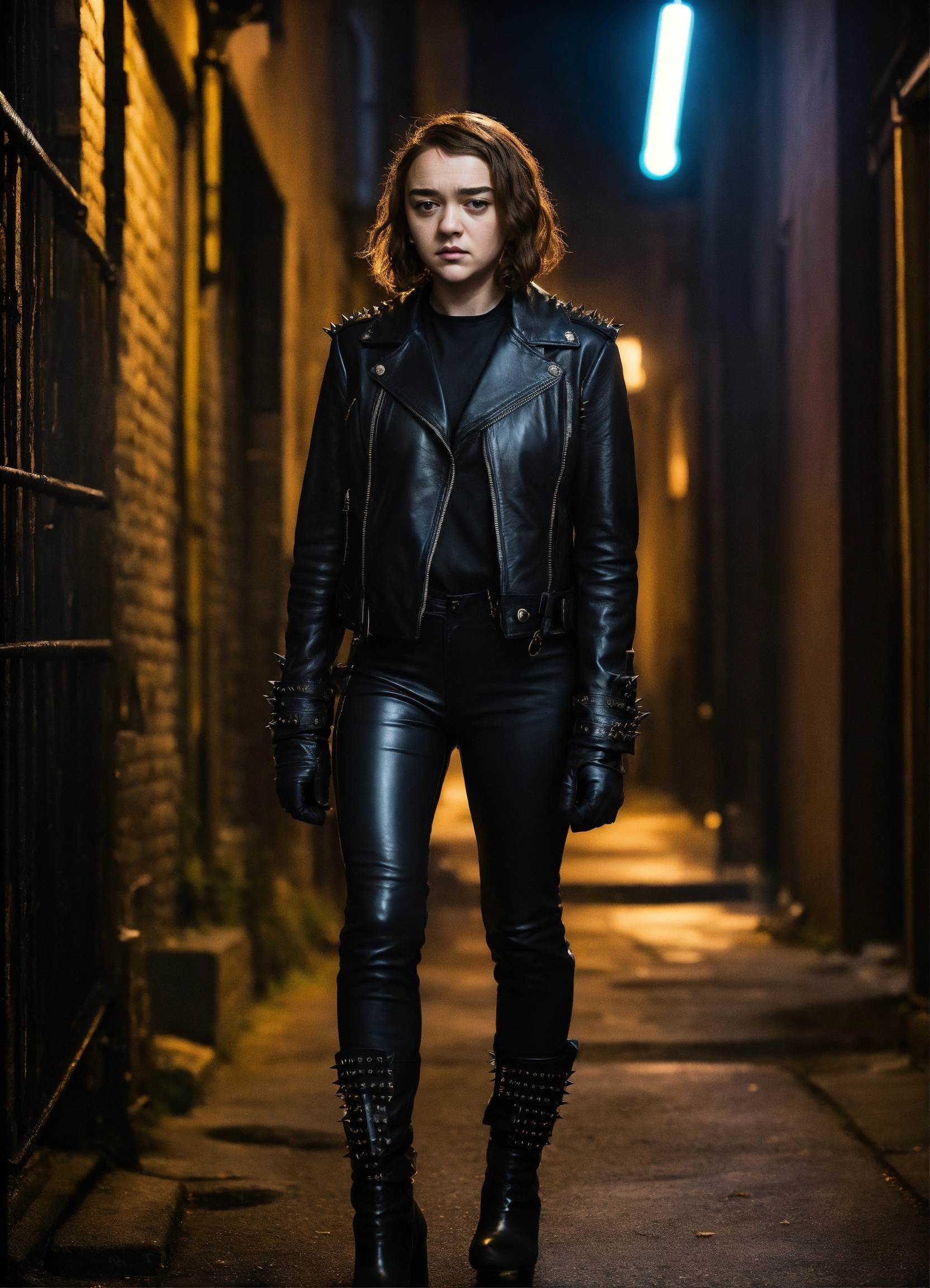 Maisie williams gothic walking in a dark alley wearing black leather pants black leather jackets gloves spikes, hyper-realistic, photographic portrait at night
