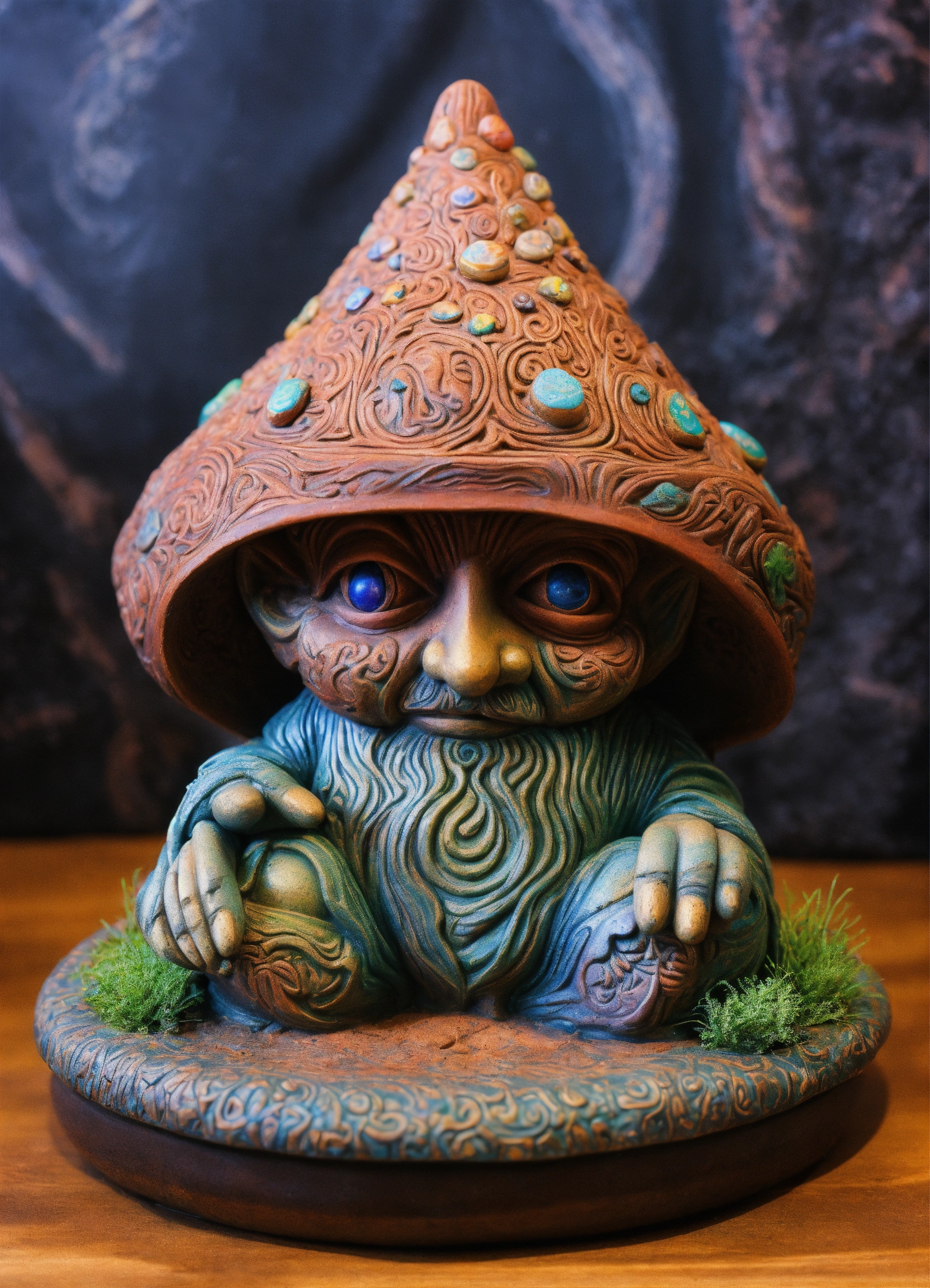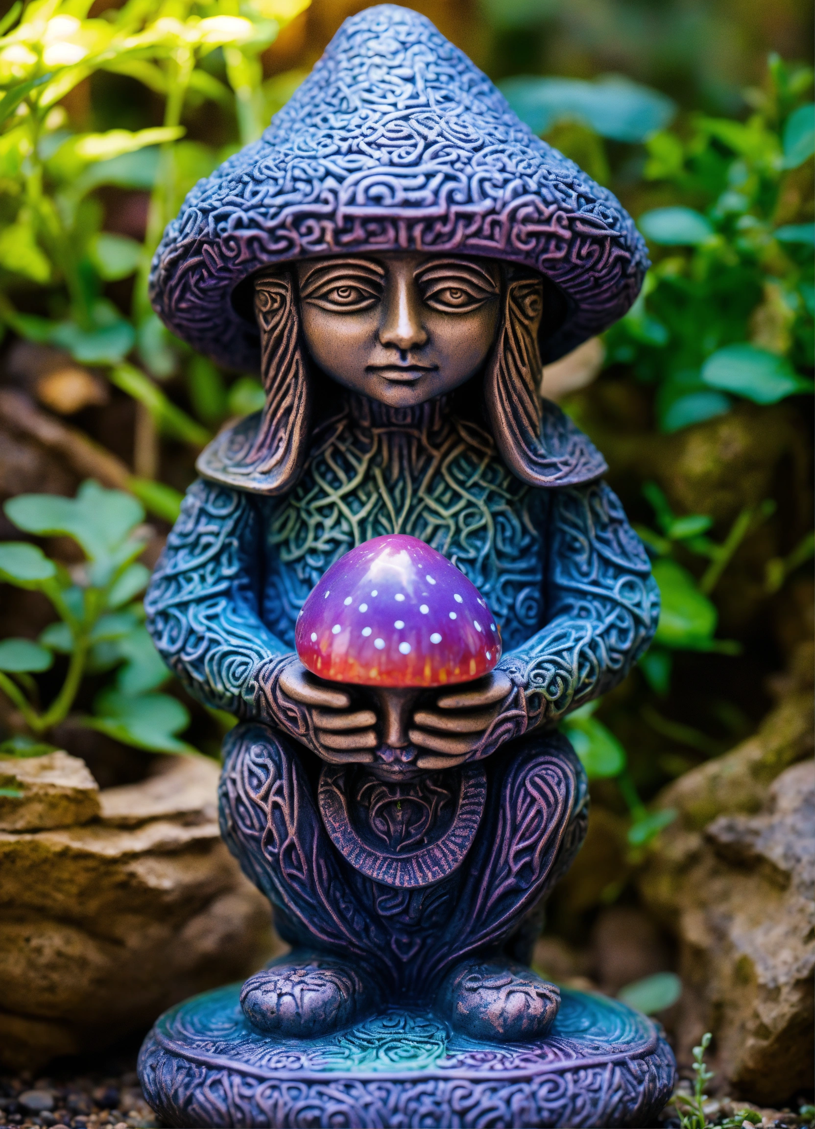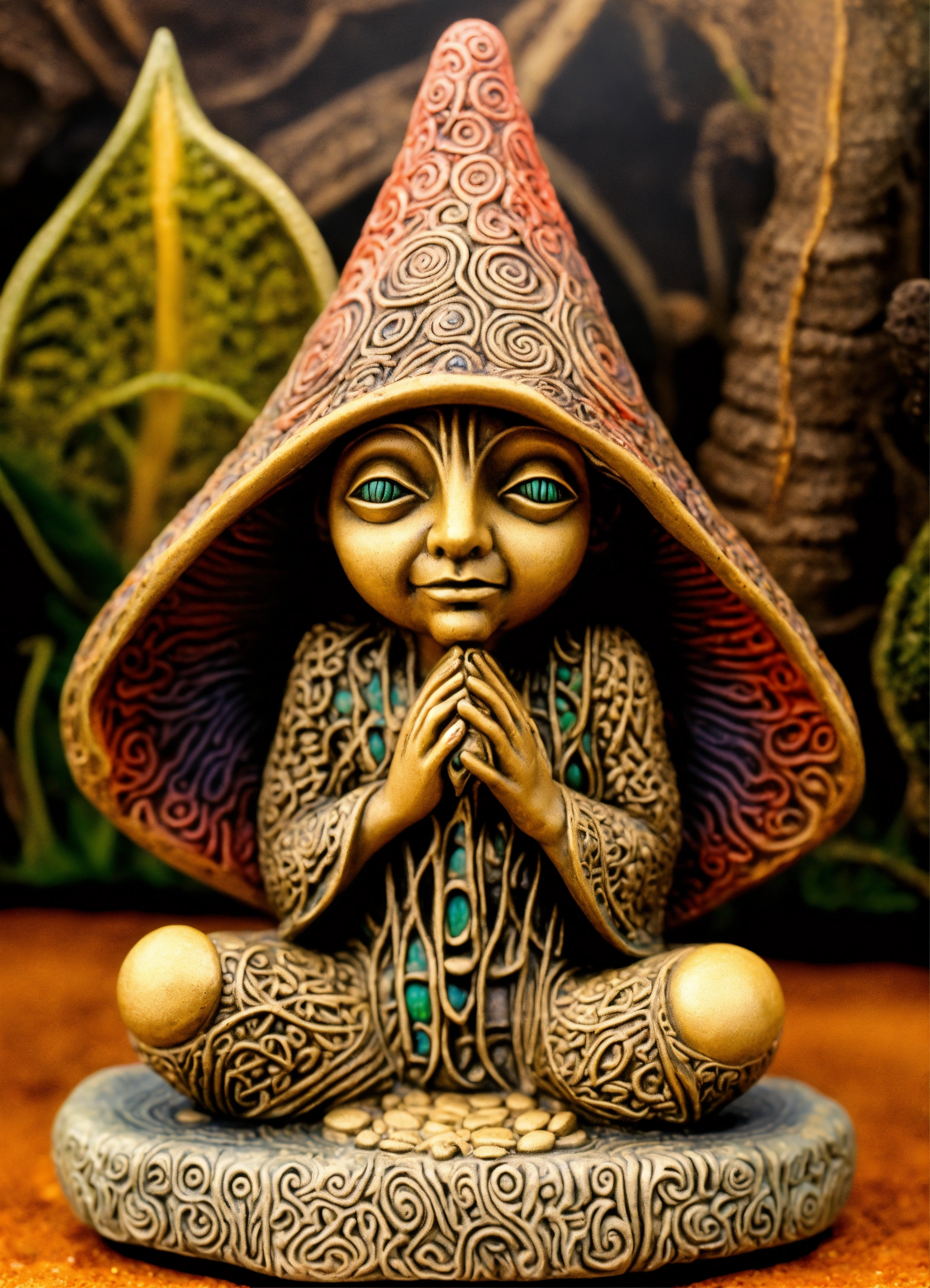 An ancient stone hand made meditative hooded gnome garden sculpture in the style of alex grey, magic mushroom, lsd, dmt, giger