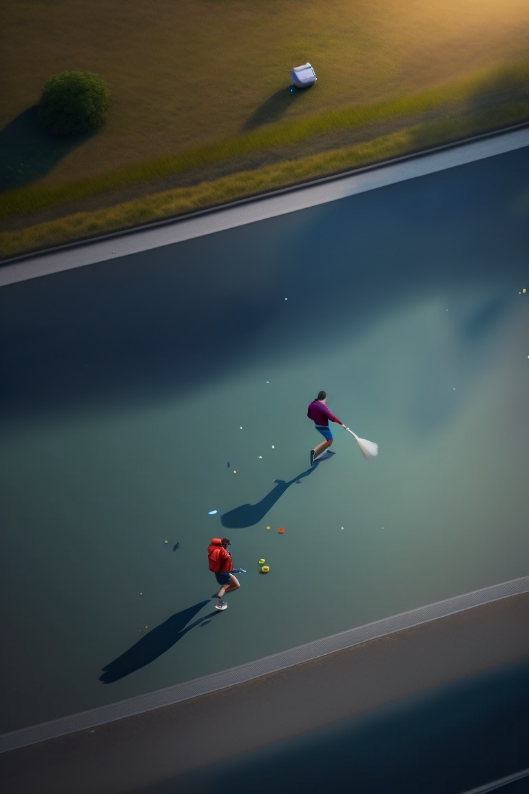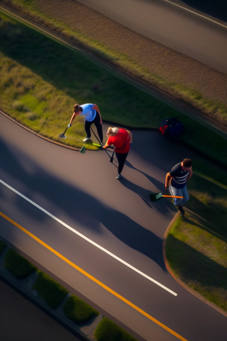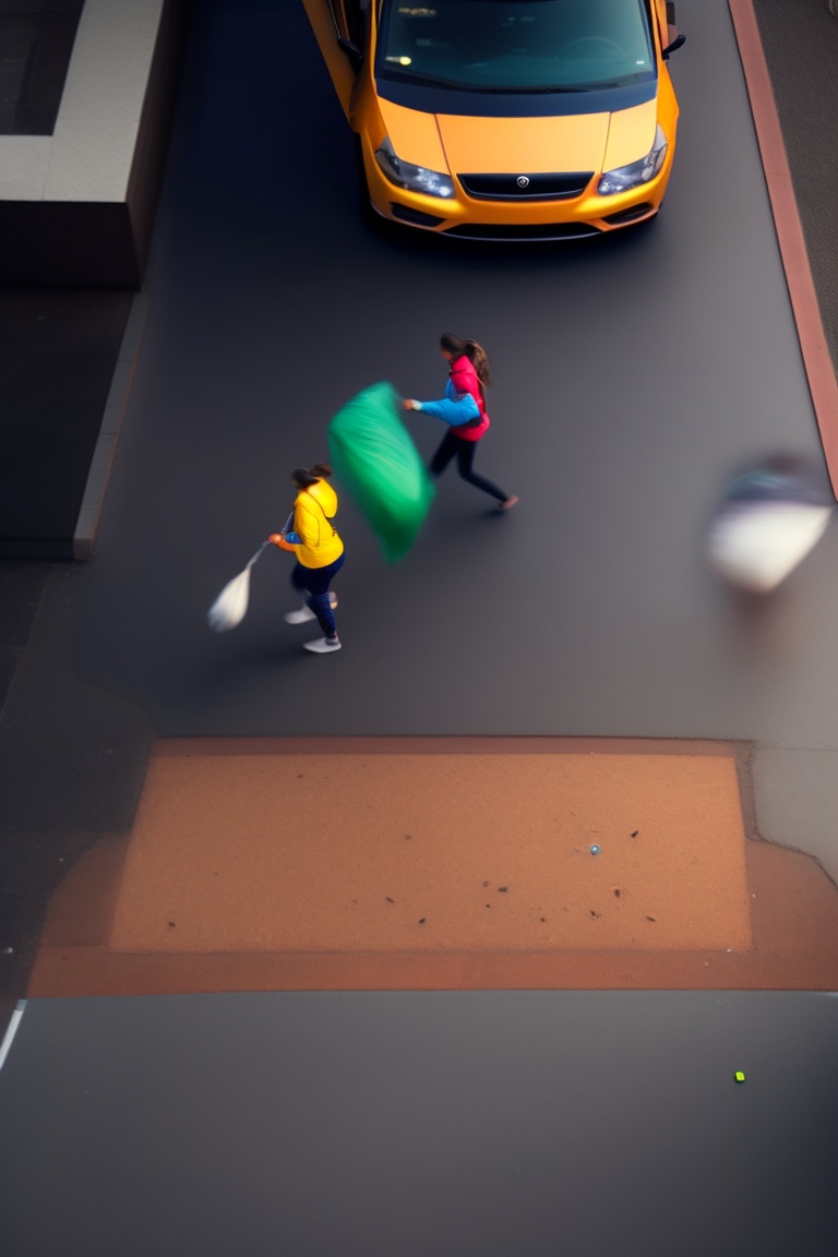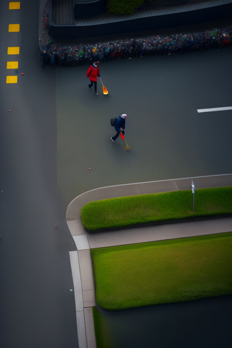 Sad, dark, 4k hd, bird's eye view, old style, realistic look, people plogging and cleaning up litter on the street, ((plogging)), background full of people chasing, garbage on the ground, grass ground, unclear sky, pollution