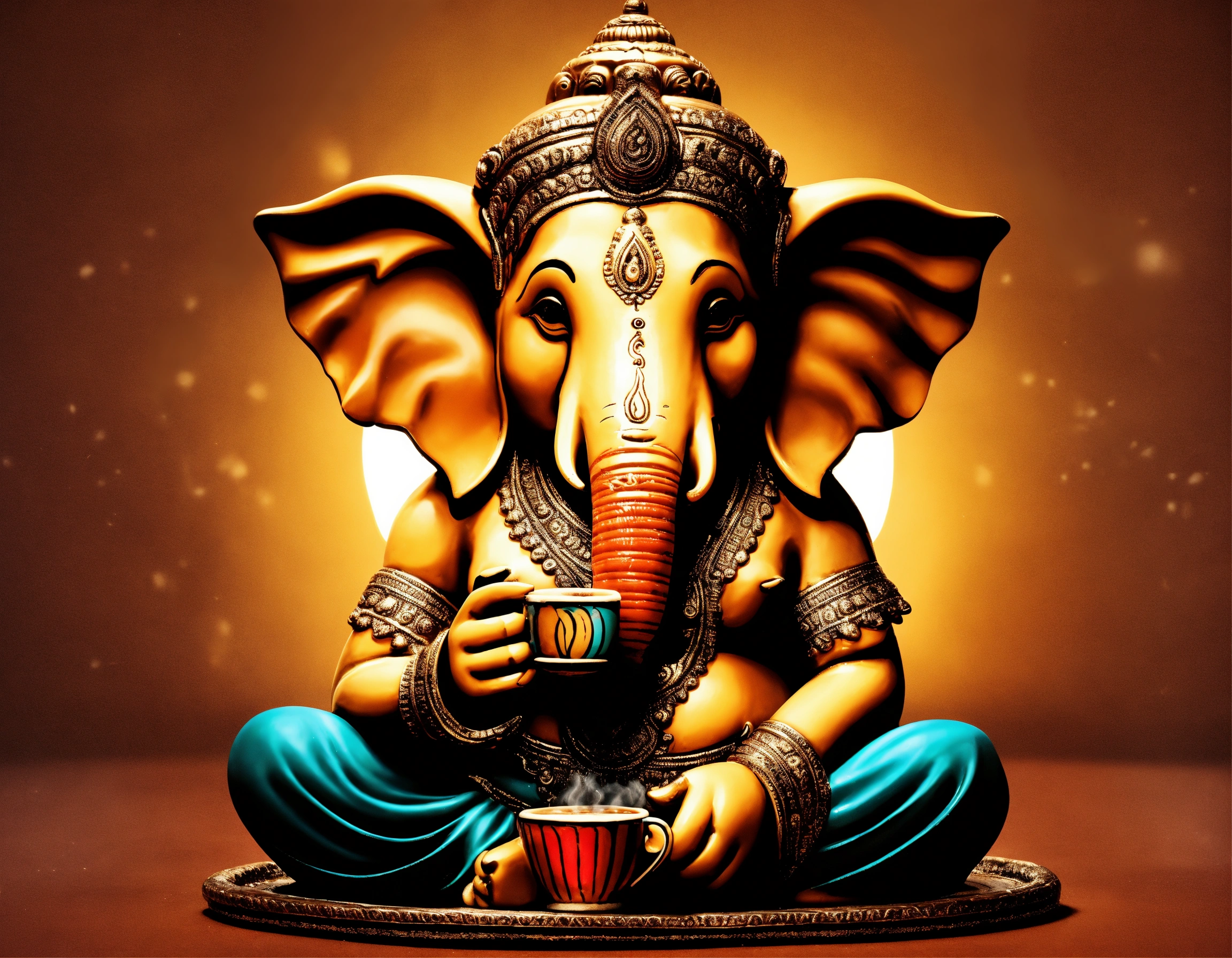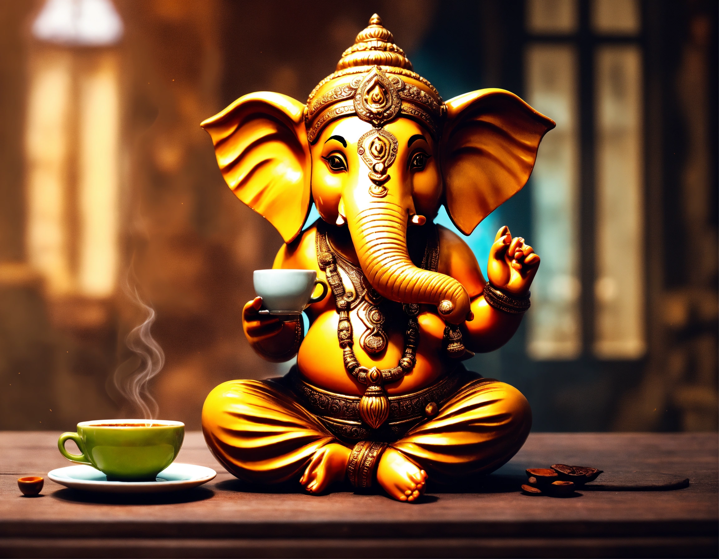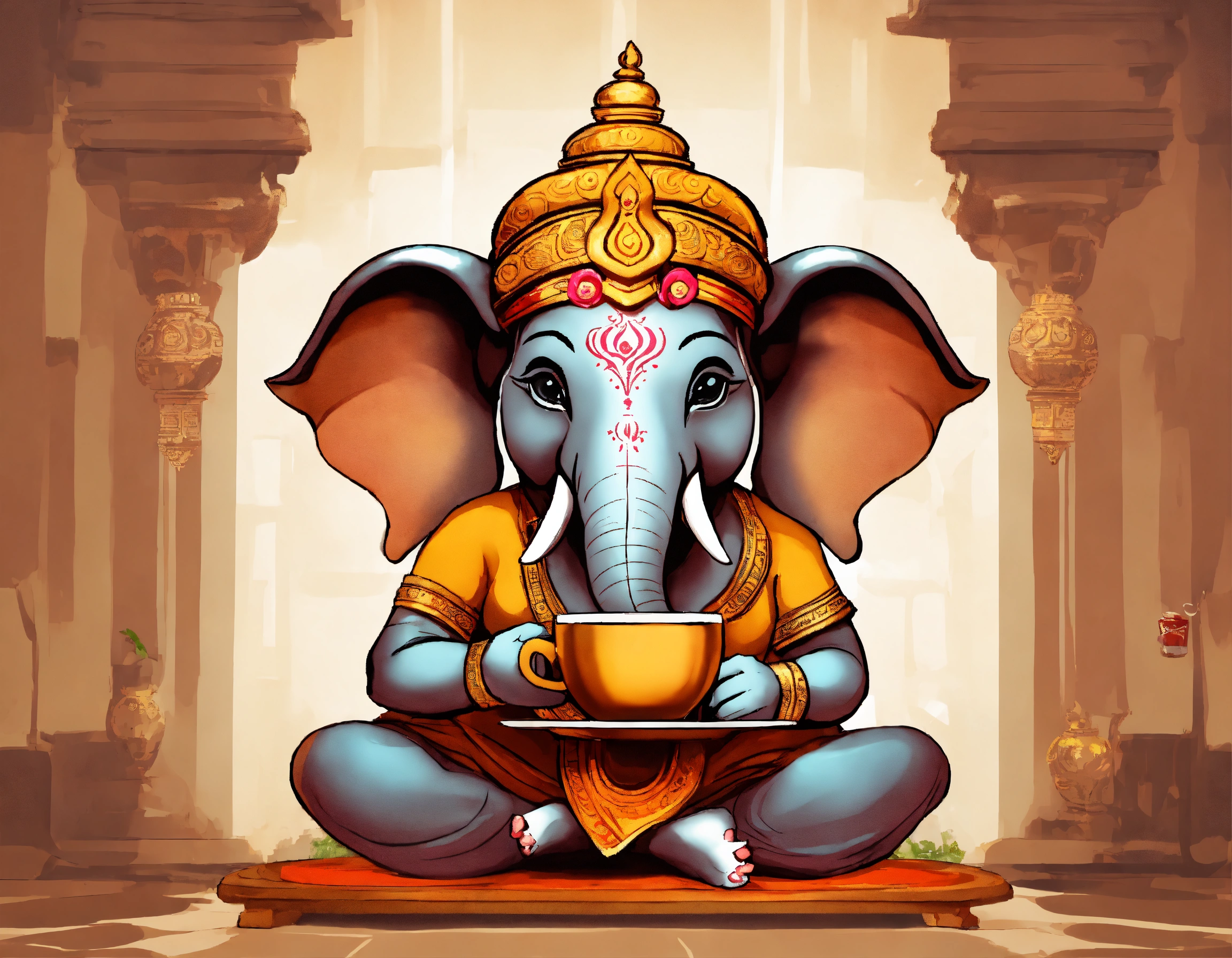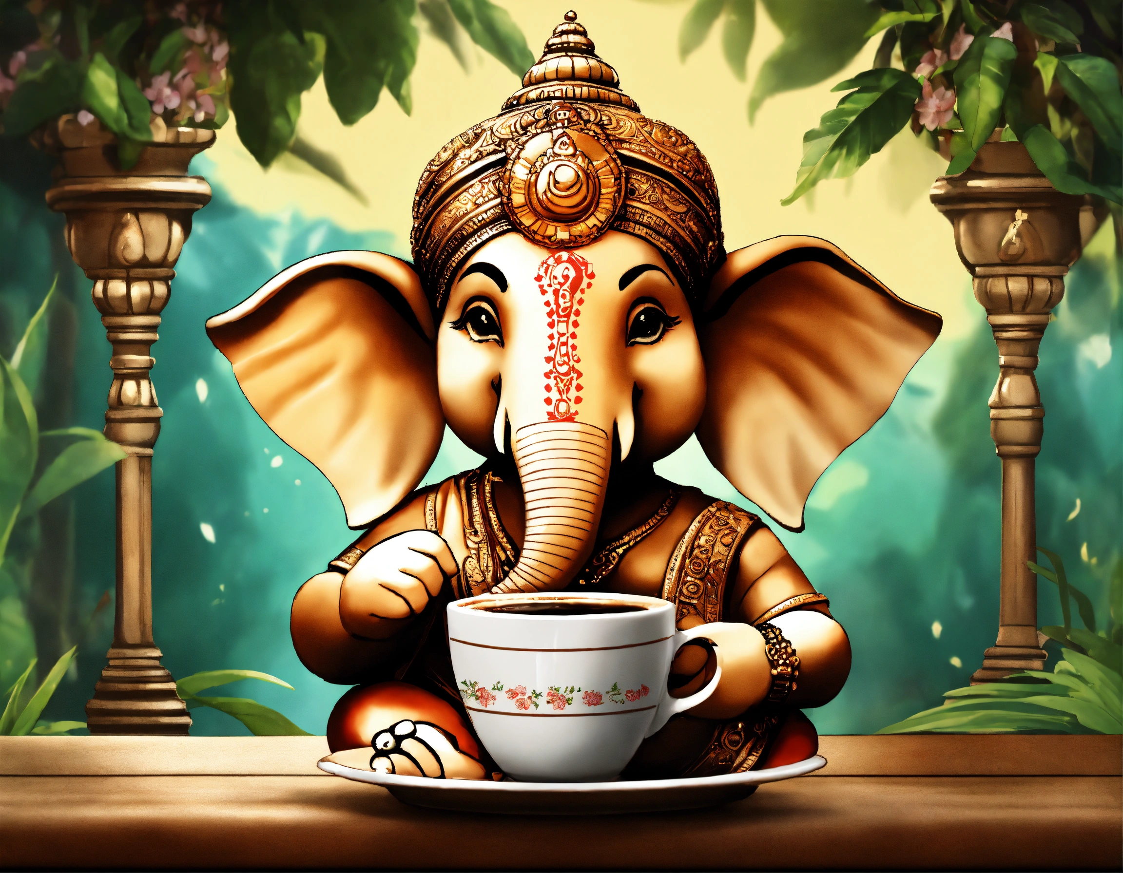 Create an image of ganesha looking cute and having coffee