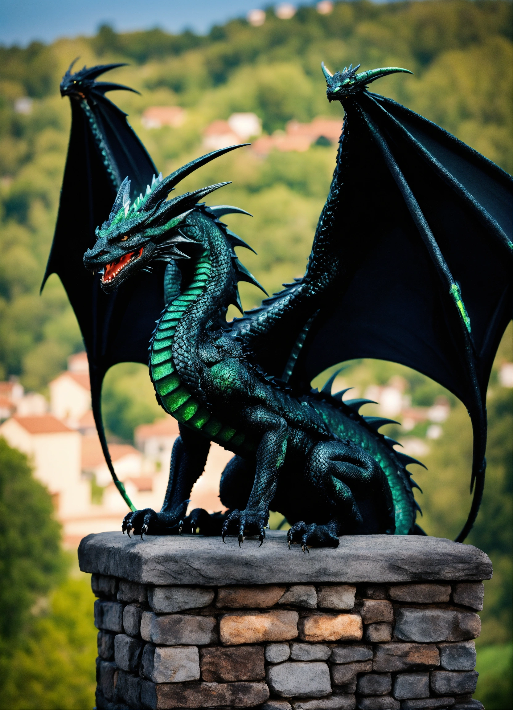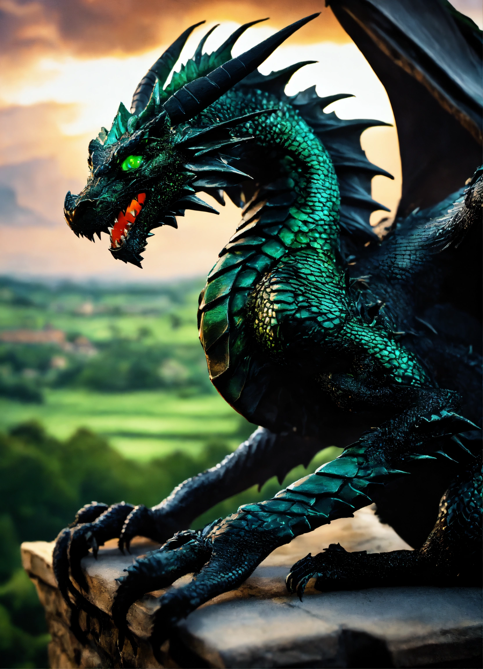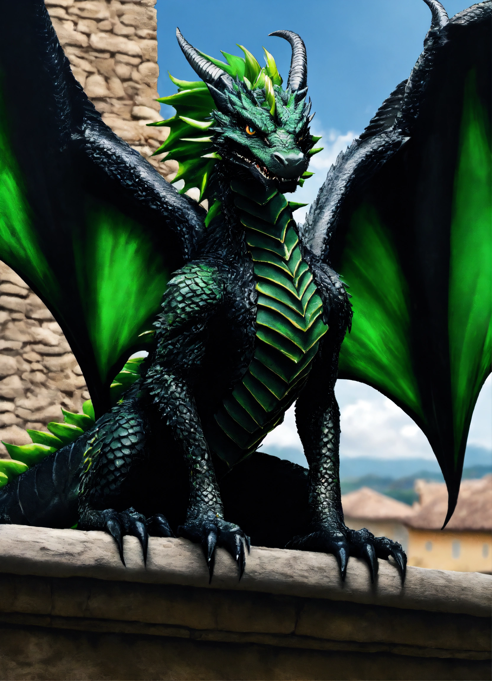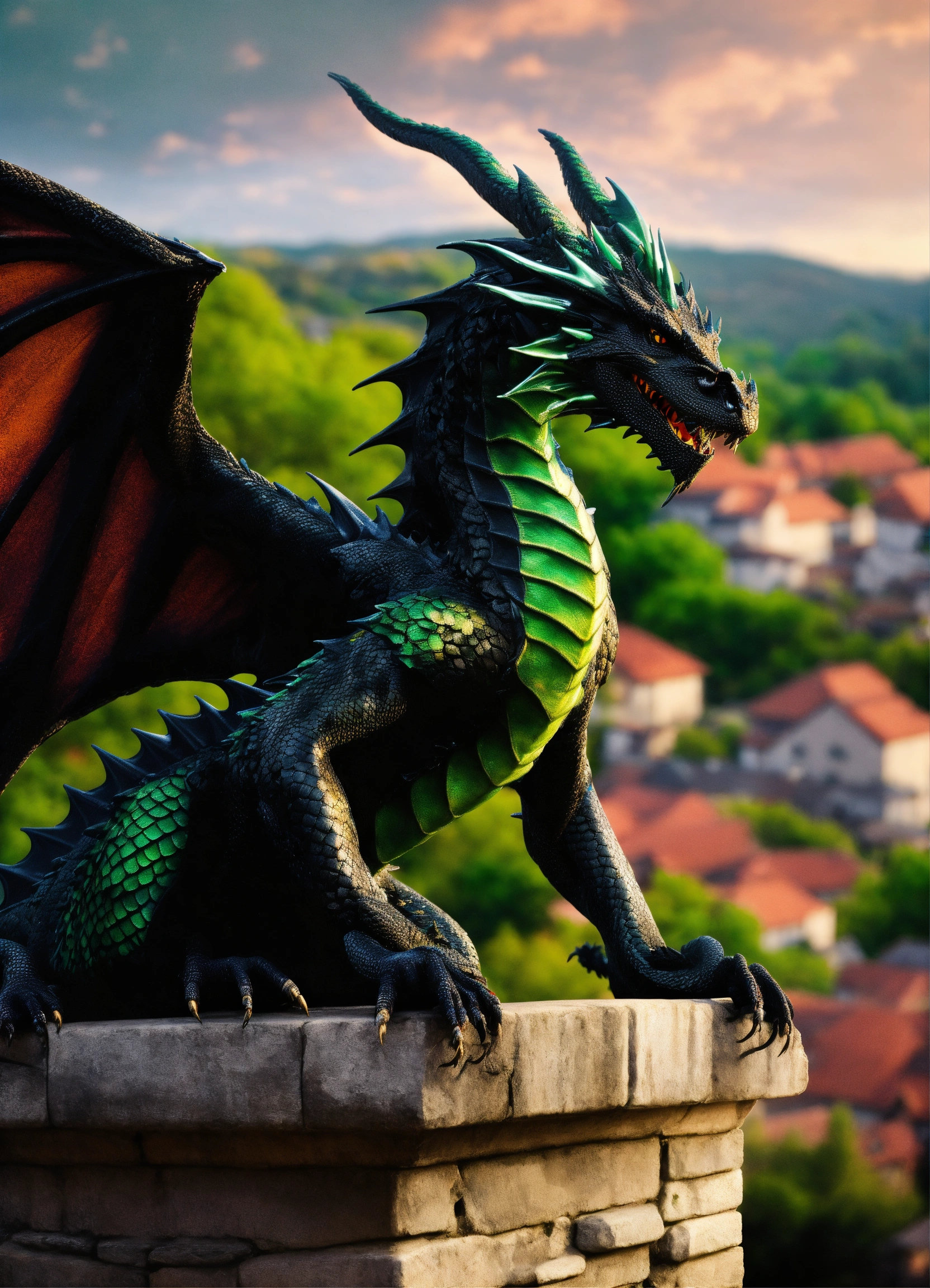 Ultra realistic beautiful black dragon green eyes full body sitting on a ledge over looking a village perfect clarity photorealistic high definition