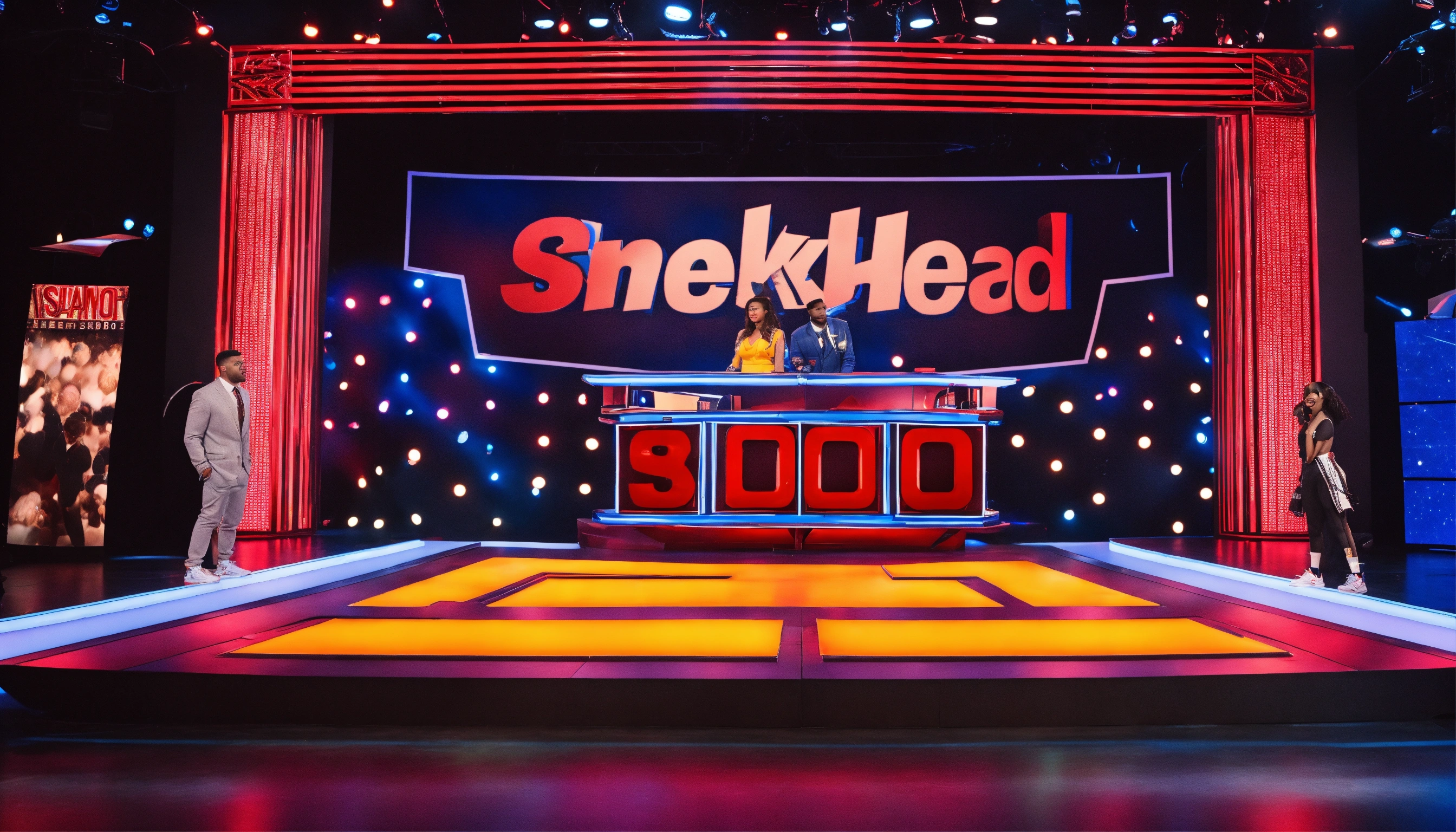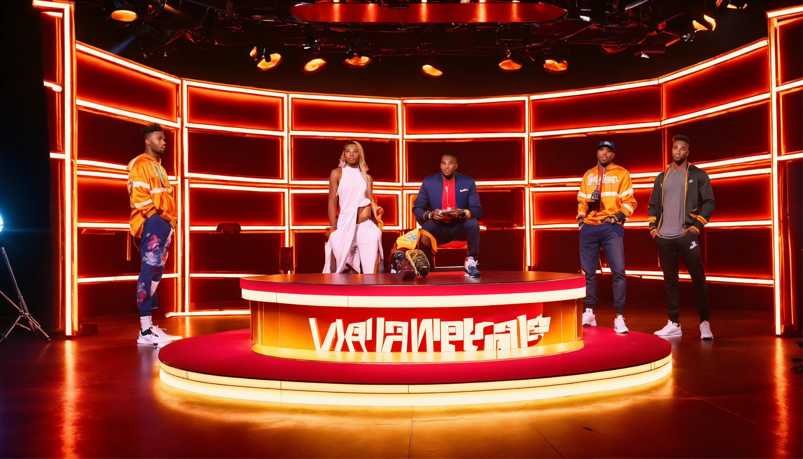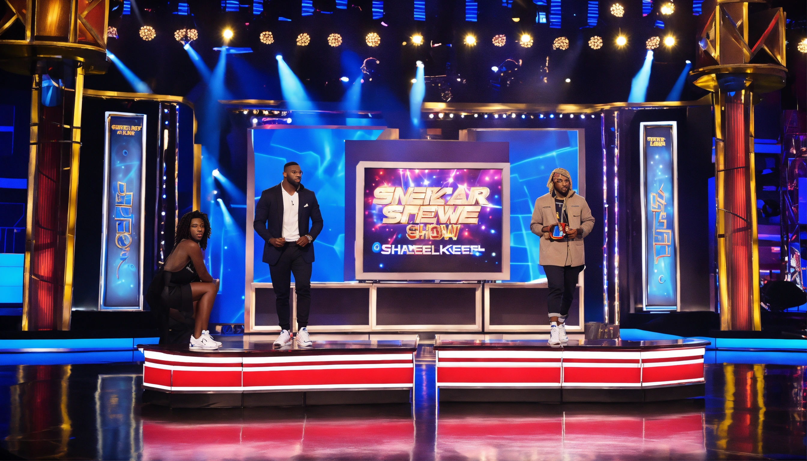 Sneakerhead game show arena studio with dramatic lighting with gameshow host and two male and two female contestant and sneaker display