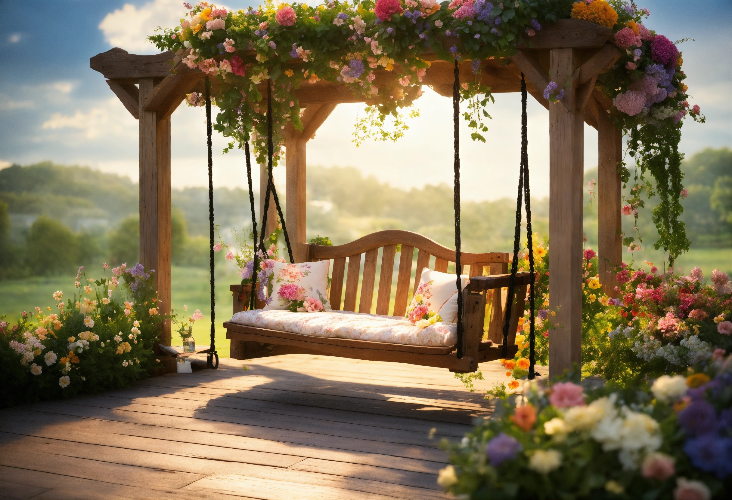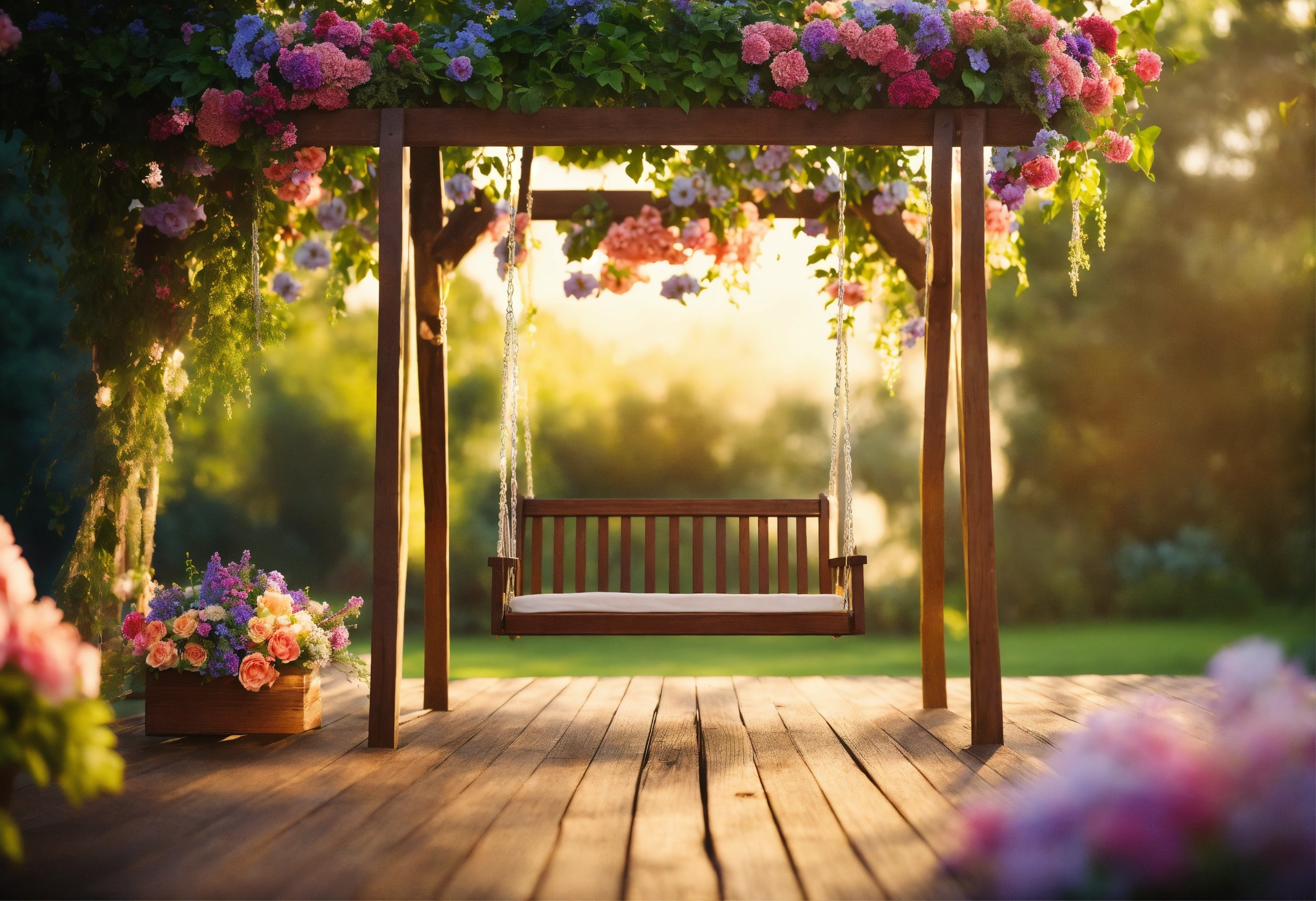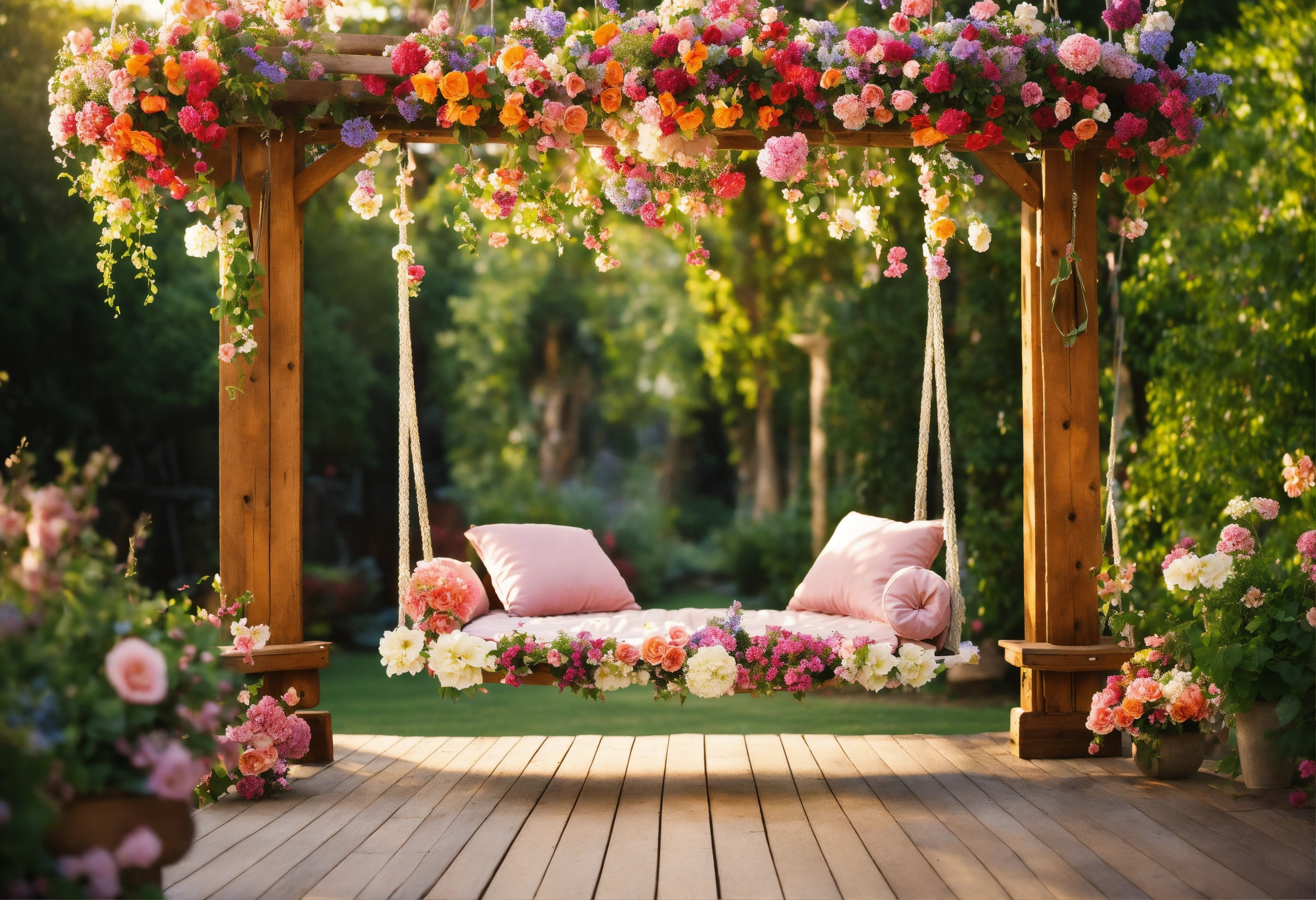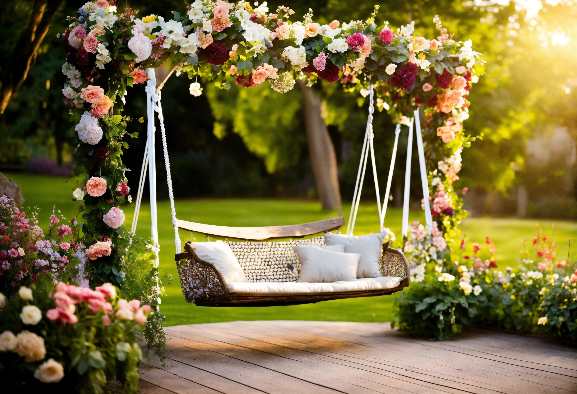 Create a whimsical and romantic scene featuring a swing or hammock adorned with a floral arrangement, including a mix of flowers. the swing should be surrounded by a beautiful garden setting, with a wooden floor and a bench nearby. the overall atmosphere should evoke a sense of love and tranquility, making it an ideal spot for a romantic date or a special occasion.