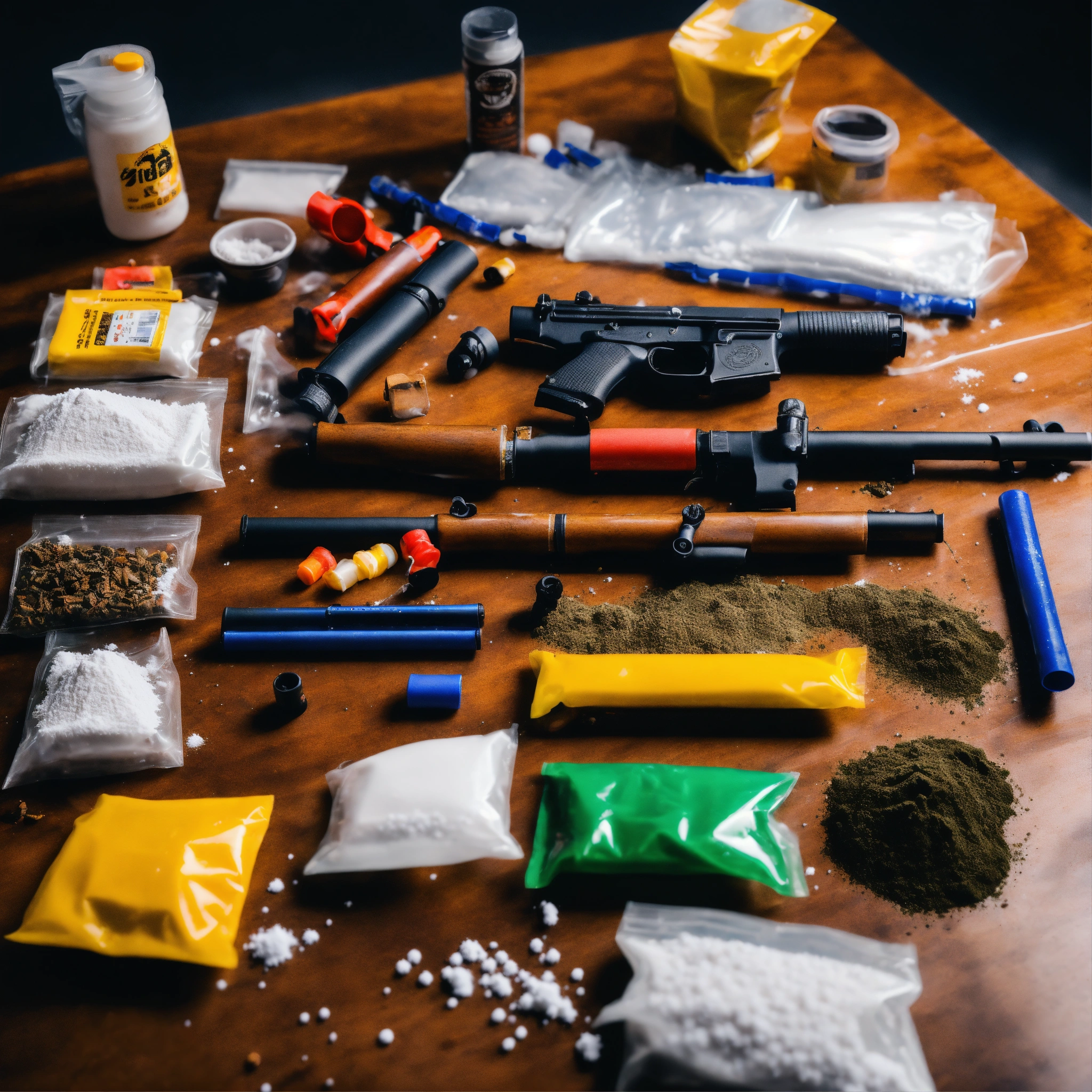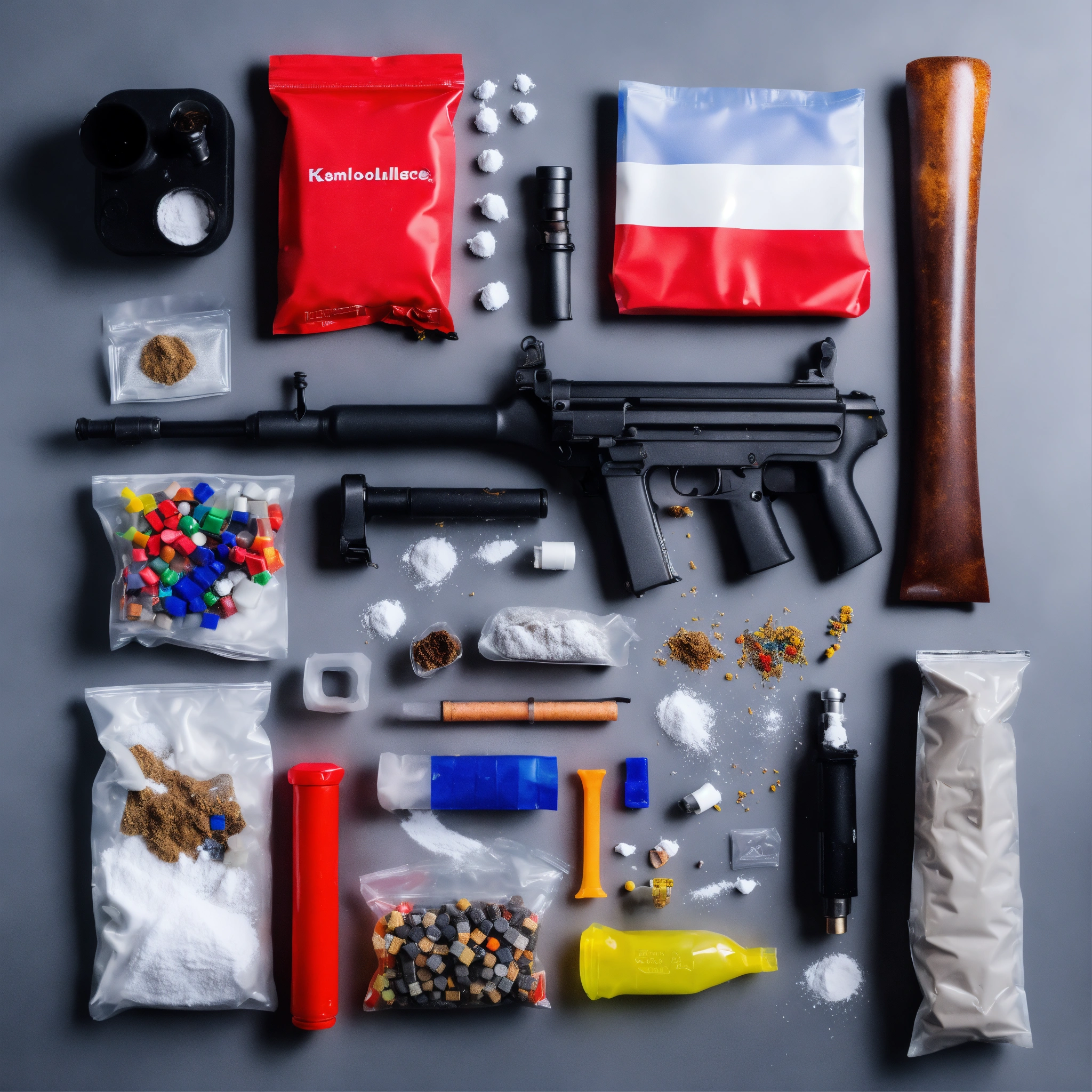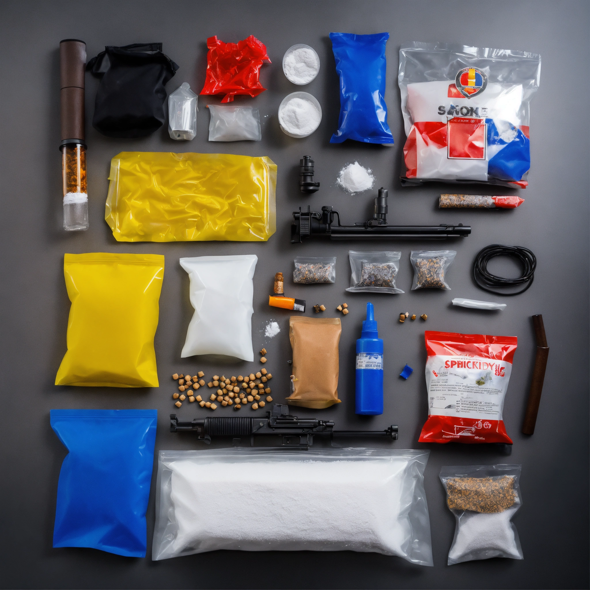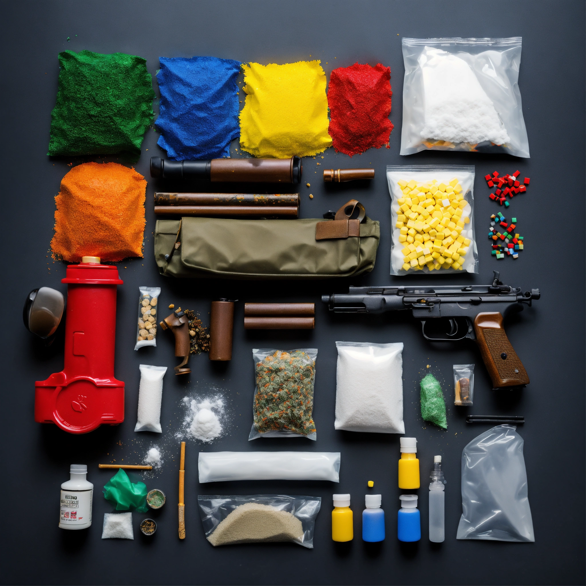 Components of a submachine gun mixed with smoking pipe, knolling layout, 8k, with primary colors, with a lot of white powder in the background and plastic zippy bags full of white powder