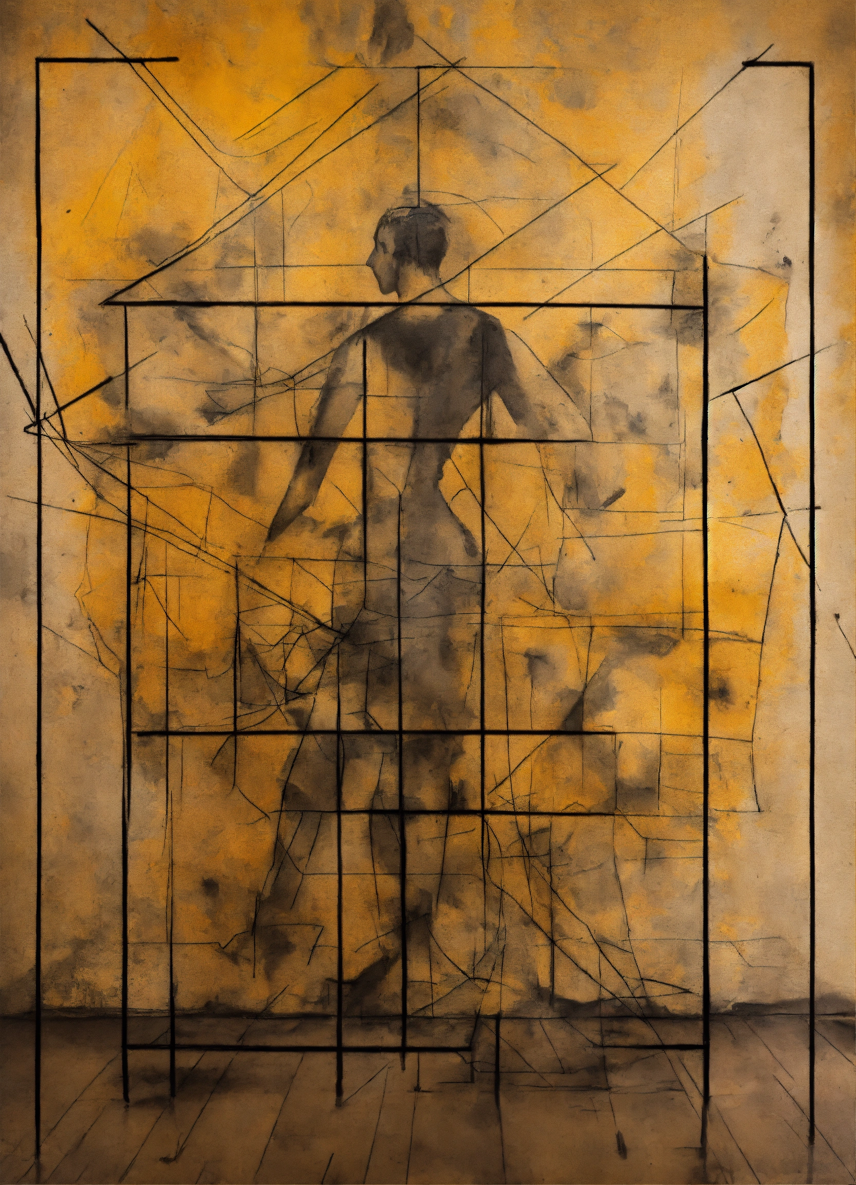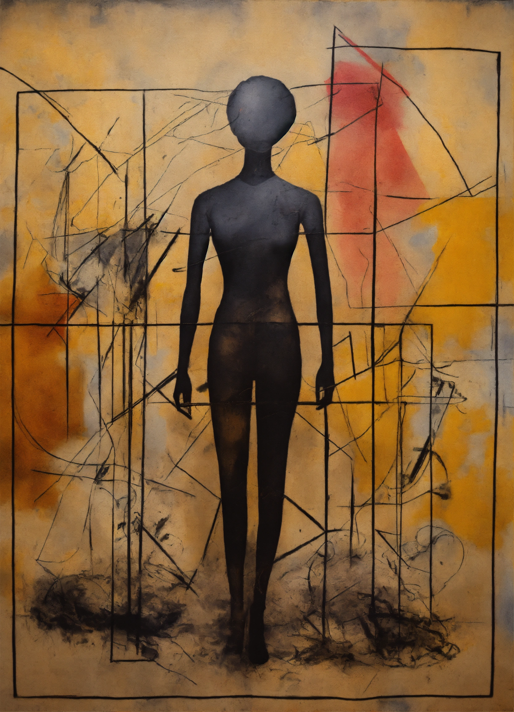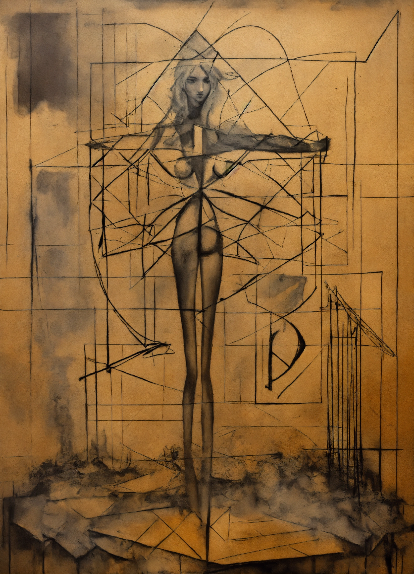 Create the outline of personification of chaos, painted with a few charcoal smudges. in the background there are three geometric figures overlaps. all on a grunge wall.