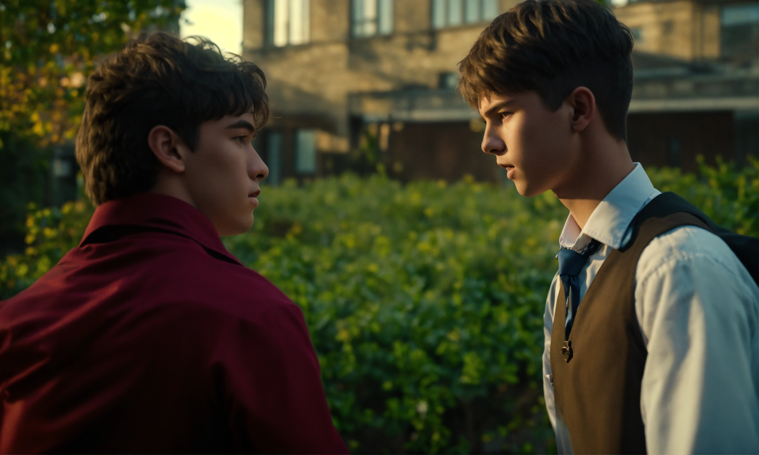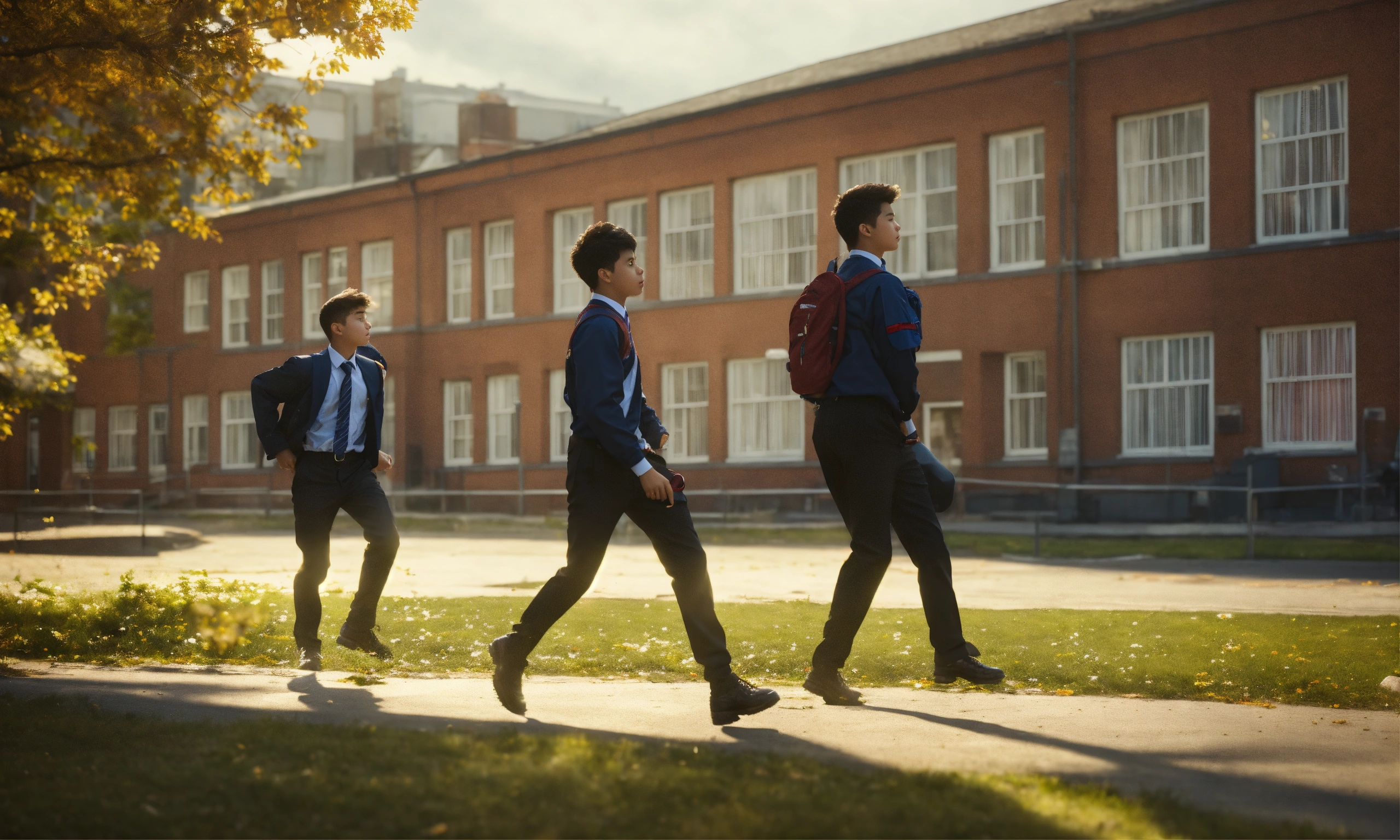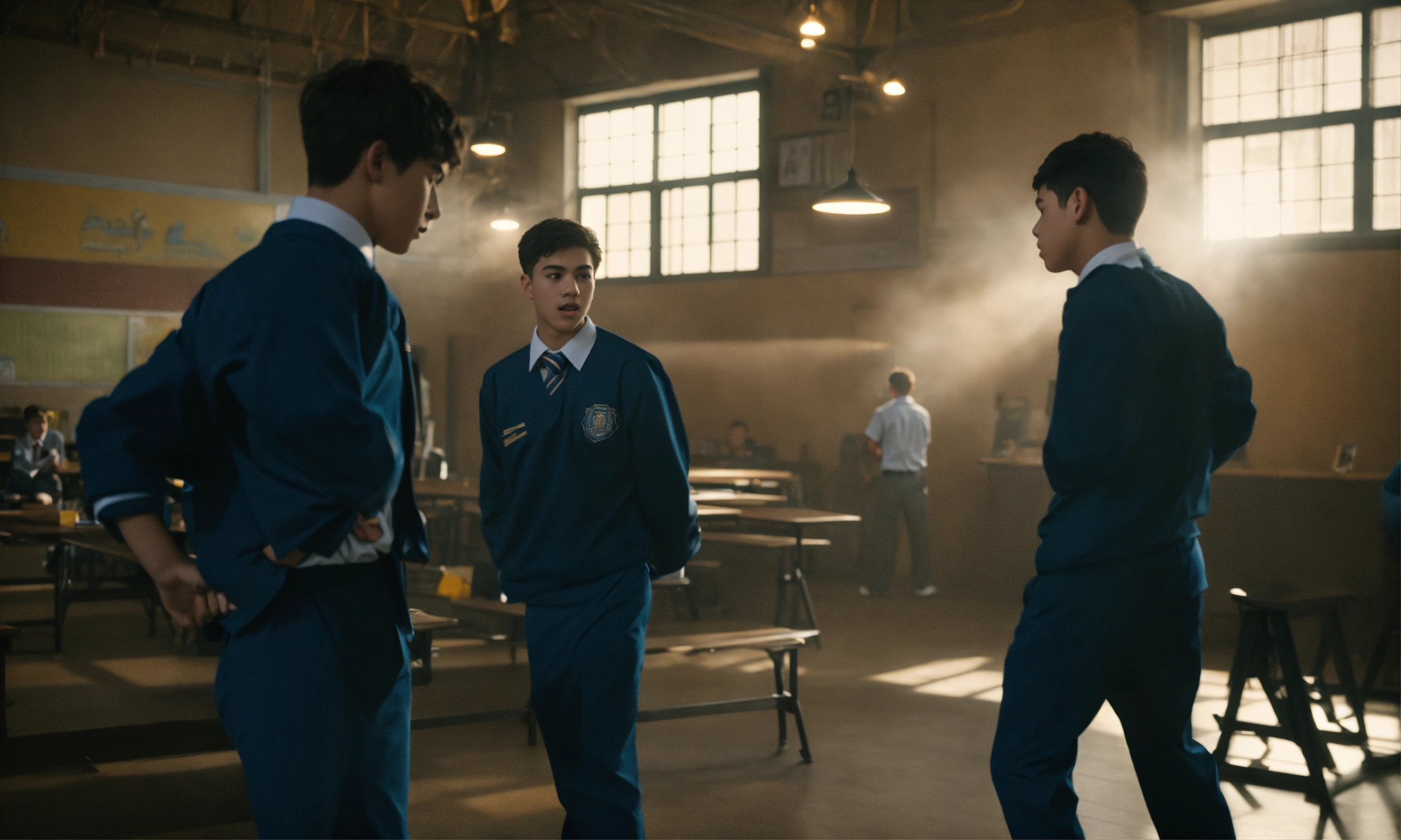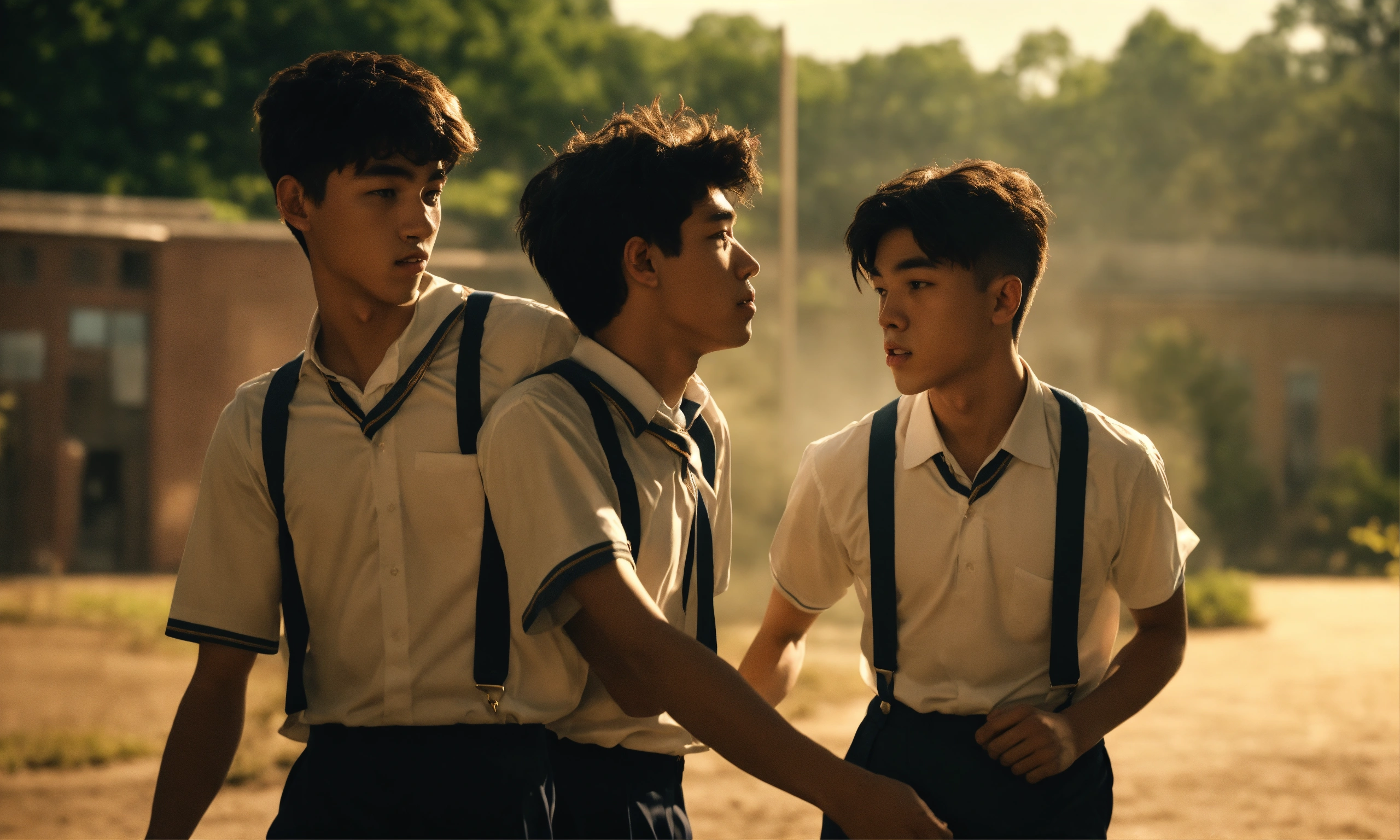 Two high school students boy1 boy2 in school uniforms engaged in a fight and their friends are trying to hold them back, mood lighting, wide front shot, 8k, luxcorerender, earthly colour, cinematic photography, real humans, real images, matte finish, shot on arri anamorphic, extreme wide shot, smooth, sharp focus, ornate, highly dynamic, particulate, hyperreal, wide shot