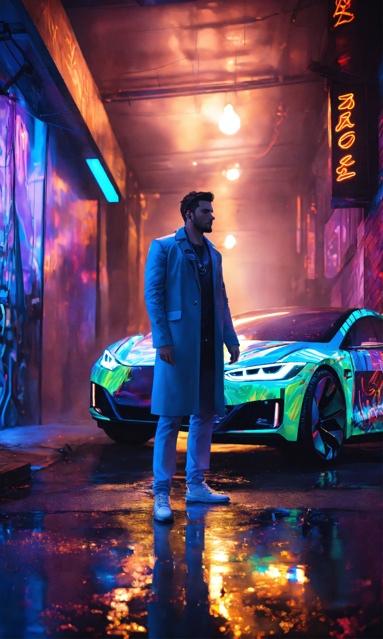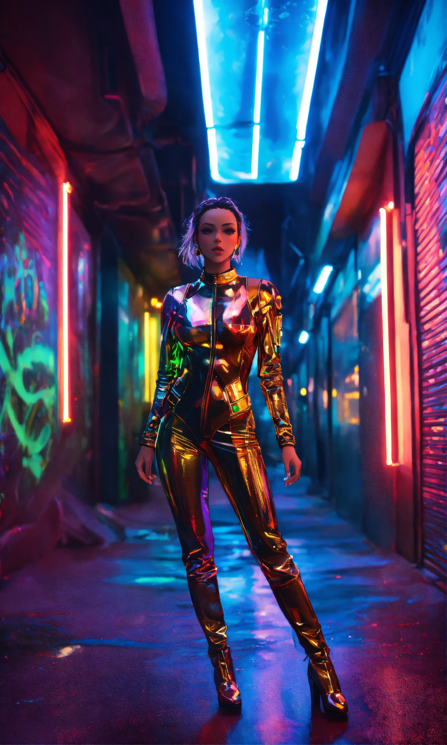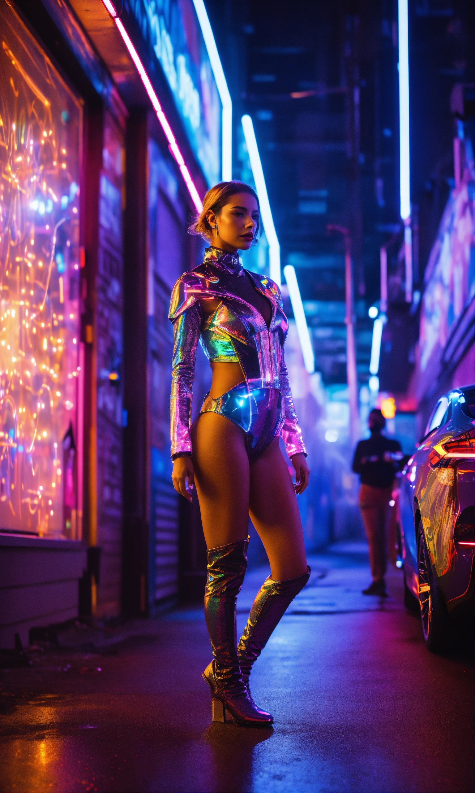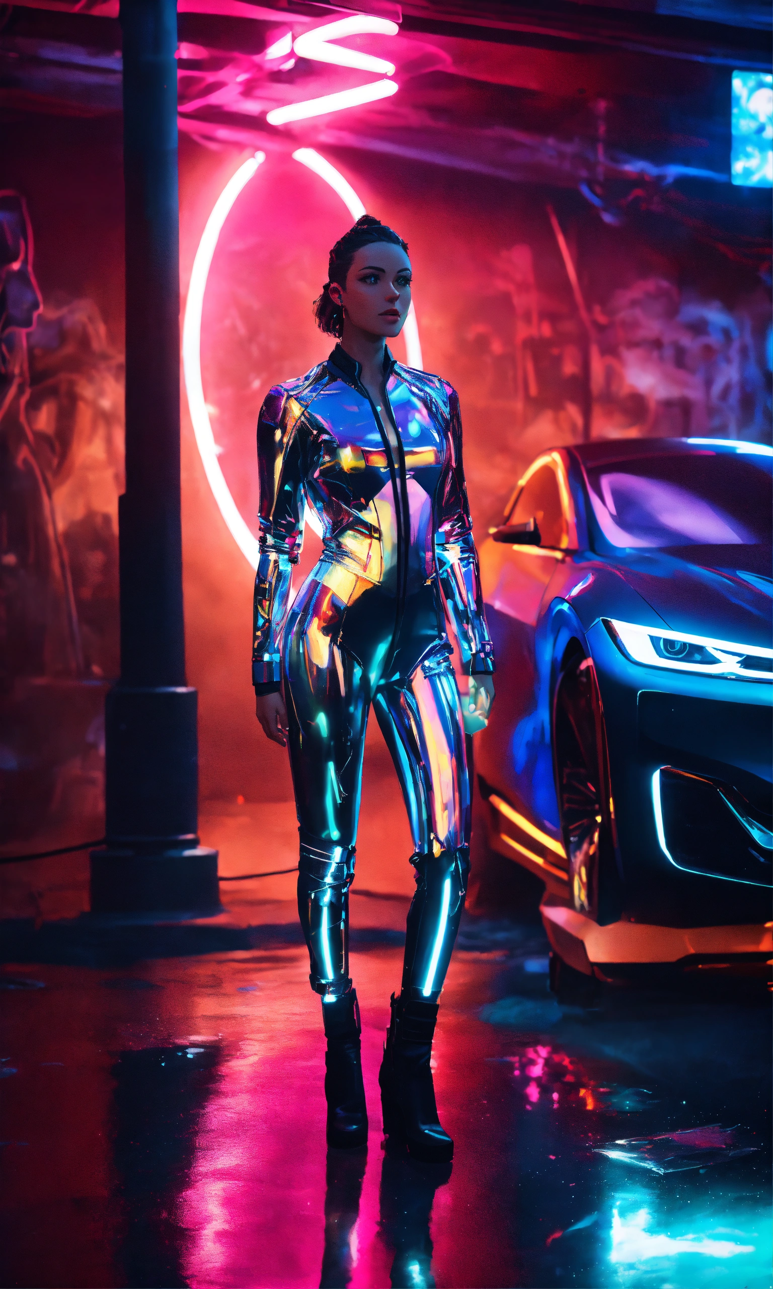 Full body shot of a beautiful woman in a glass futuristic suite with neon smoke pattern. a man in a cyborg suite with reflections and mini lights talks to a beautiful woman in a glass futuristic suite very detailed iridescent shot of man talking to a beautiful woman in a futuristic glass suite a man in a verybstylish vehicle tesla and bmw combined with lots of gloss driving through an alleyway in vancouver at night beyween wallsnpainted in graffiti and garbage bins. lots of people by the nightclubs filled with smoke. very intense views and many neon smoke reflections. playstation 5 graphics, vray, super highlights, real depth, real shadows 8k 16k 32k 64k 128k