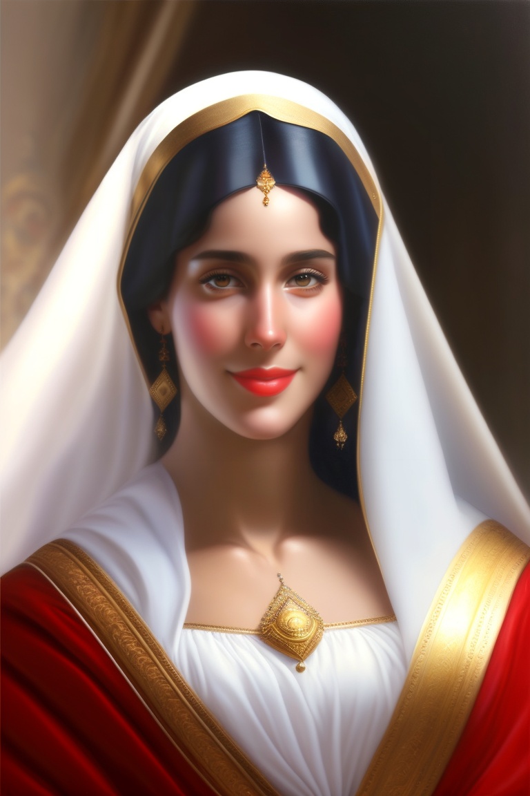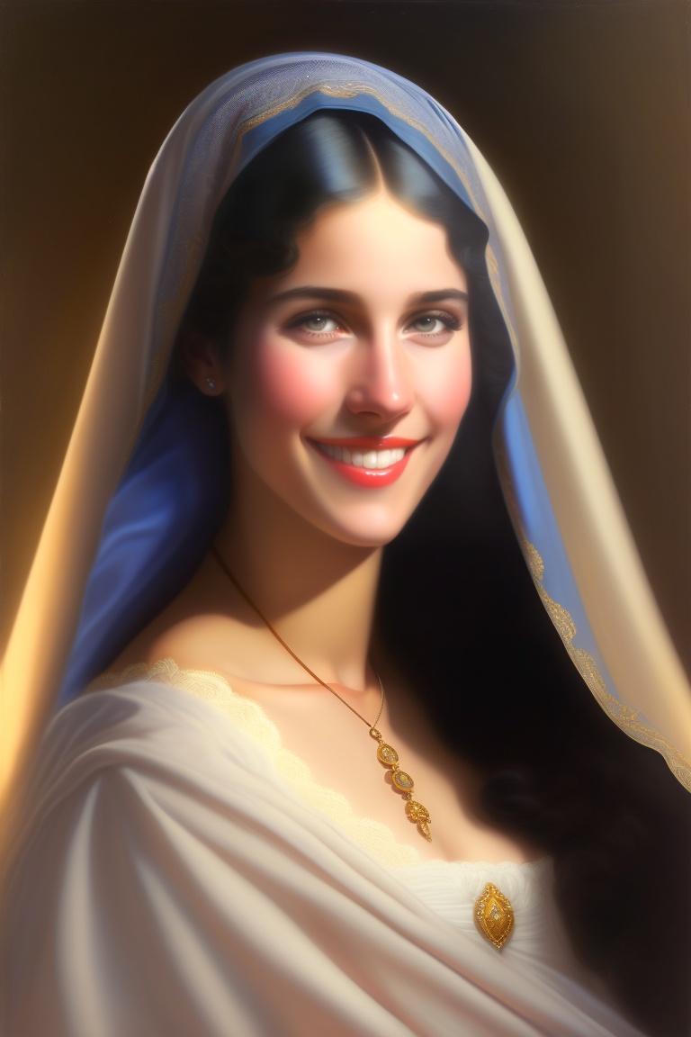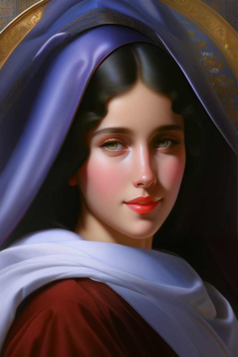 Virgin mary catolic clasical bikini beautiful sonriendo inocente ultra realistic black hair virgin mary with veil over face, painting by william adolphe bouguereau