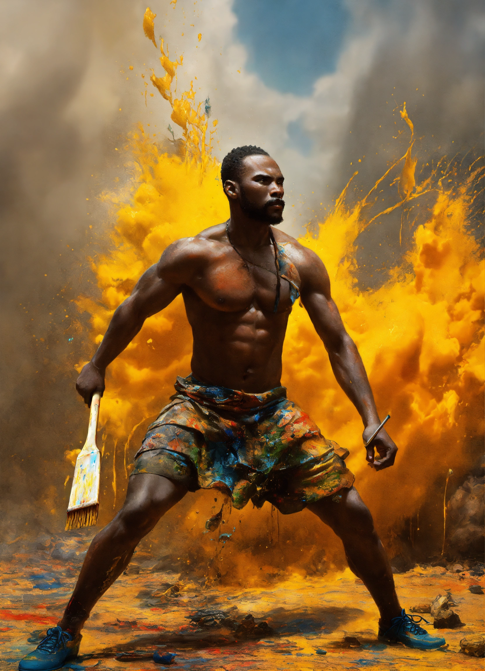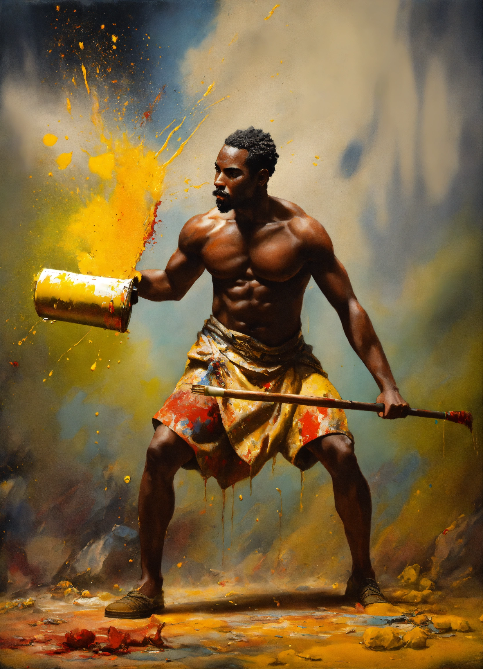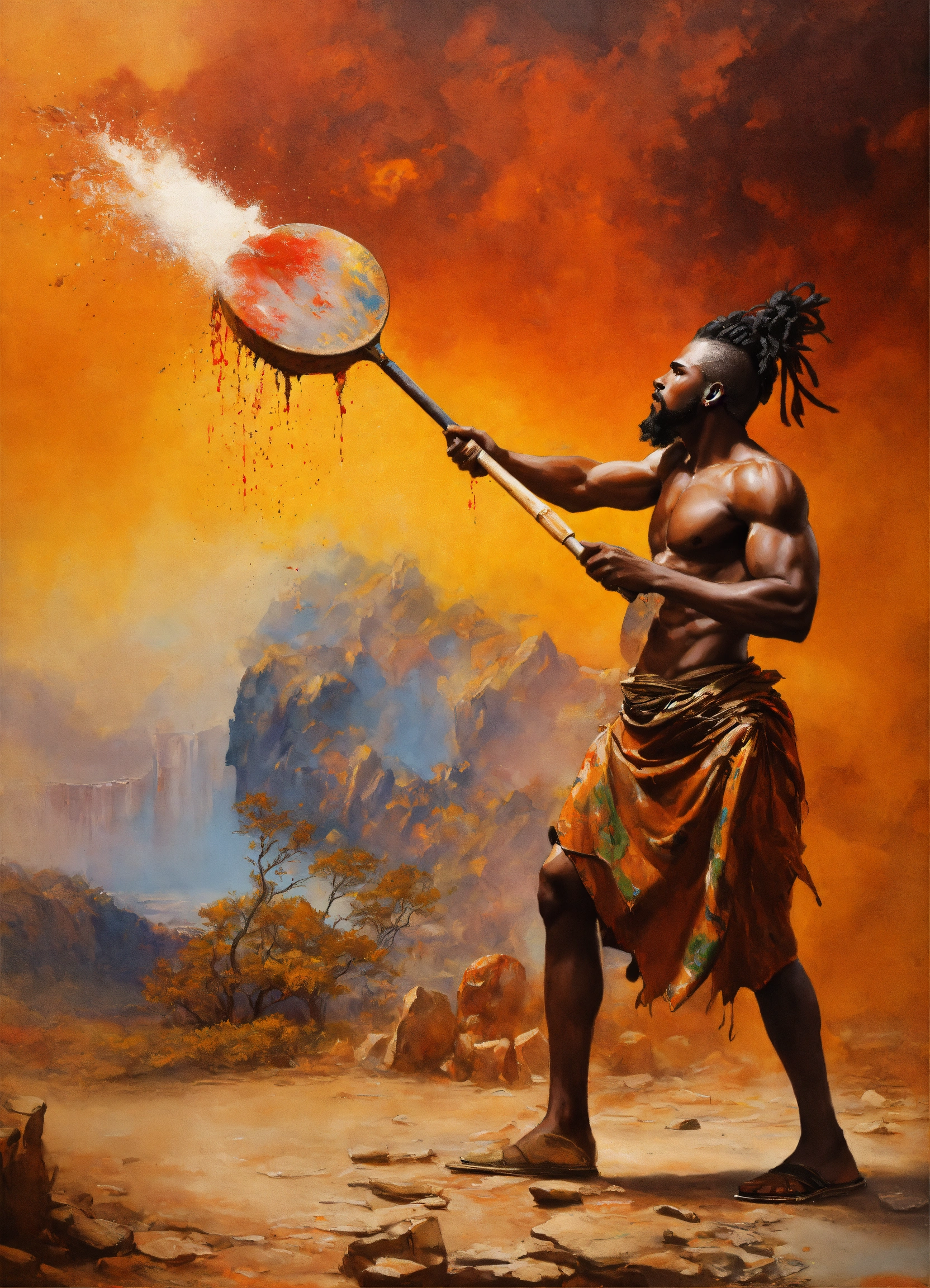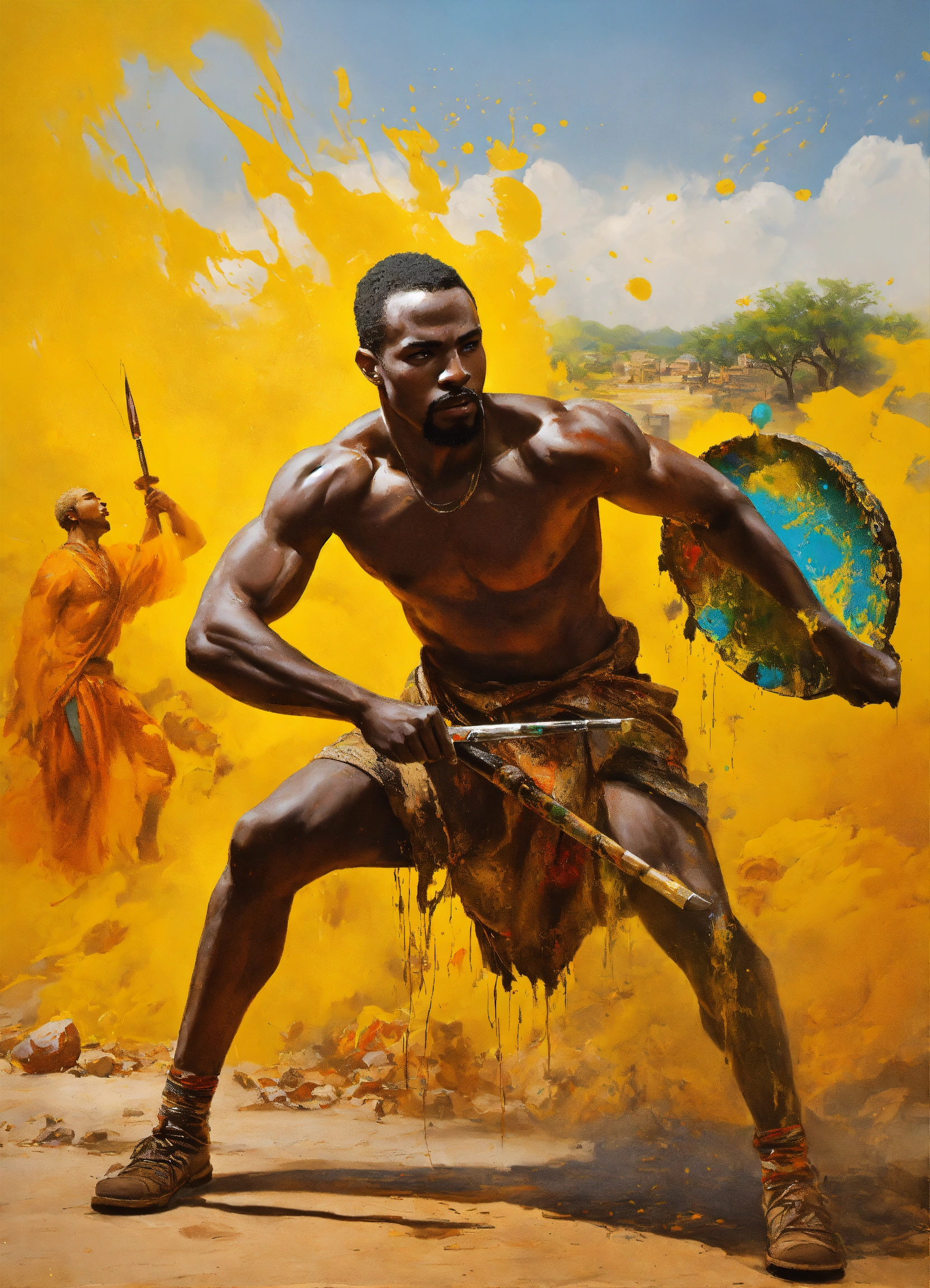 African, a male artist fights against a large paint pot, african modern warrior artist, he carries a large paintbrush as a weapon, beautiful matte realistic painting of a of a fantasy landscape, african sculptor, african sculptor, a man carving wood, surreal enigma, creative, surrealism, imaginative, paint splatter, ripped canvas
