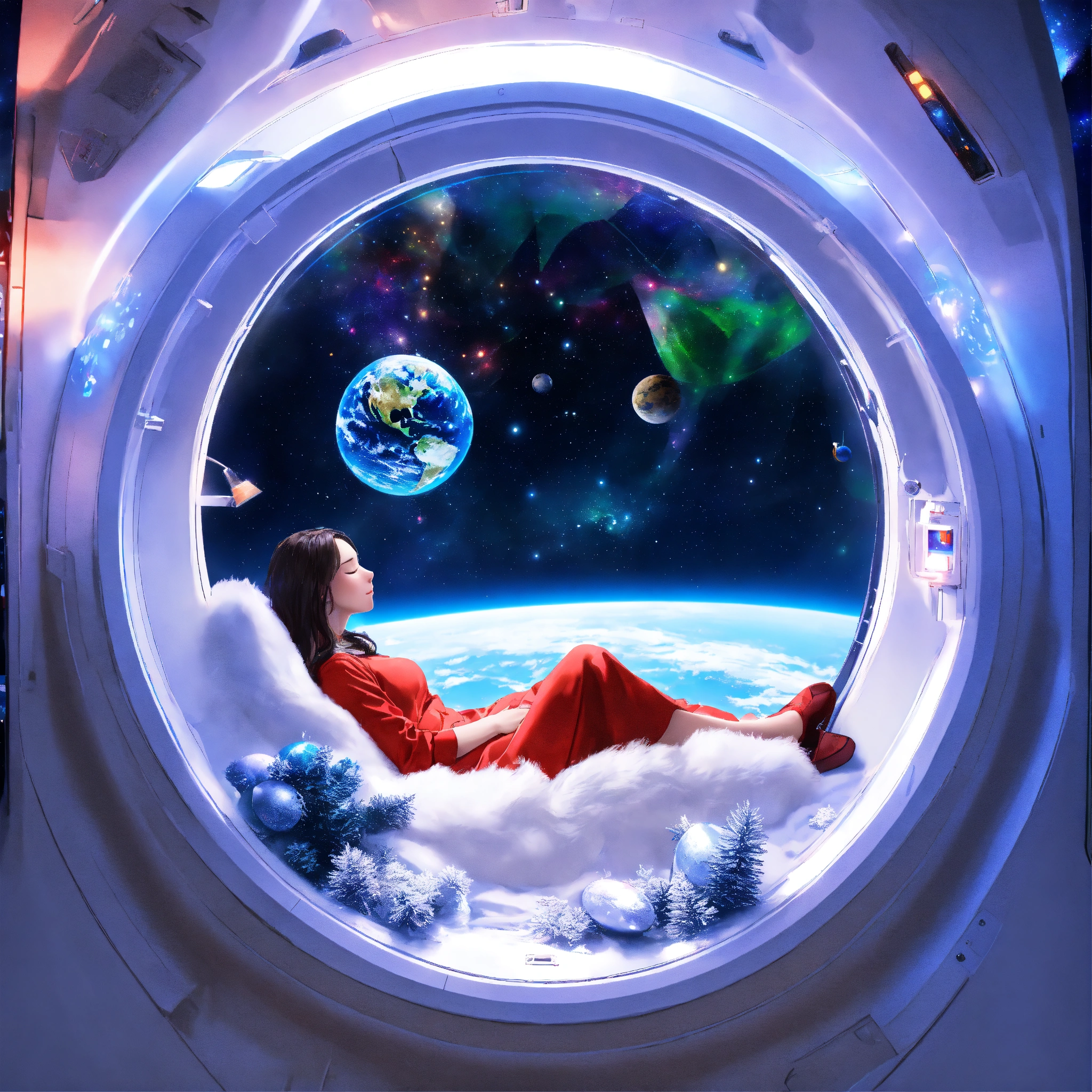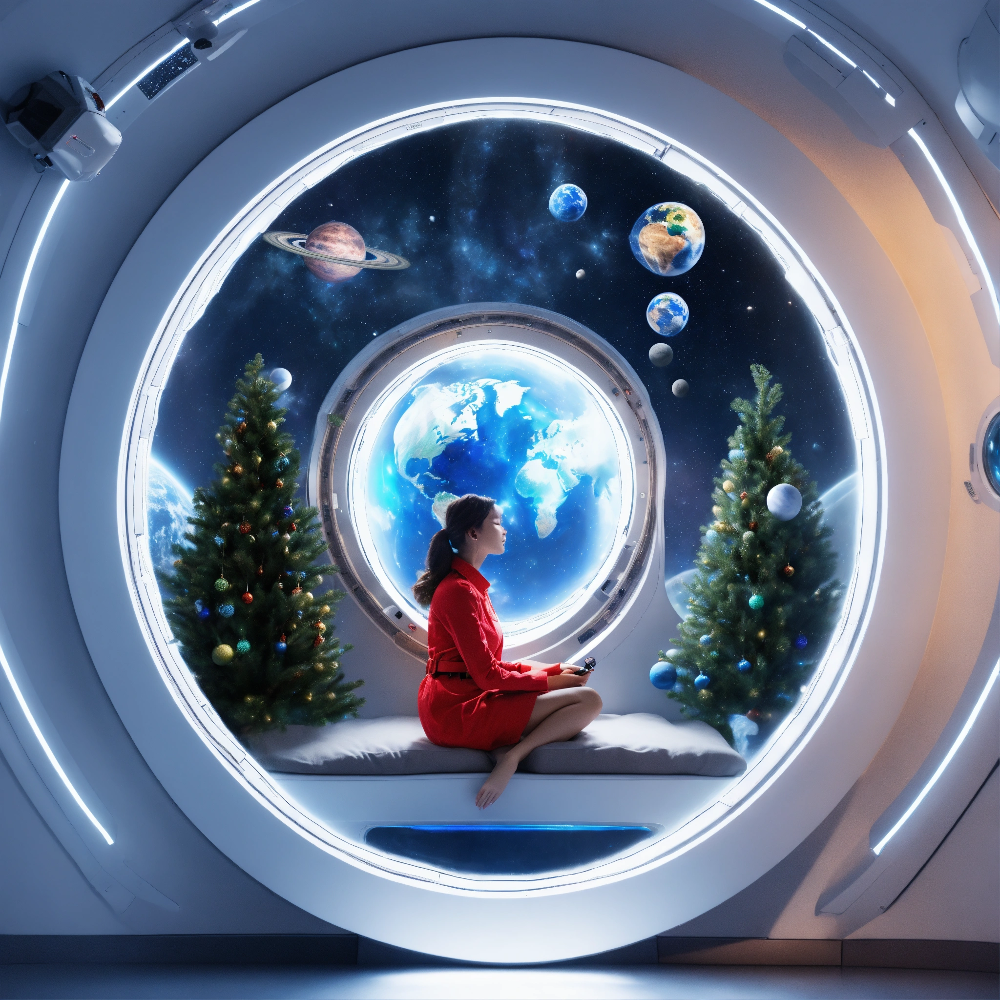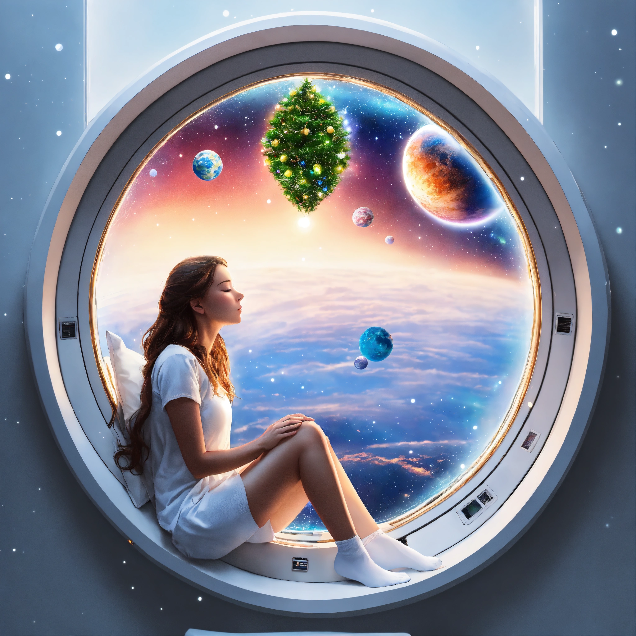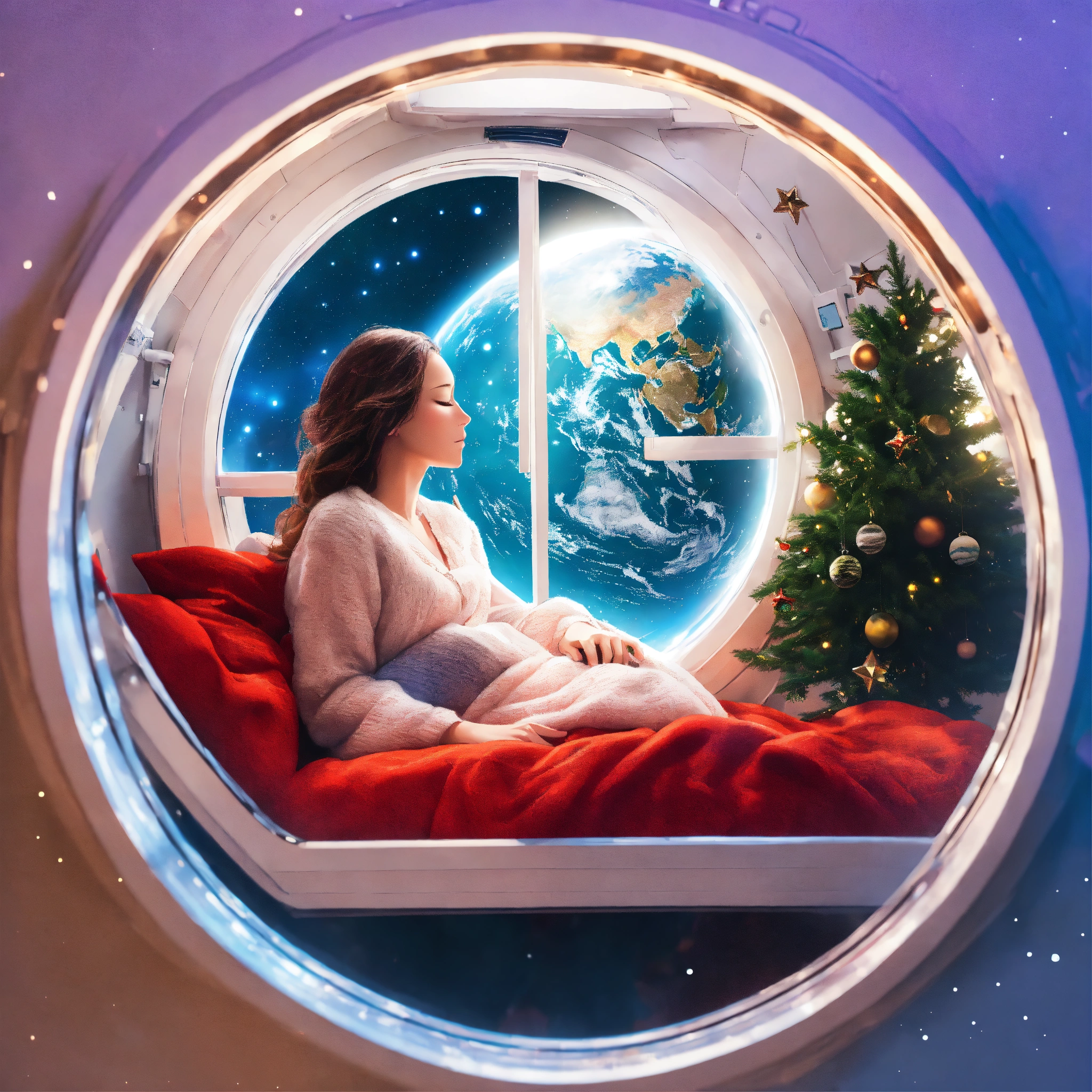 Woman sleeping near window and watching earth from spaceships window and have small chrismas tree inside spaceship, in circle image, holographic, best quality, white outside of circle, white background, just 1 planet