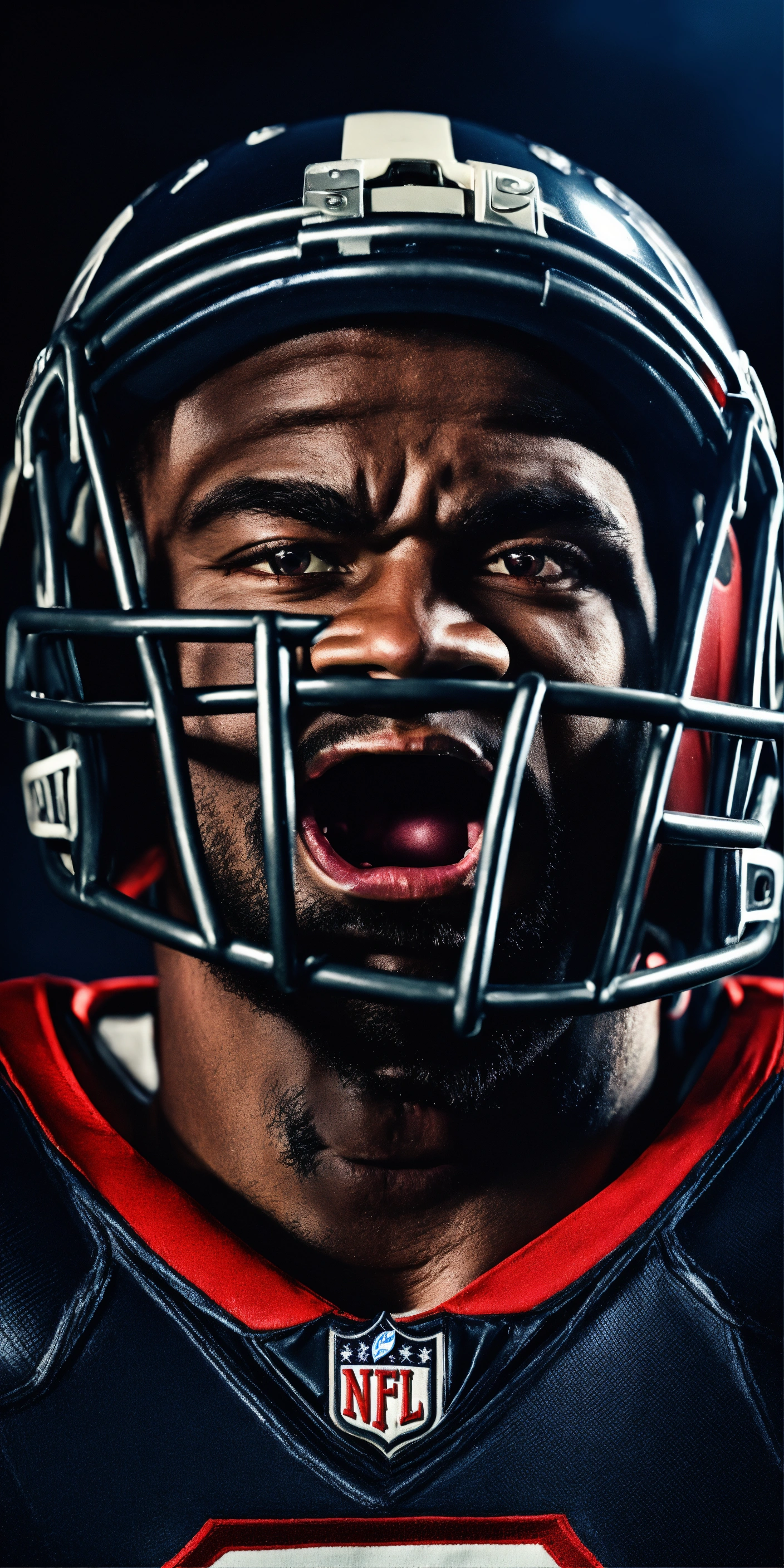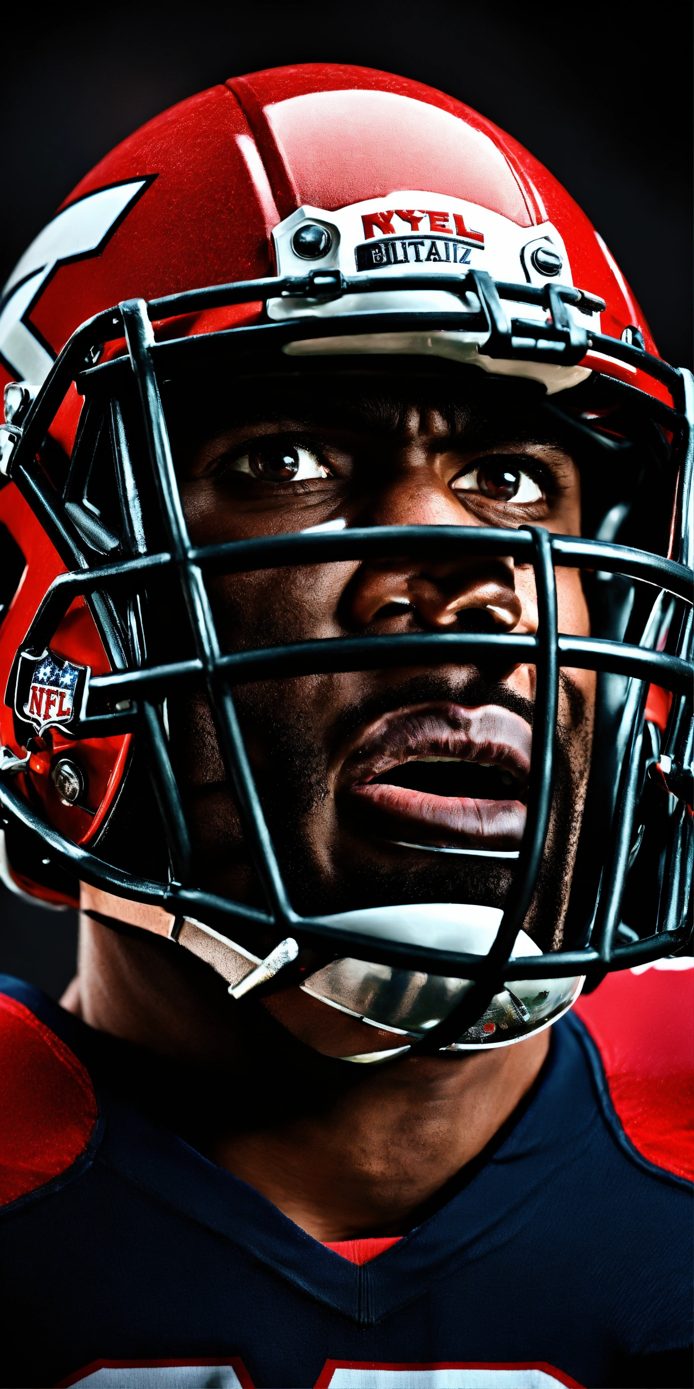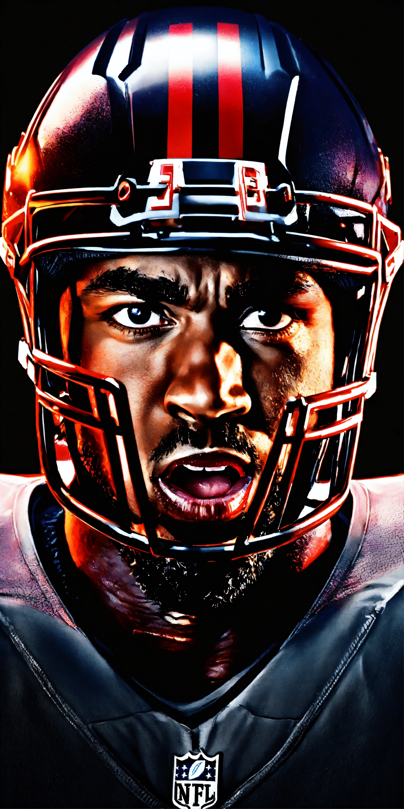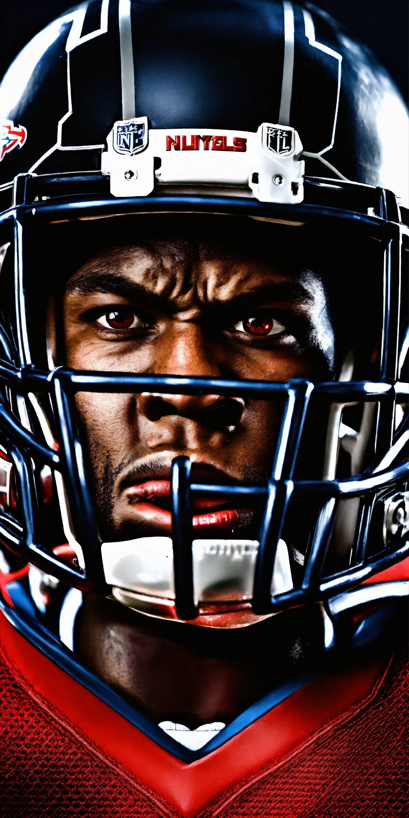 Portrait of aggressive american football player, photography, dramatic lighting, hyper detailed, hyper realistic, black background, angry face, tough looking, red eyes, video game cover, nfl blitz, mouth closed, hyper realistic photo