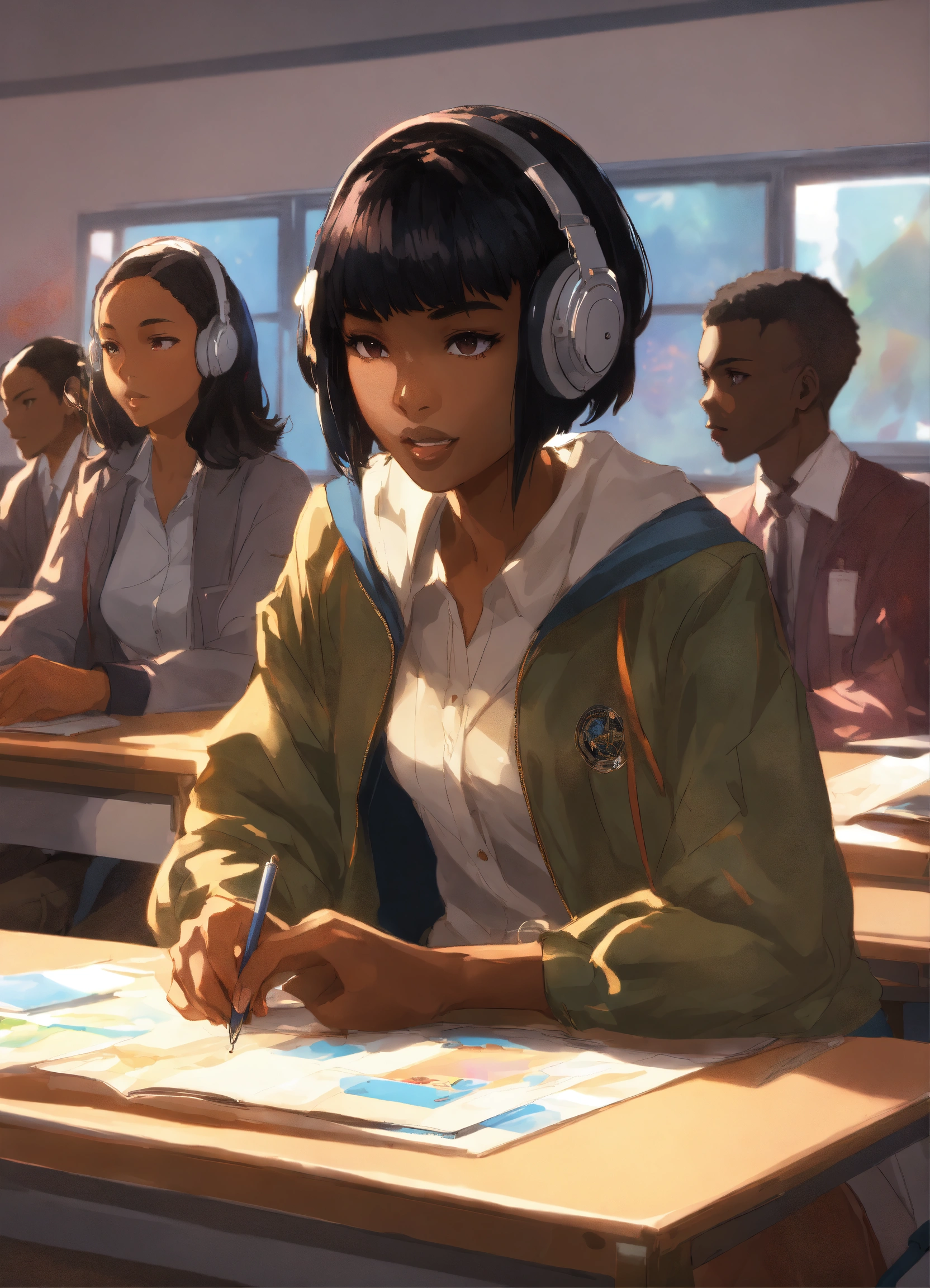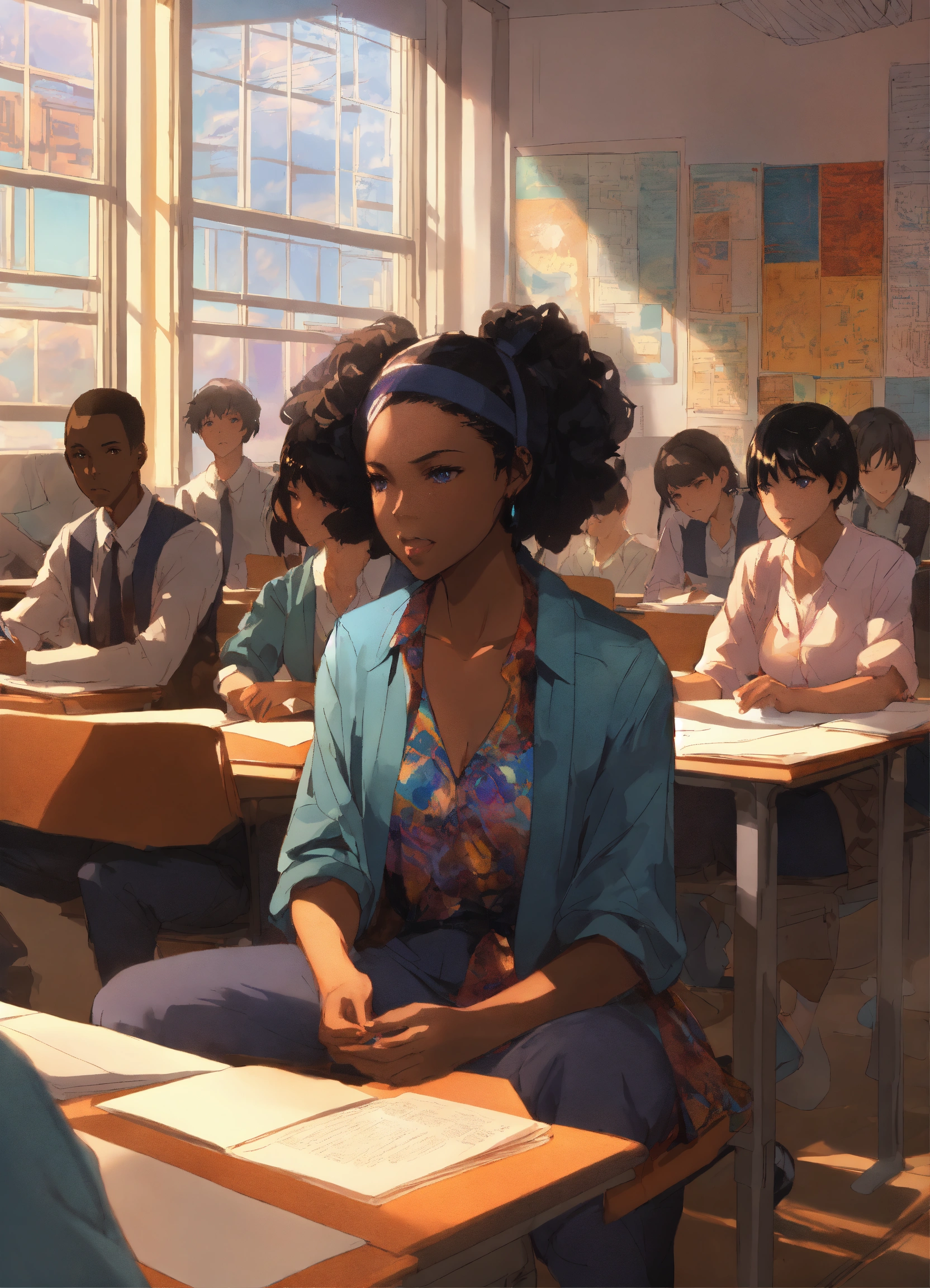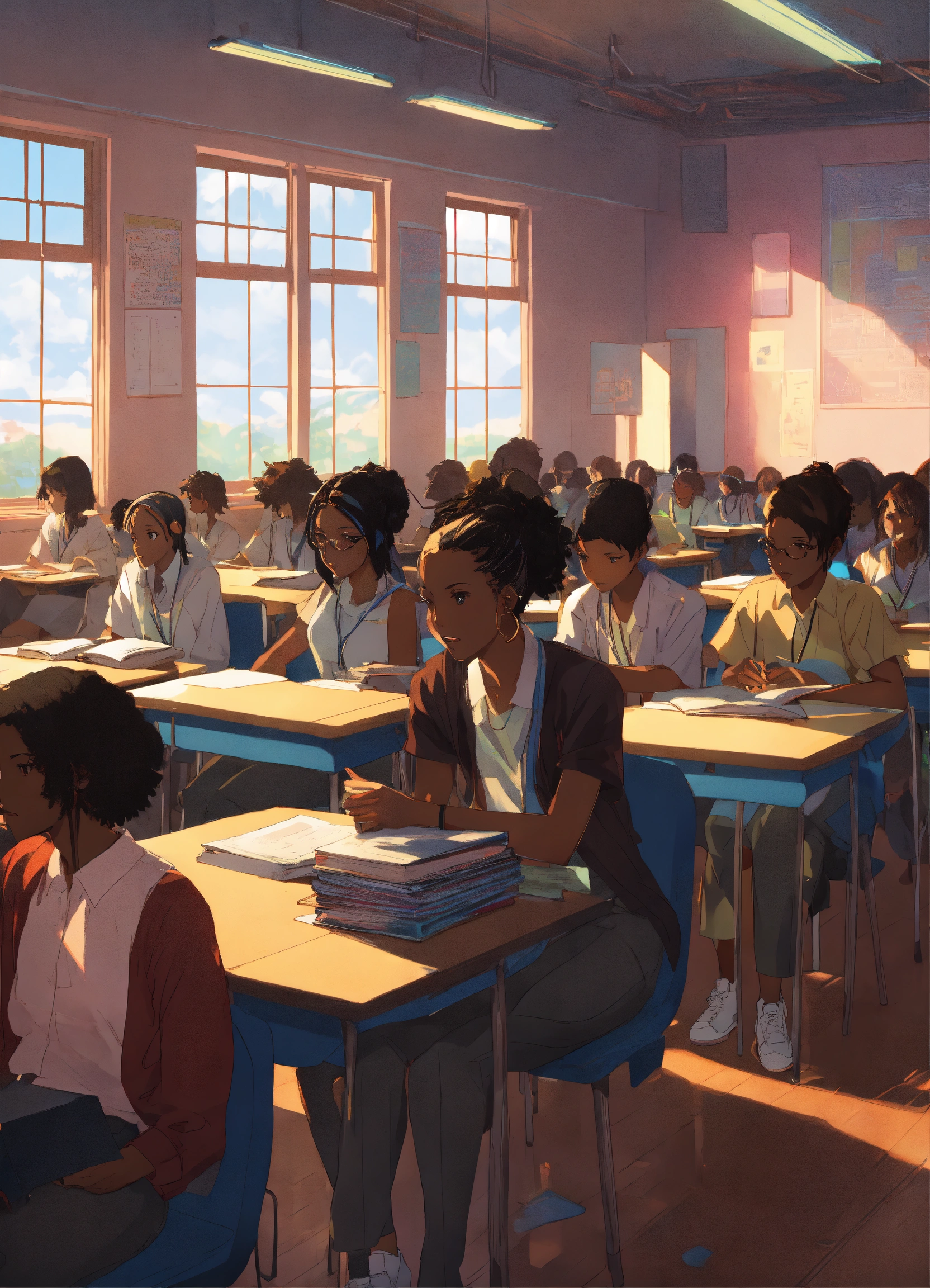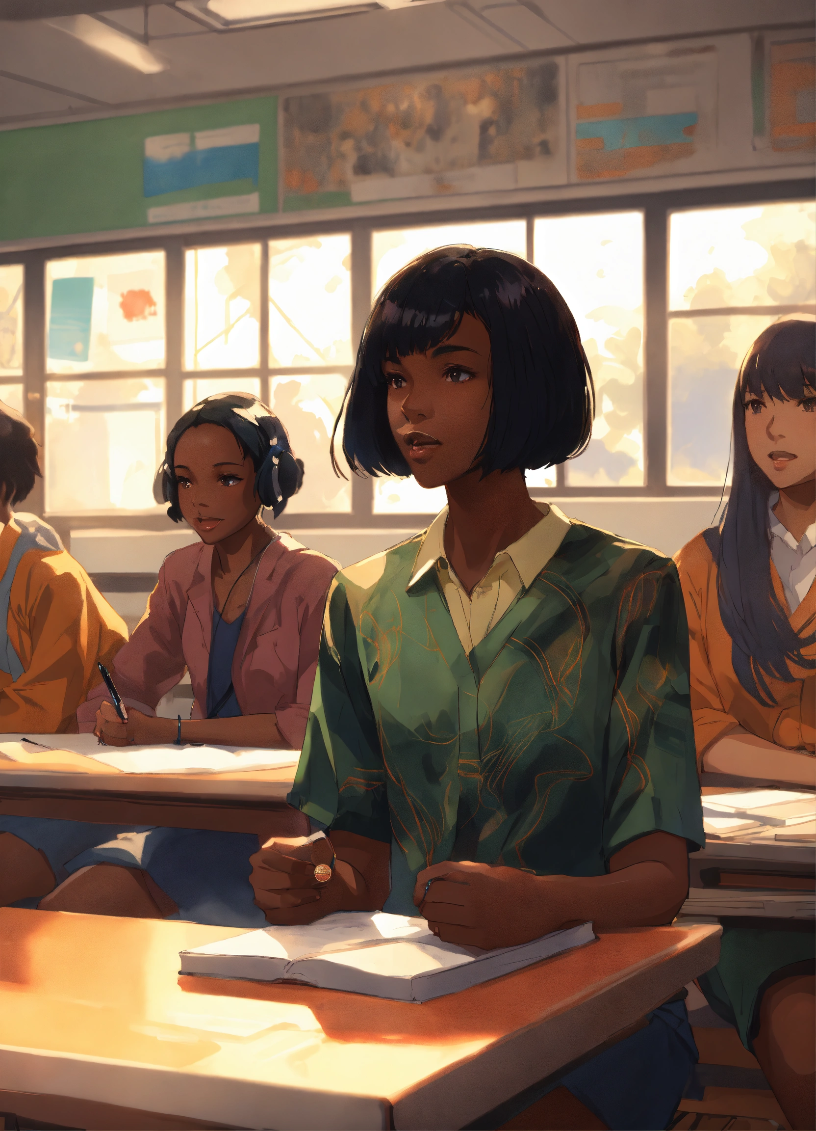 Classroom full of college age black students with a focus of on a black girl with short straight black hair, dressed in modern clothes, sitting in class psychedelic, patterns, sitting inside a classroom with a professor teaching in the background, classroom in the background art by wlop, greg rutkowski makoto shinkai kyoto animation key art feminine mid shot