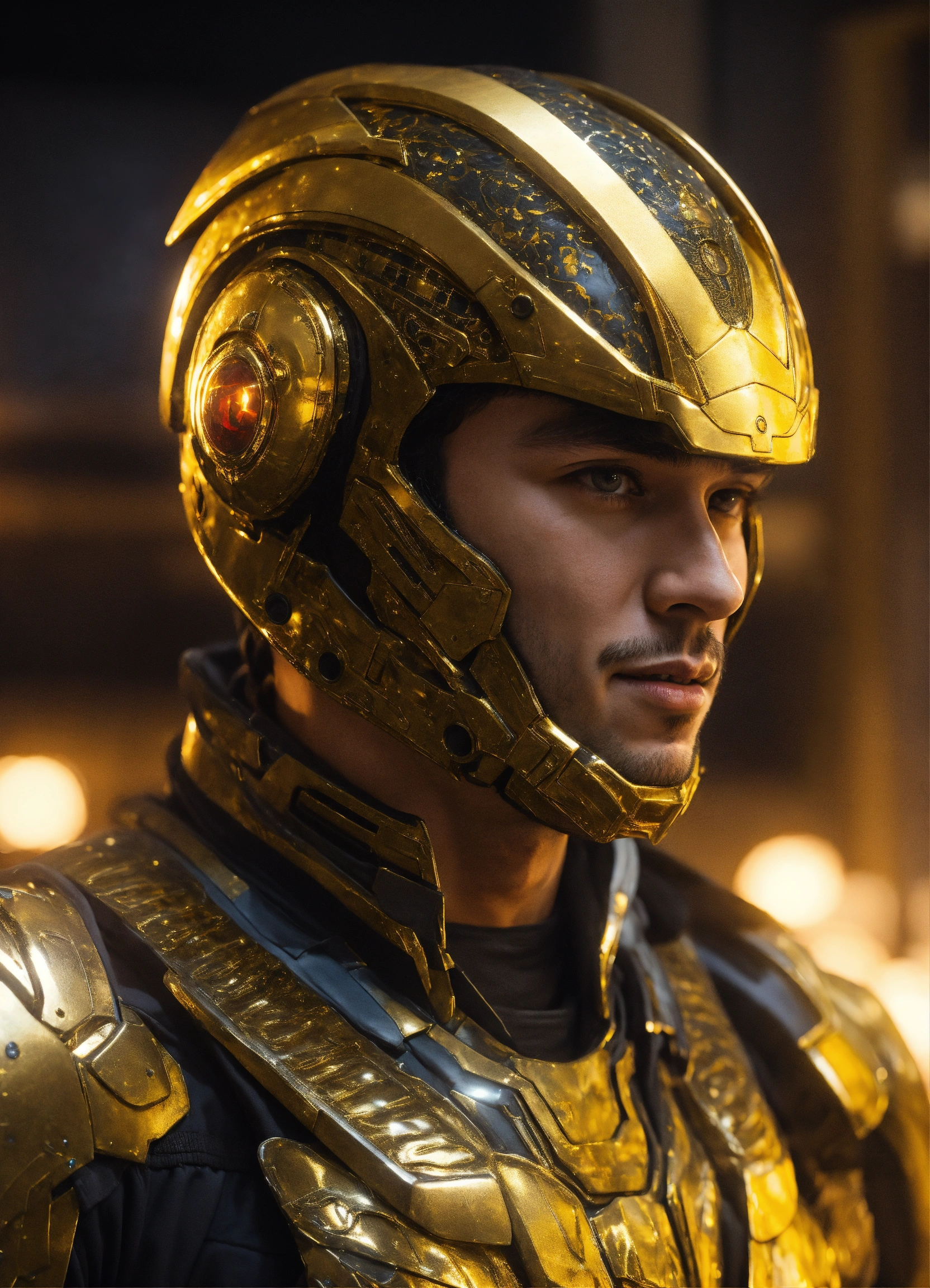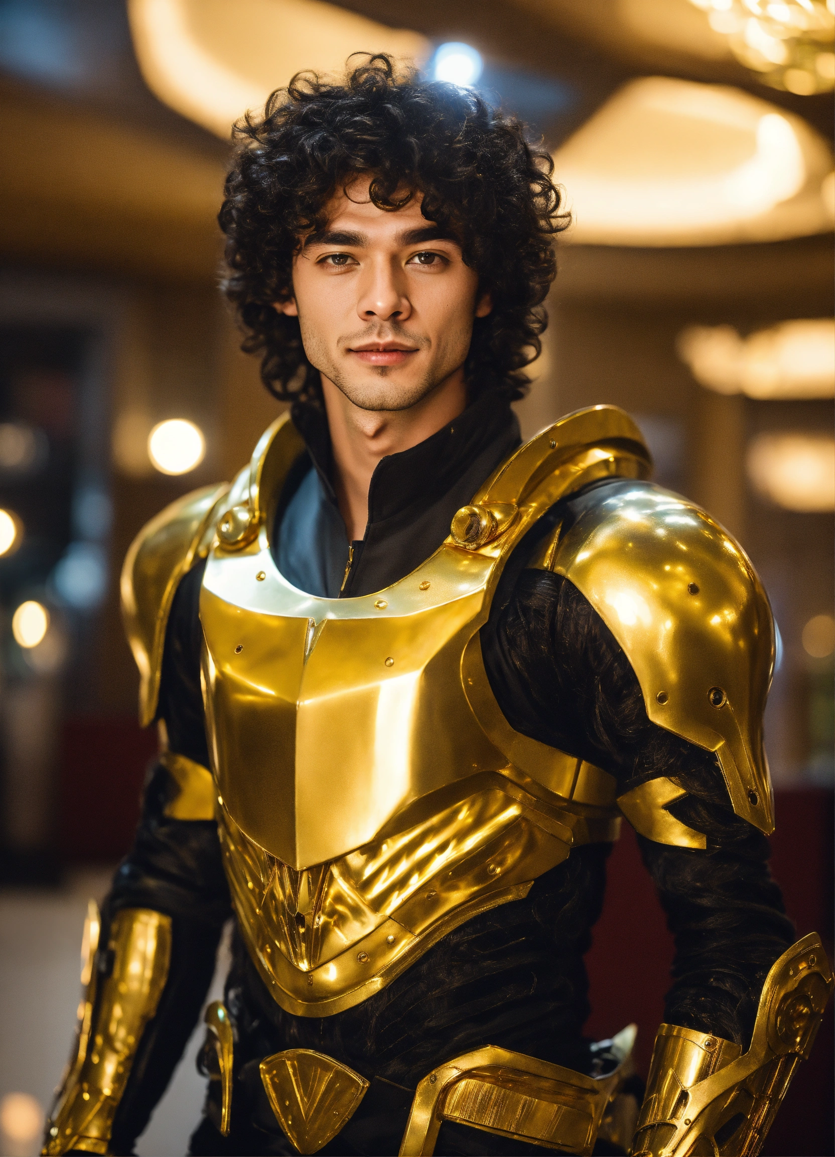 Happy alien 25 year old male, black curly hair. angular face, dimpled chin, spotted skin. in gold battle armor. athelitic build. in upscale lobby.