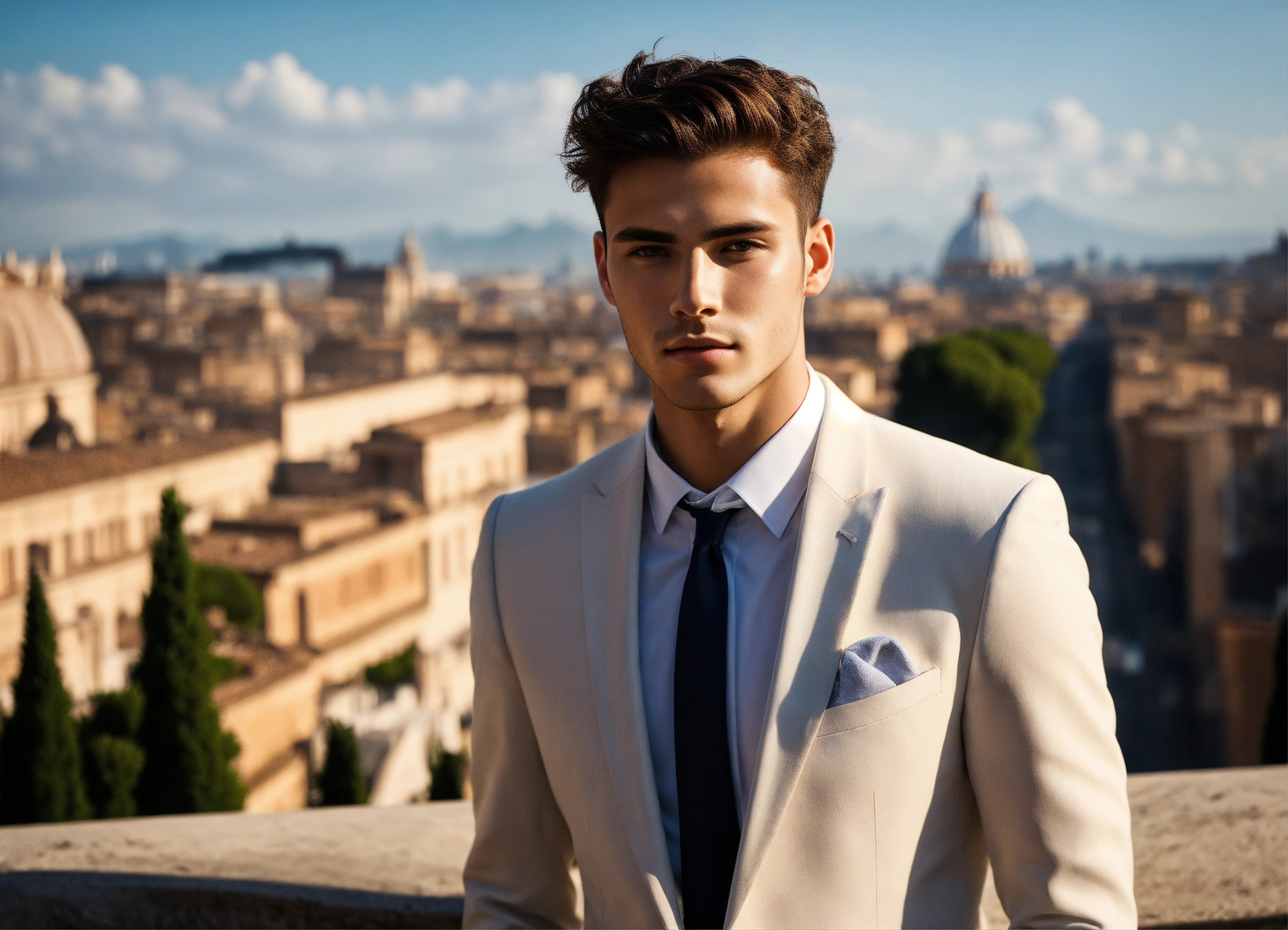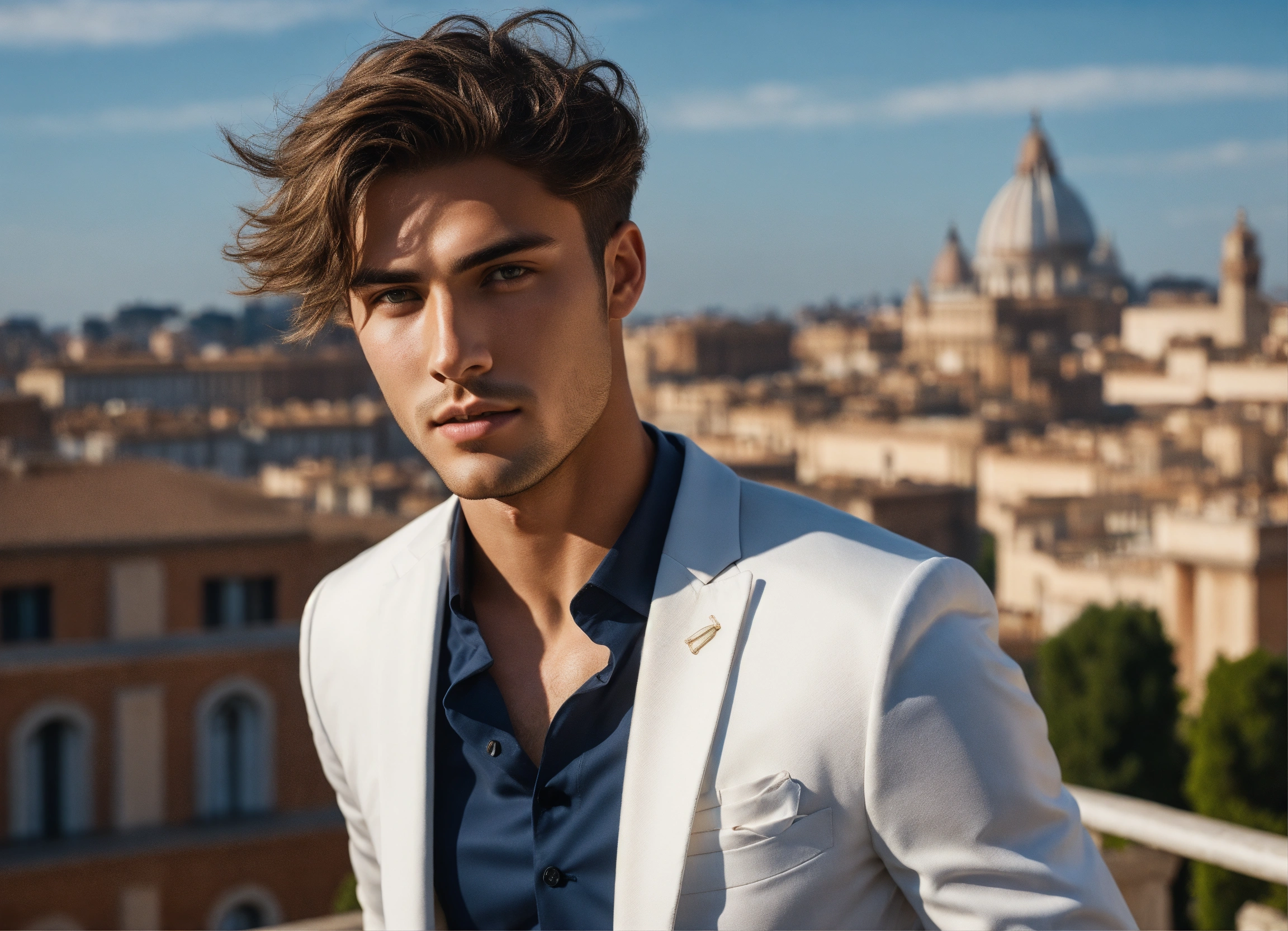 Photo of one young male model in whiteclothes looking to the camera, in front of the skyline of rome of rome, sunny day, not painted, very realistic and detailed faces, skin with pores, 4k, dark suit, skin not smoothed, looking into the camera