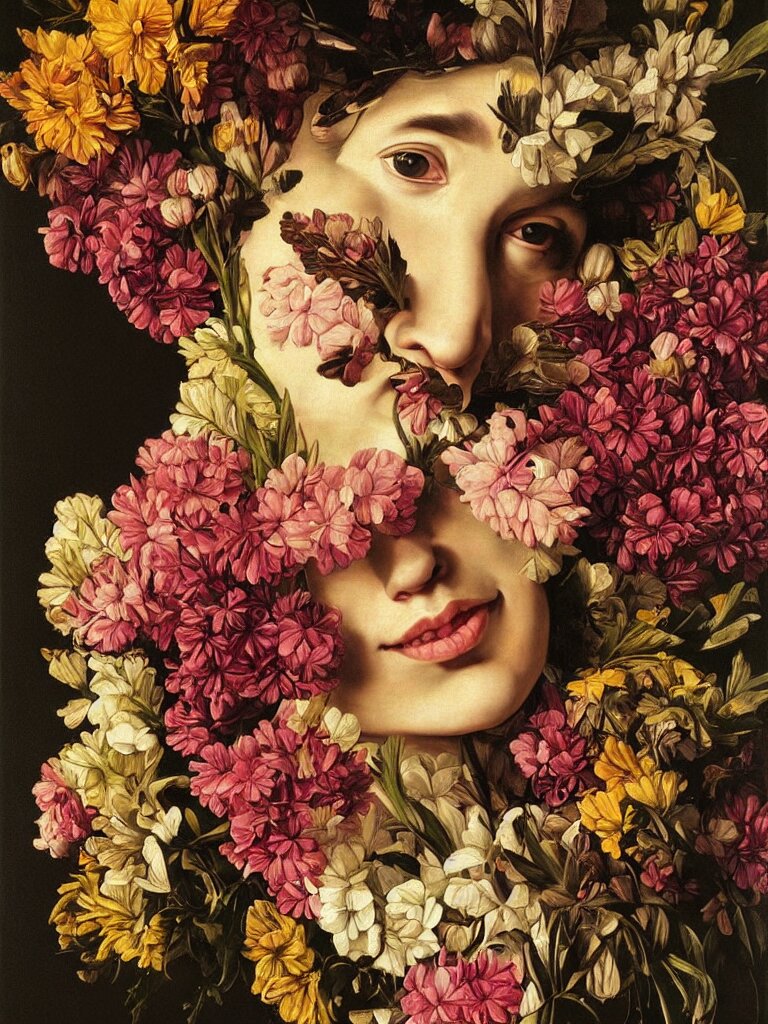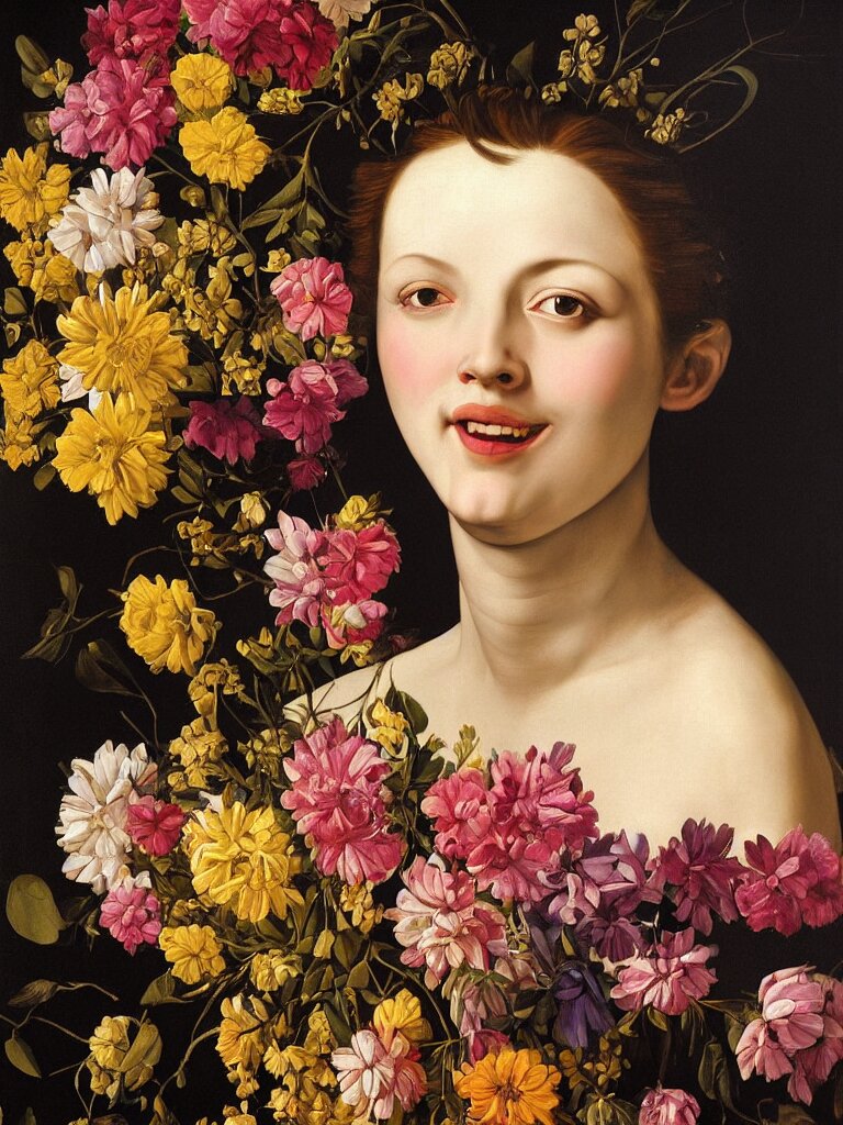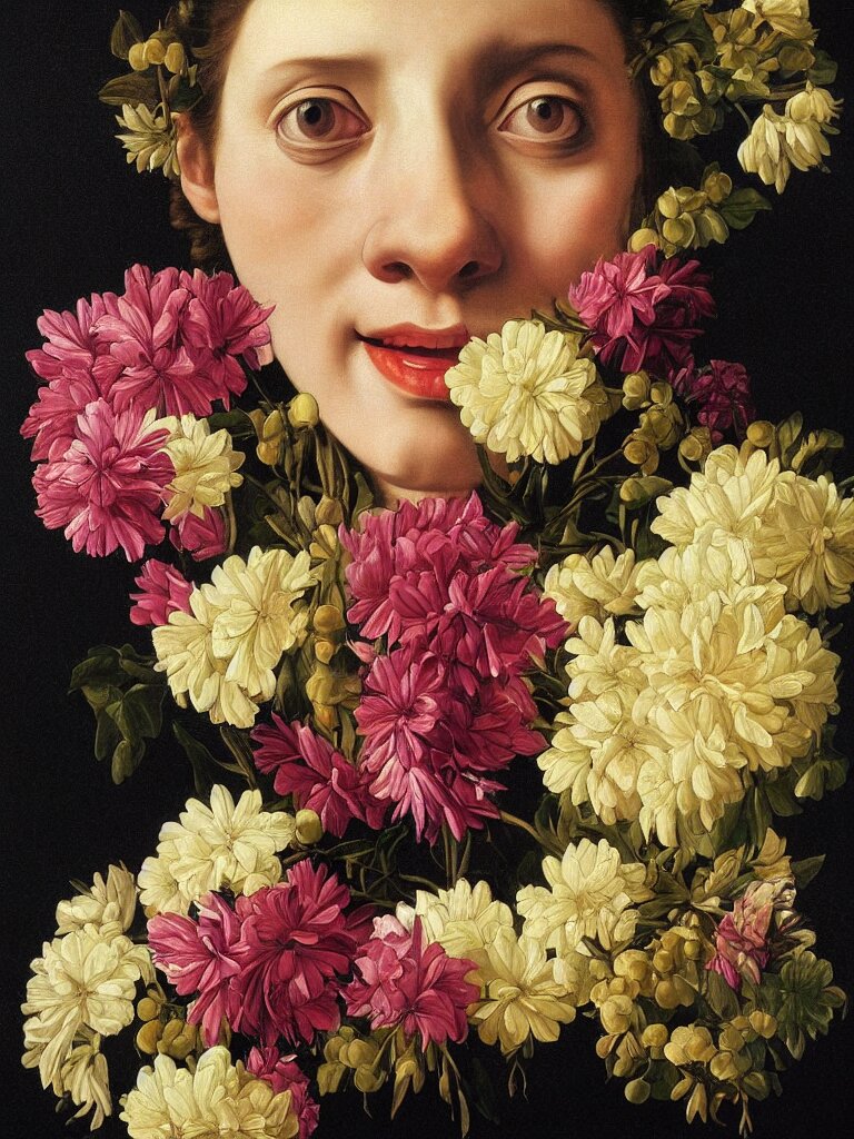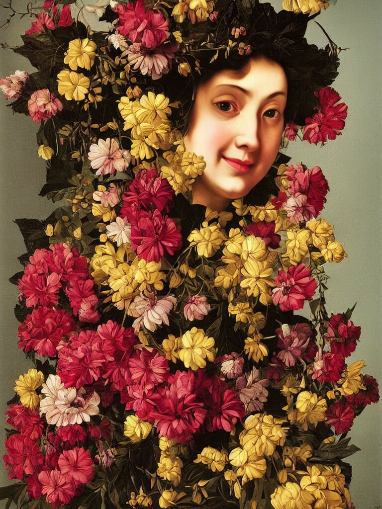 Hyperrealistic still life painting of a woman's face made of flowers that is smiling, by caravaggio, botanical print, surrealism, vivid colors, serene, golden ratio