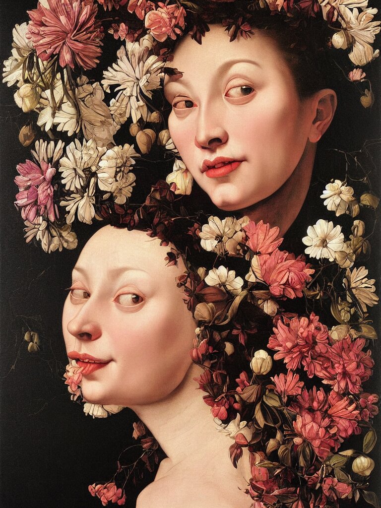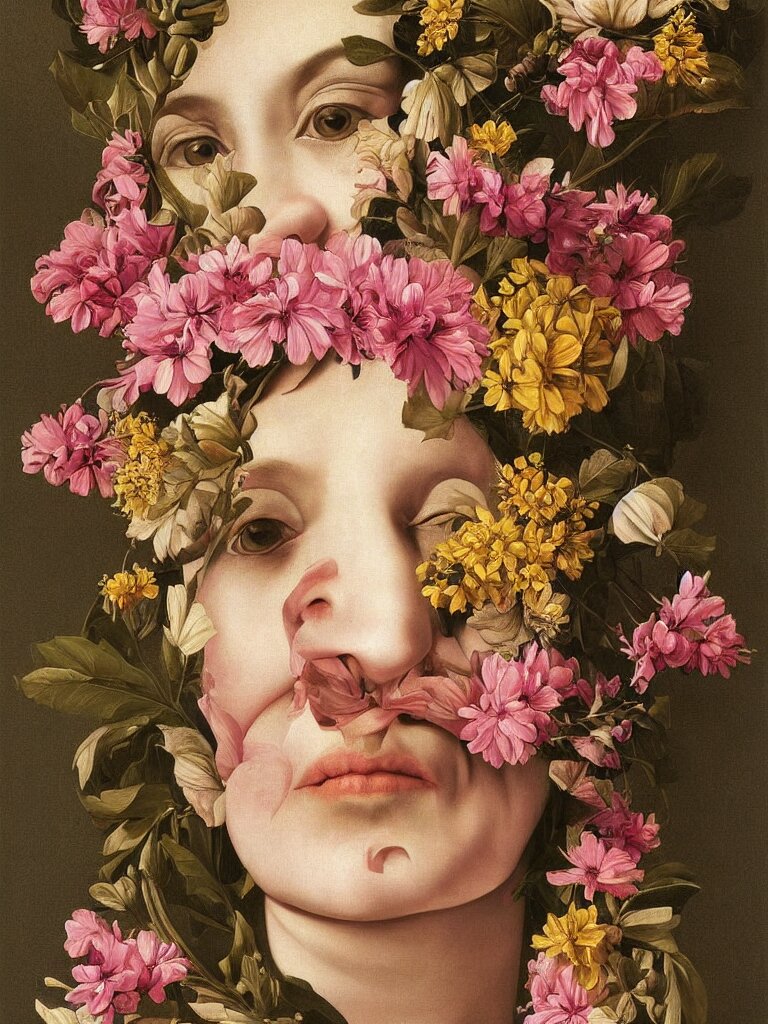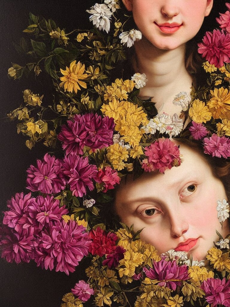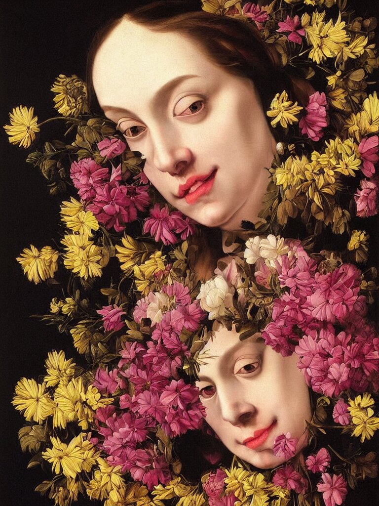 Hyperrealistic still life painting of a woman's face made of flowers that is smiling, by caravaggio, botanical print, surrealism, vivid colors, serene, golden ratio