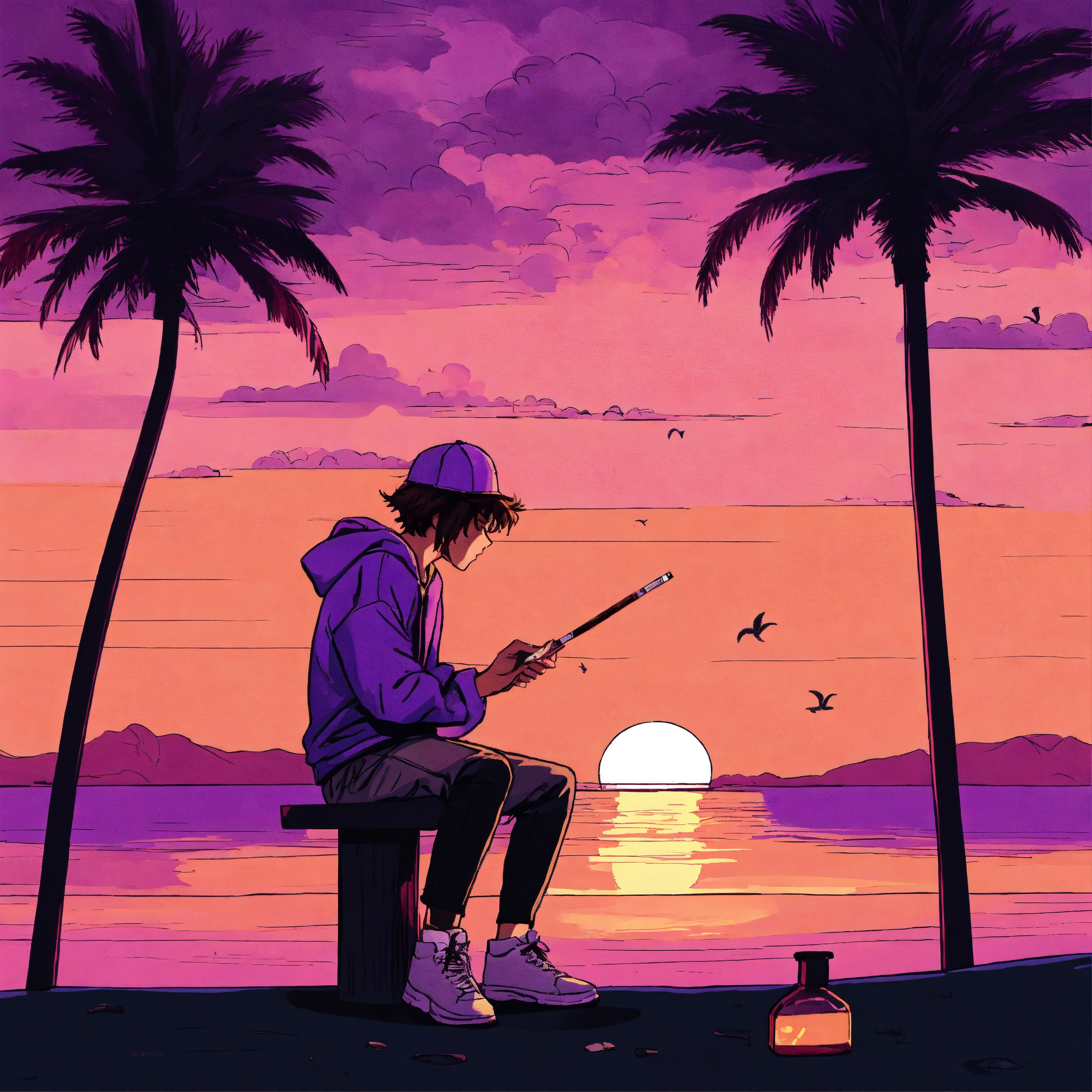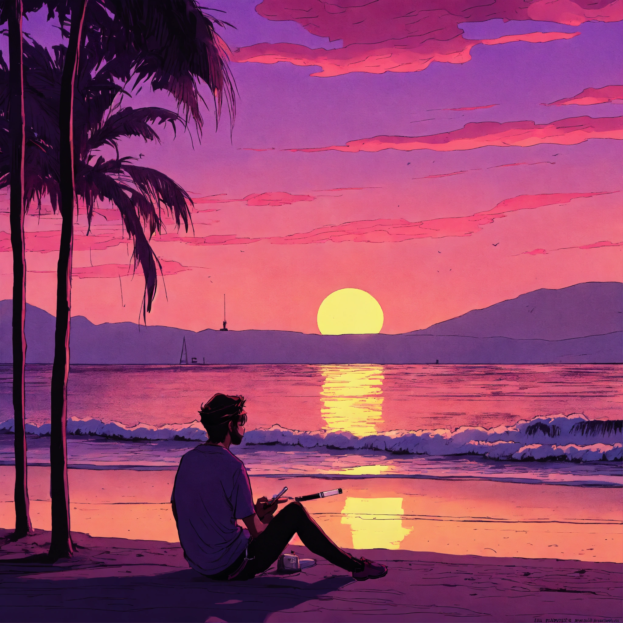 Playa con palmeras y atardecer de color violeta oscuro, ademas un joven al lado izquierdo, de espaldas con poleron negro y fumando un cigarrillo, tipo comic