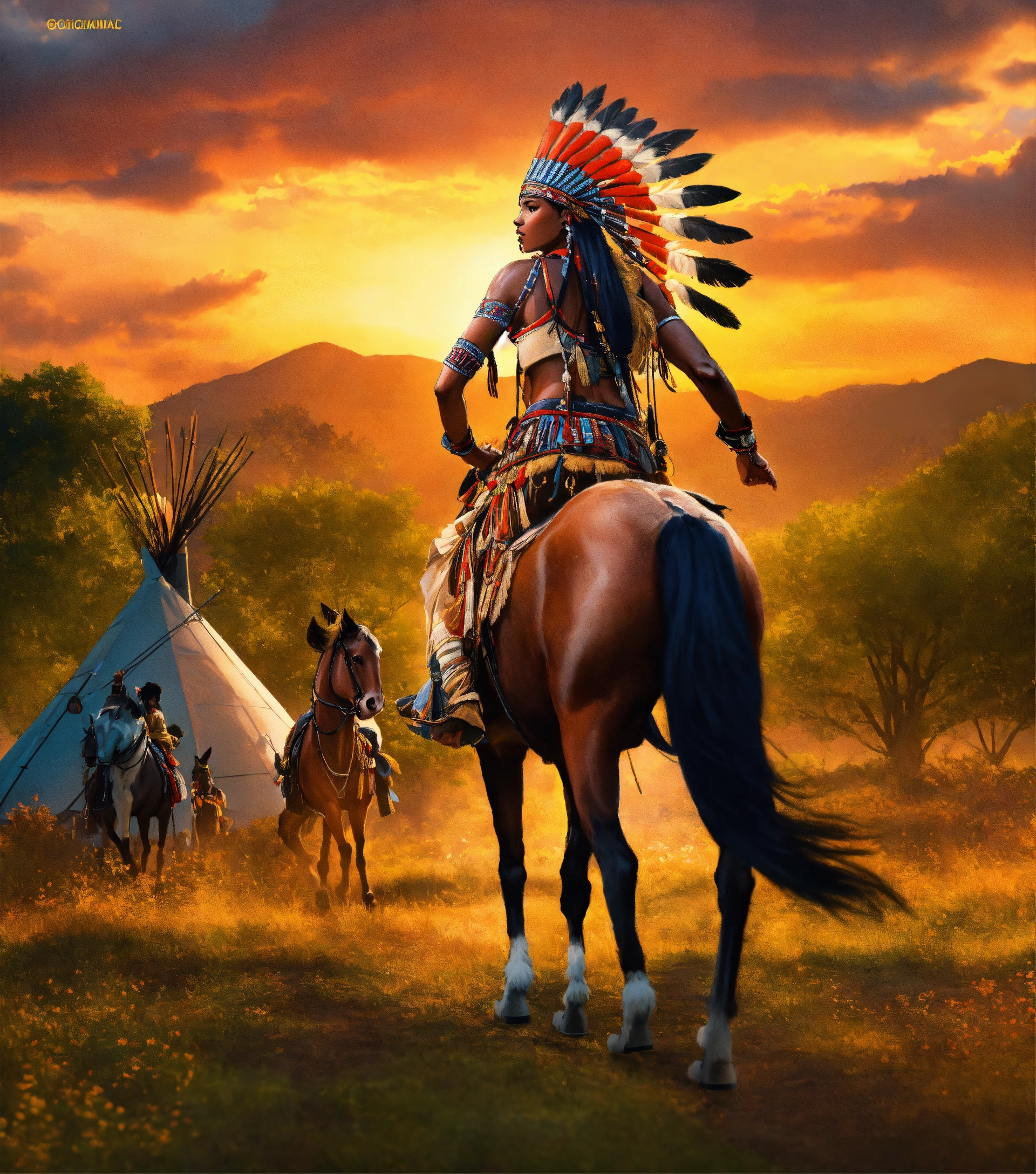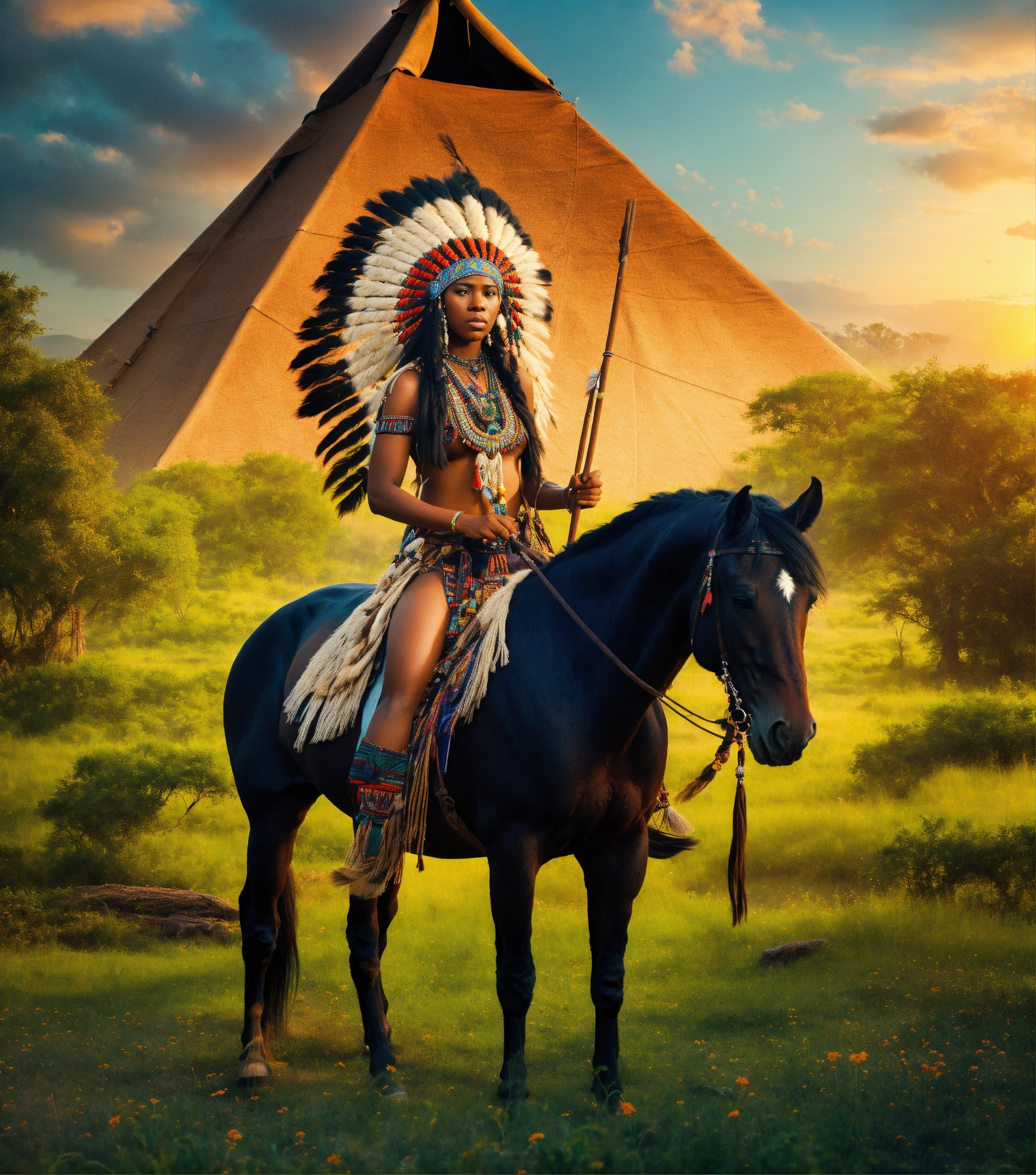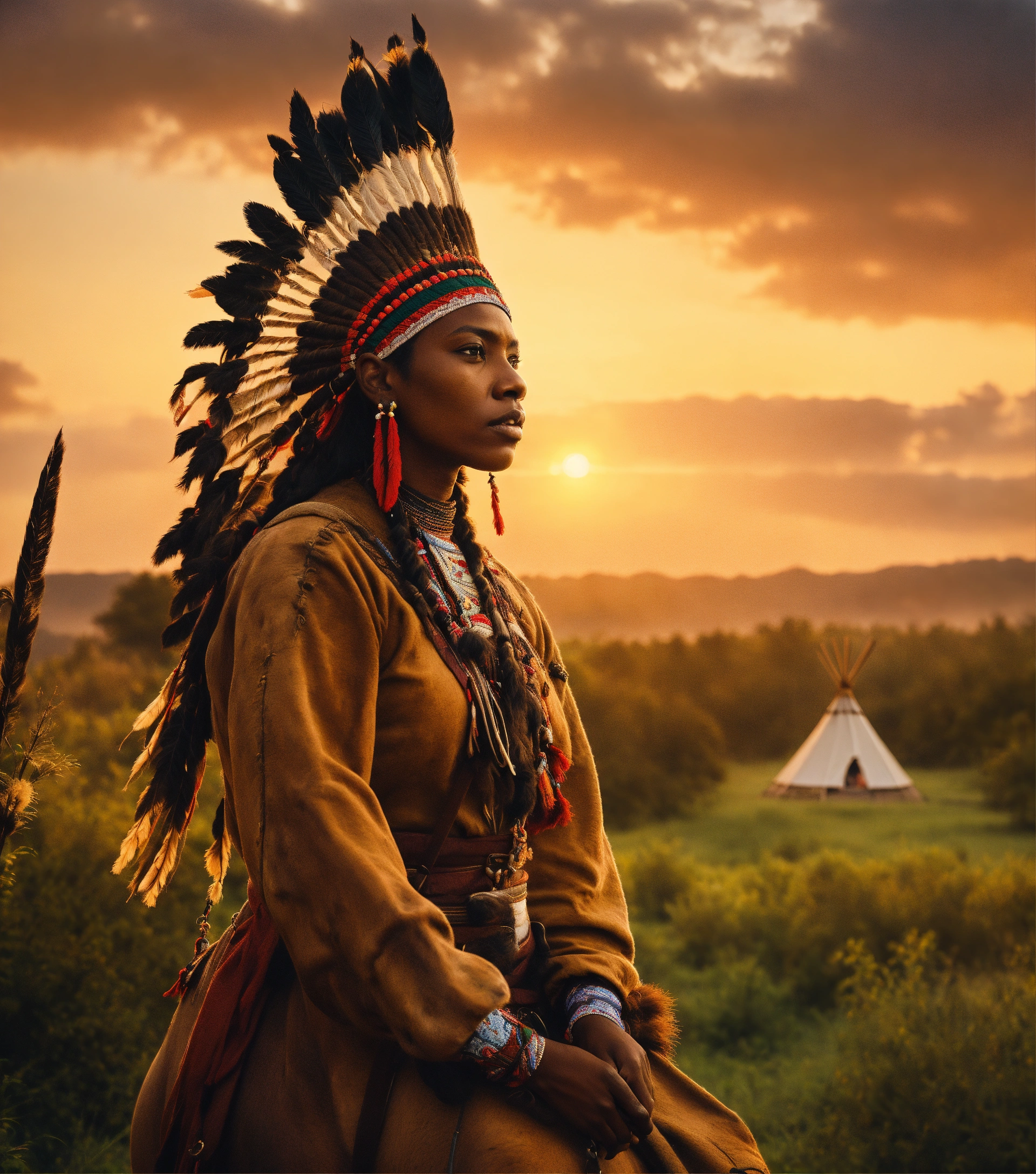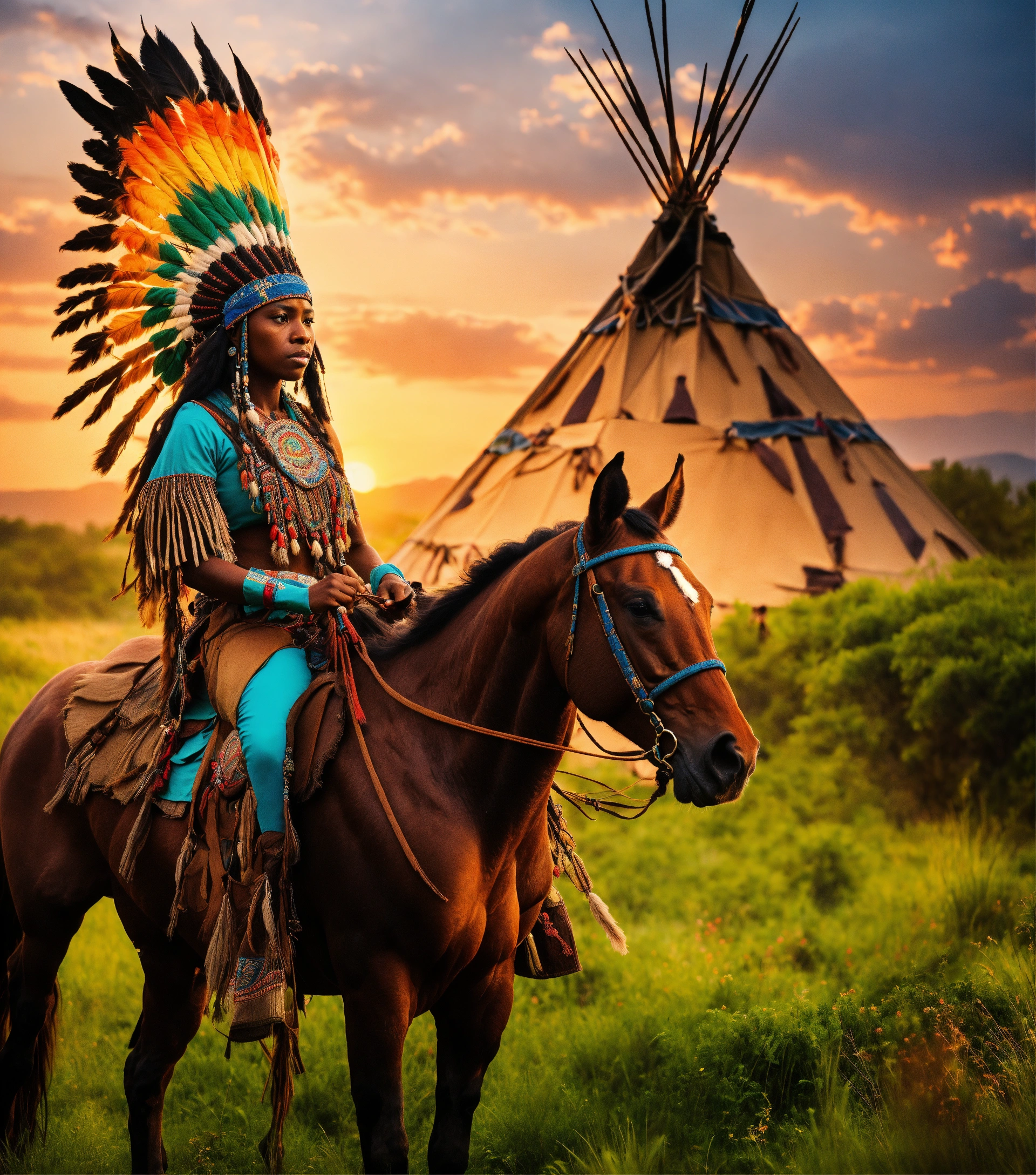 At vibrant cinematic sunset in full view is a 1600s close 8k photographic focus detailed portrait depiction of a beautiful dark-skinned black woman native american yamasee african-american riding on horseback wearing a full war bonnette, tall detailed design indian teepee on the lush green landscape, national geographic style