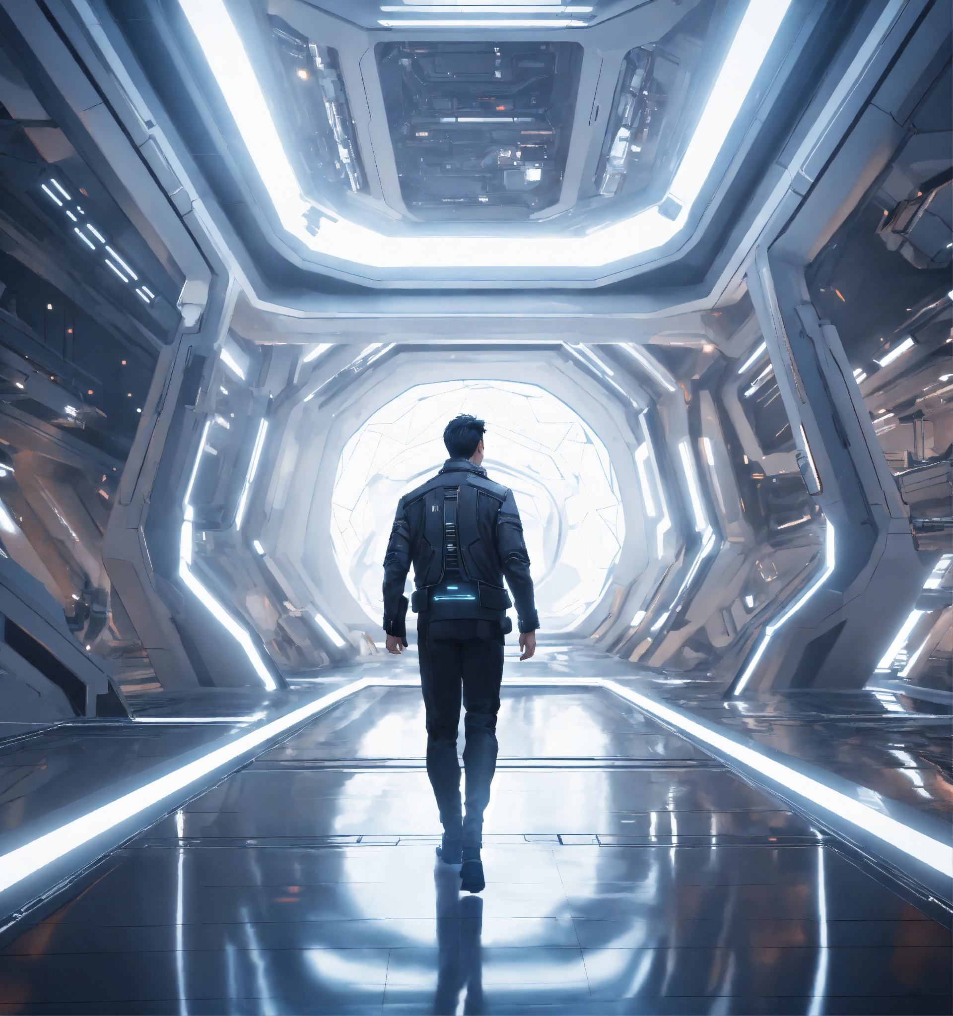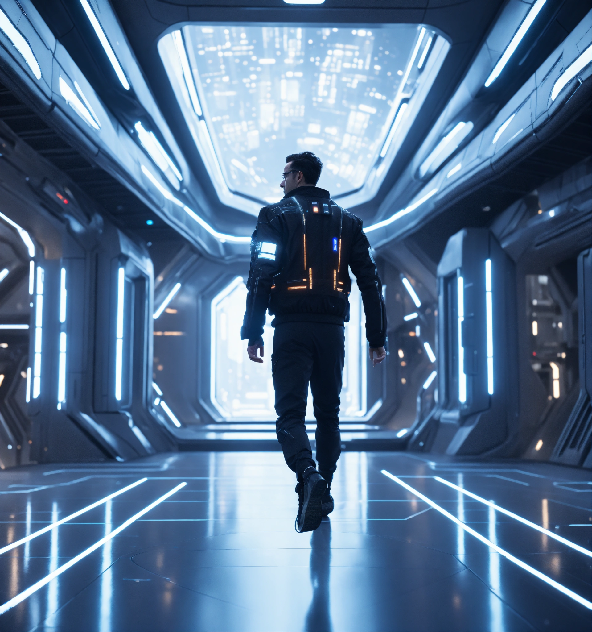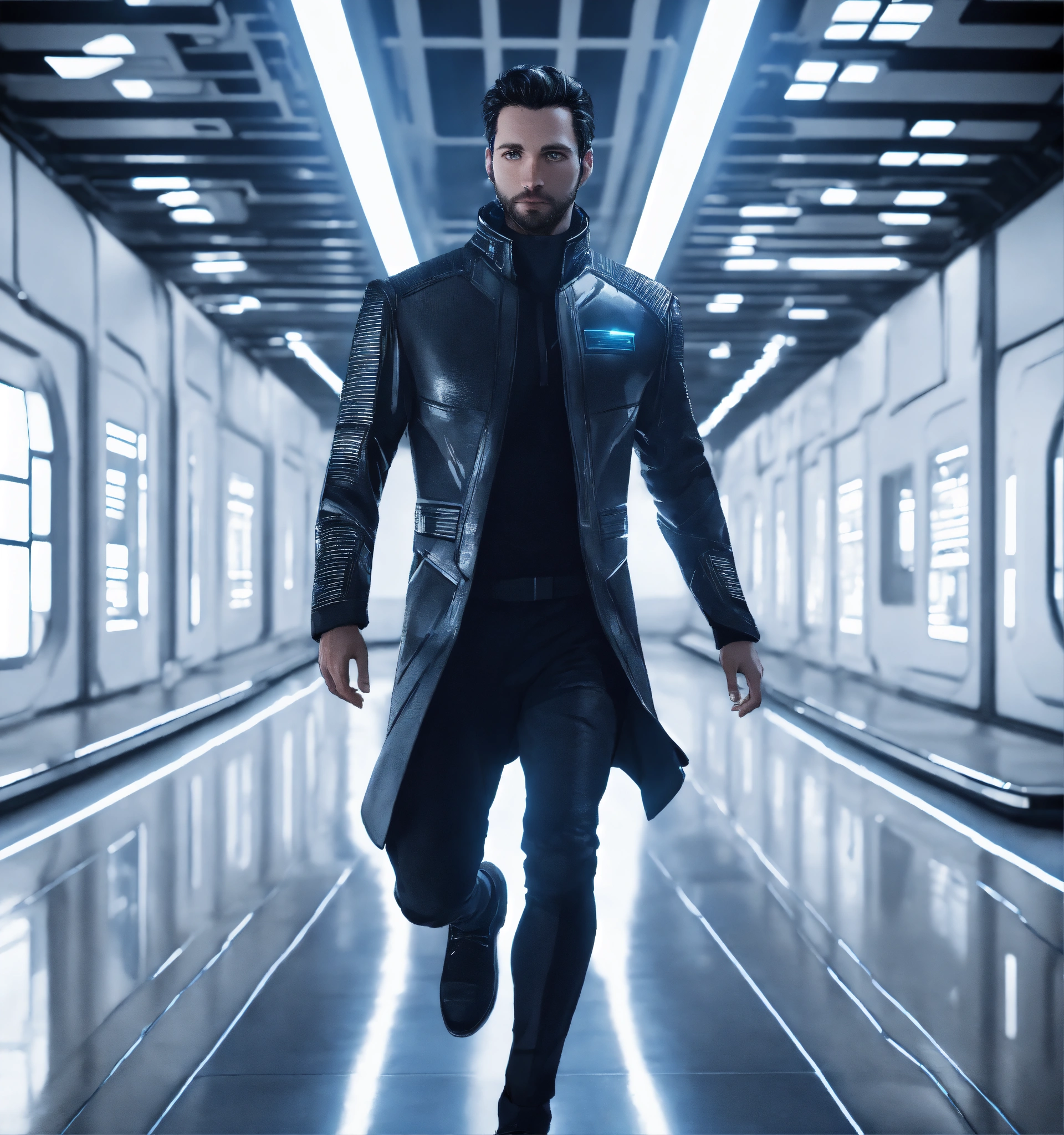 35 year old white male doctor with black hair wearing futuristic spy jacket runs through a beautiful clean white space port cosmic atrium in deep space, cosmic, realistic, futuristic, sci-fi, 8k, unreal engine, pixar, zaha hadid