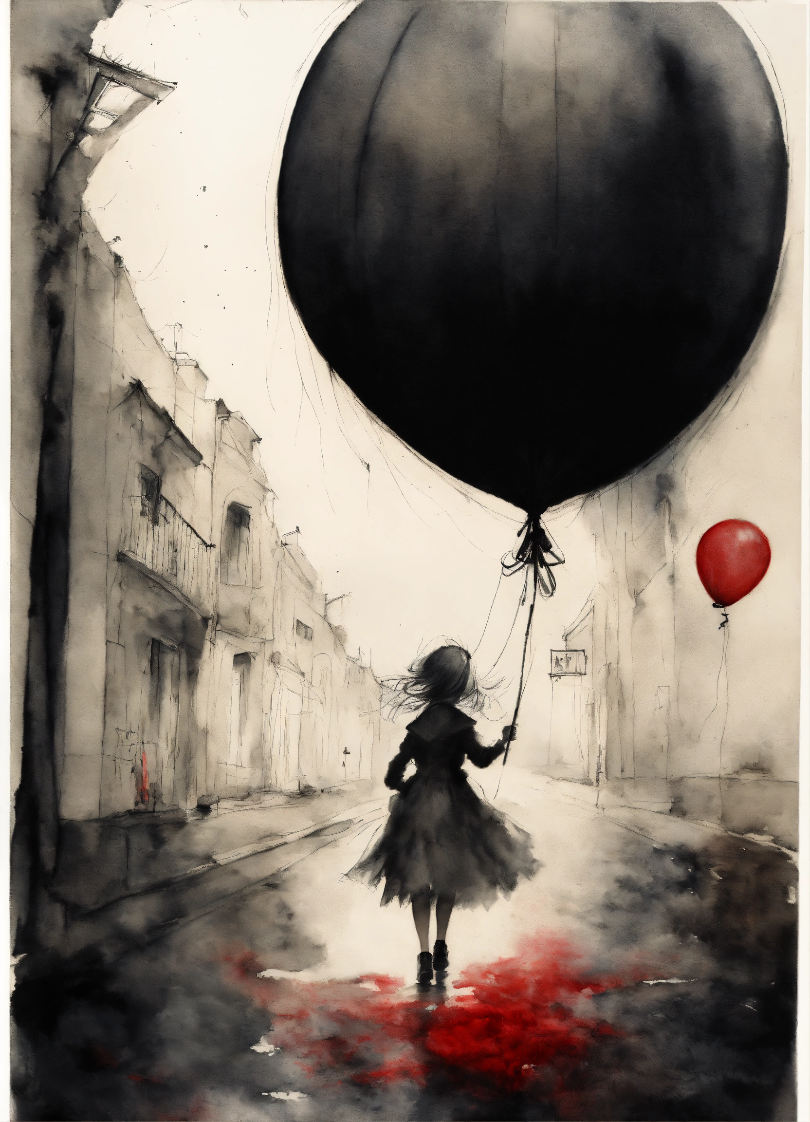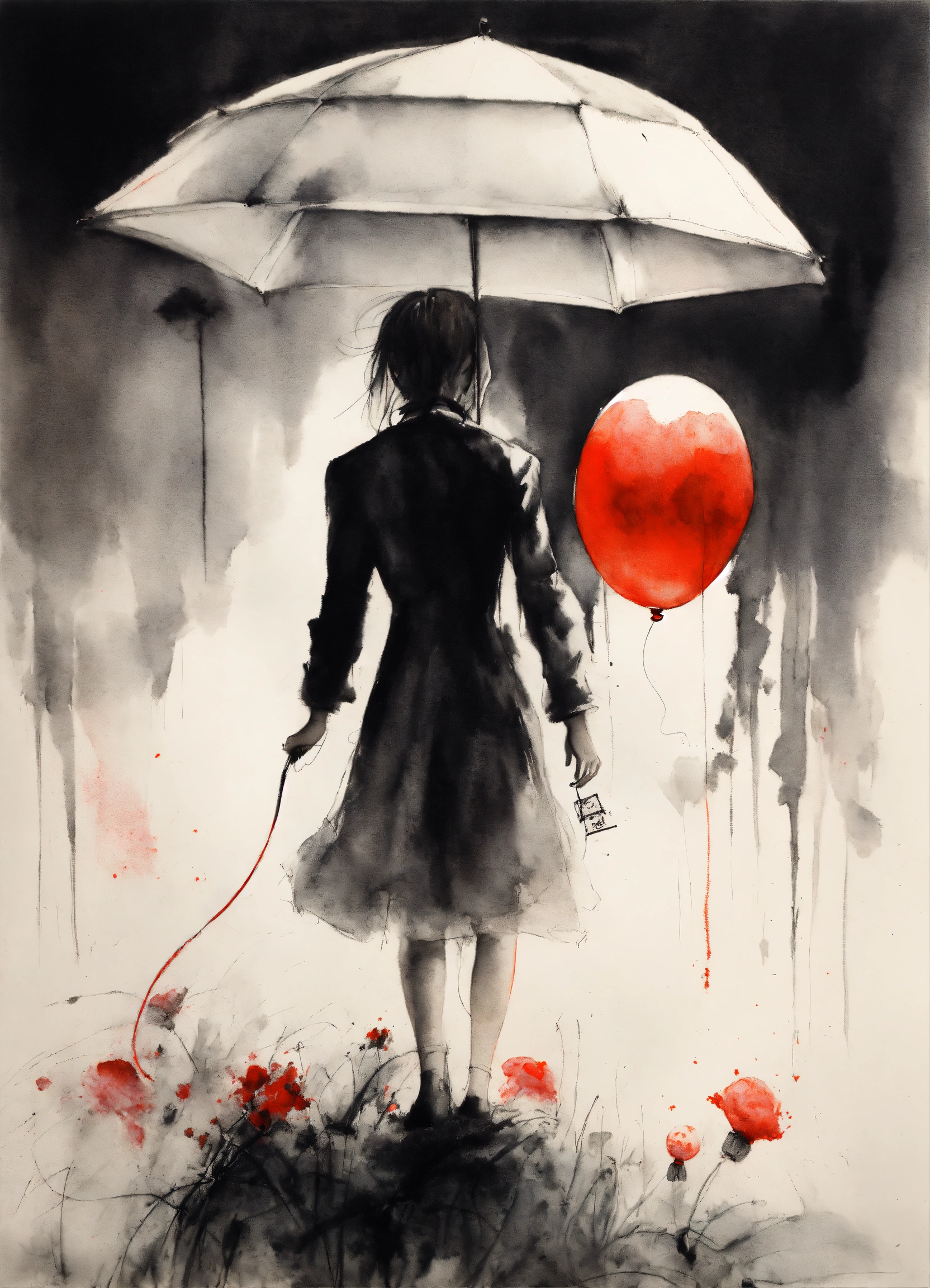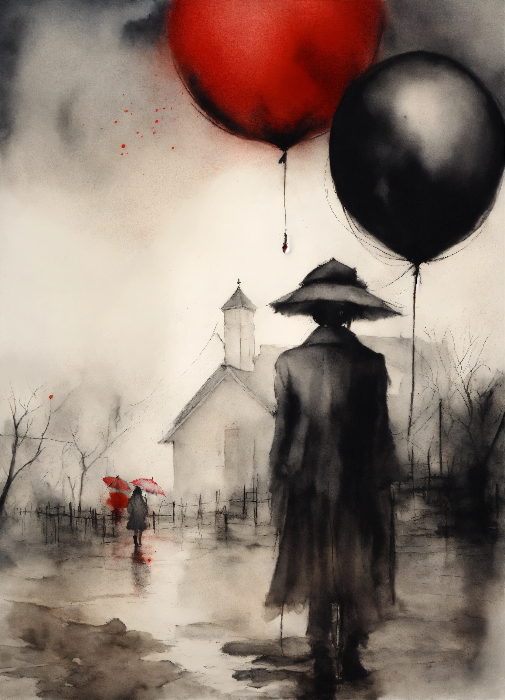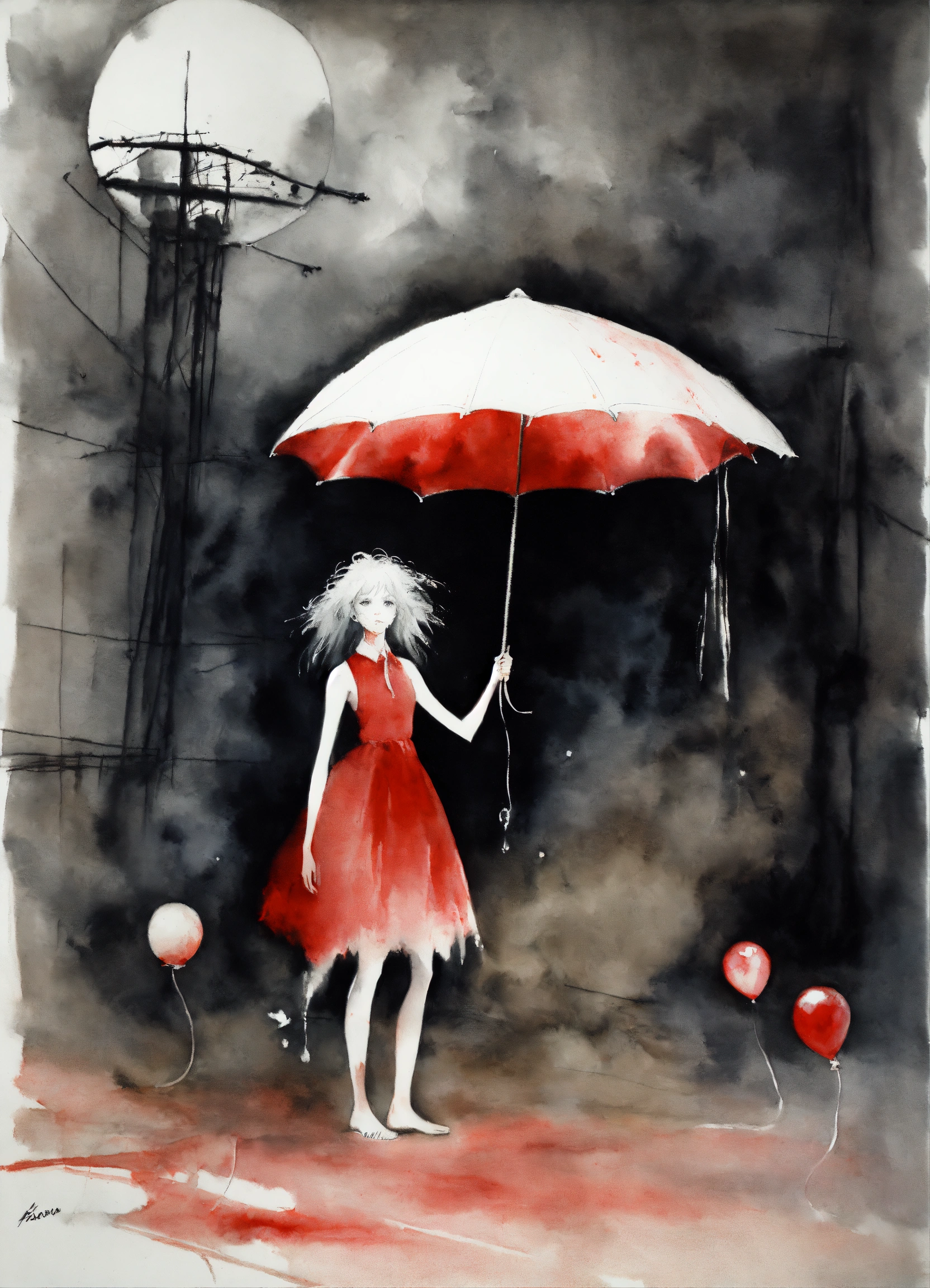 Stephen gammell style, dessin, aquarelle, aquarelles, noir et blanc, de marais, de sombres créatures, dégoulinant, infecté, un parasol, un retardateur et un ballon rouge