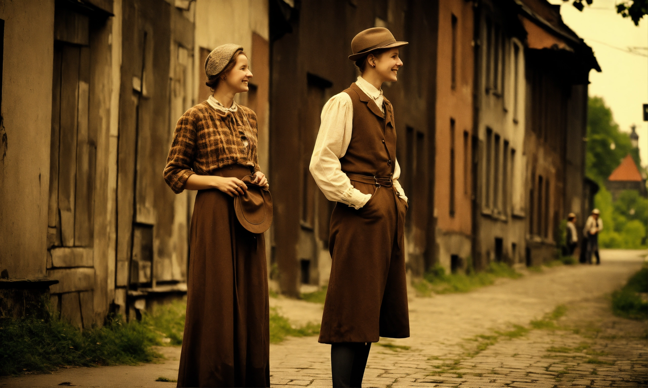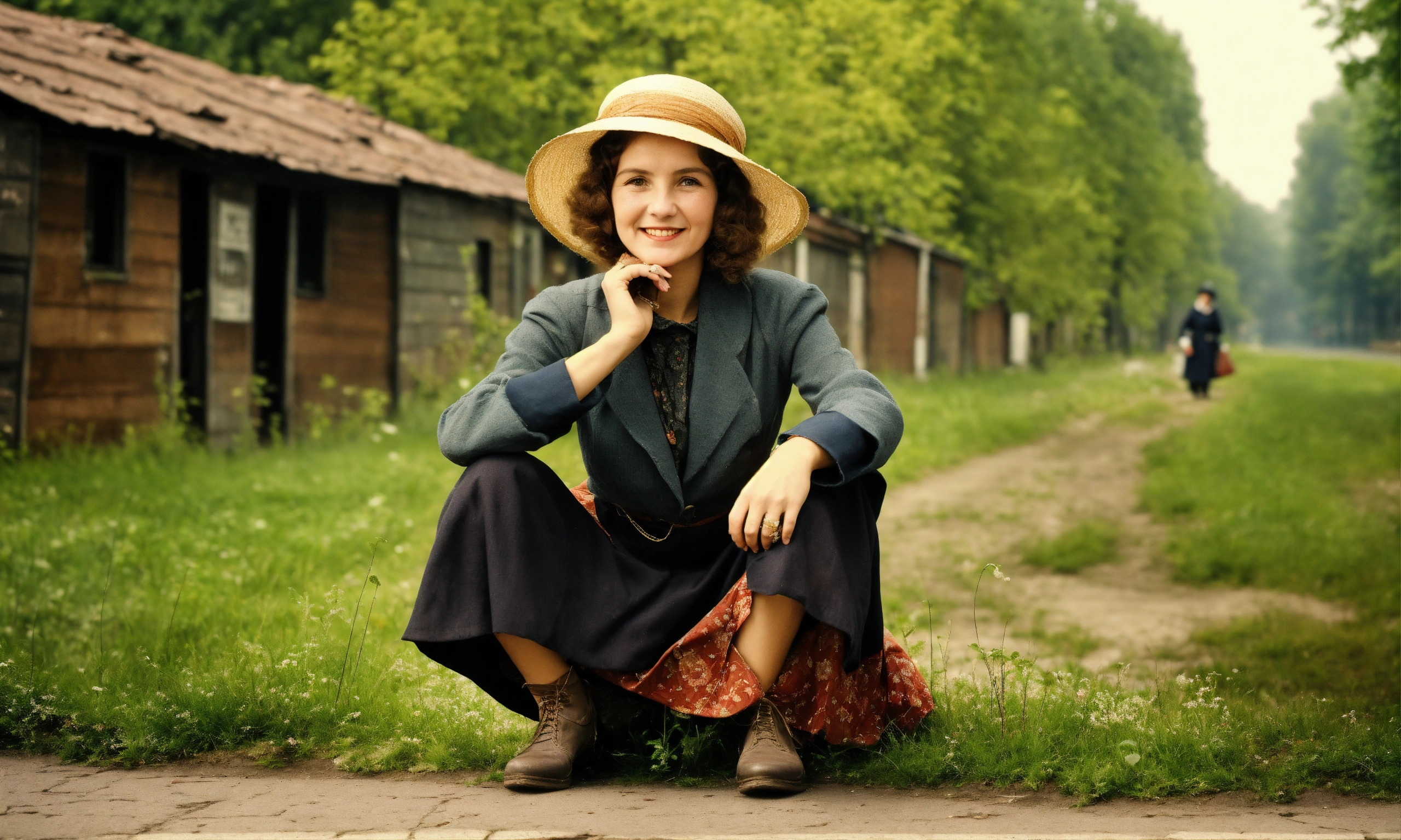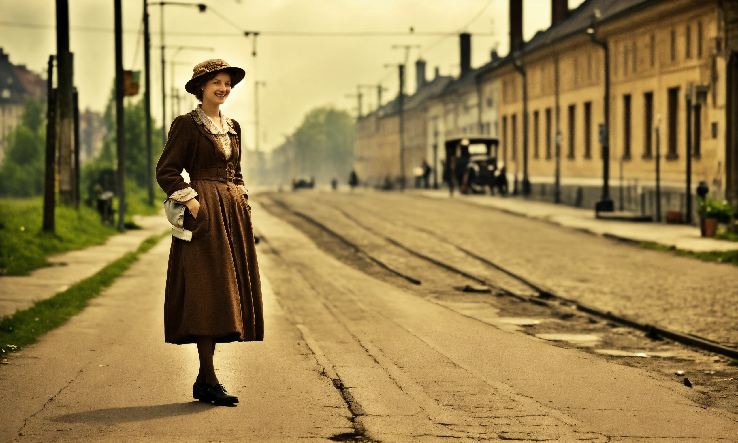 Сute poland think poor woman age 20, 1920-1930 on streen in warshaw. retro style photo. without people. focus camera on face woman . season summ, keep in mind that the street must be without people, retro style photo. without people. man full height. on street, smiling. man age 20 years old.clothing old style