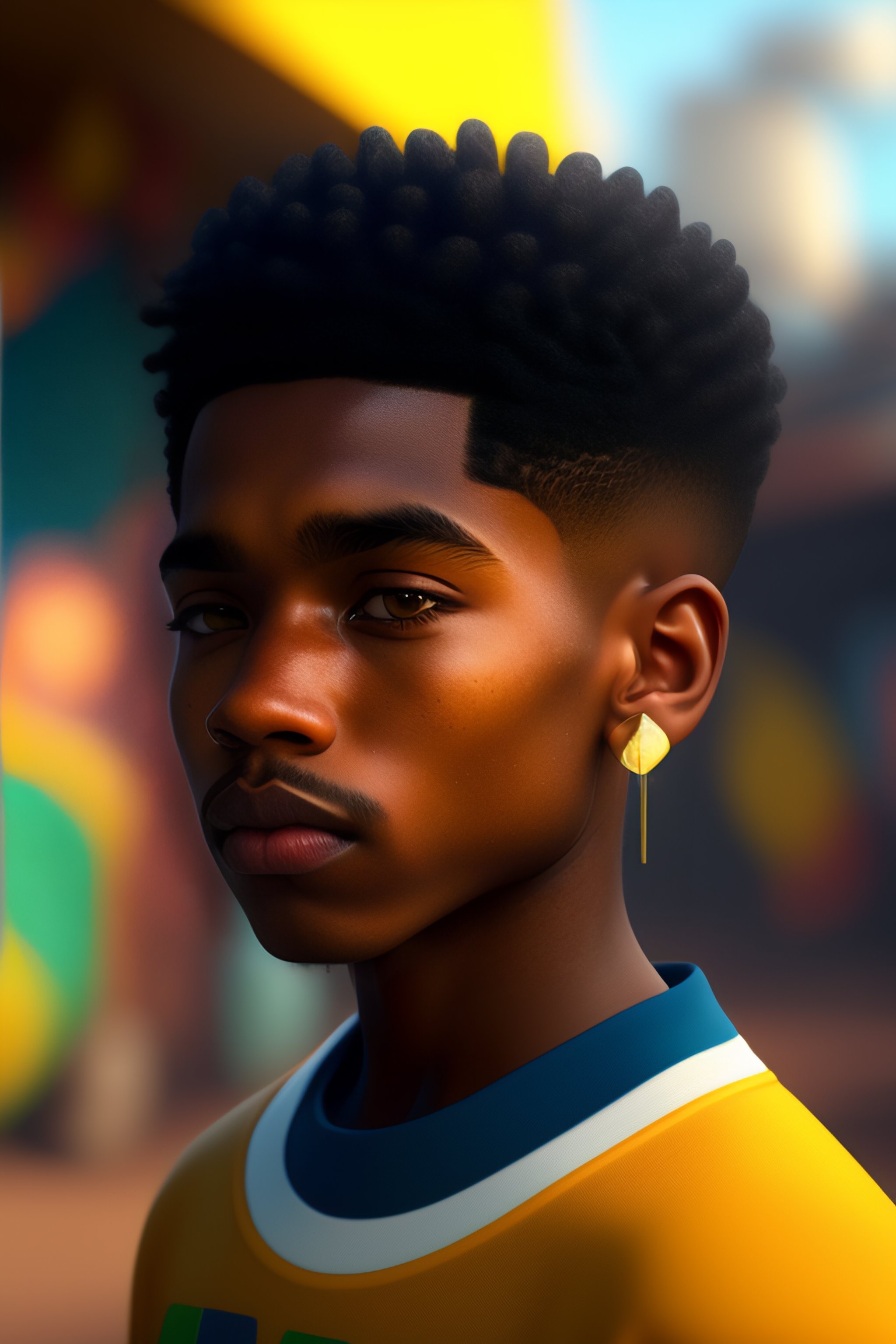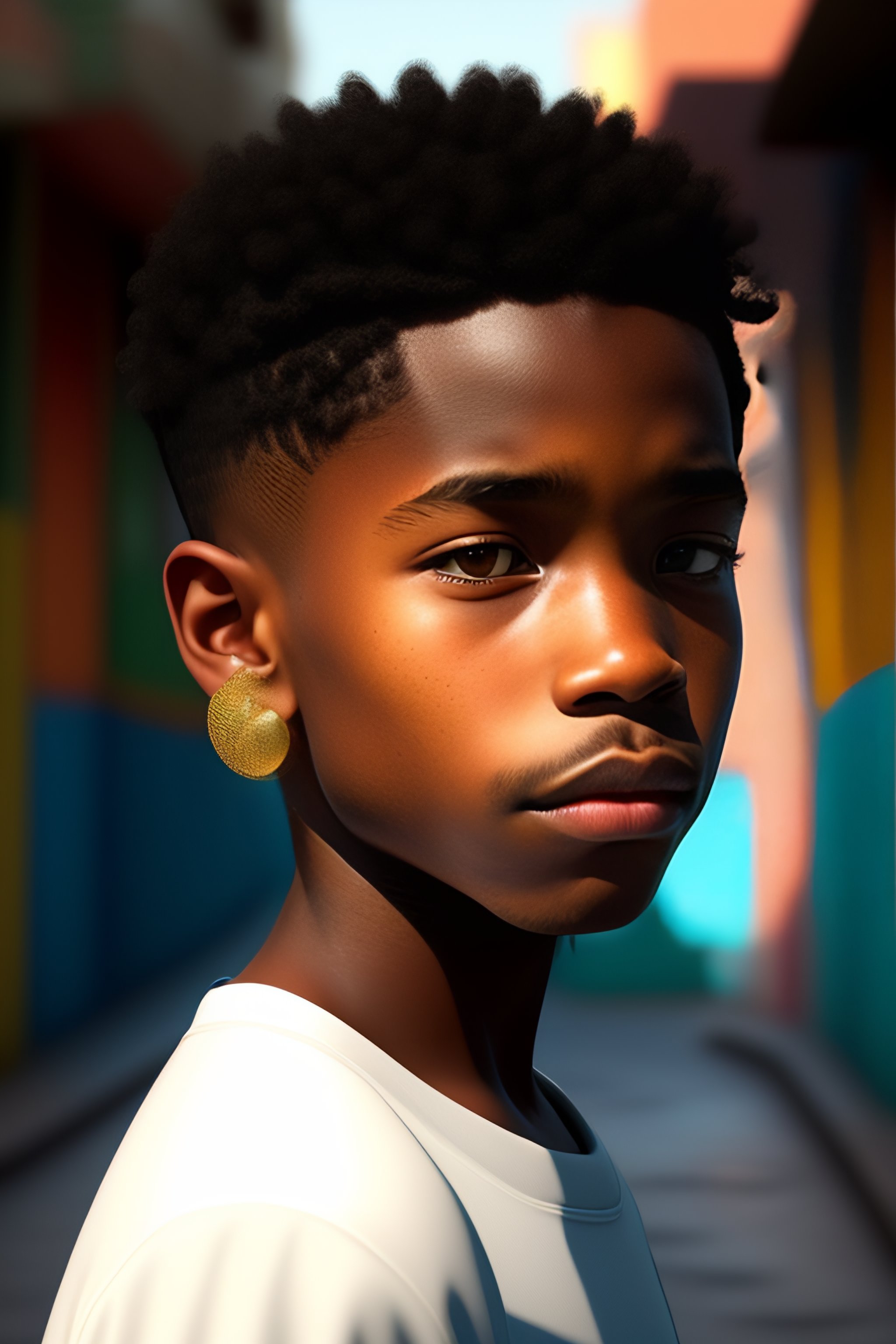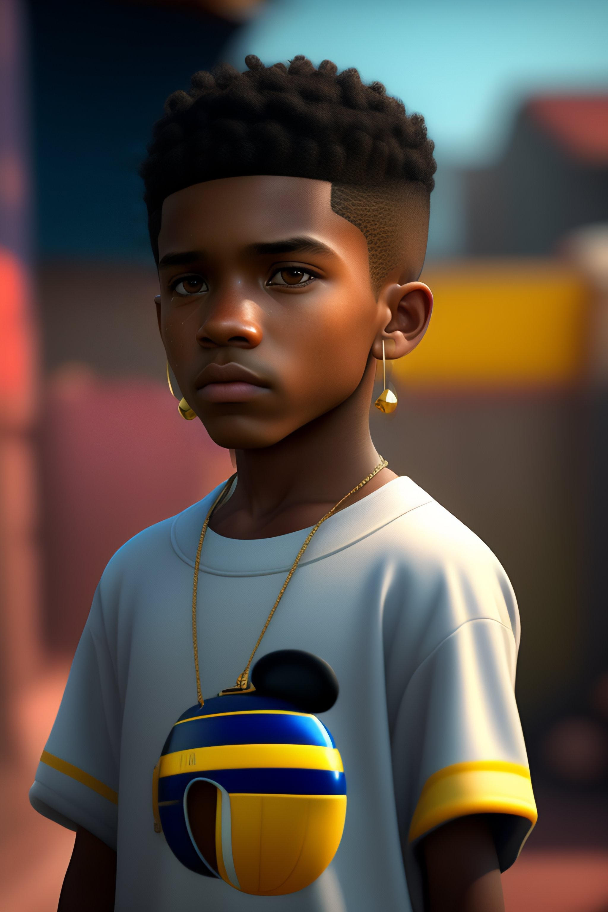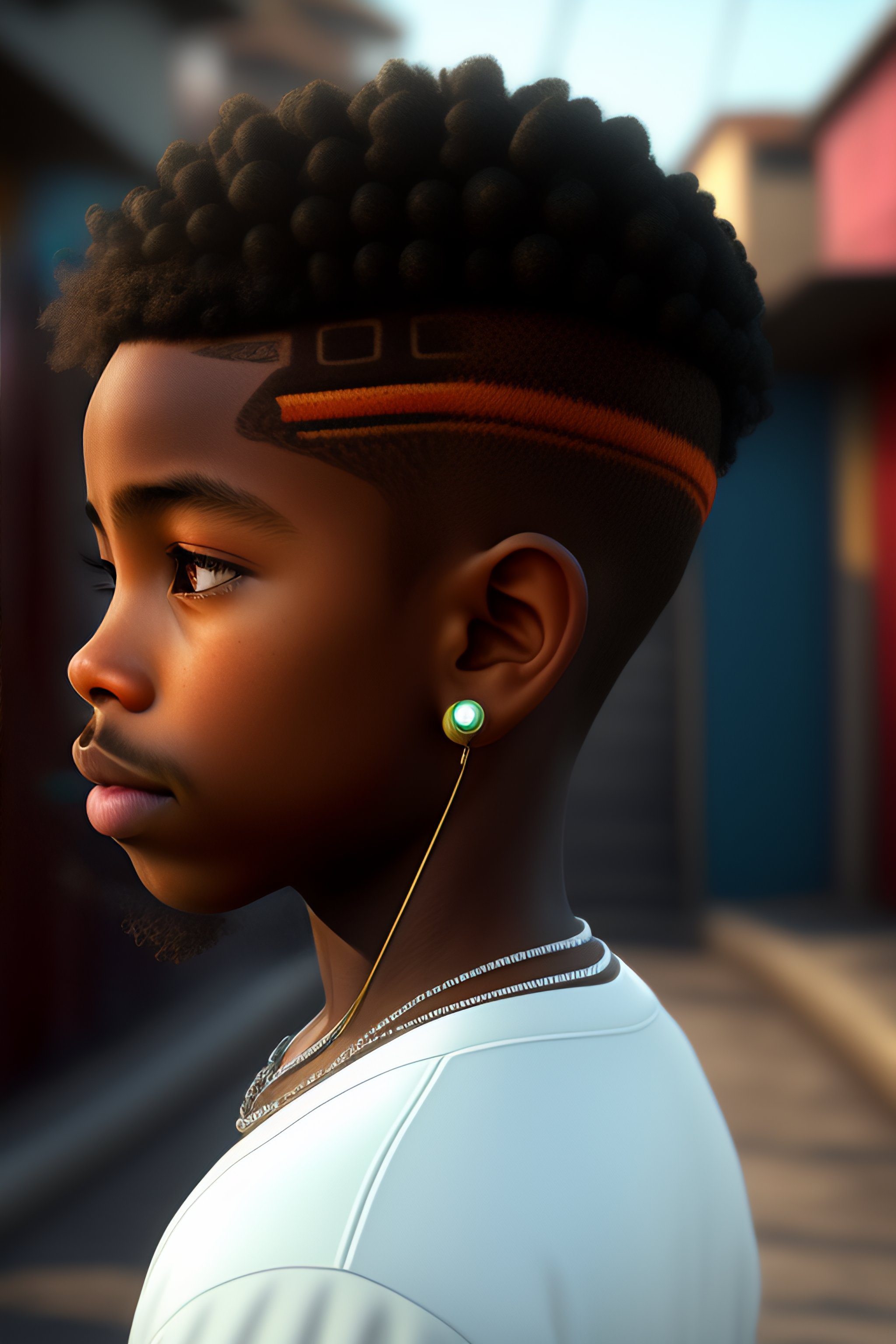 Nigga boy, earring, pixar style, 3d style, disney style, 8k, beautiful, in the favela of brazil, off-white, straight hair, men's messy bangs, (hair cut)