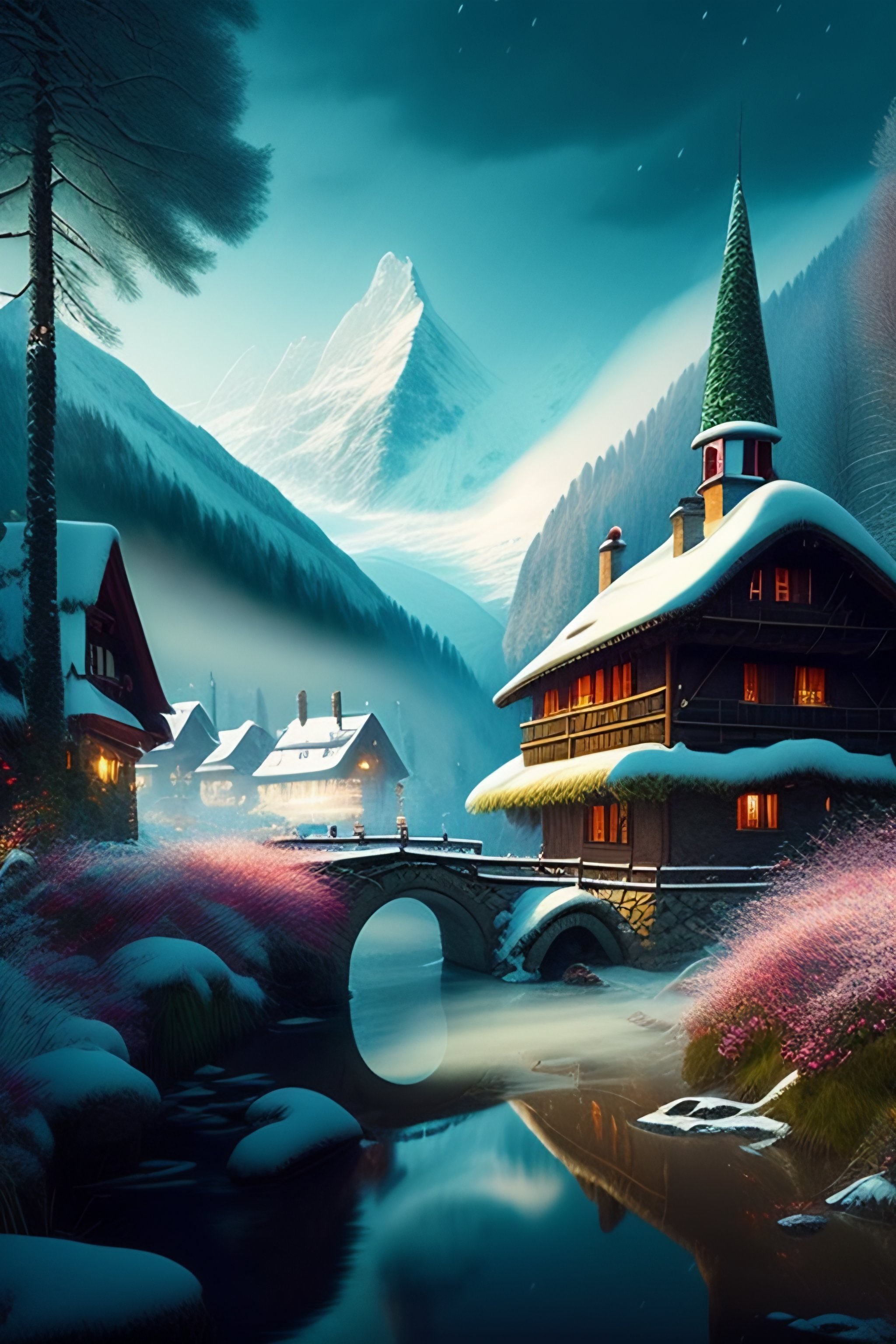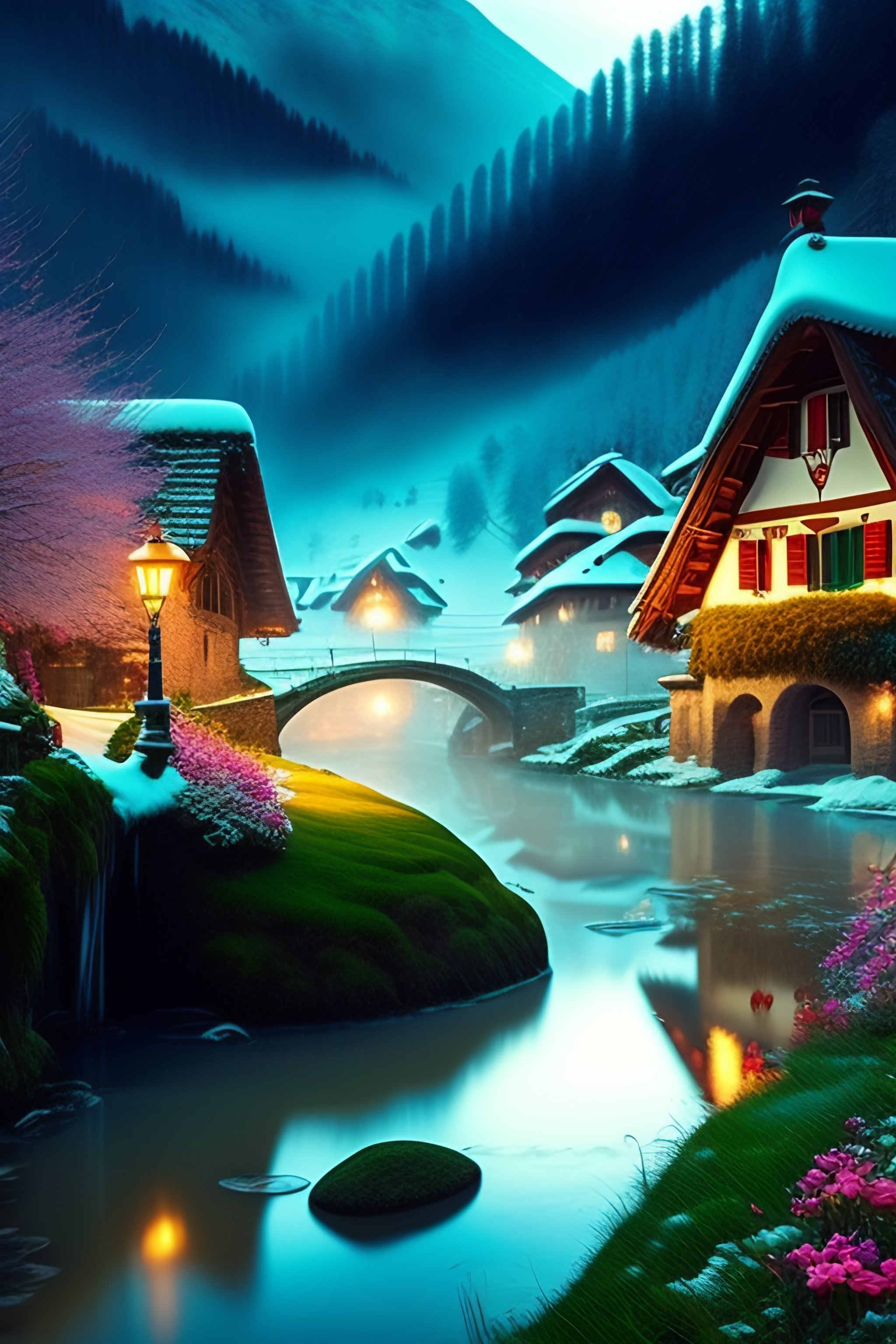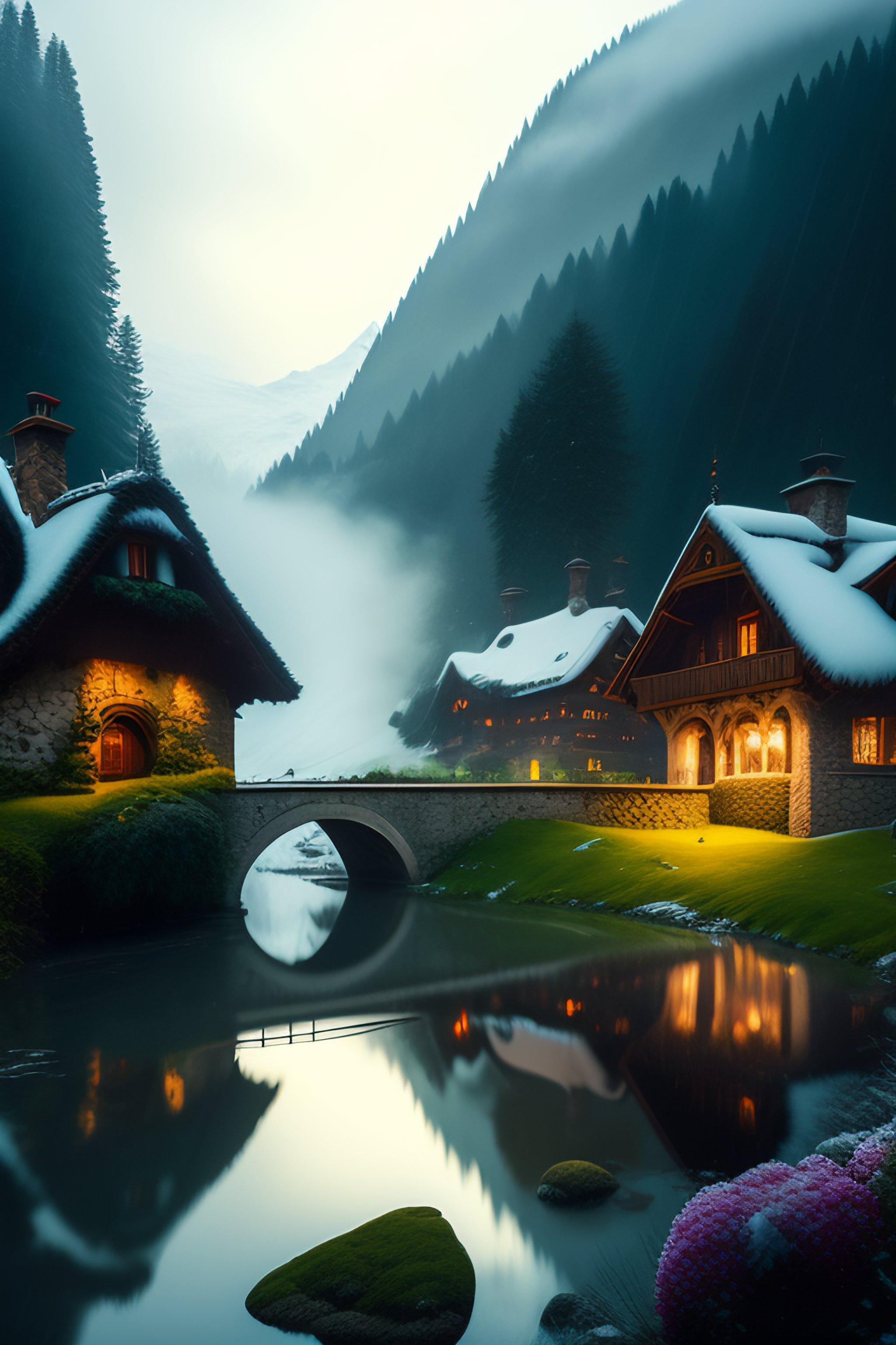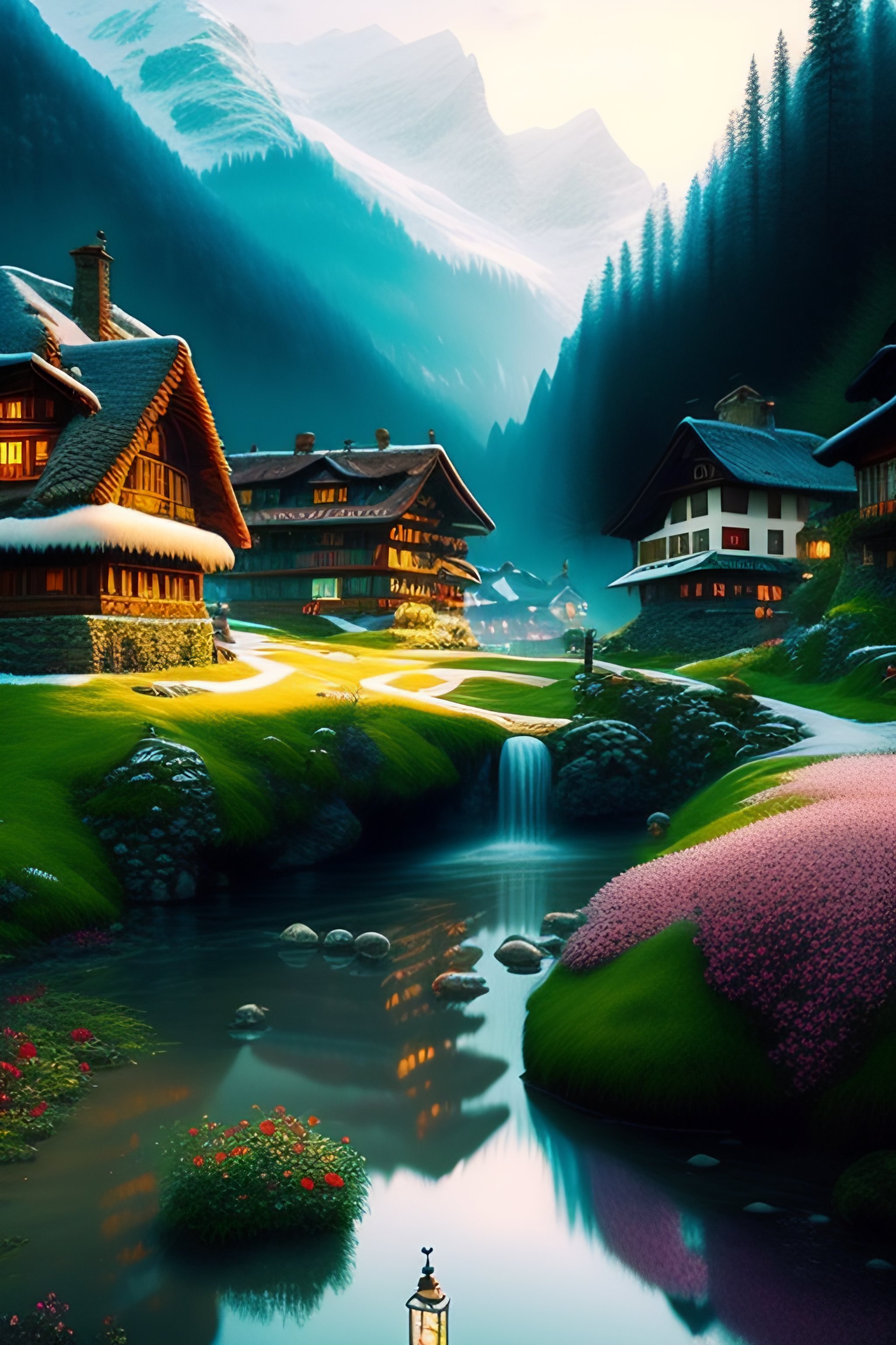 Spring in a village in the swiss alps, ornate, beautiful, atmosphere, vibe, mist, smoke, fire, chimney, rain, wet, pristine, puddles, melting, dripping, snow, creek, lush, ice, bridge, green, stained glass, forest, roses, flowers, by stanley artgerm lau, greg rutkowski, thomas kindkade, alphonse mucha