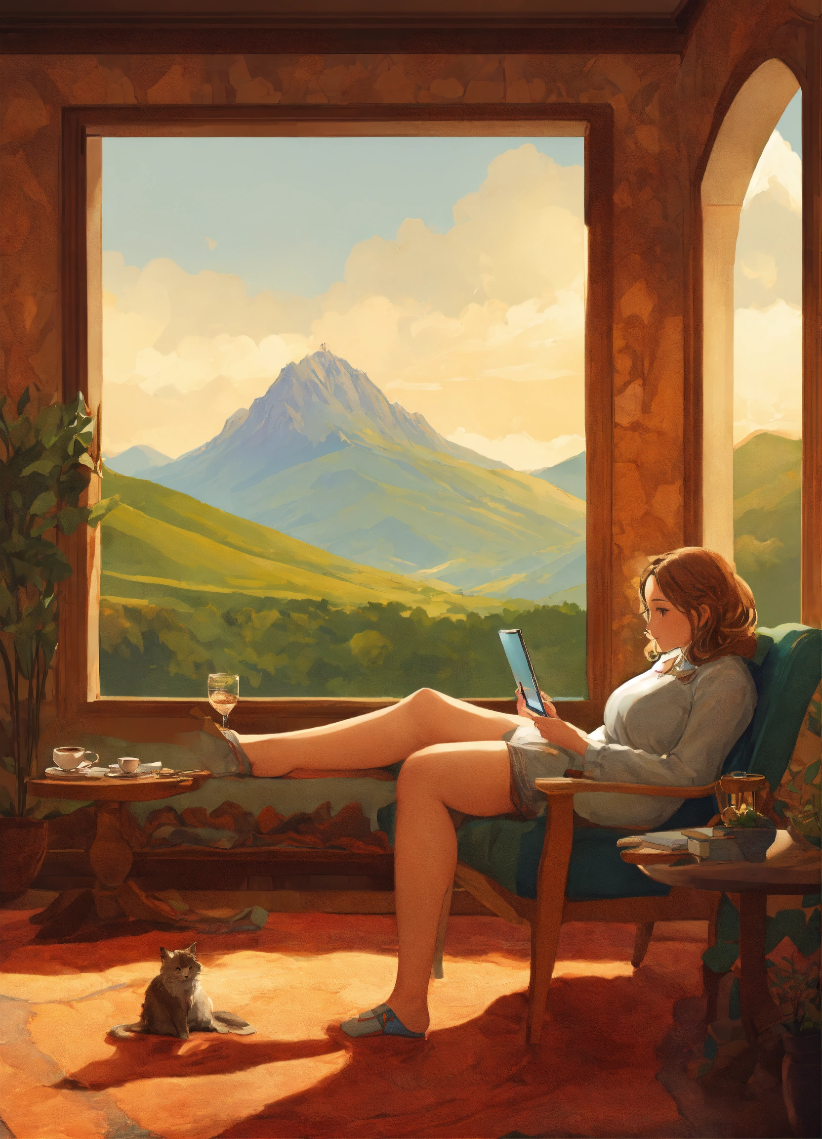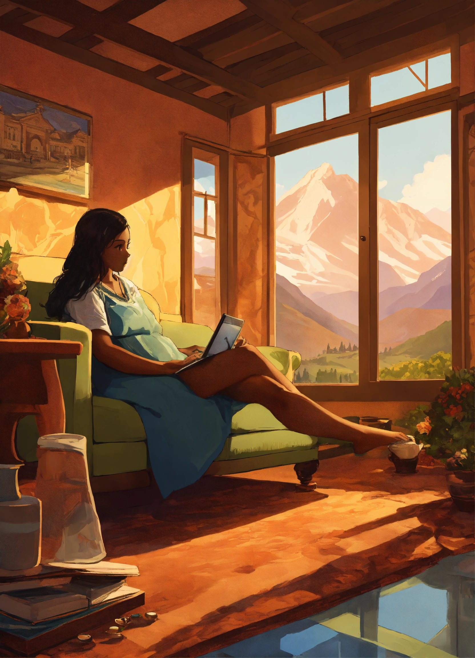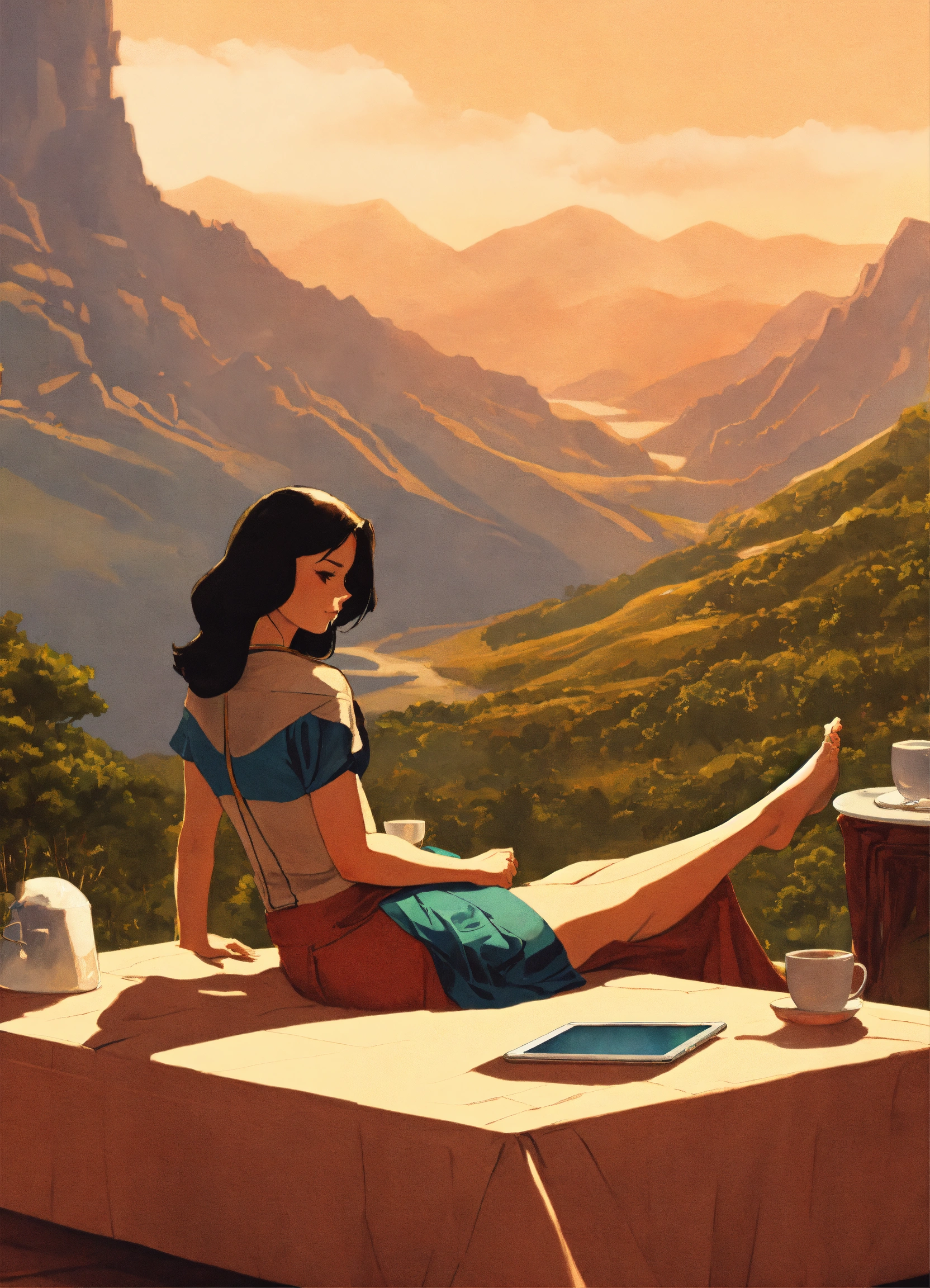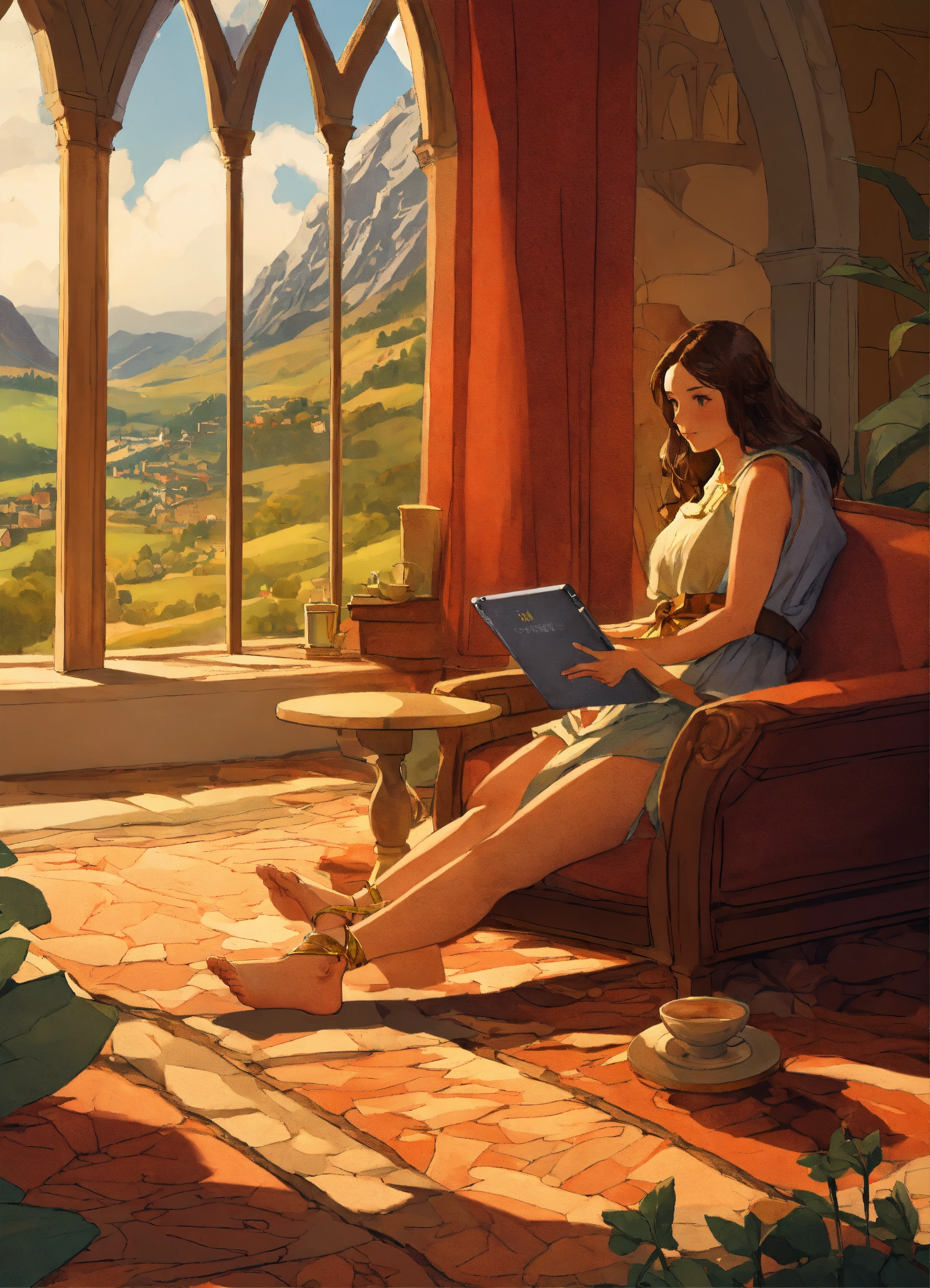 Digital illustration from inside a ground perspective onside a coffee table landscape with mountains, valleys, medieval cities, forests. above, a massive woman's crossed feet at ankle rest onside table edge touching it with the ankle, showing soles forward, casting a shadow below.in the farther distance, the colossal woman, to whom the foot belongs, is seen lounging on a couch, appearing distracted looking at her tablet.the entire scene suggests the tiny world resides atop her table.