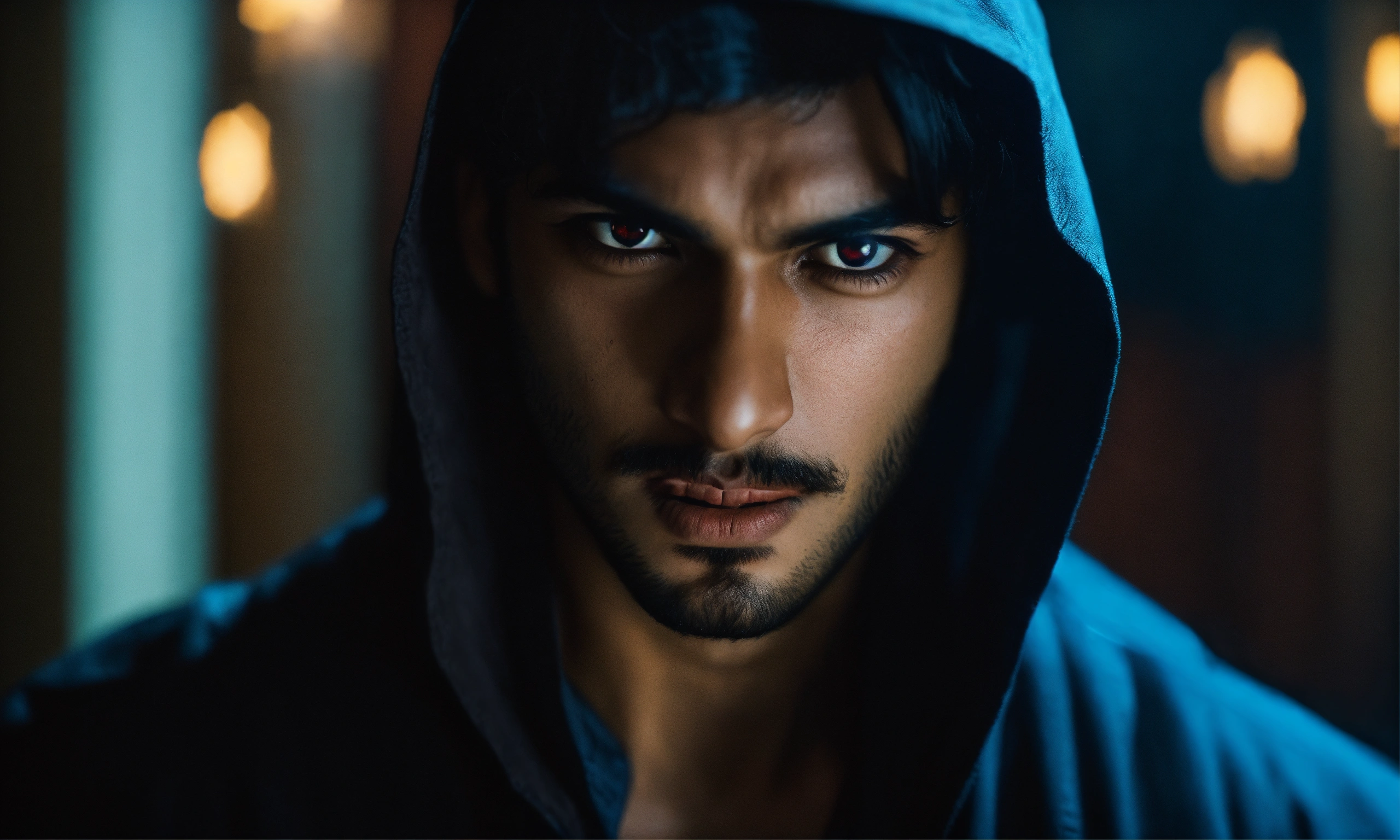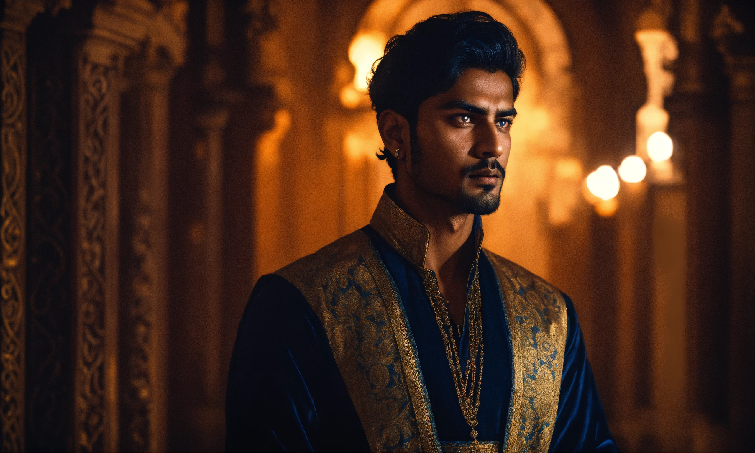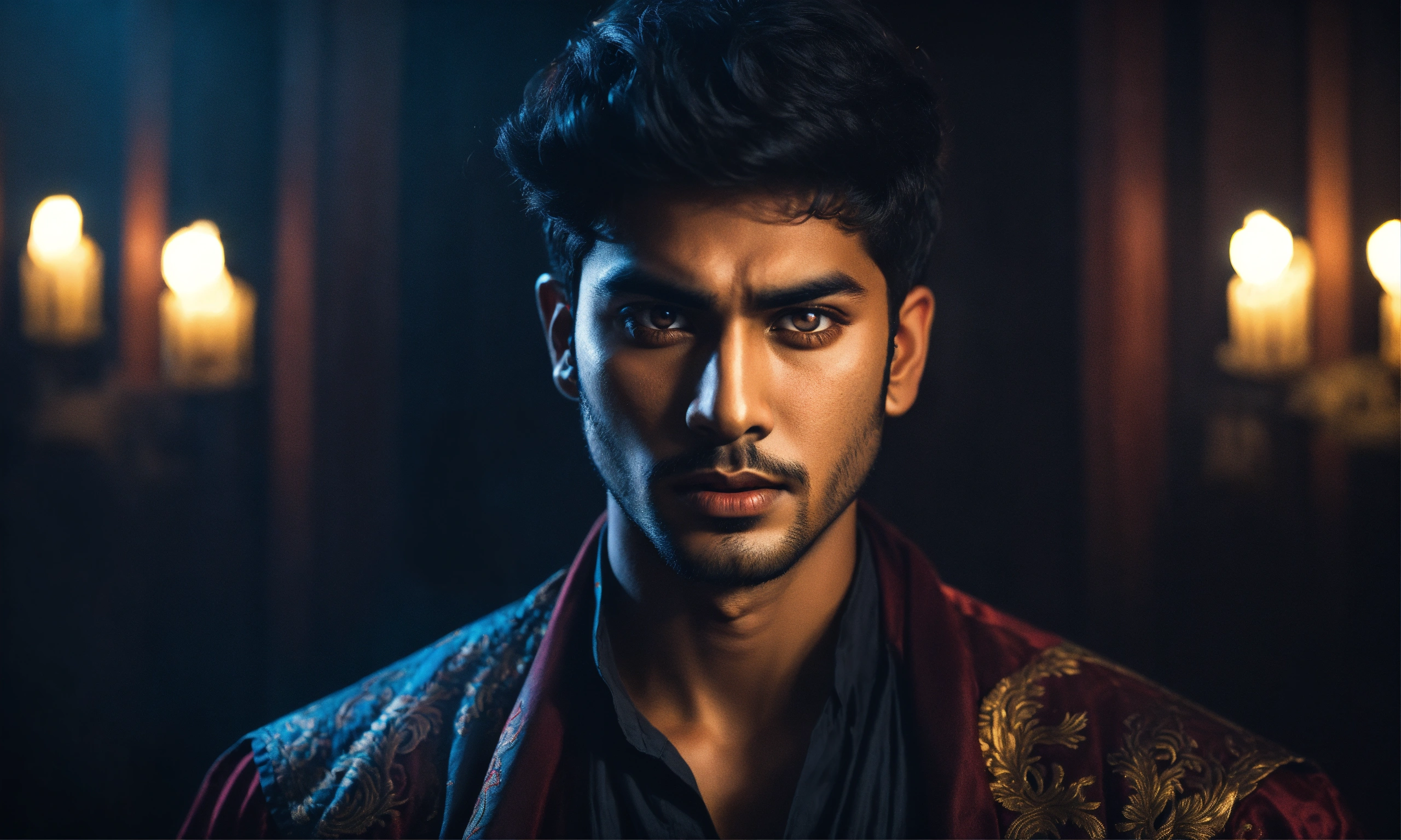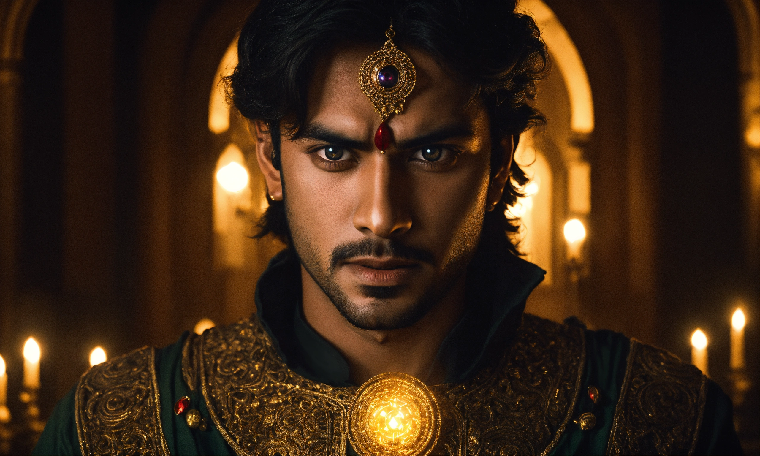 Dramatic headshot of a young handsome, evil south asian sorcerer with hypnotic glowing eyes, ominous palace, mysterious, dimly lit.