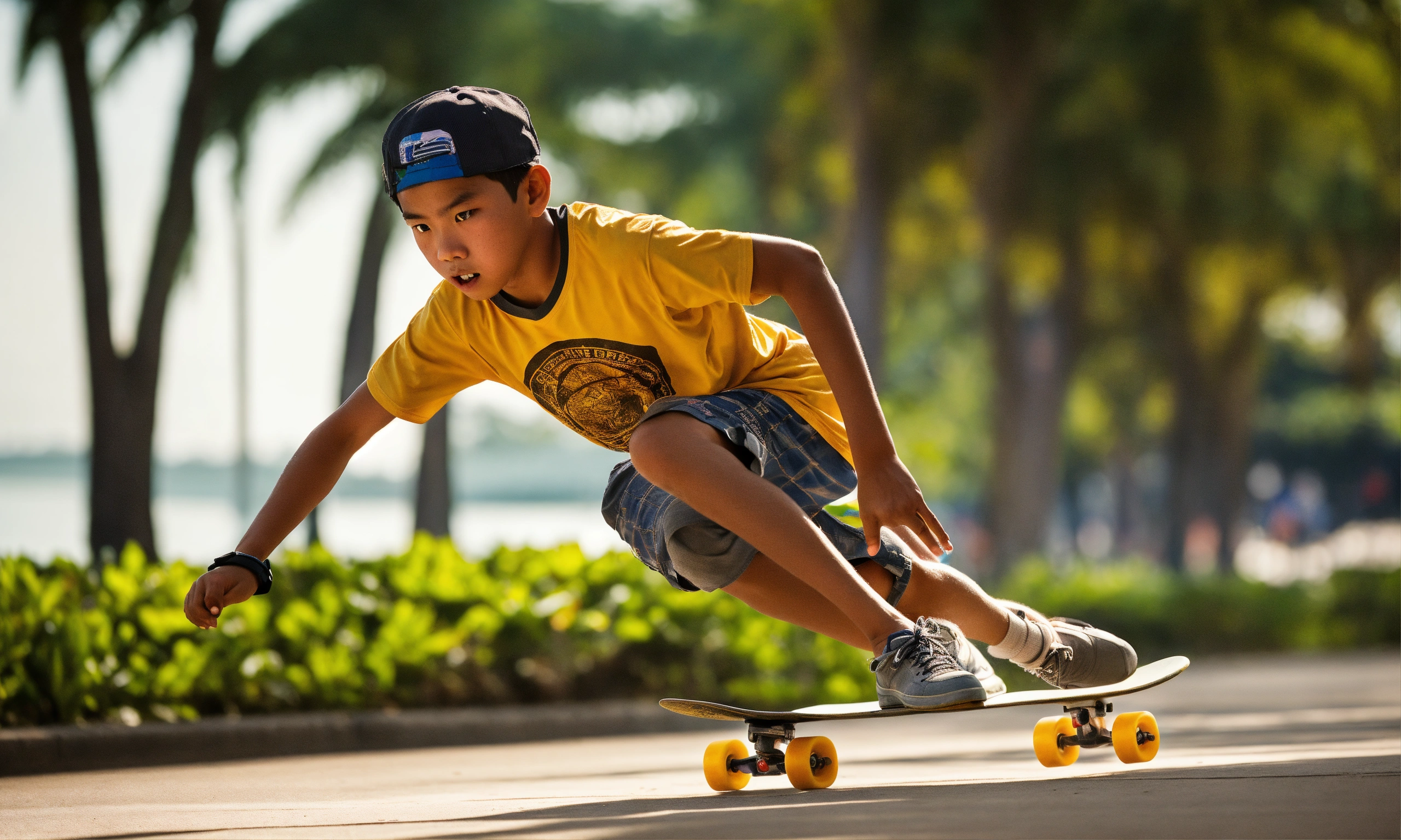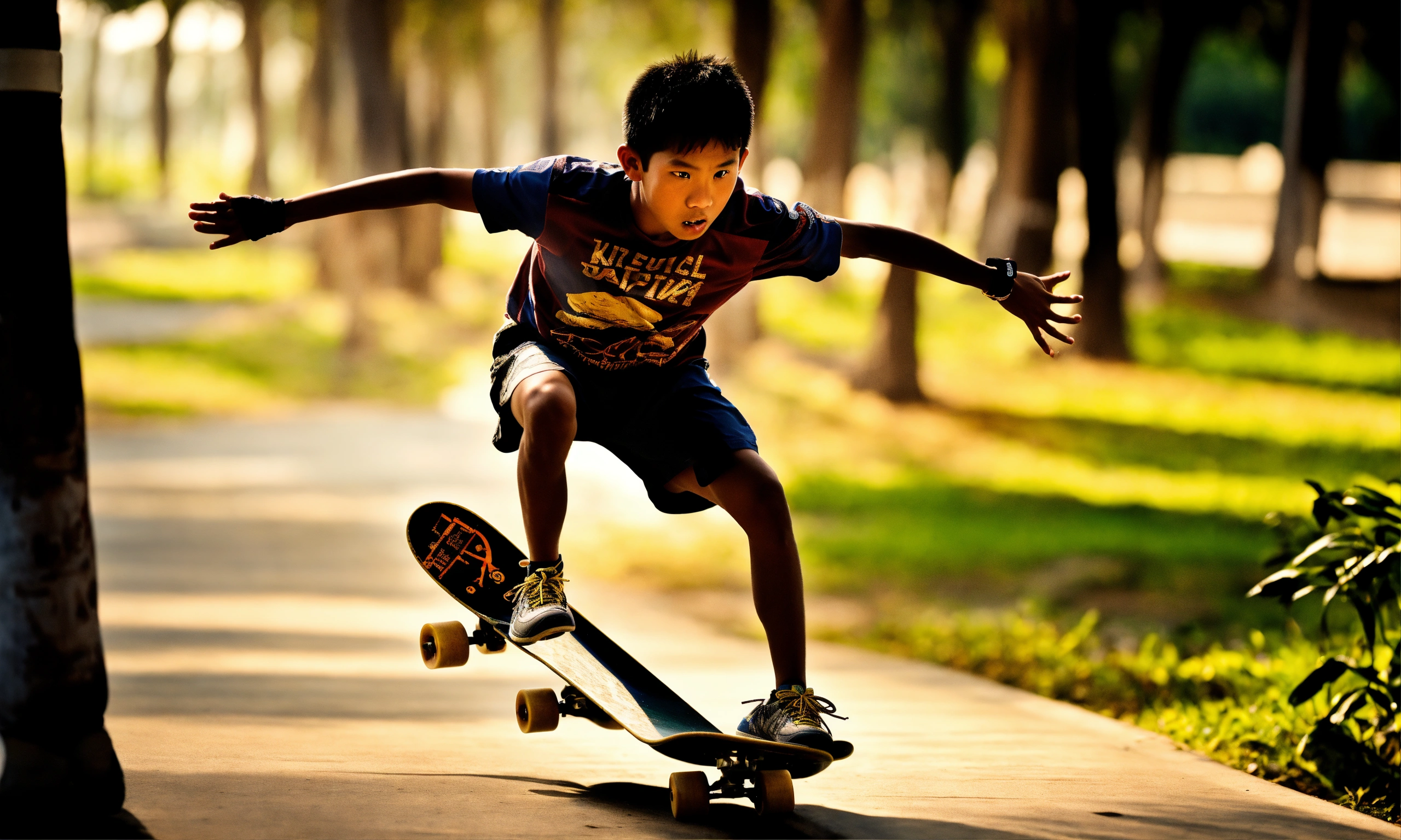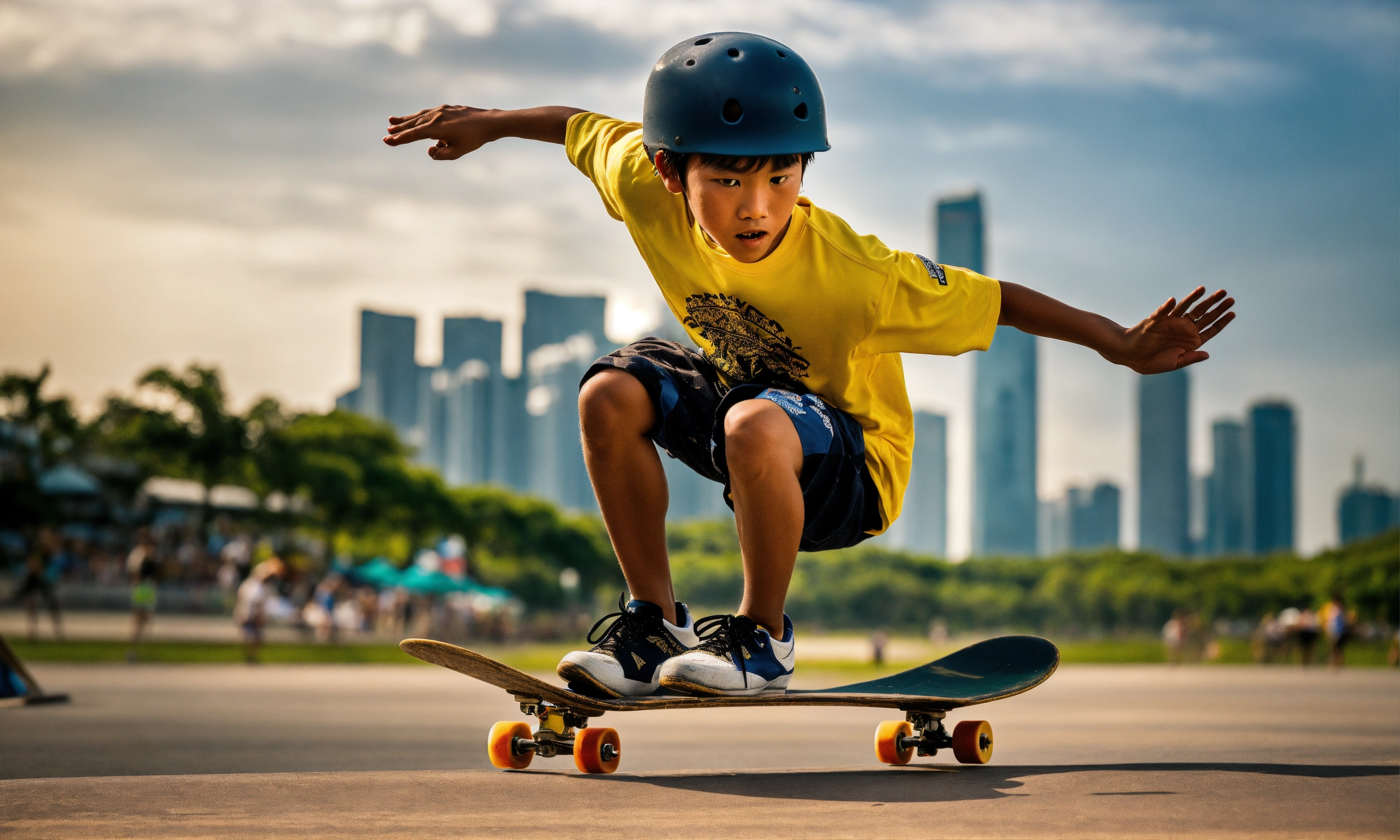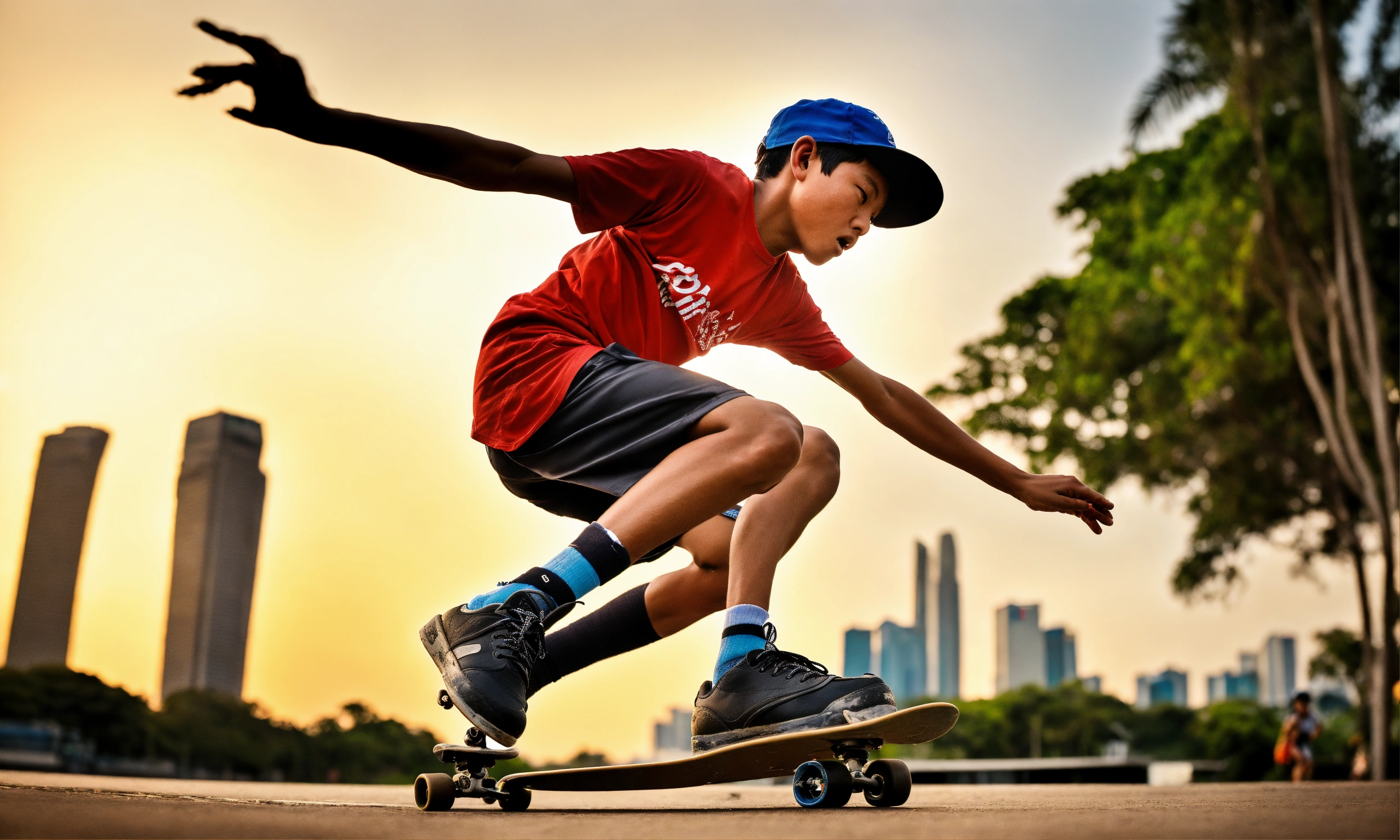 Afternoon sun, ultra-realistic photo, cinematic quality, close-up action shot at singapore's east coast park, singapore, the backdrop showcases the iconic scenery of the park. main focus a 9-year-old malay skateboarder in mid-air executing a challenging trick, his body contorted in concentration. intense focus radiates from his eyes, sweat glistening on his brow, exuding raw passion and unyielding perseverance; clothing contemporary skateboarding attire including protective gear, a t-shirt, shorts, and sneakers. expression grit and determination, a testament to his dedication to the sport. themes modern nostalgia, overcoming adversity, dynamic lighting emphasizes the contours of his face and body against the backdrop of east coast park, 50mm camera lens producing sharpness with a blurred background, portra 400 film, subtle film grain adding depth and emphasizing the raw energy of the moment.