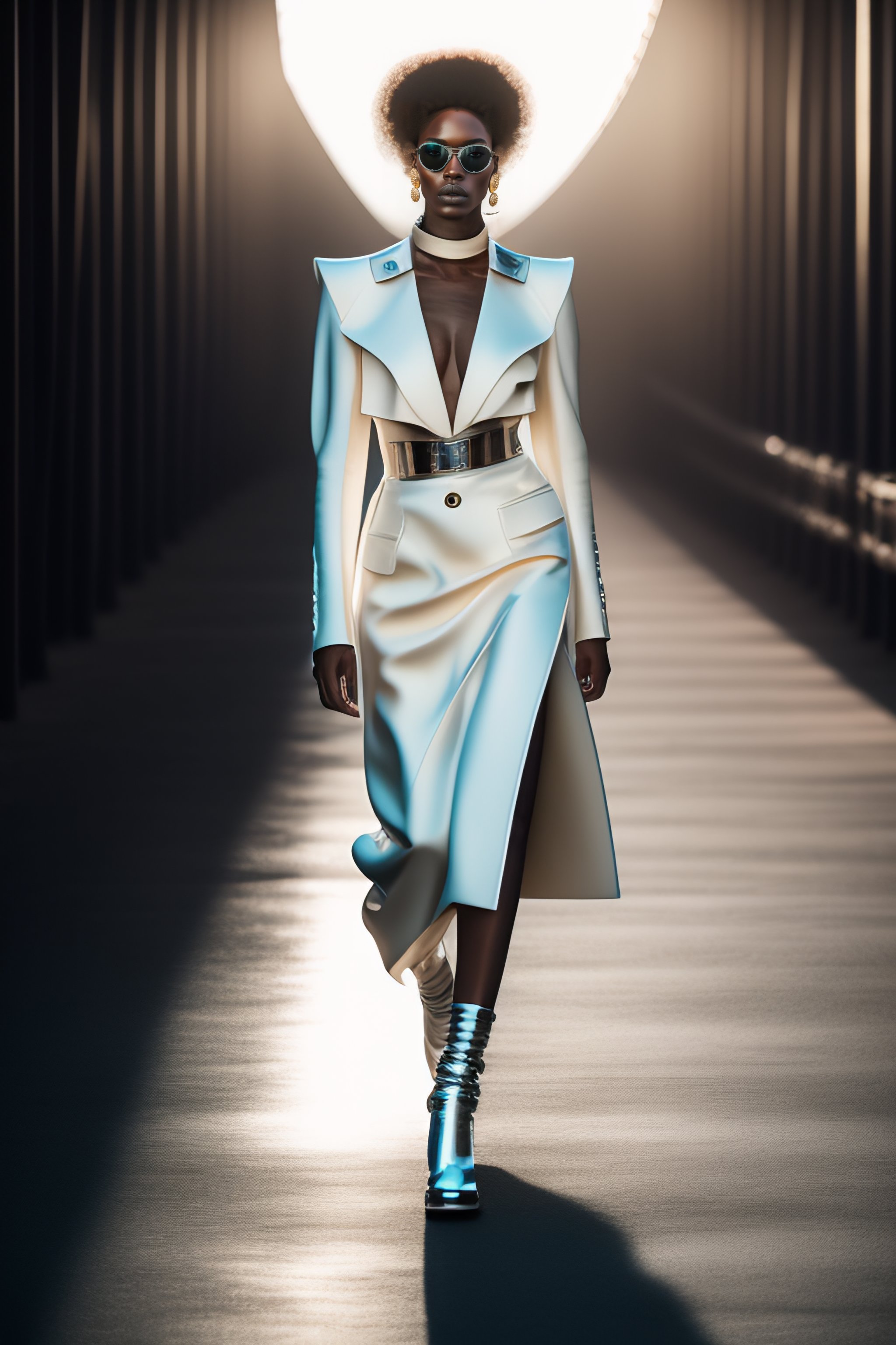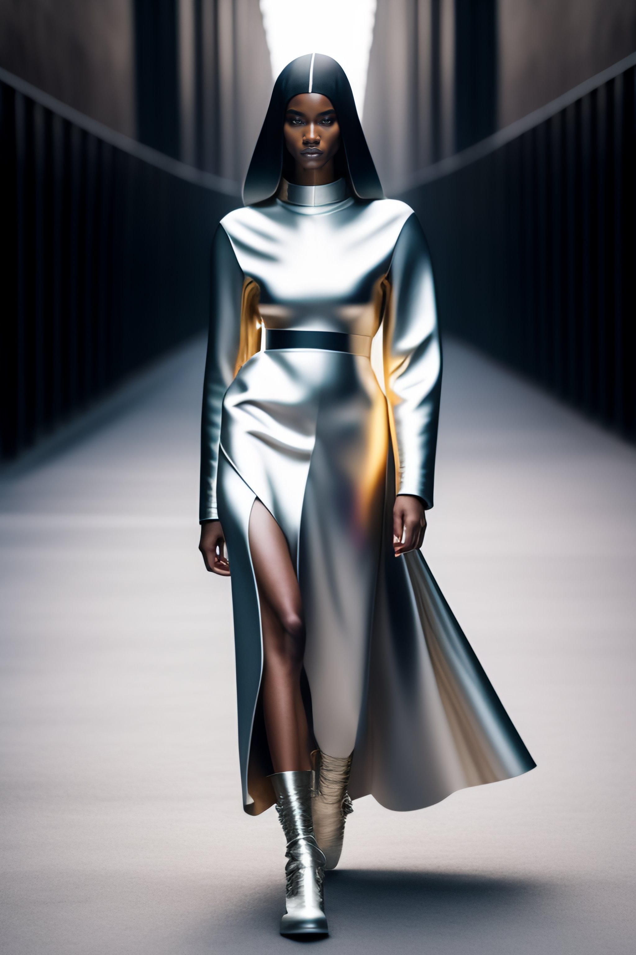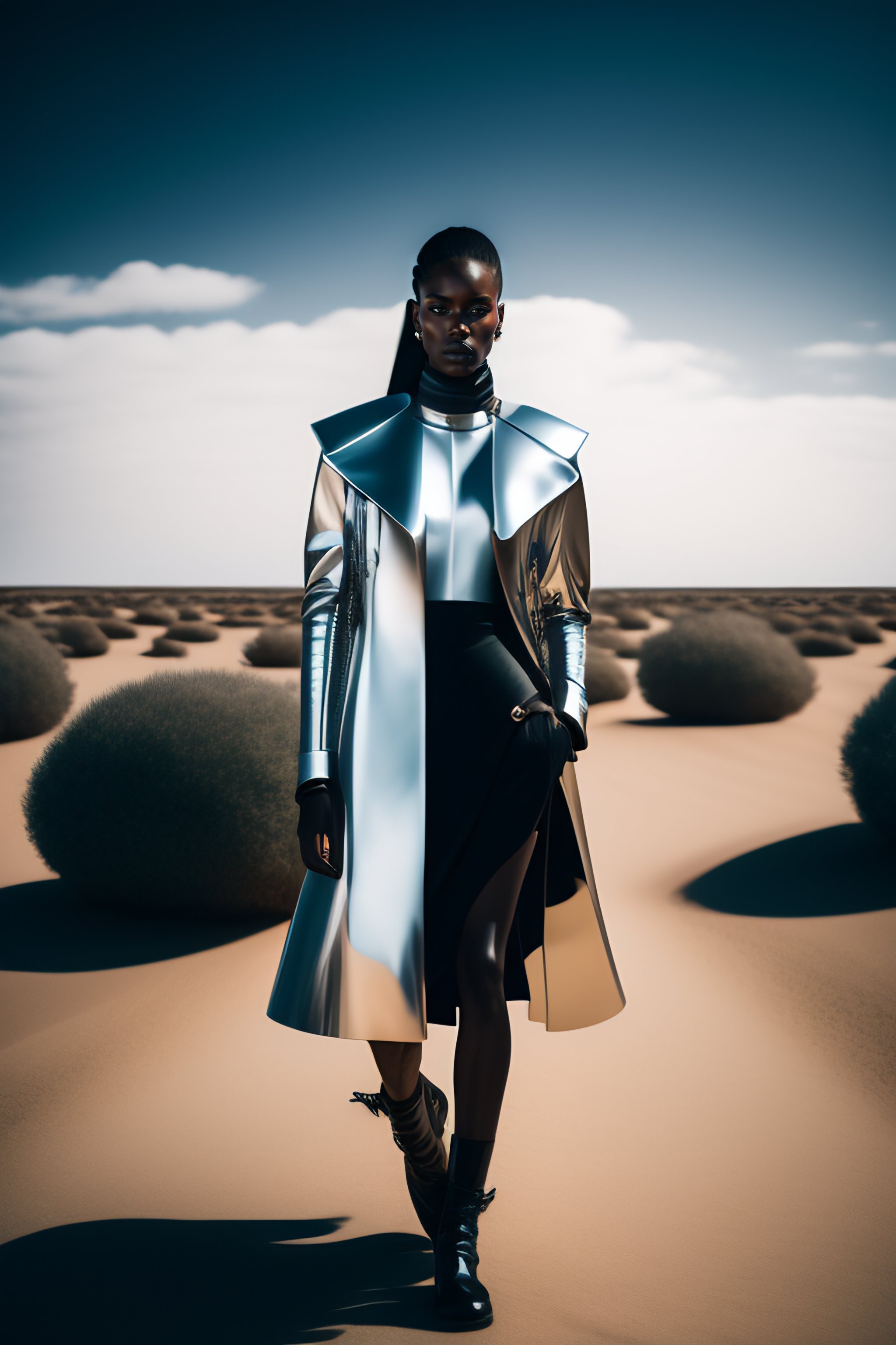 Ultra hd! editorial, rick owens, female model, chrome, structured outfit, platform, iso 400, surrealistic, 8k, full frame, landscape, architecture