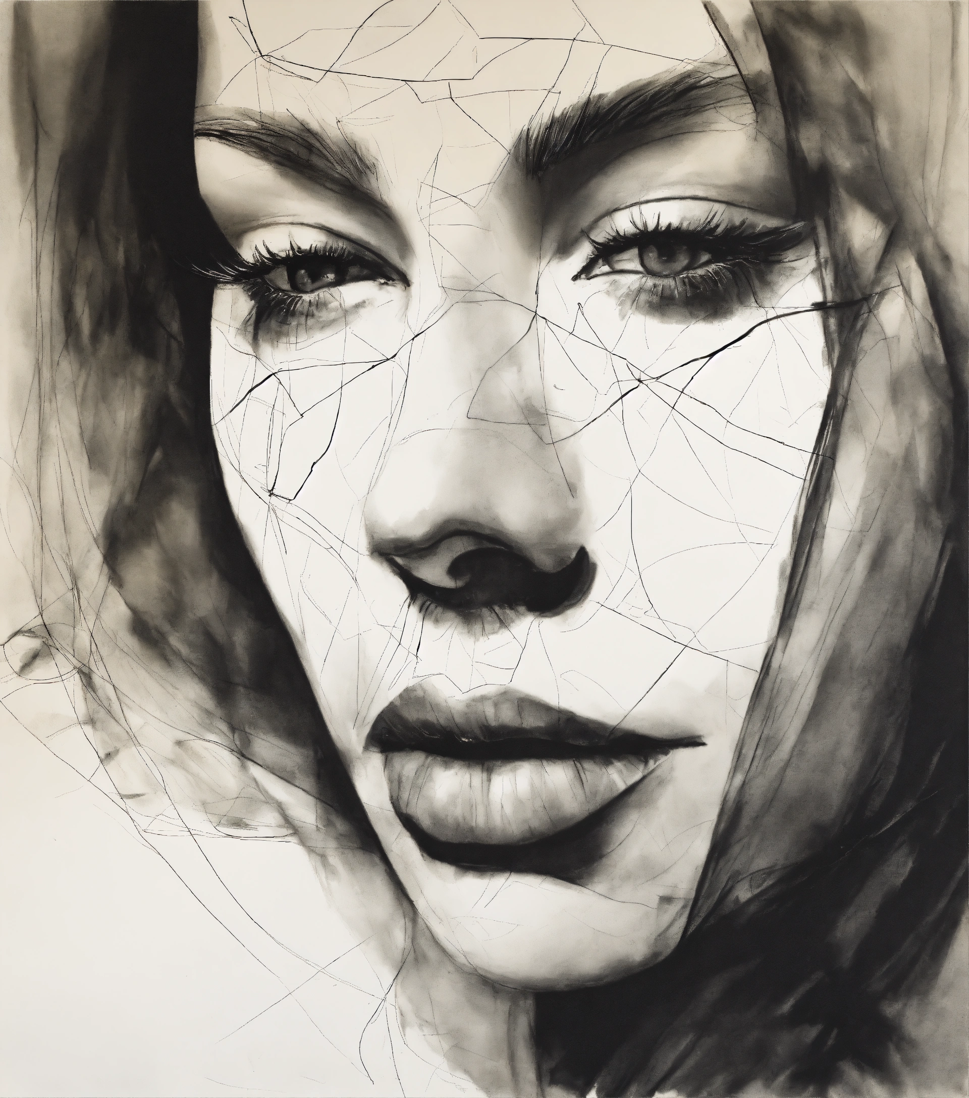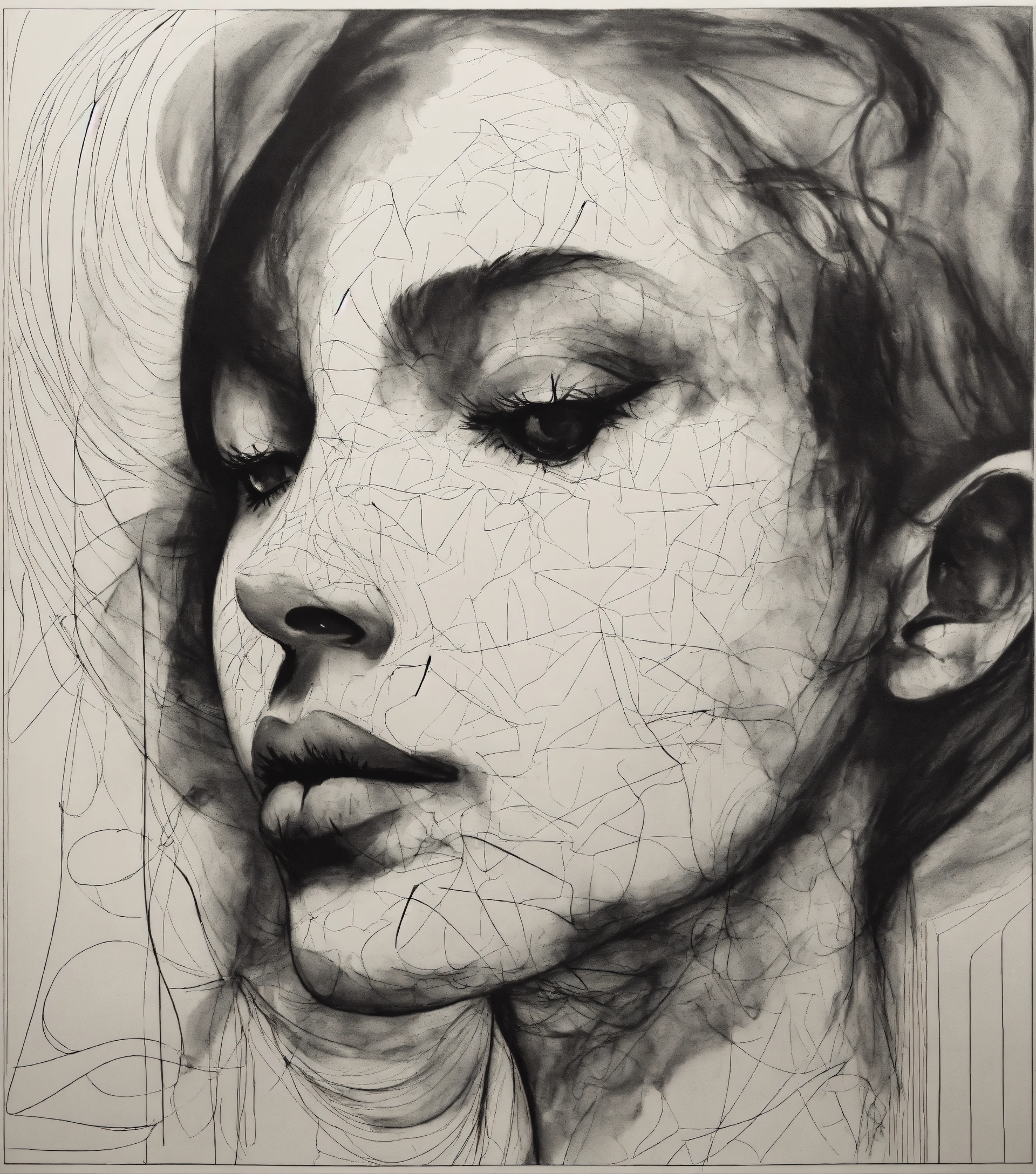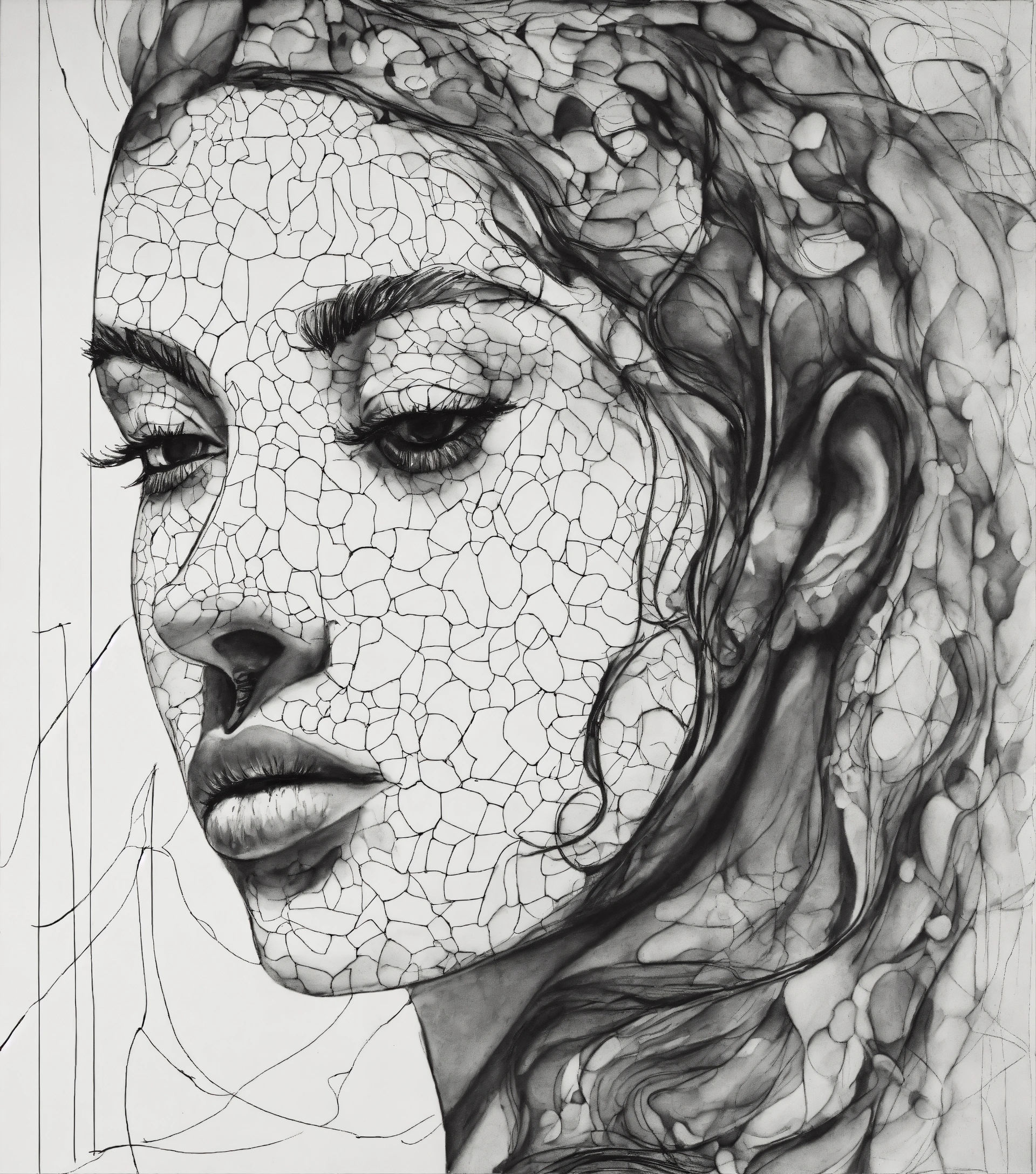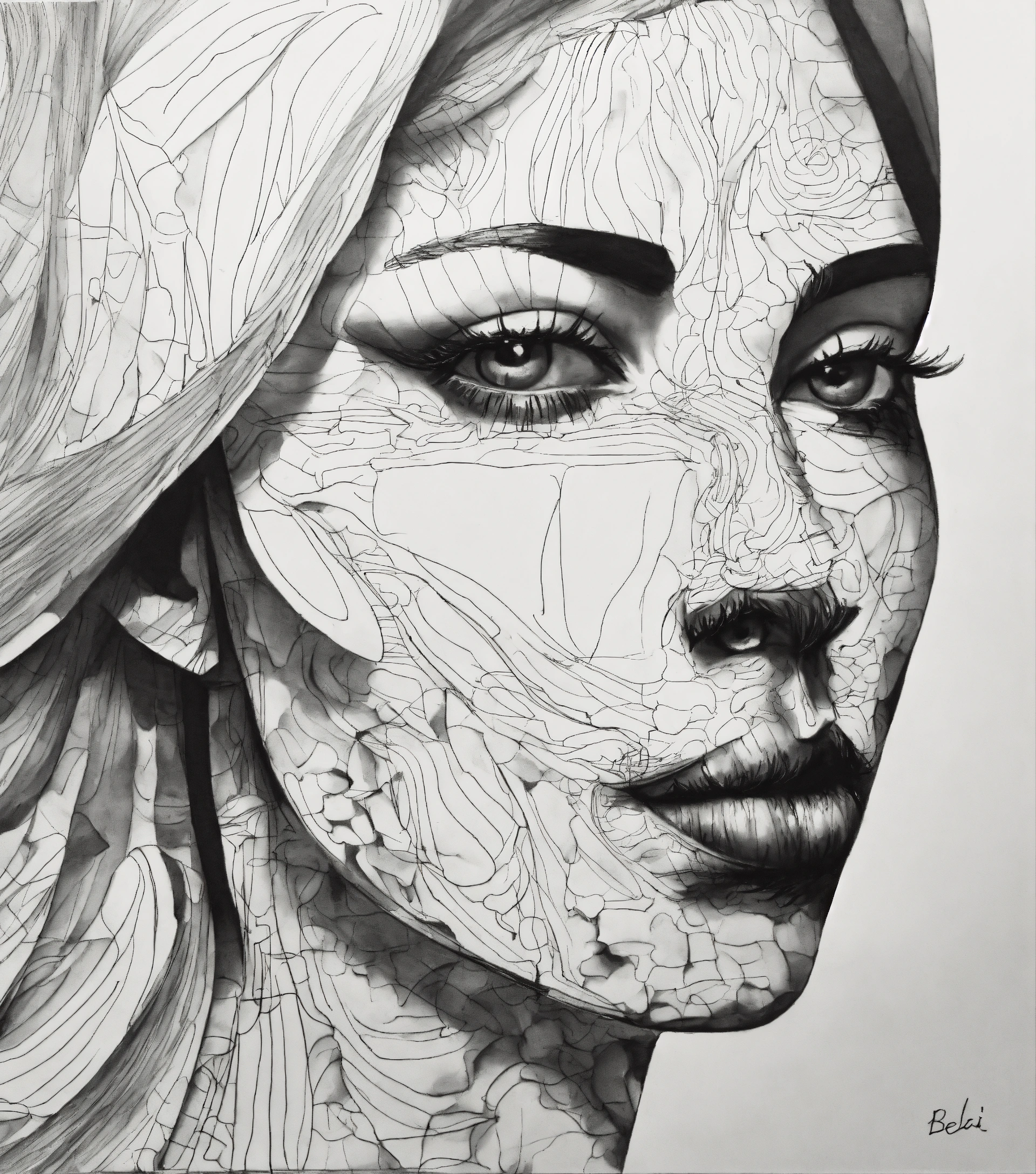 A black and white drawing of a woman's face, an abstract drawing by béla czóbel, behance contest winner, figurativism, biomorphic, outlined art, academic art