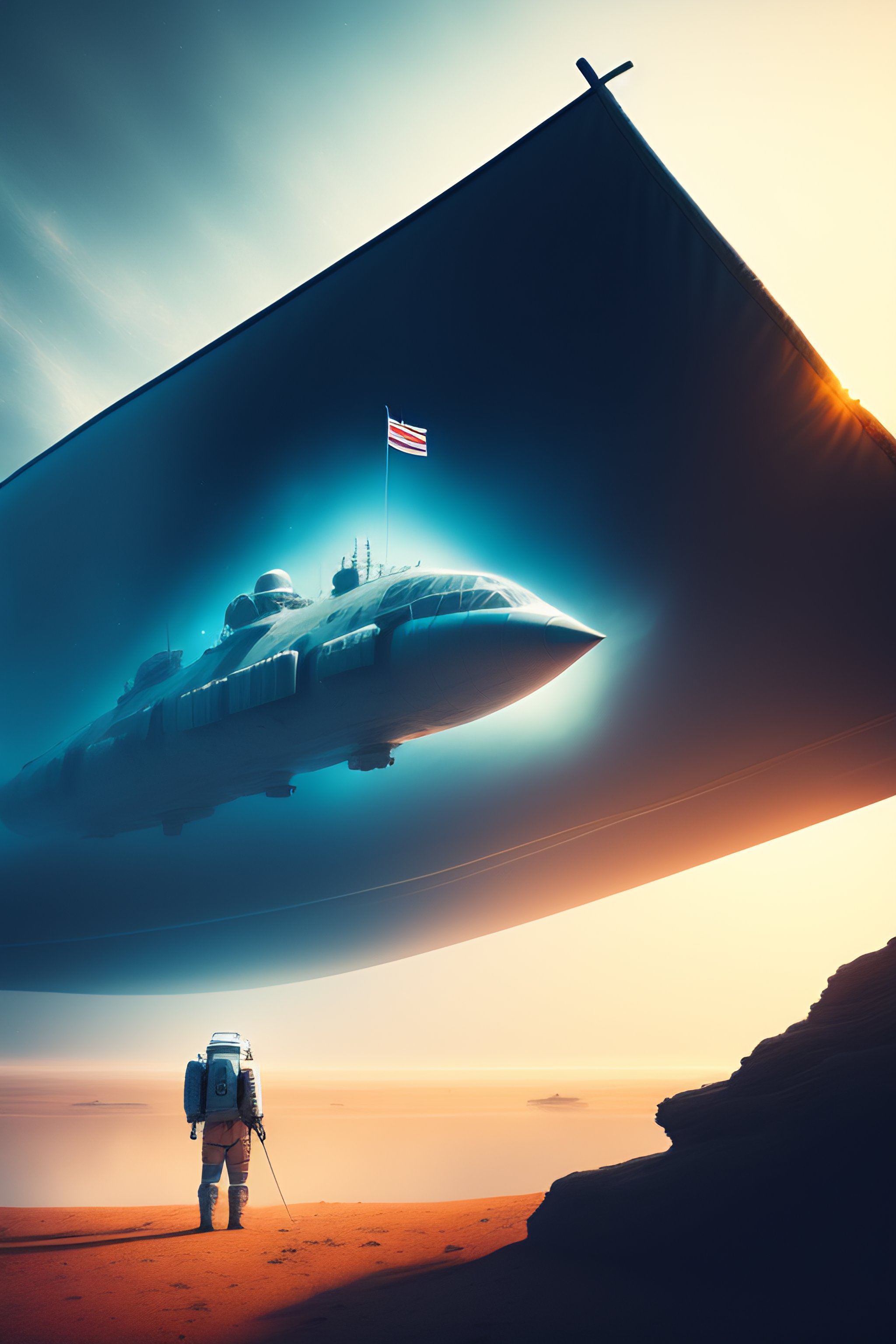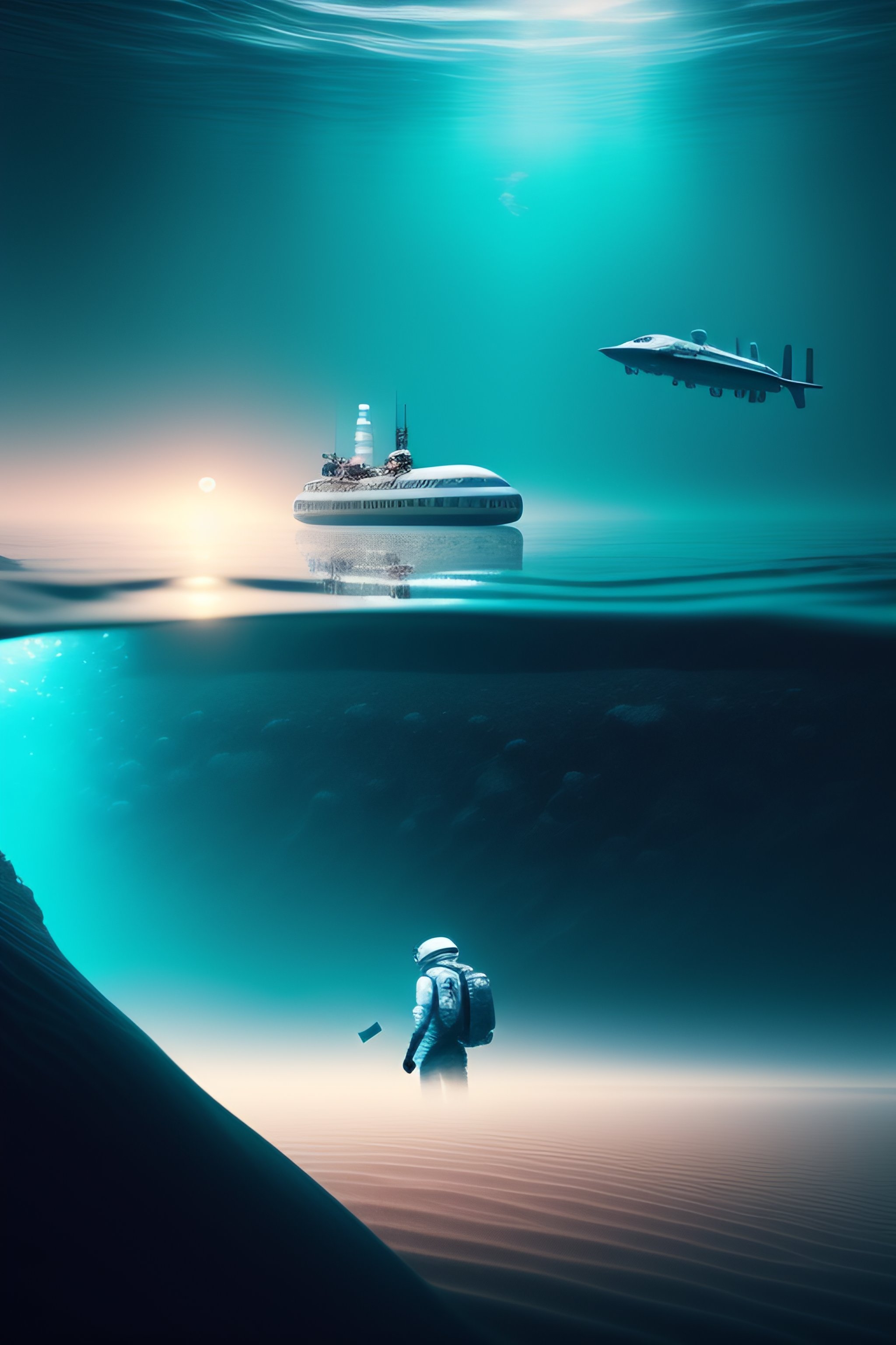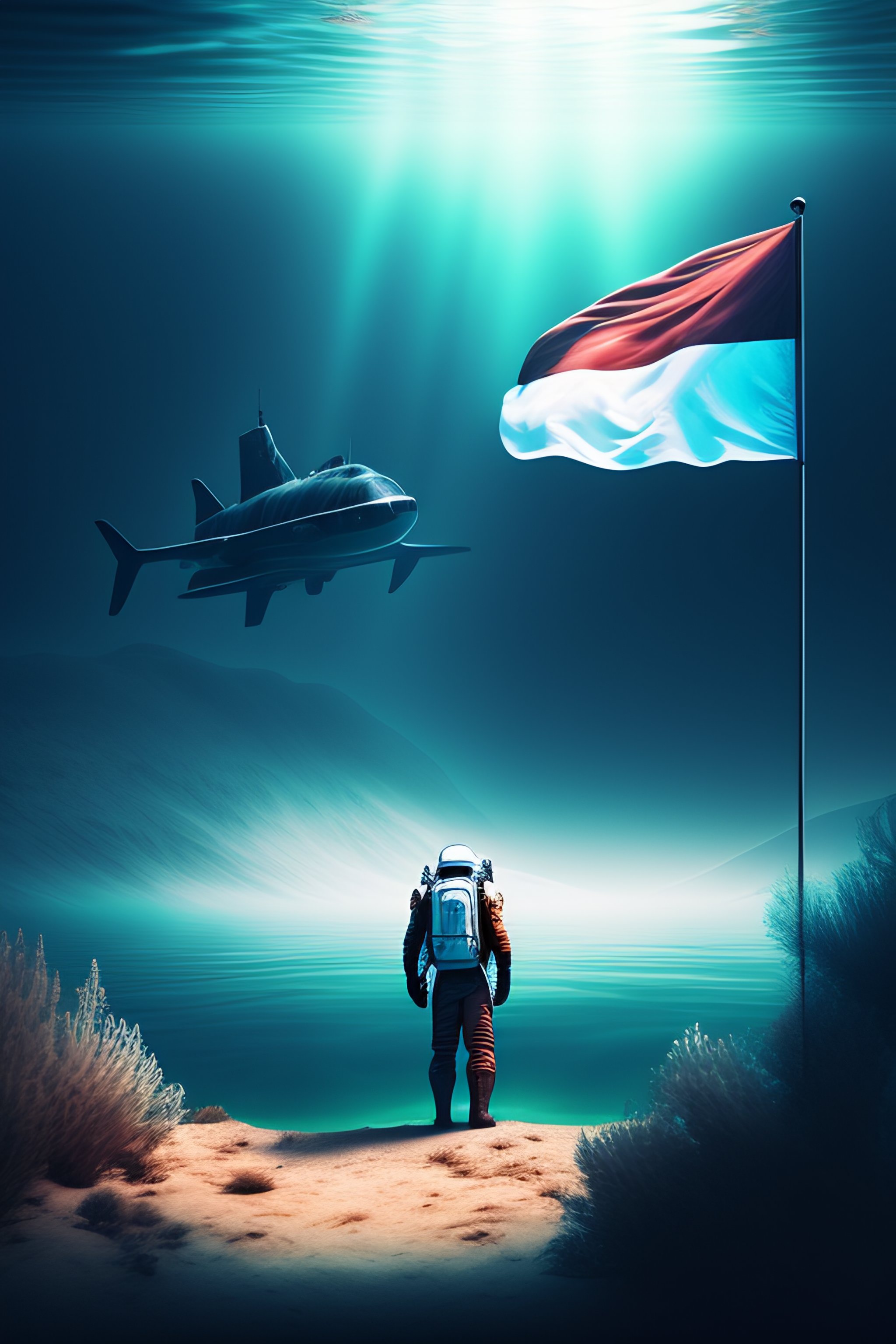 Astronaut holding a flag in an underwater desert. a submarine is visible in the distance. dark, concept art, cinematic, dramatic, atmospheric, 8 k, trending on artstation, blue, fish, low visibility, light rays, extremely coherent, bubbles, fog, ocean floor, christopher nolan, interstellar