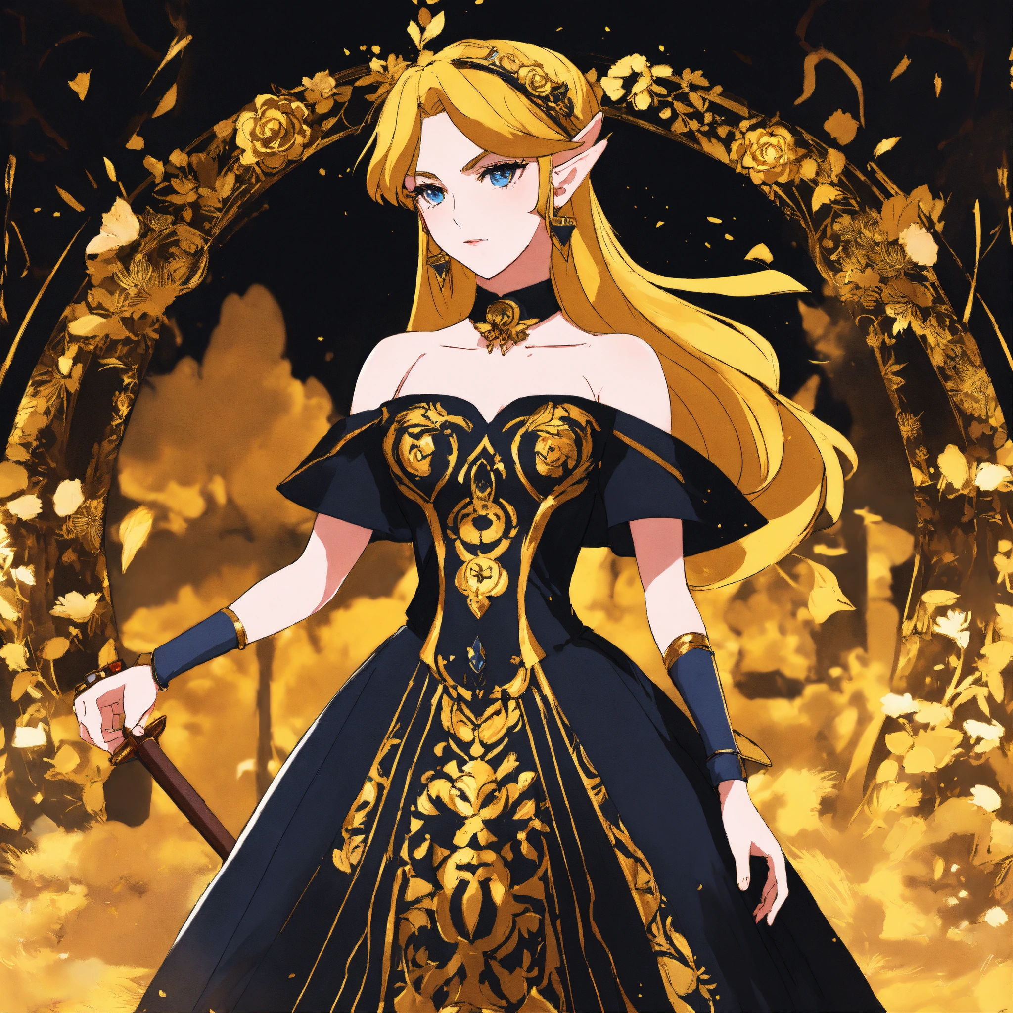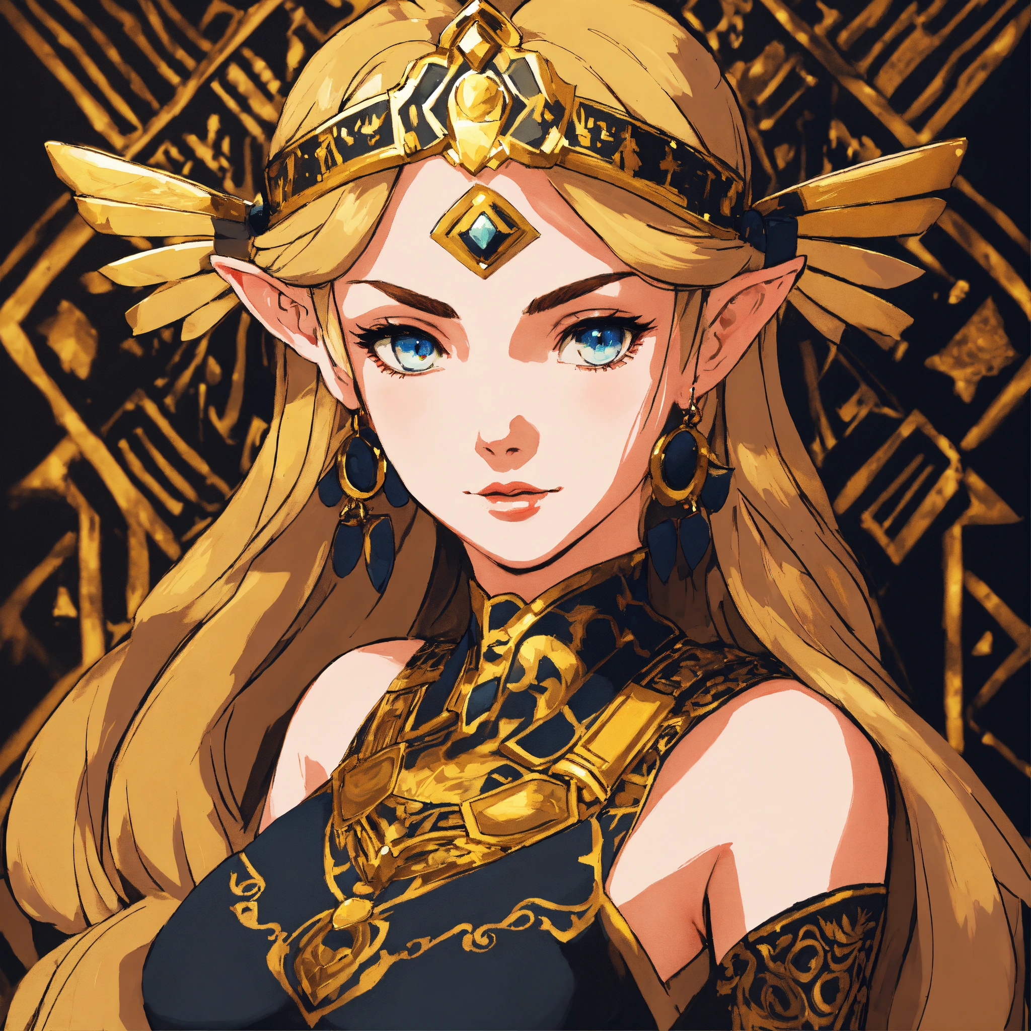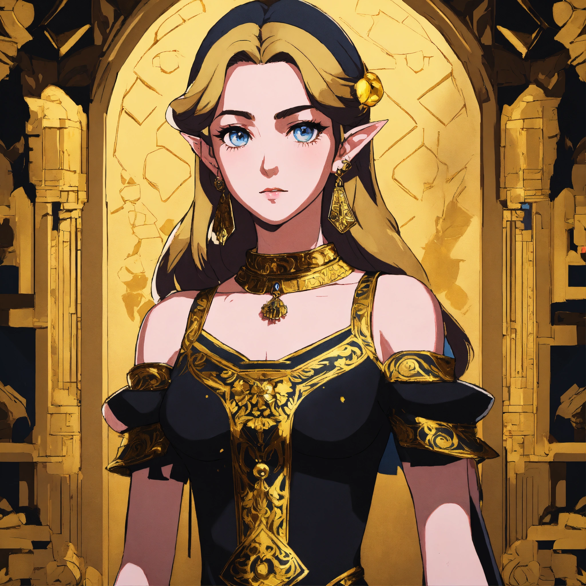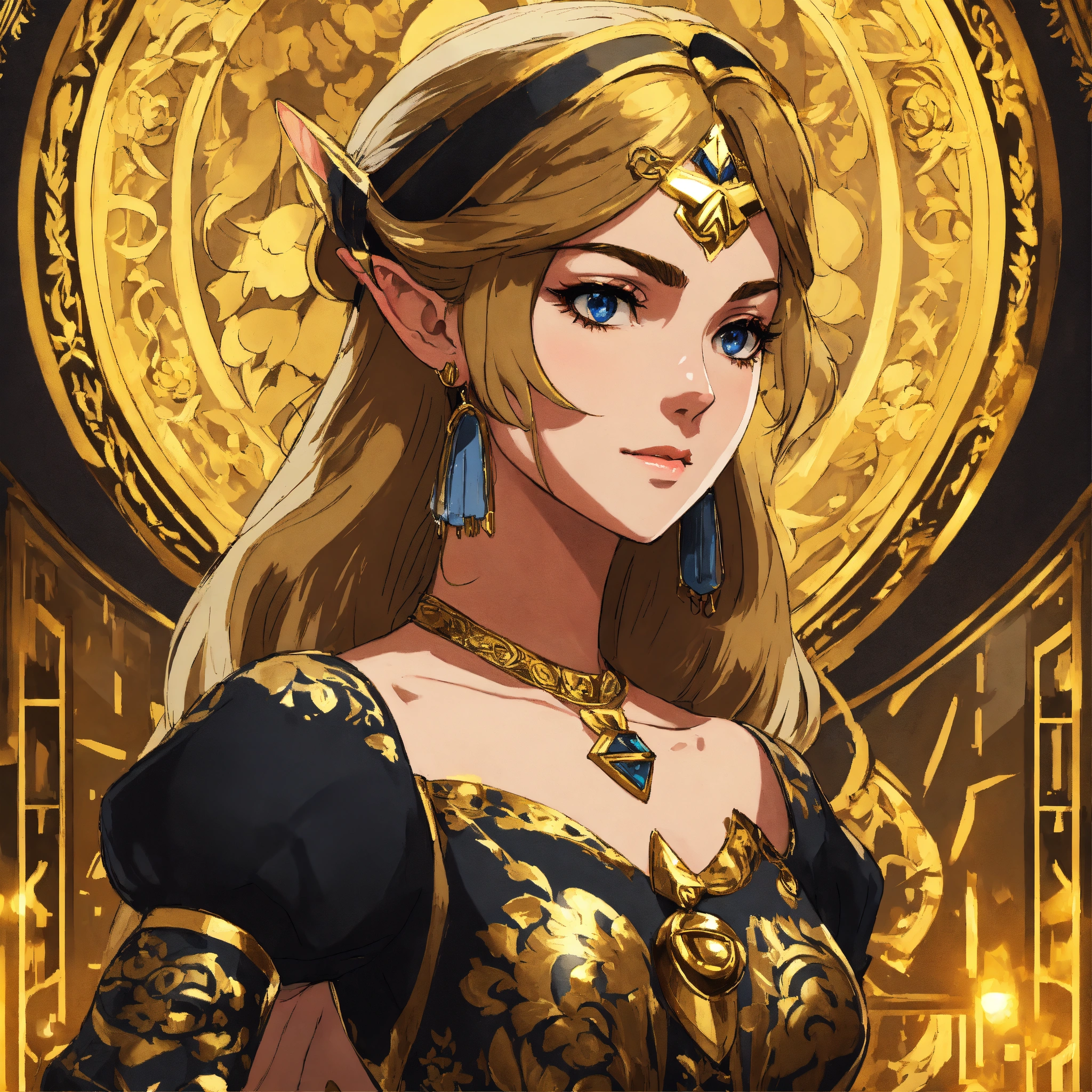Portrait of zelda in a black and gold dress, stunning beautiful artwork, breath of the wild, 8k, maximalist, 8k retro anime art, vintage 90's anime, akira style