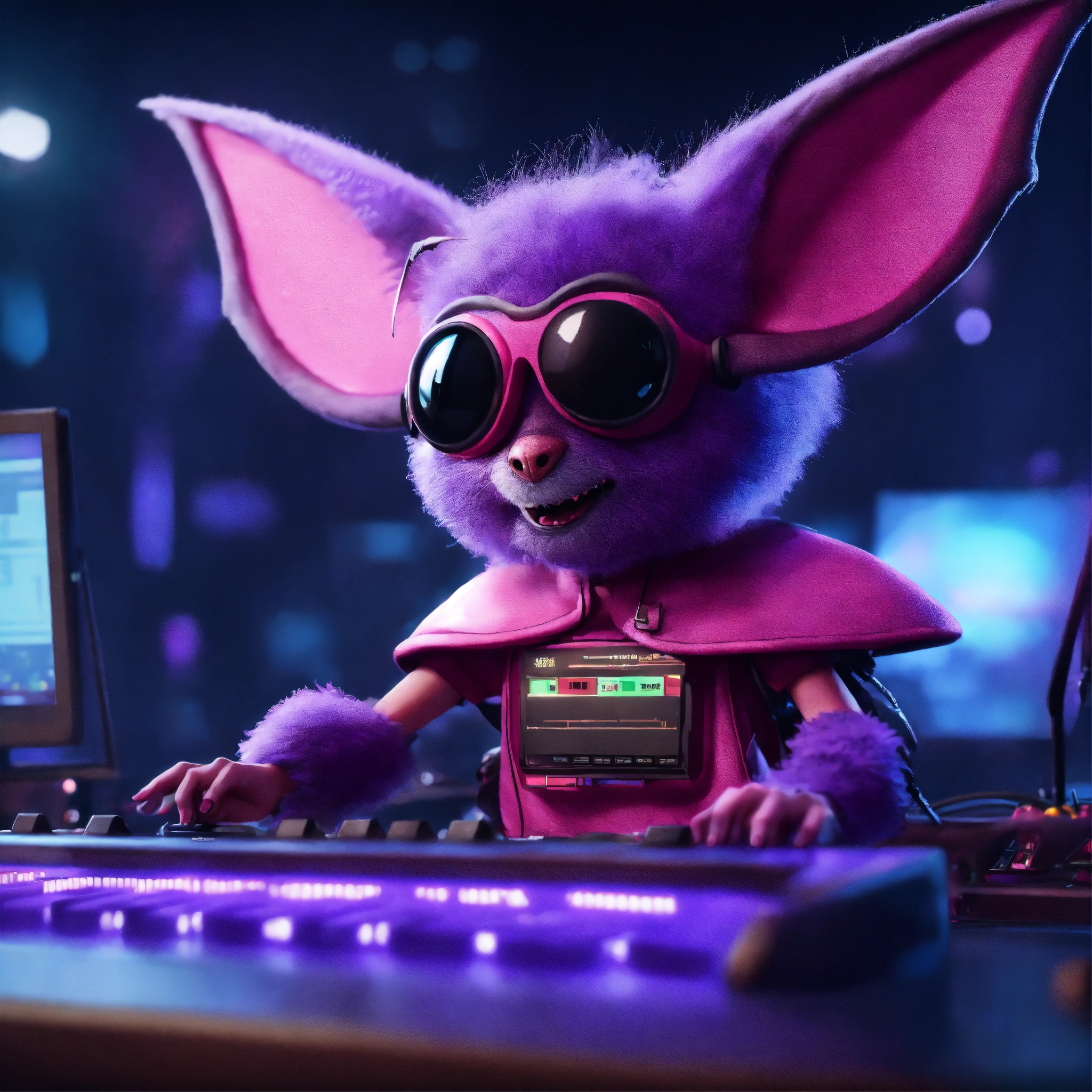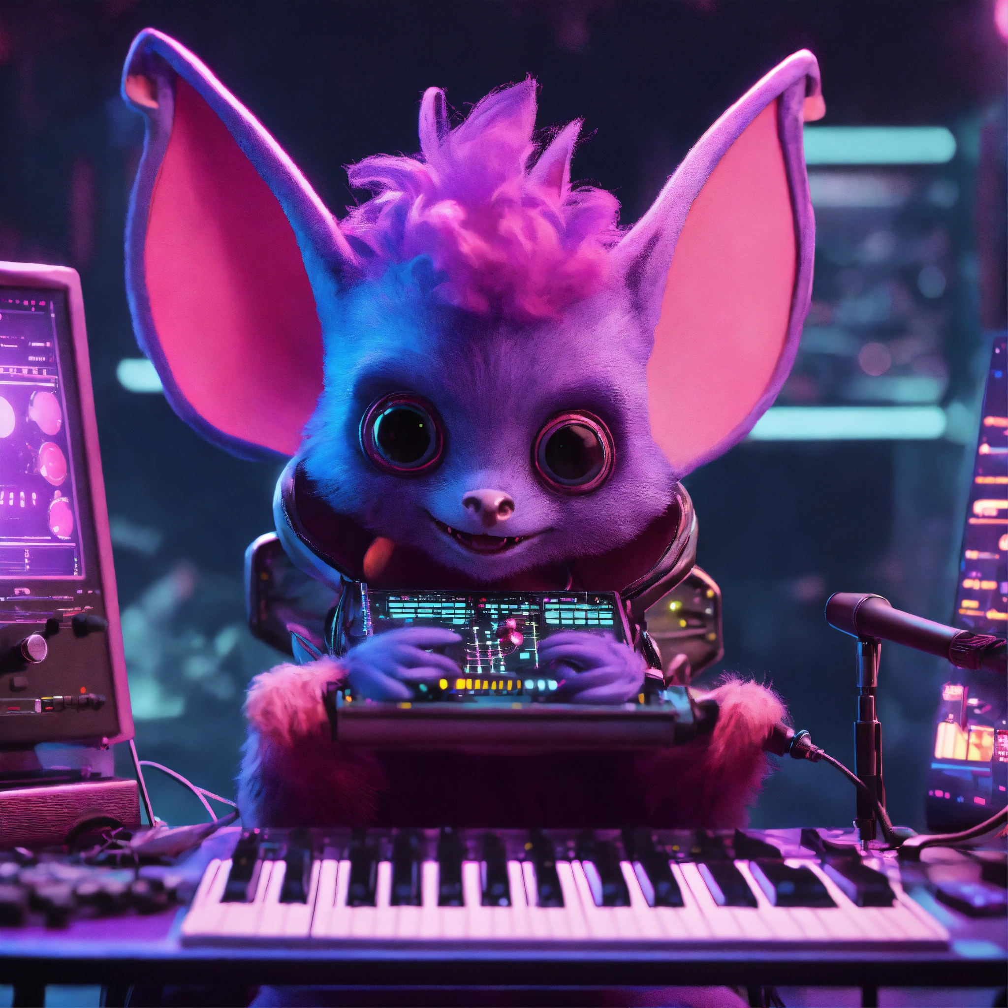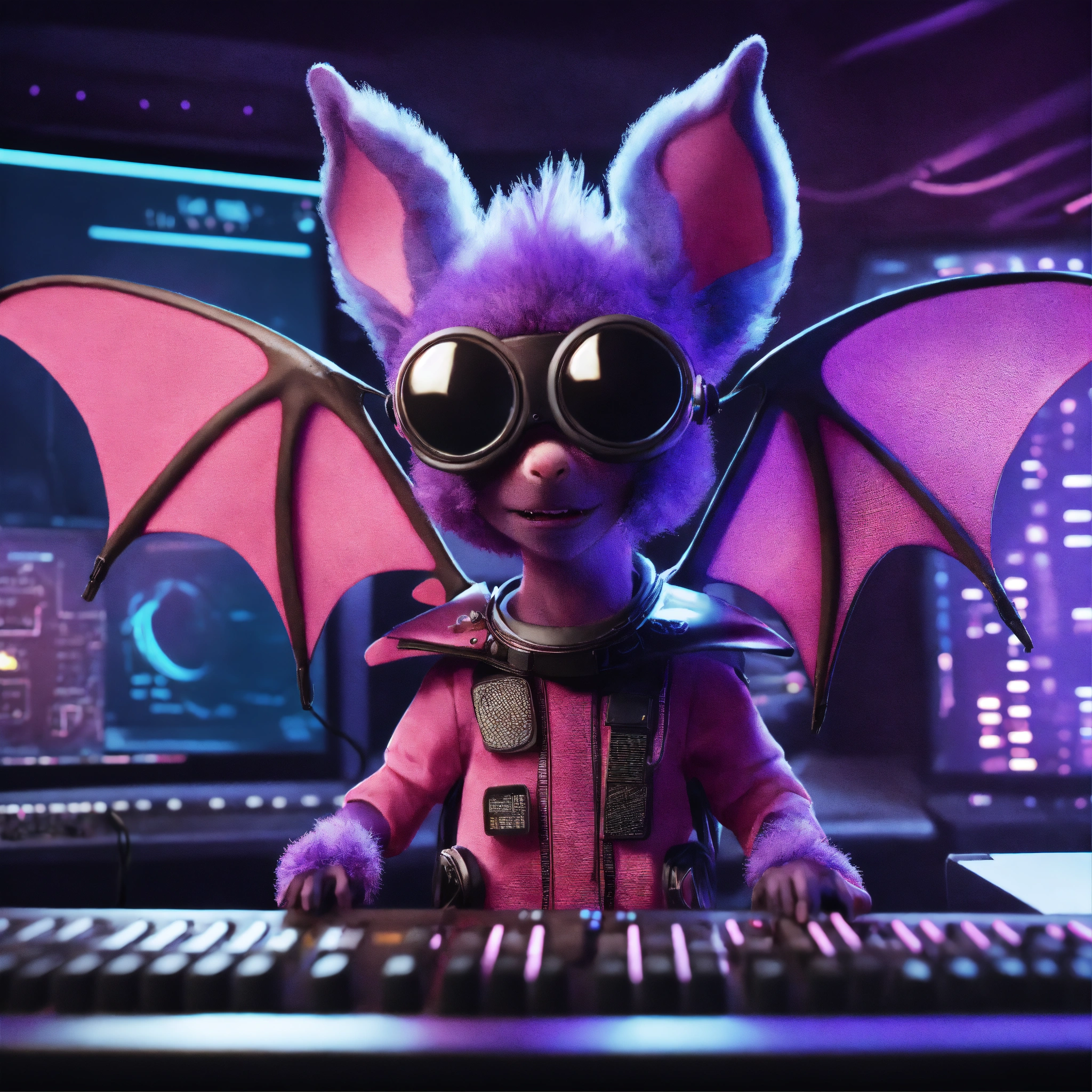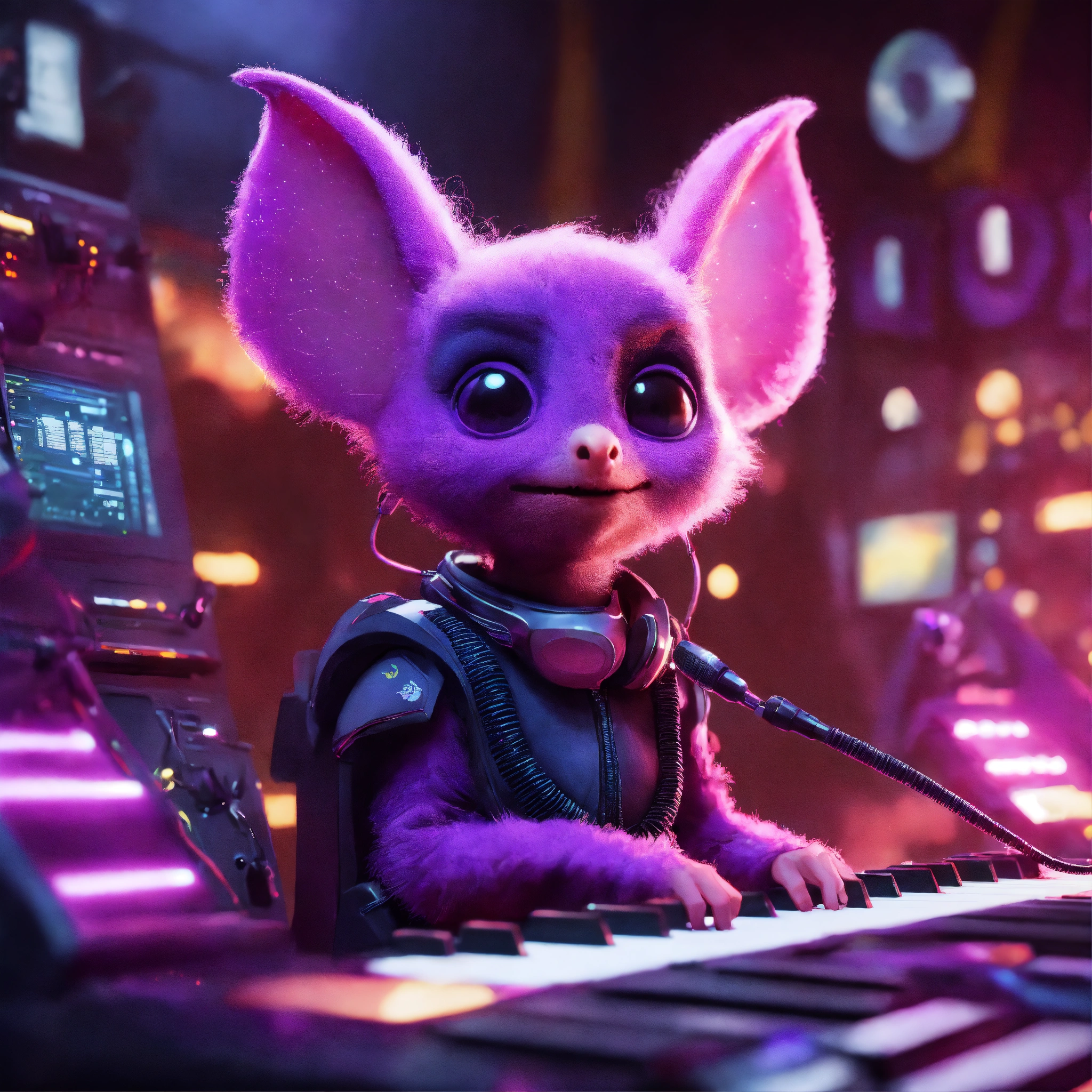 Cute silly fuzzy pink and purple alien fruitbat character with big ears, bat wings, purple mohawk, flying in a dark hi-tech control room, playing a synthesizer harp, cosmic, disney, pixar, realistic, 8k