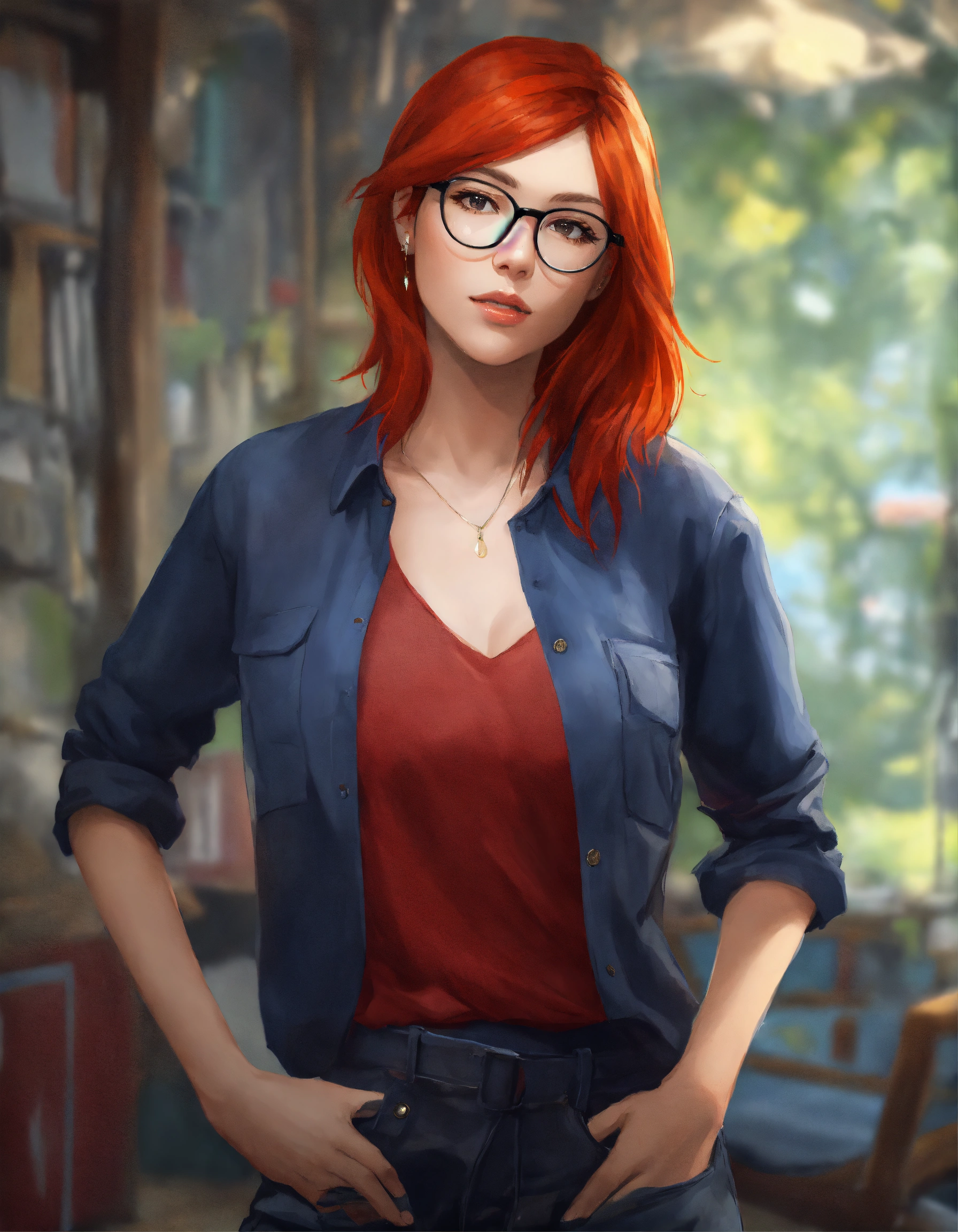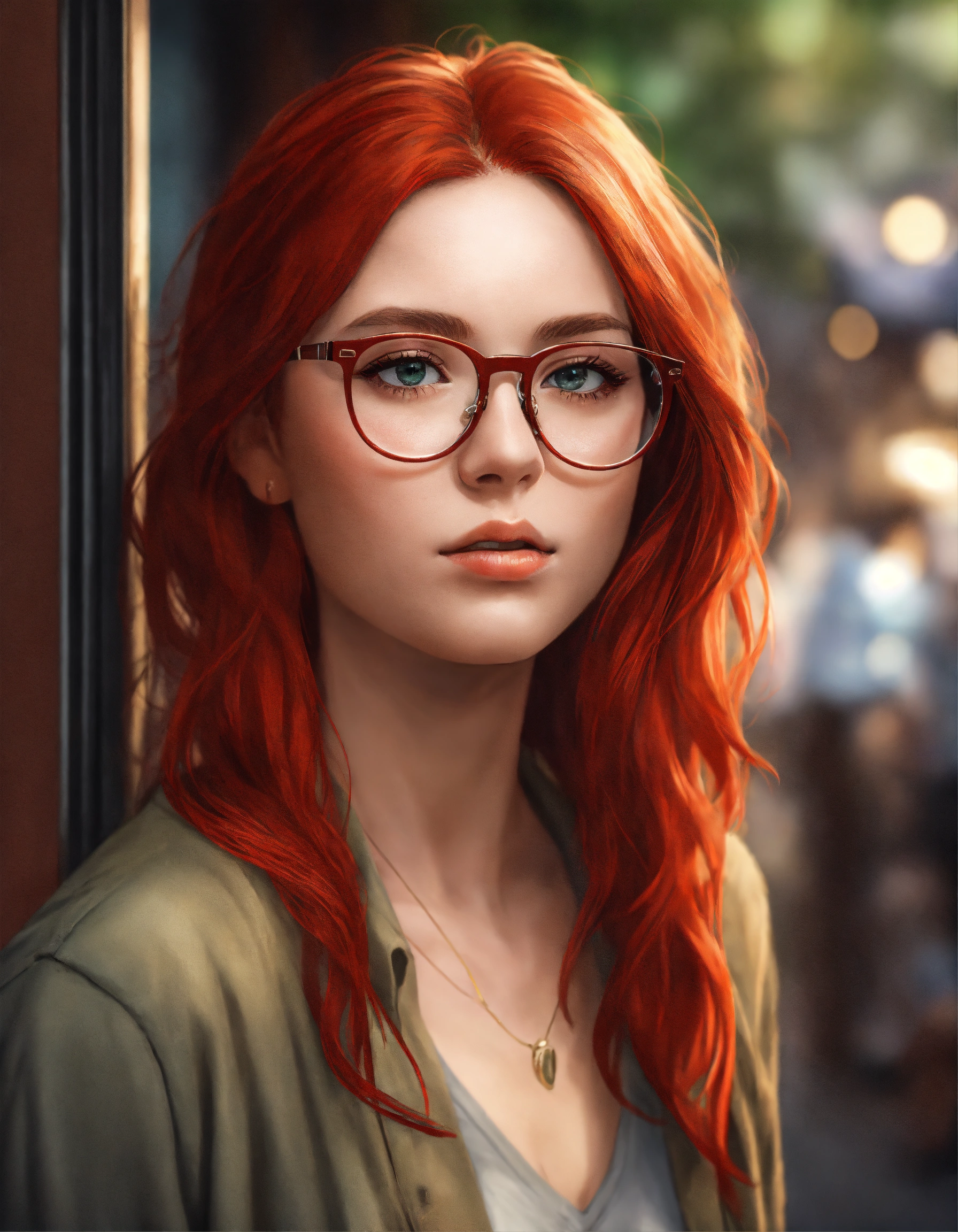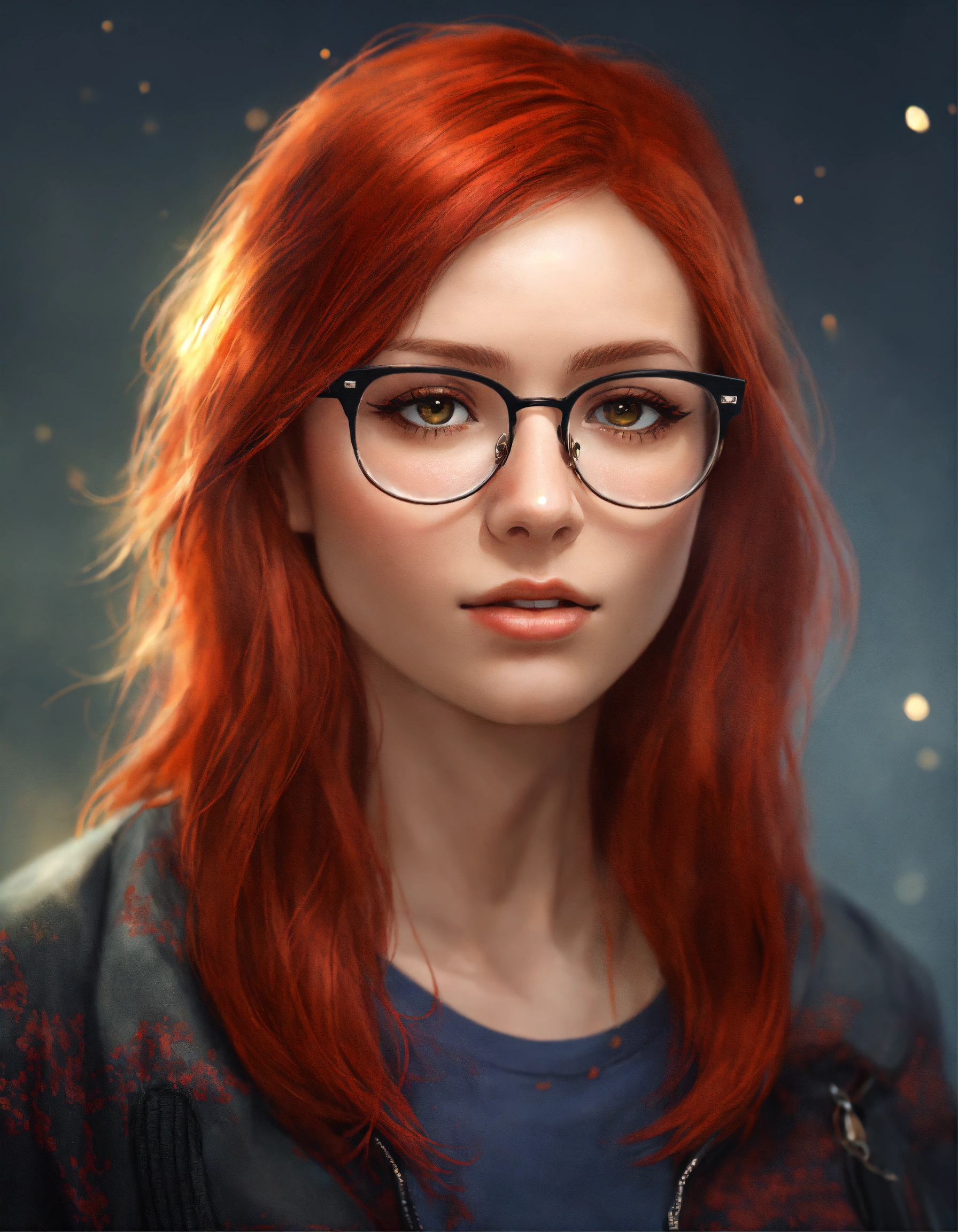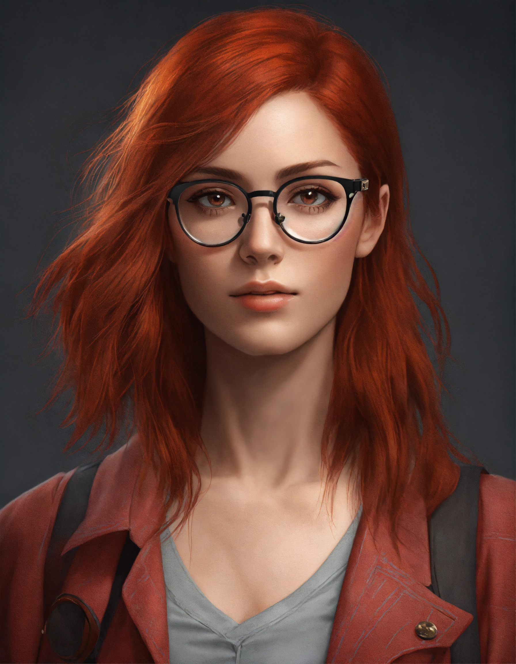 Female half body portrait avatar, with red hair wearing modern reading glasses, casual clothes, age 28, in photo realistic modern style, looking straight on