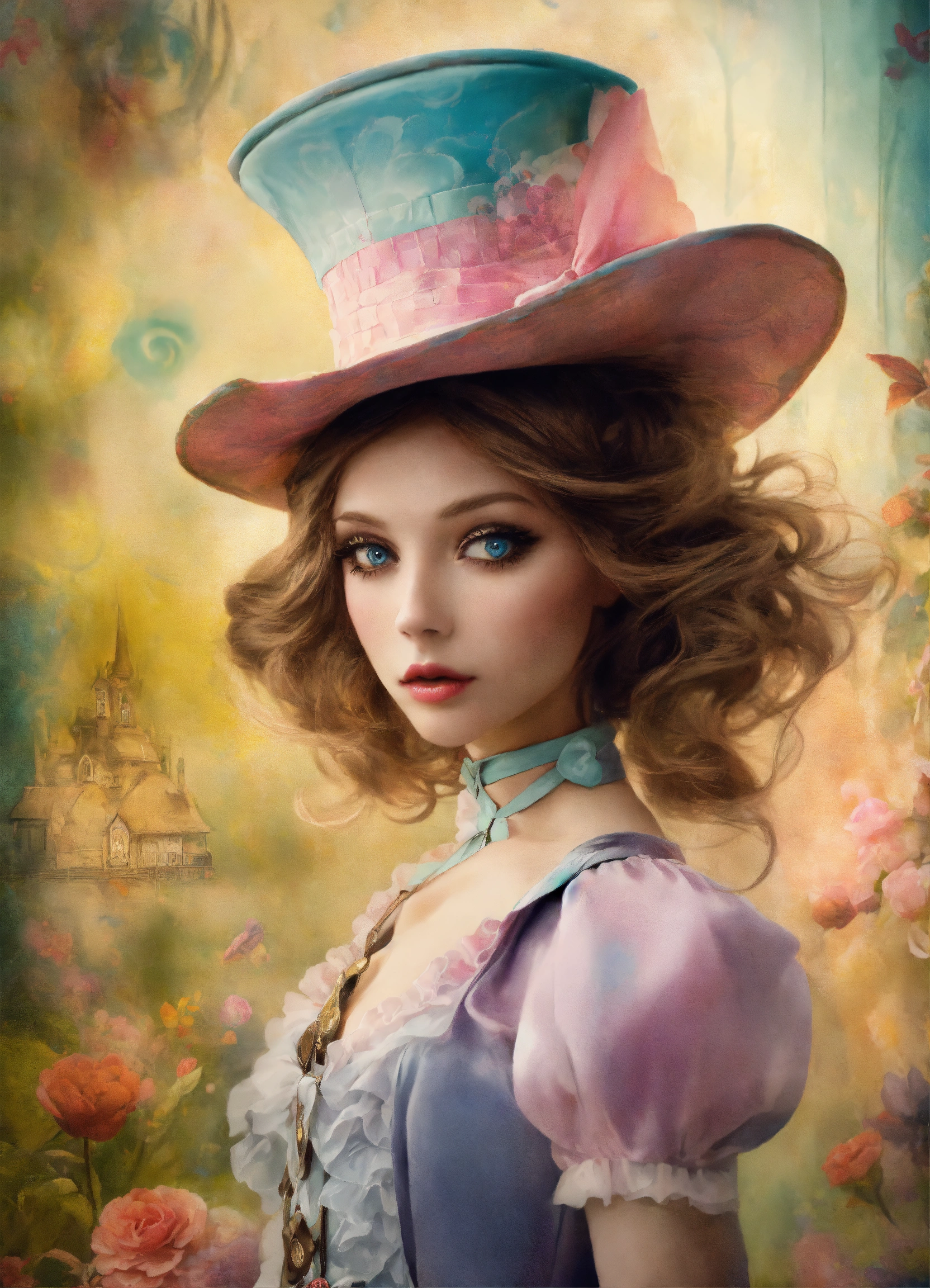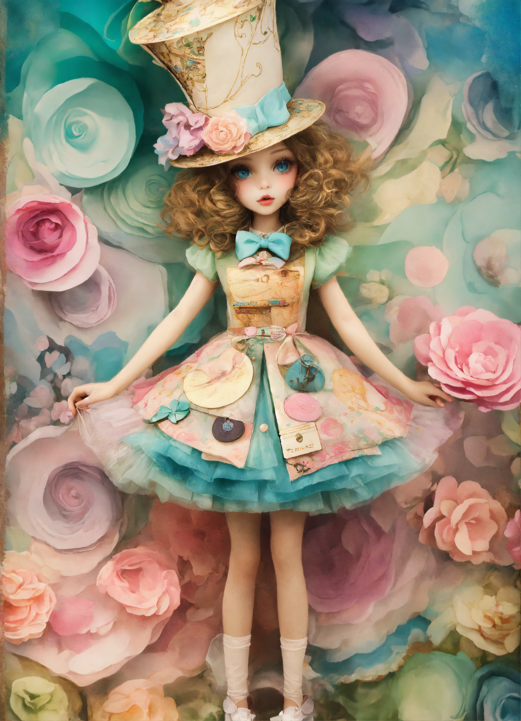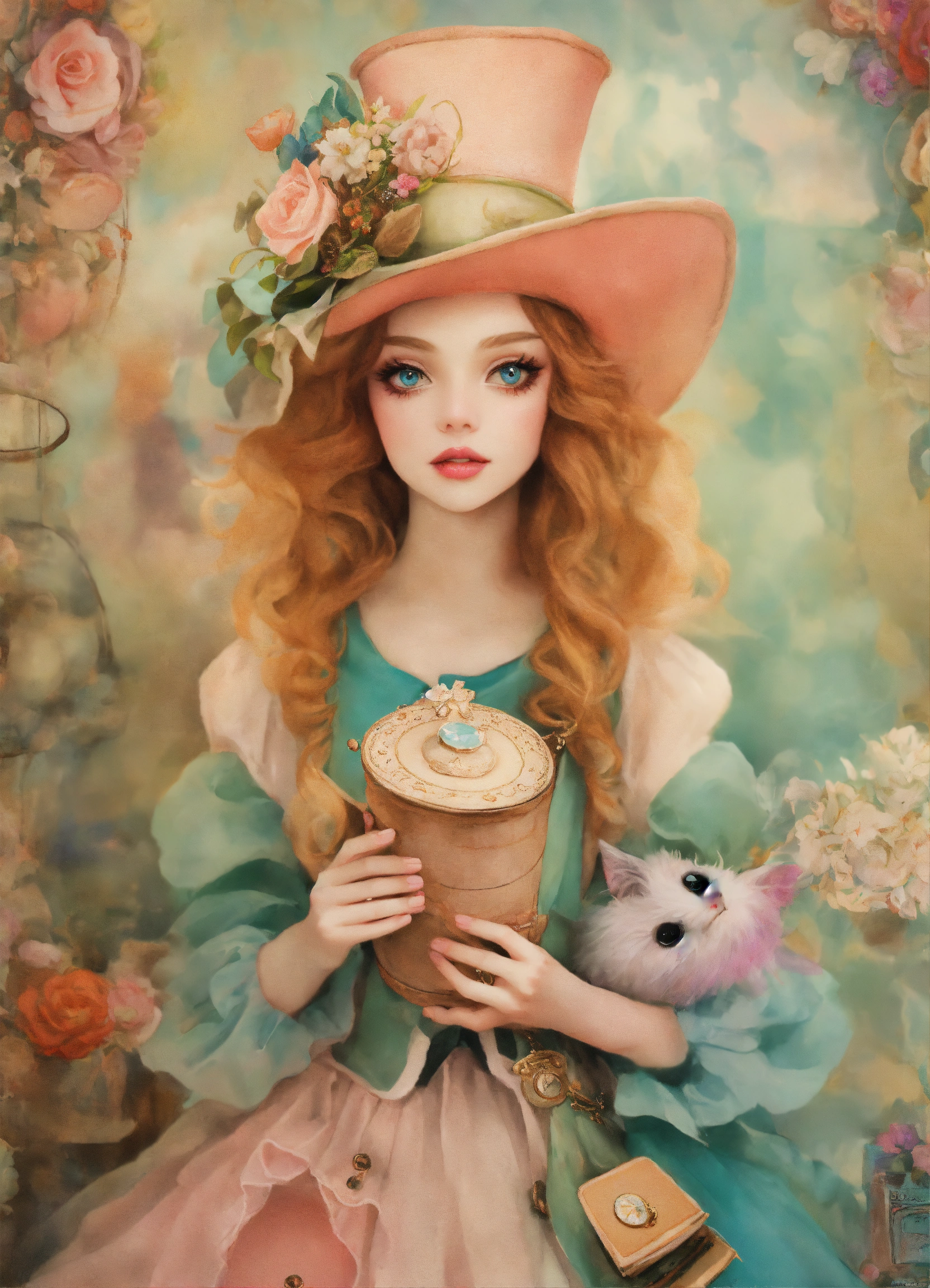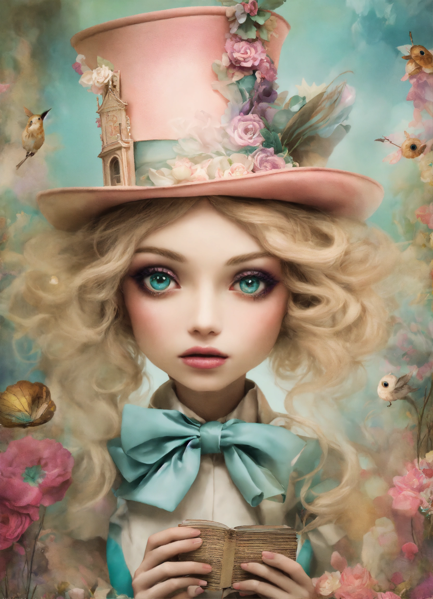 Shabby chic dreamy mist pastel junk journals whimsical cute quirky disney style the mad hatter alice in wonderland with big eyes in odd clothings, tamara laporte style, swirling magical fairytale abstract art style