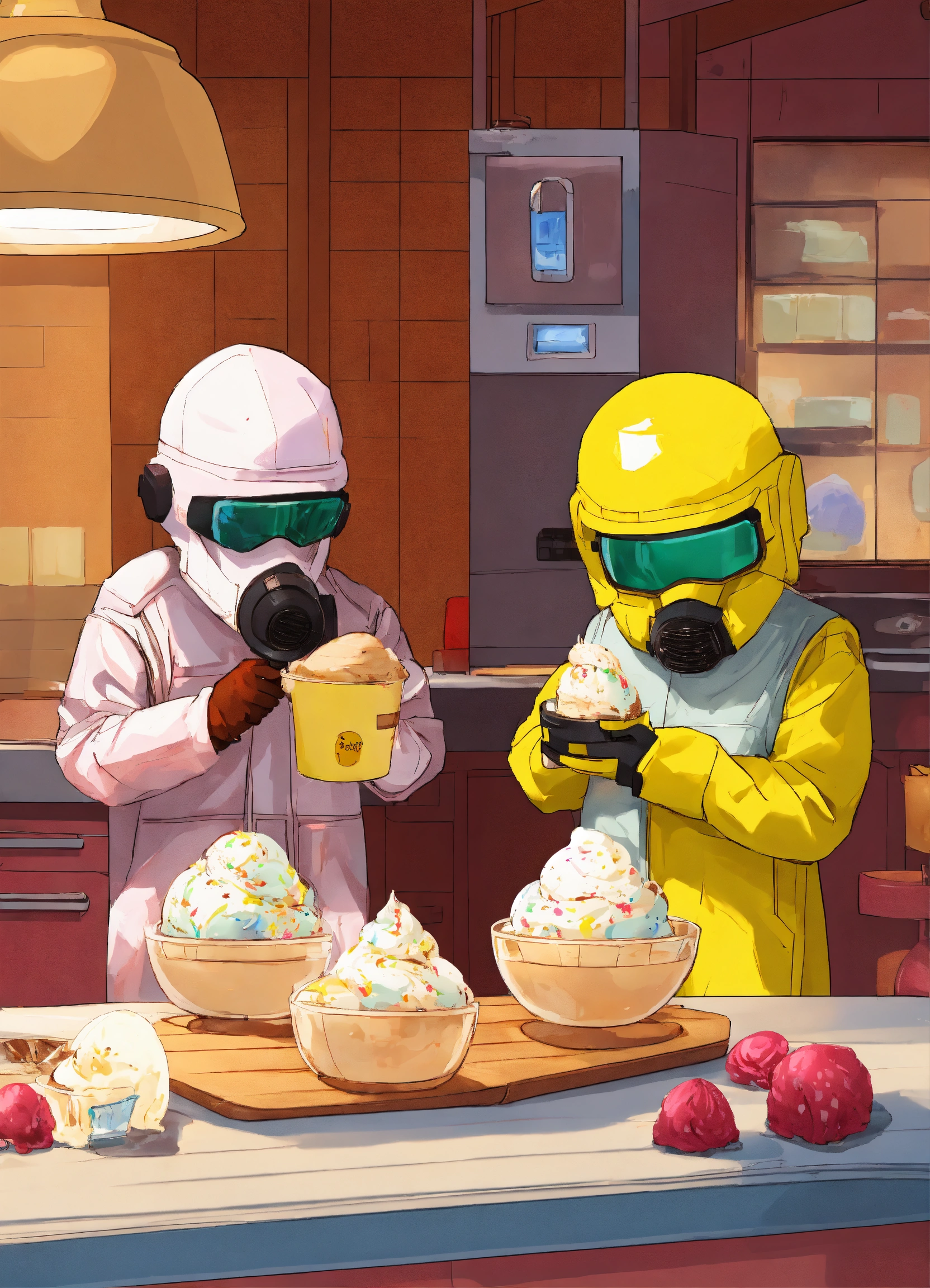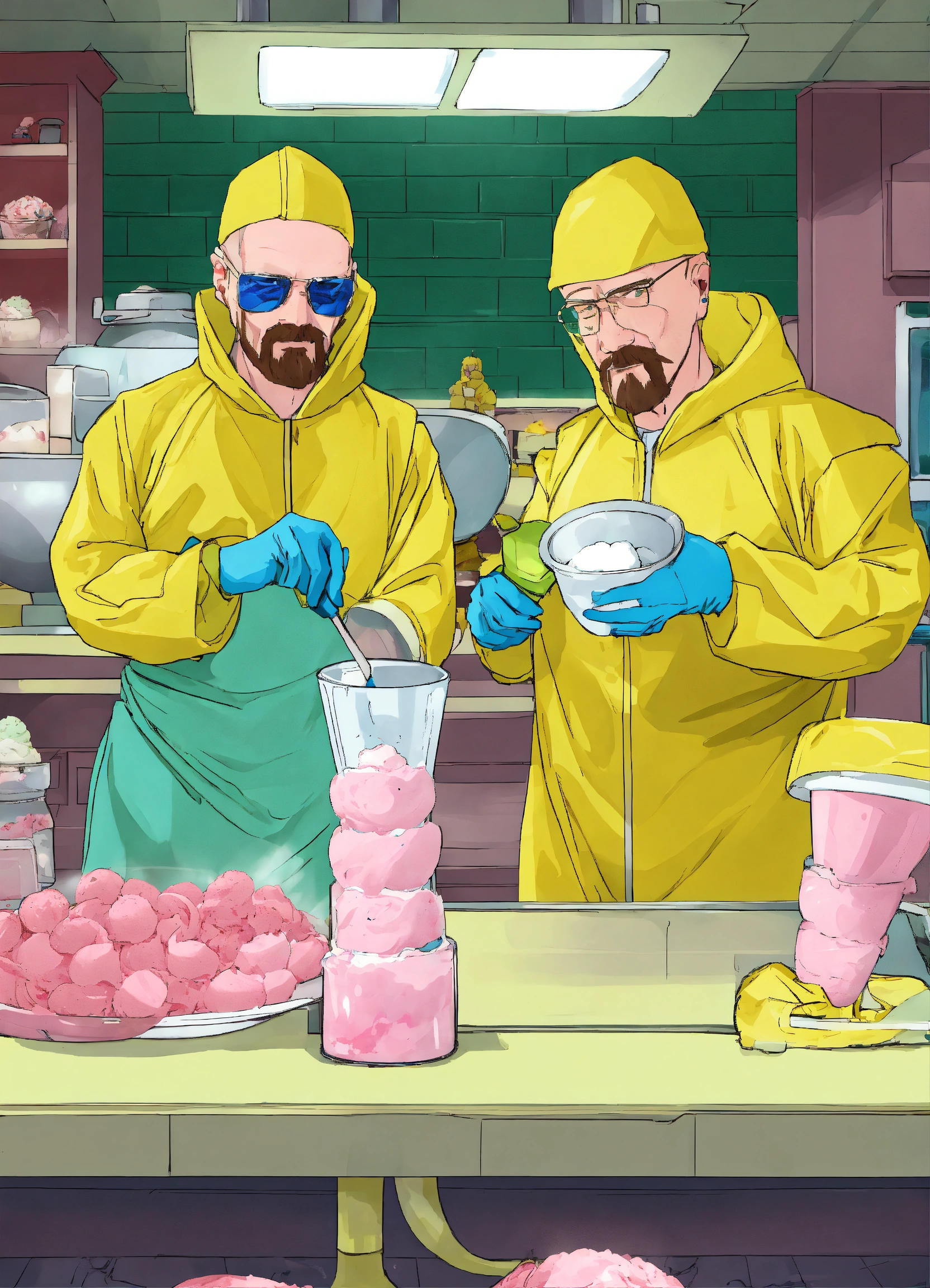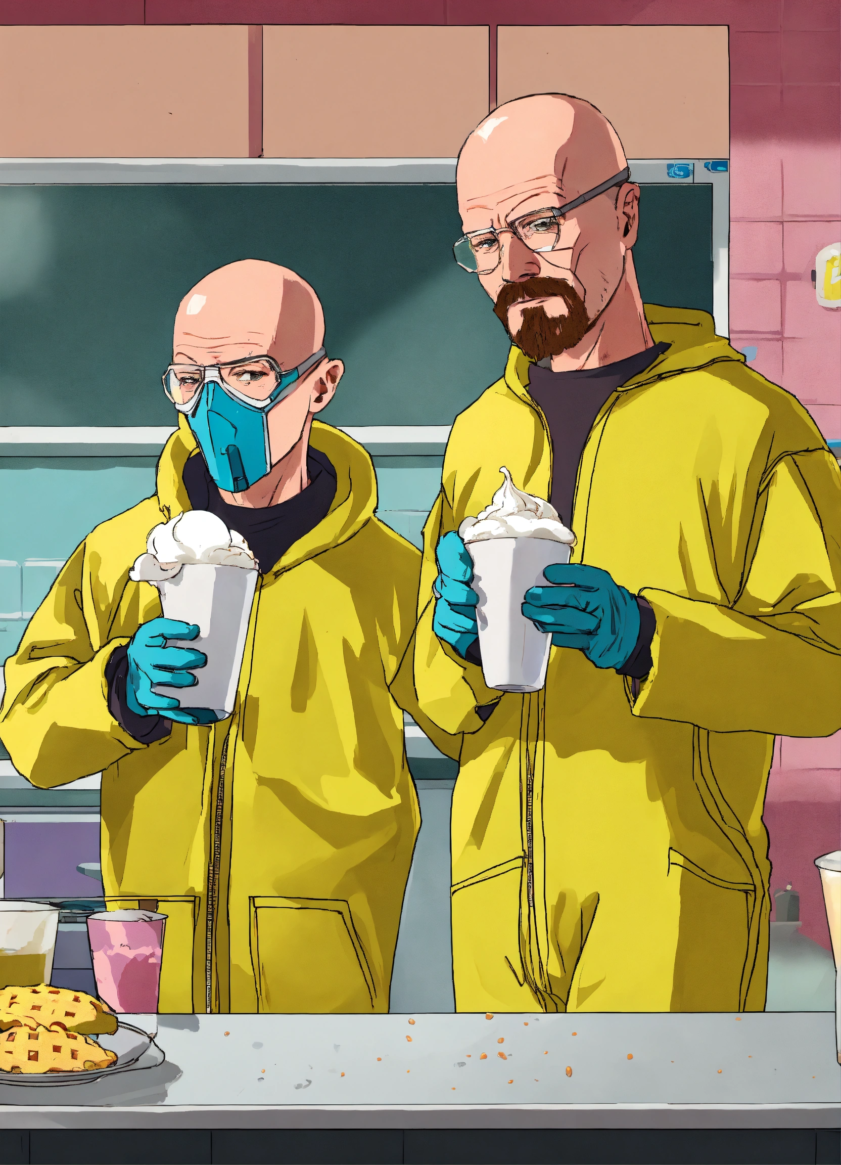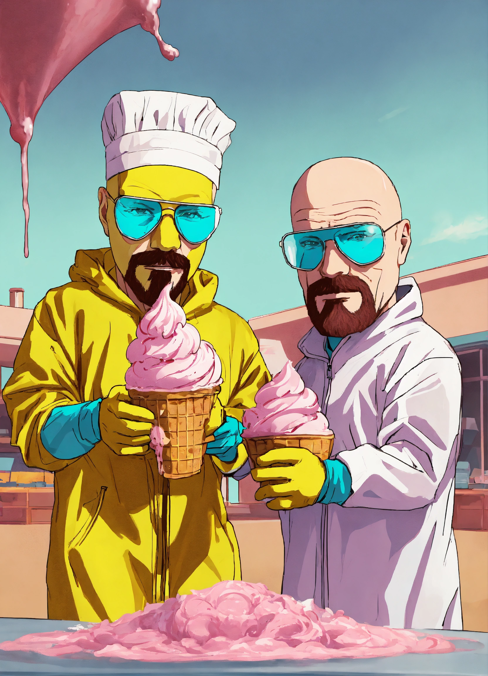 Jesse pinkman and walter white from breaking bad making ice cream. they're wearing hazmat suits. one is making ice cream, they other is holding a waffle cone ice cream cone. they are both looking at the camera style animated