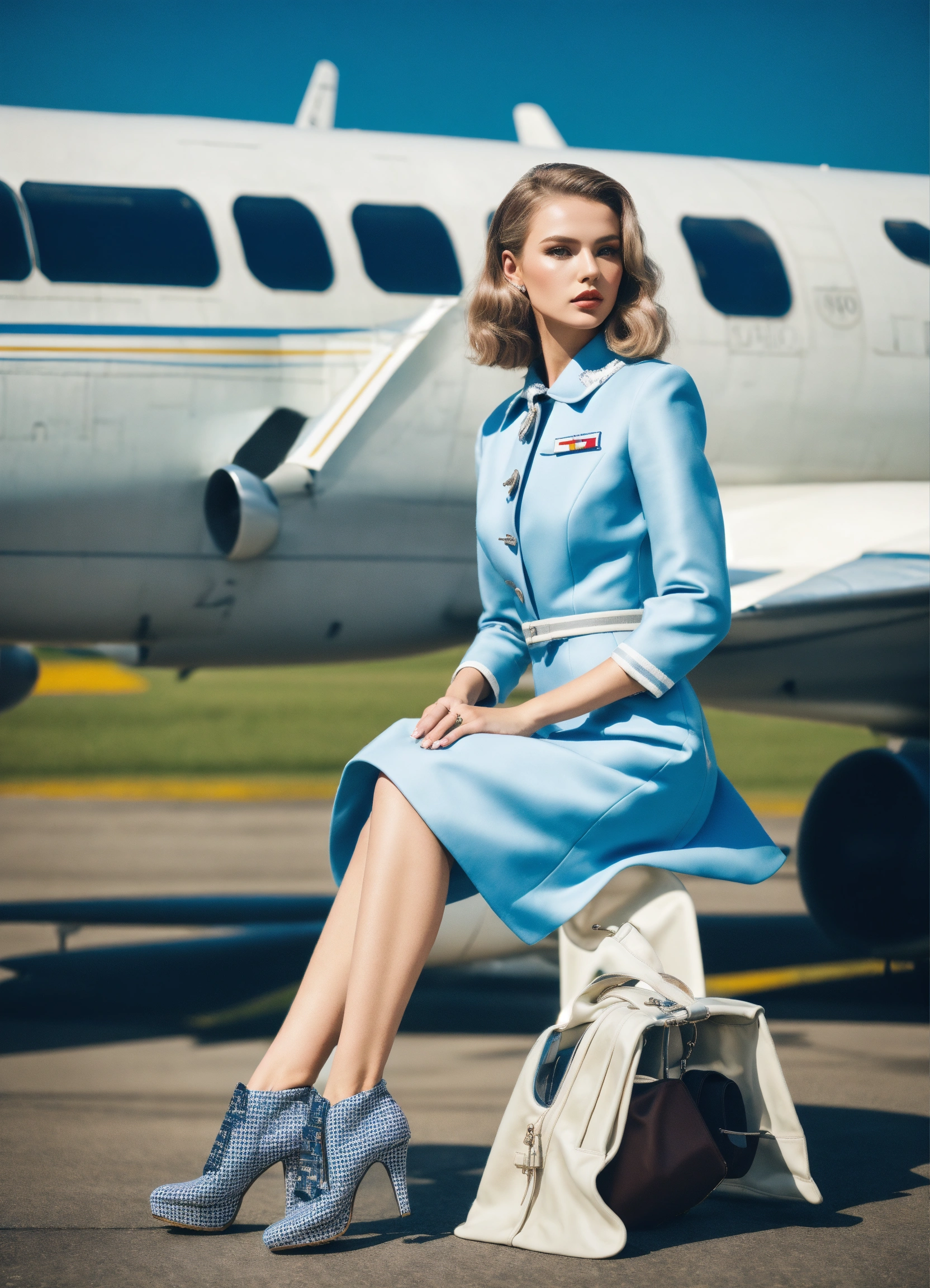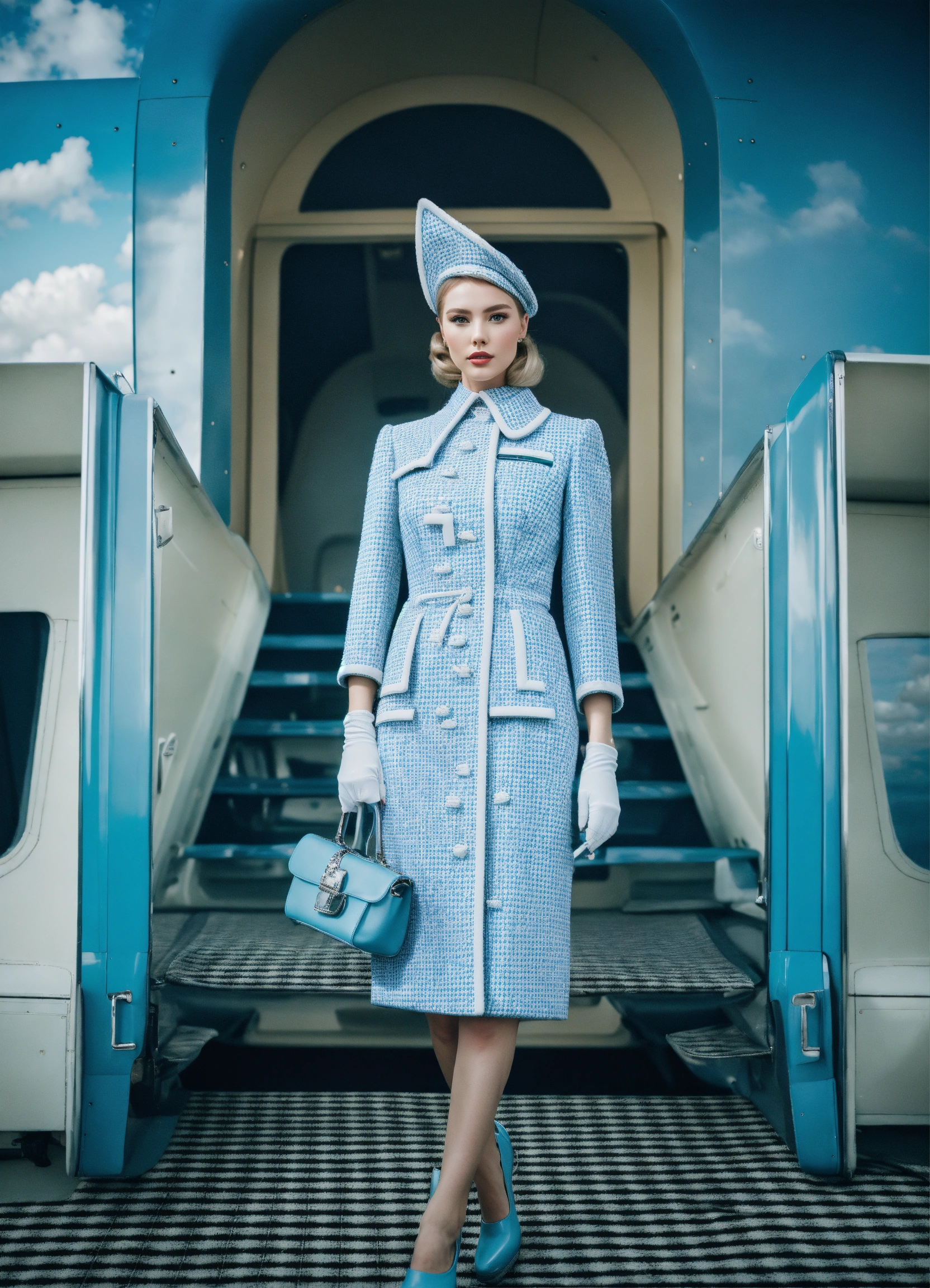 Portrait of haute couture beautiful russian fashion model editorial, white and chrome, structured outfit, platform shoes, iso 400, surrealistic, 8k, full frame, landscape, architecture, airplane, flight attendant, tweed dress in light blue, light blue houndstooth, airplane with text " air loulou "