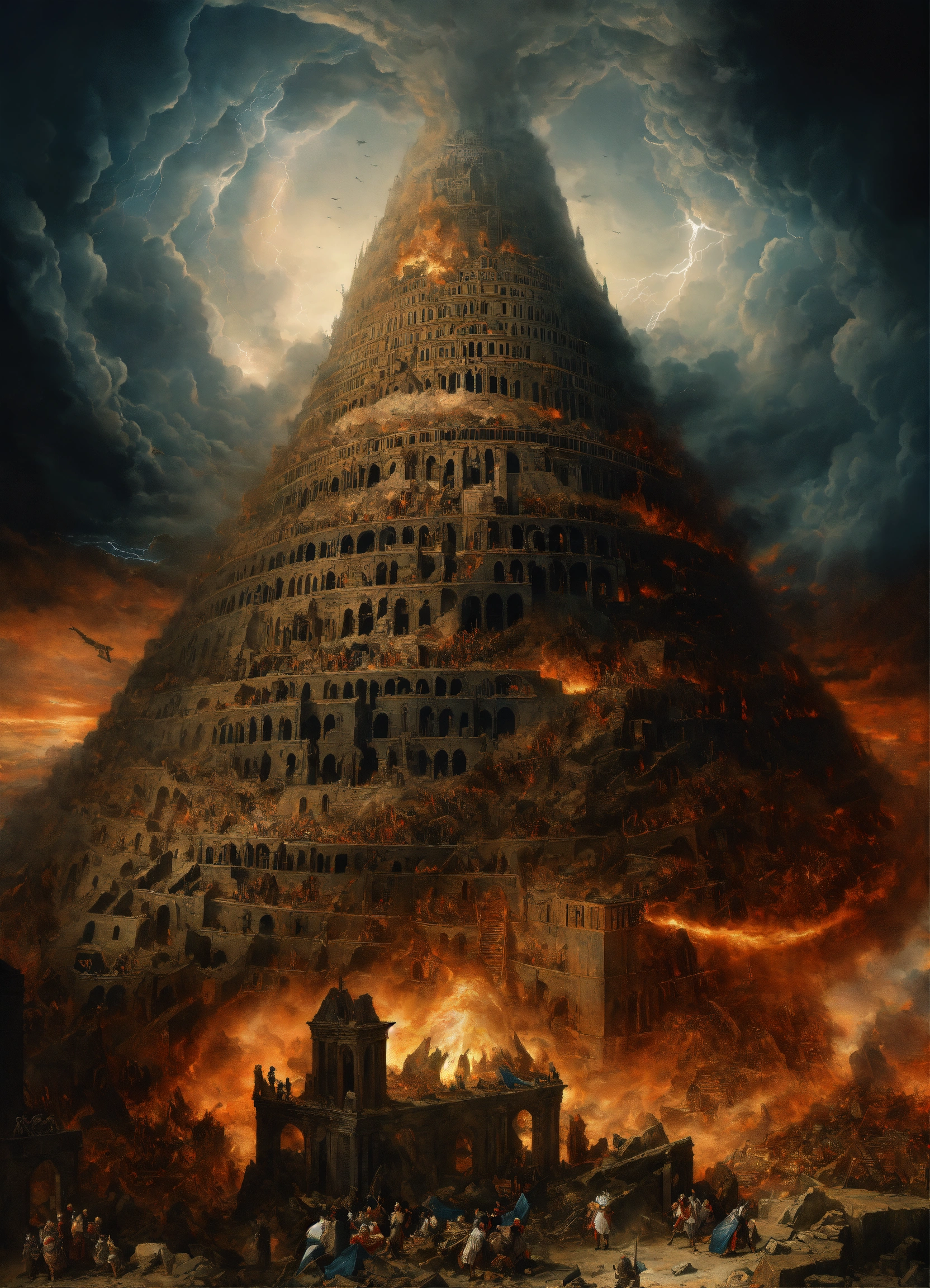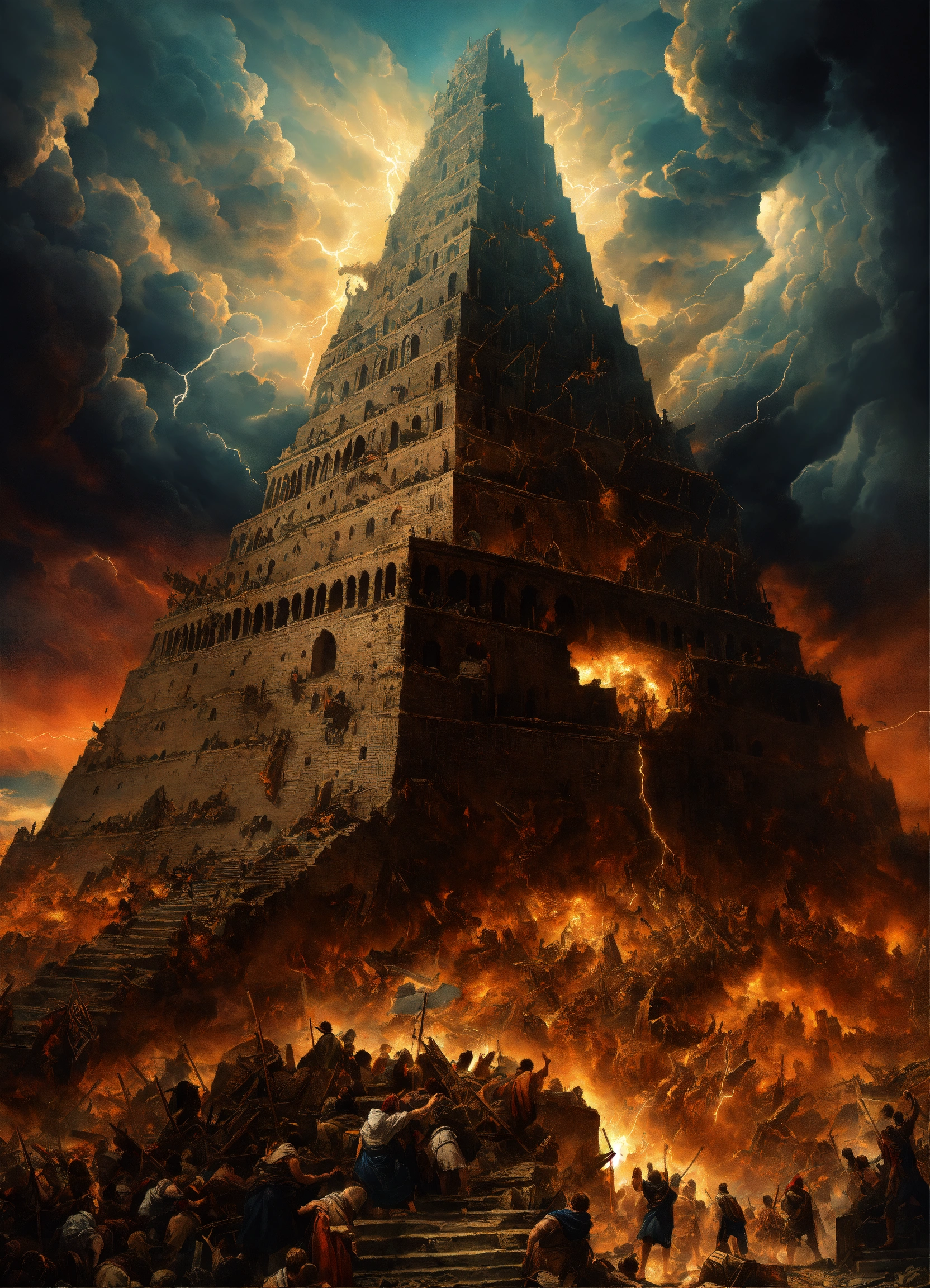 Hand of god descending from sky to destroy the tower of babel, sharp color, pandemonium, chaotic scene, intricately detailed, foreboding, intense, dark clouds, wrath of god descending, lightning, symmetrical architecture