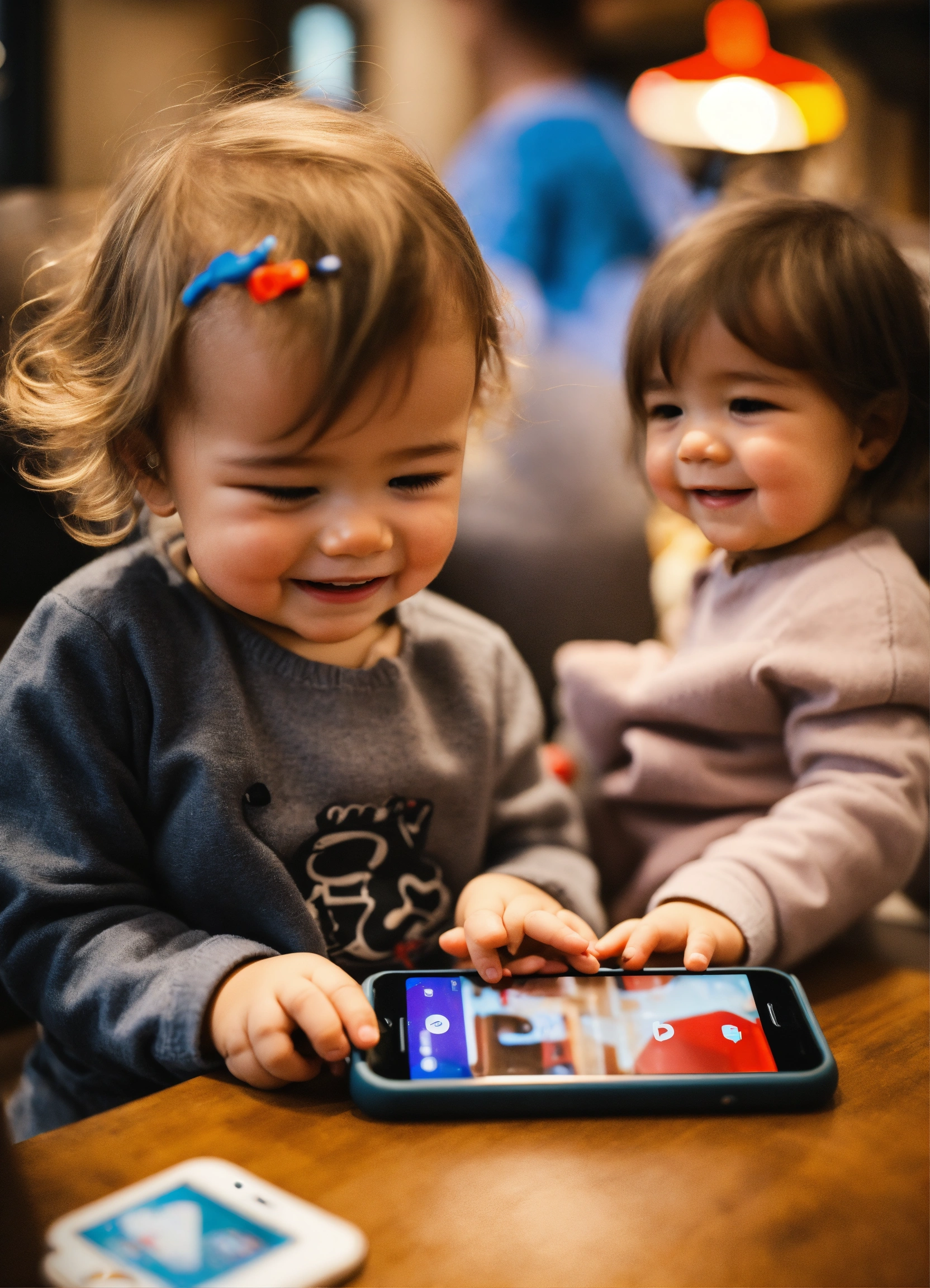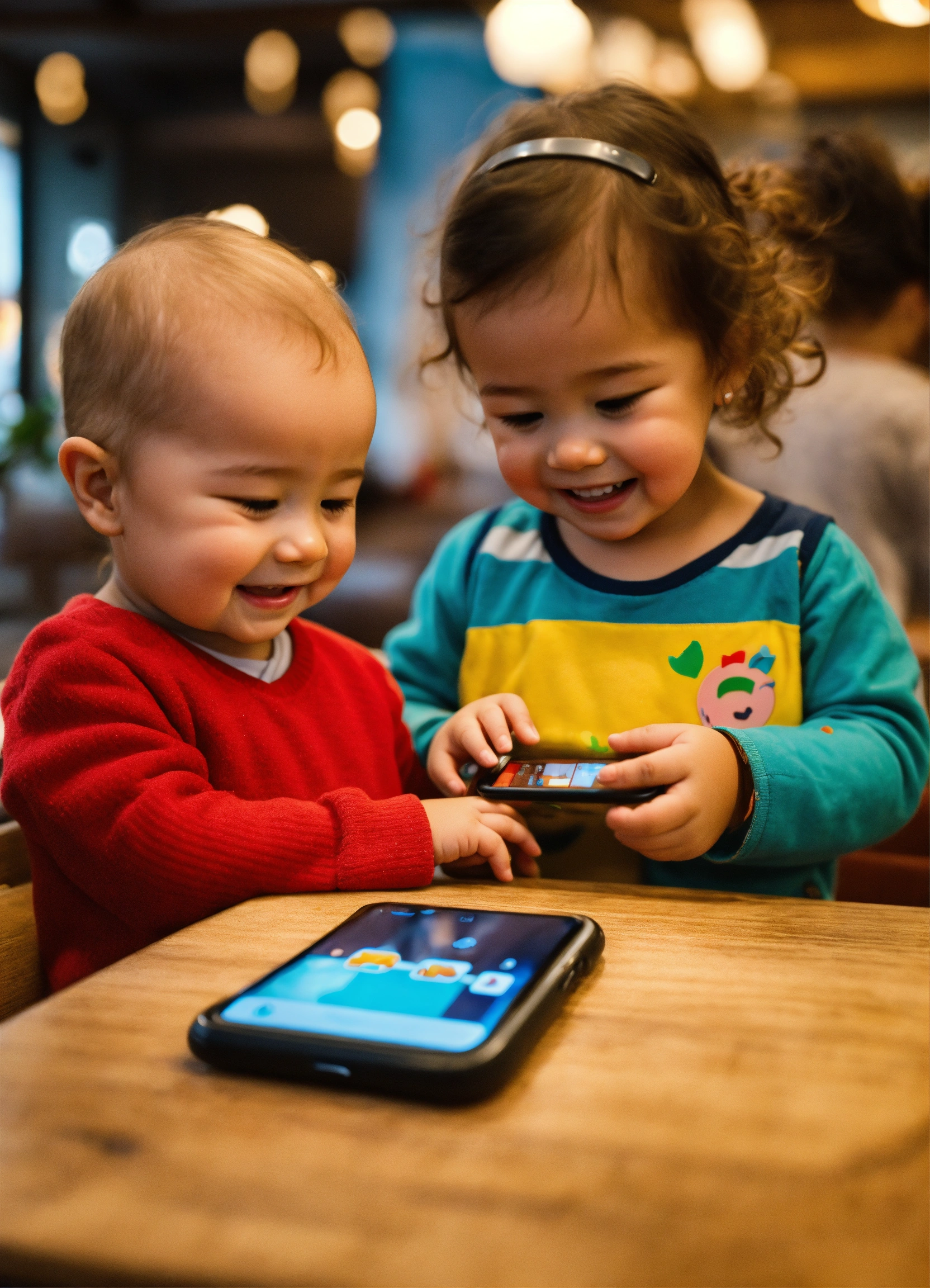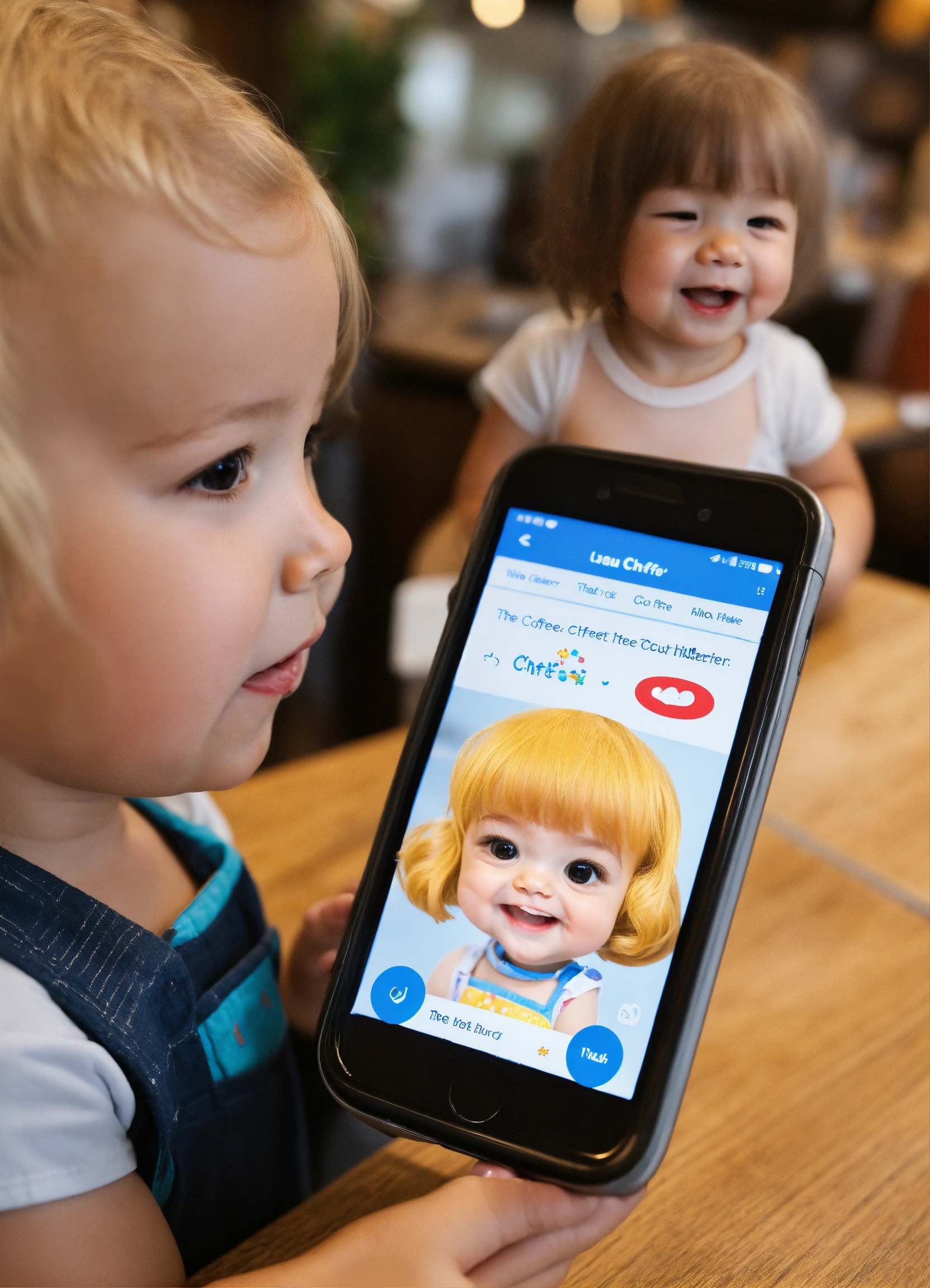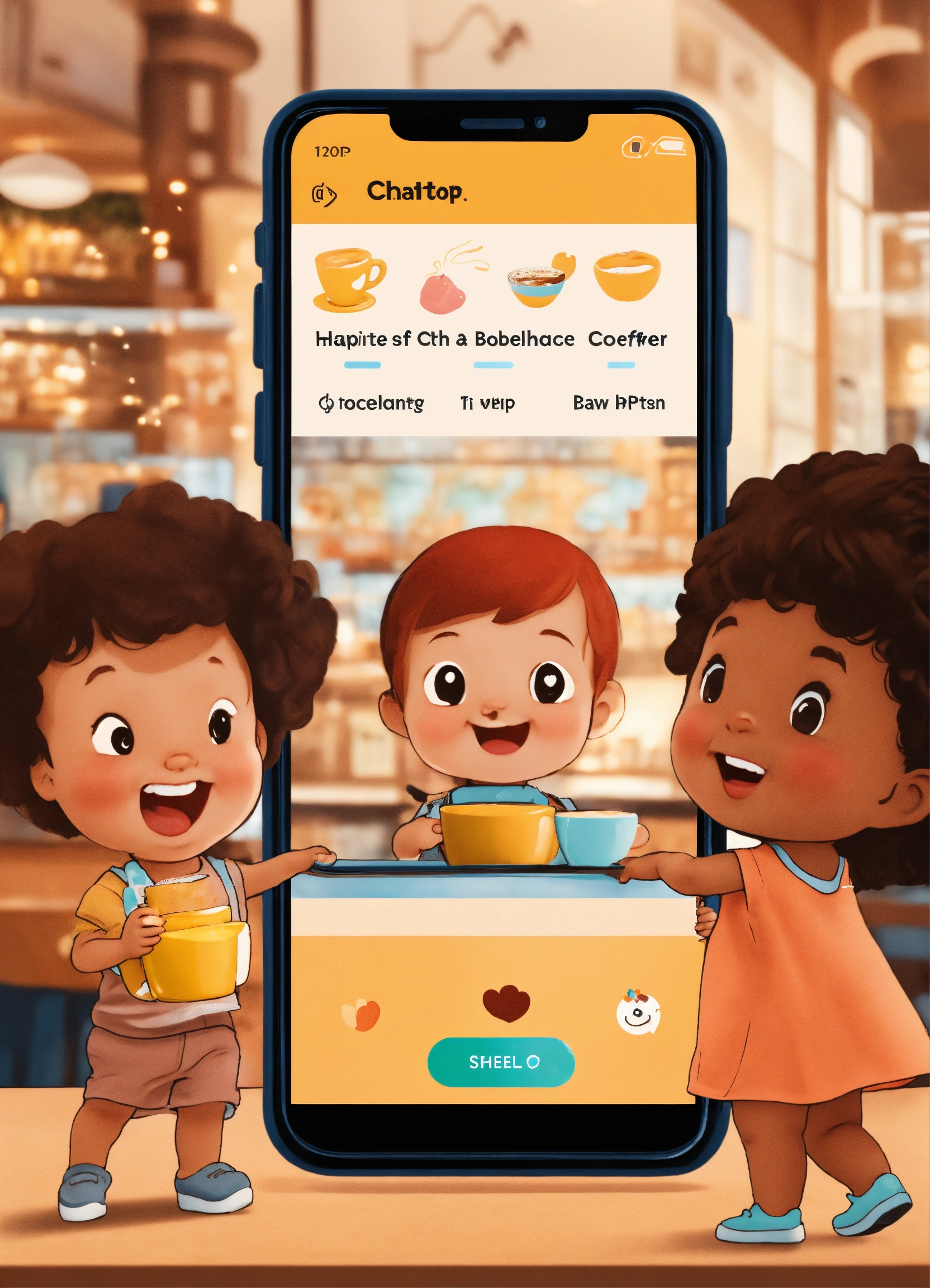 The chatgtp icon inside of the phone of a toddler showing another toddler how to use it at a coffee shop, happiness in the face of the other toddler who just got all this time back