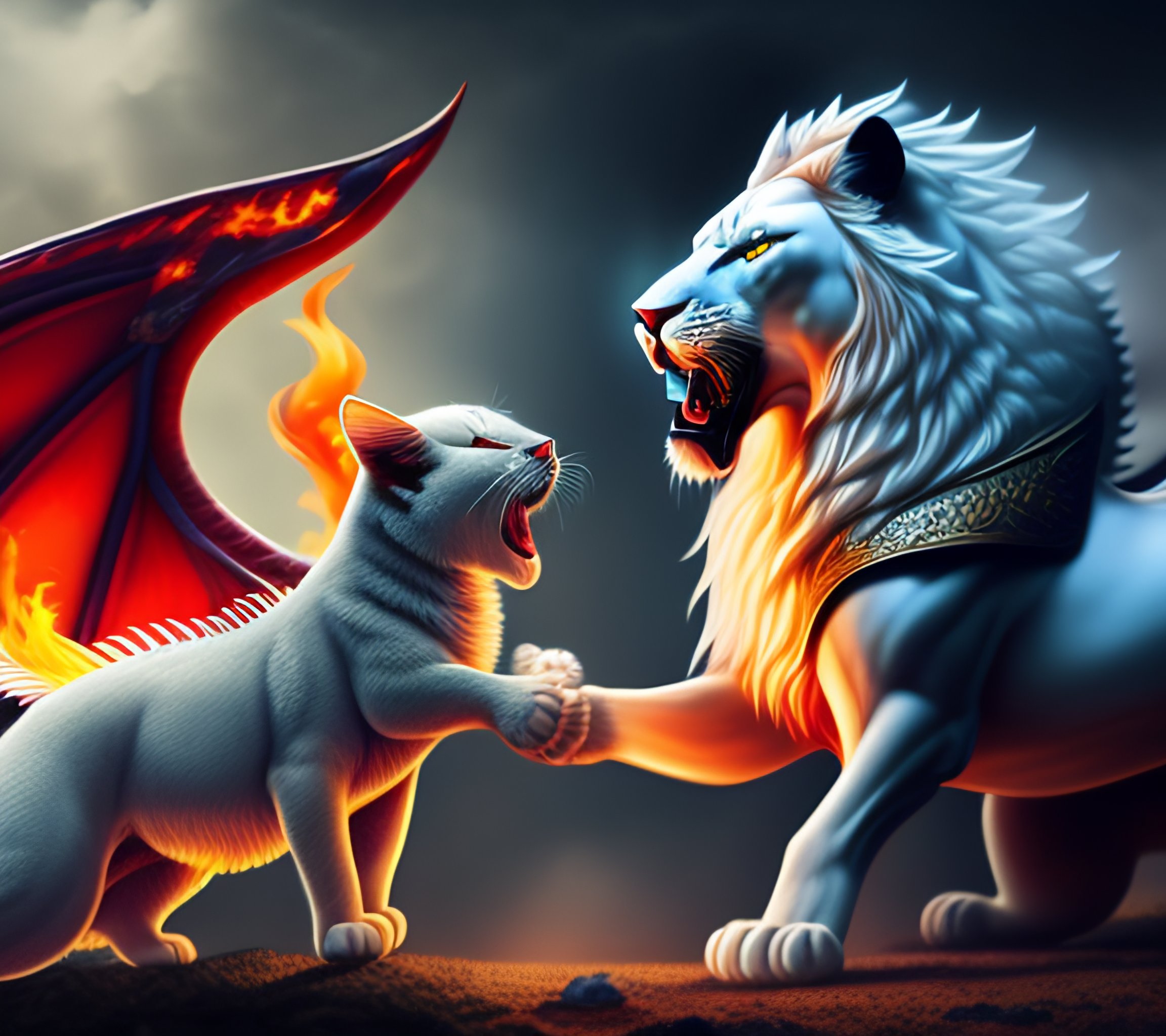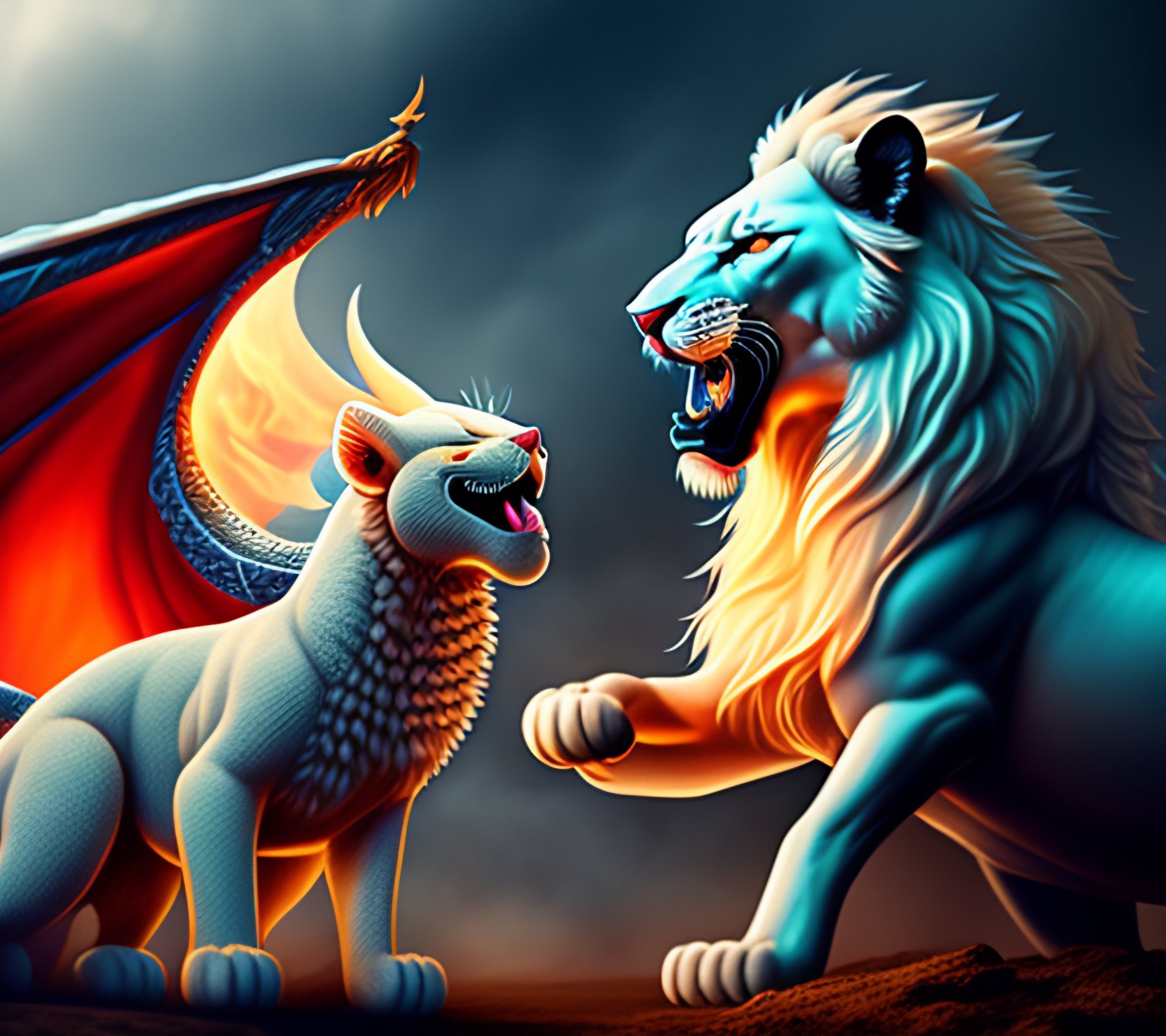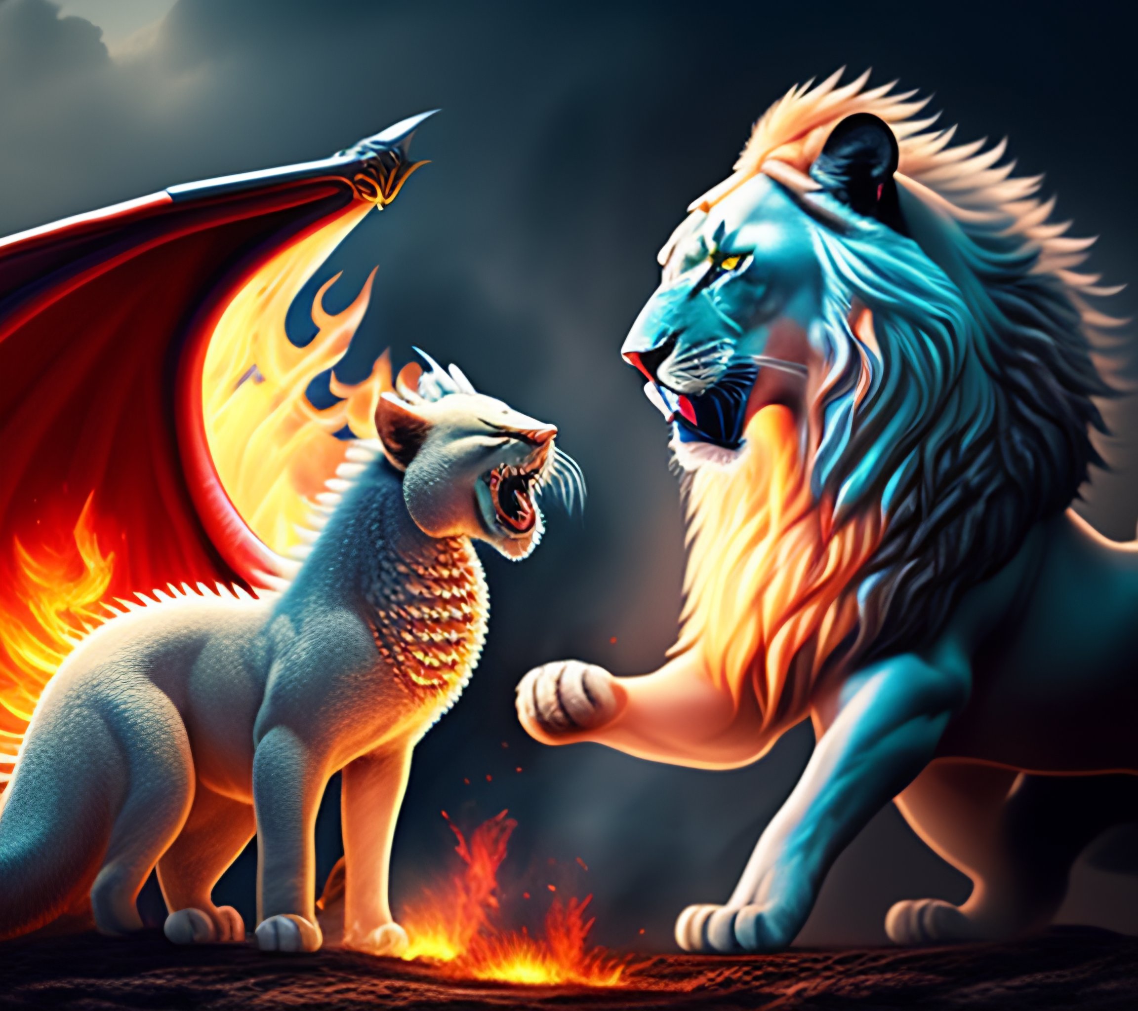 I need the image of a white dragon with a dragon face and wings spewing fire and is fighting a smaller lion