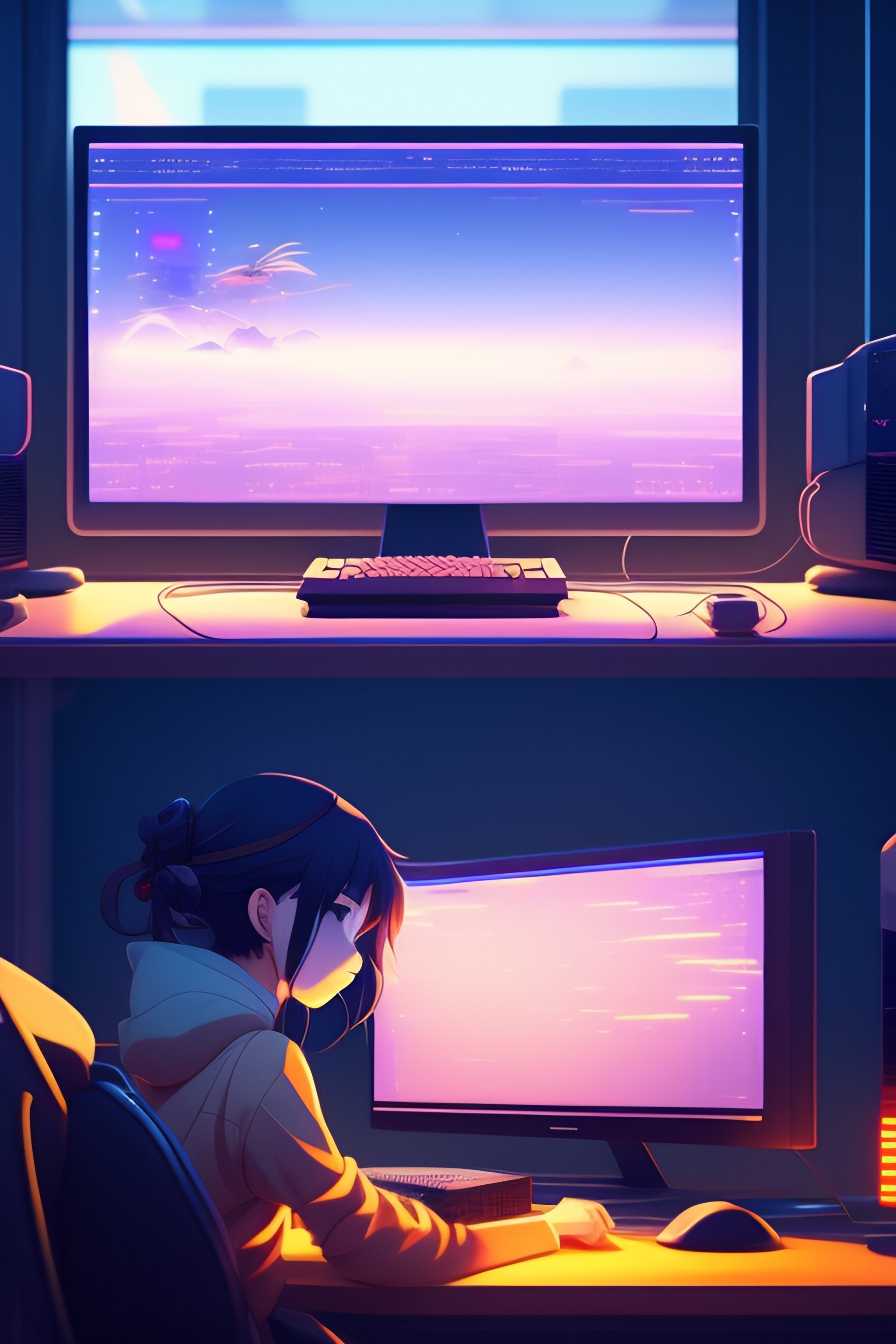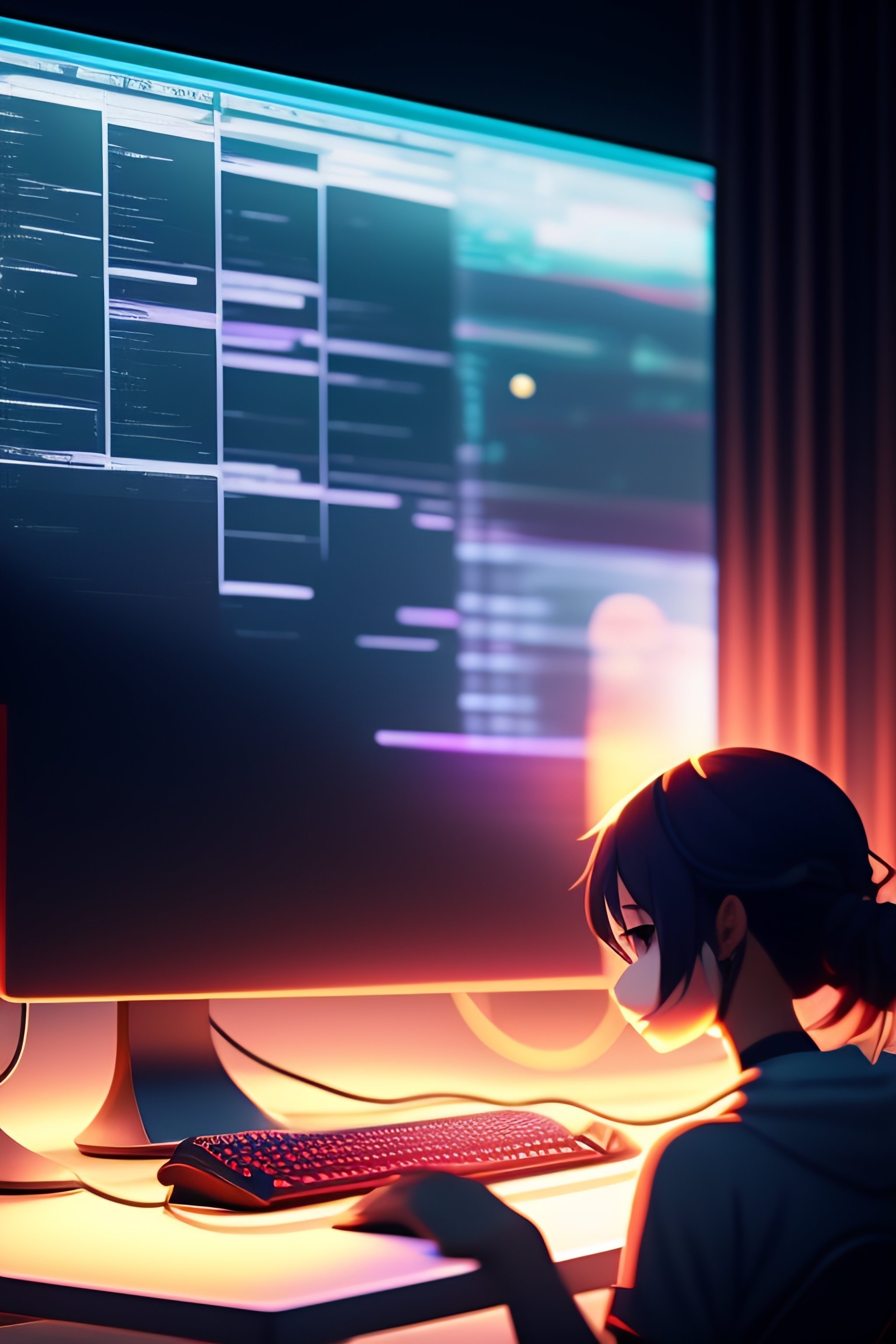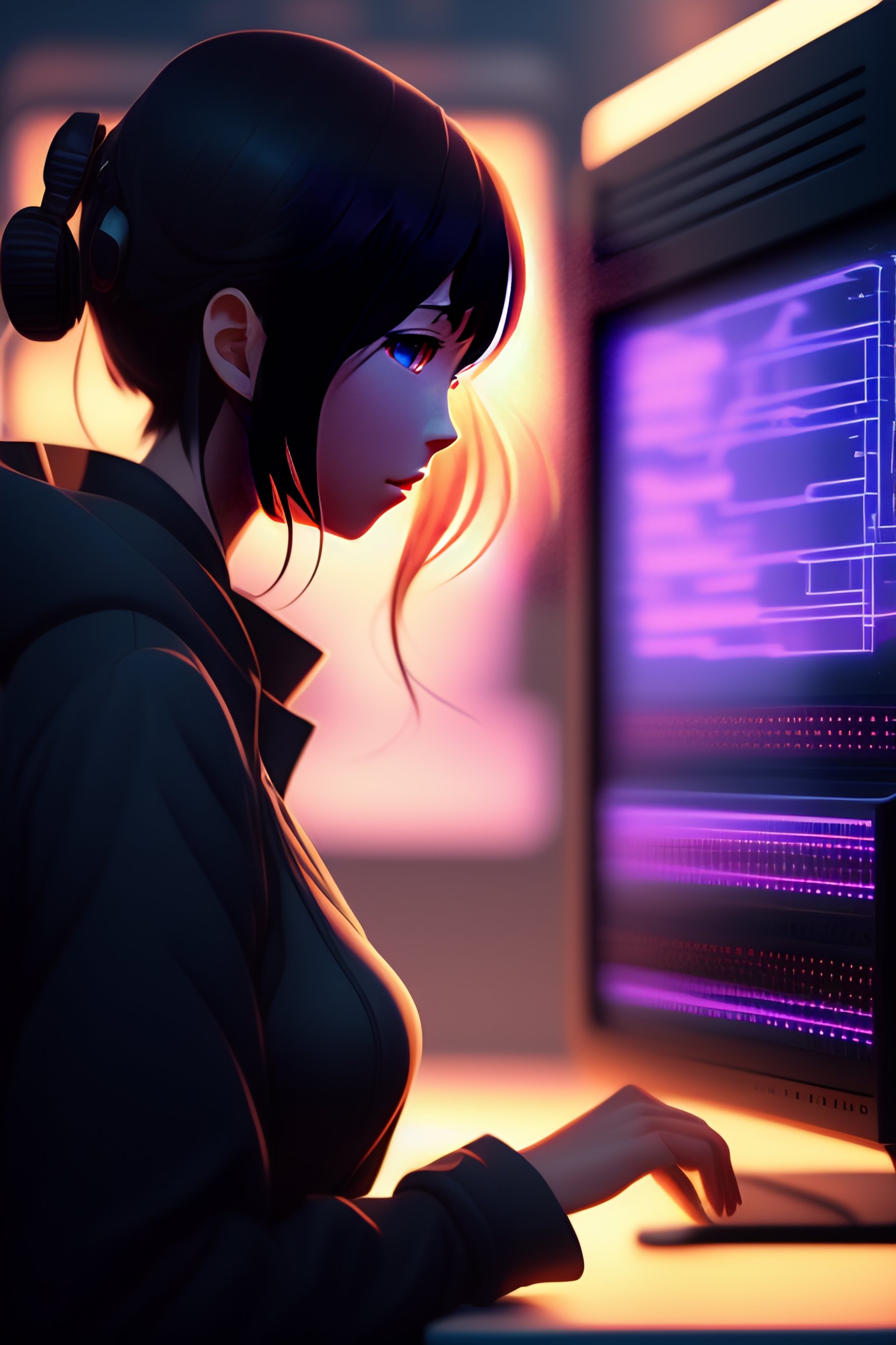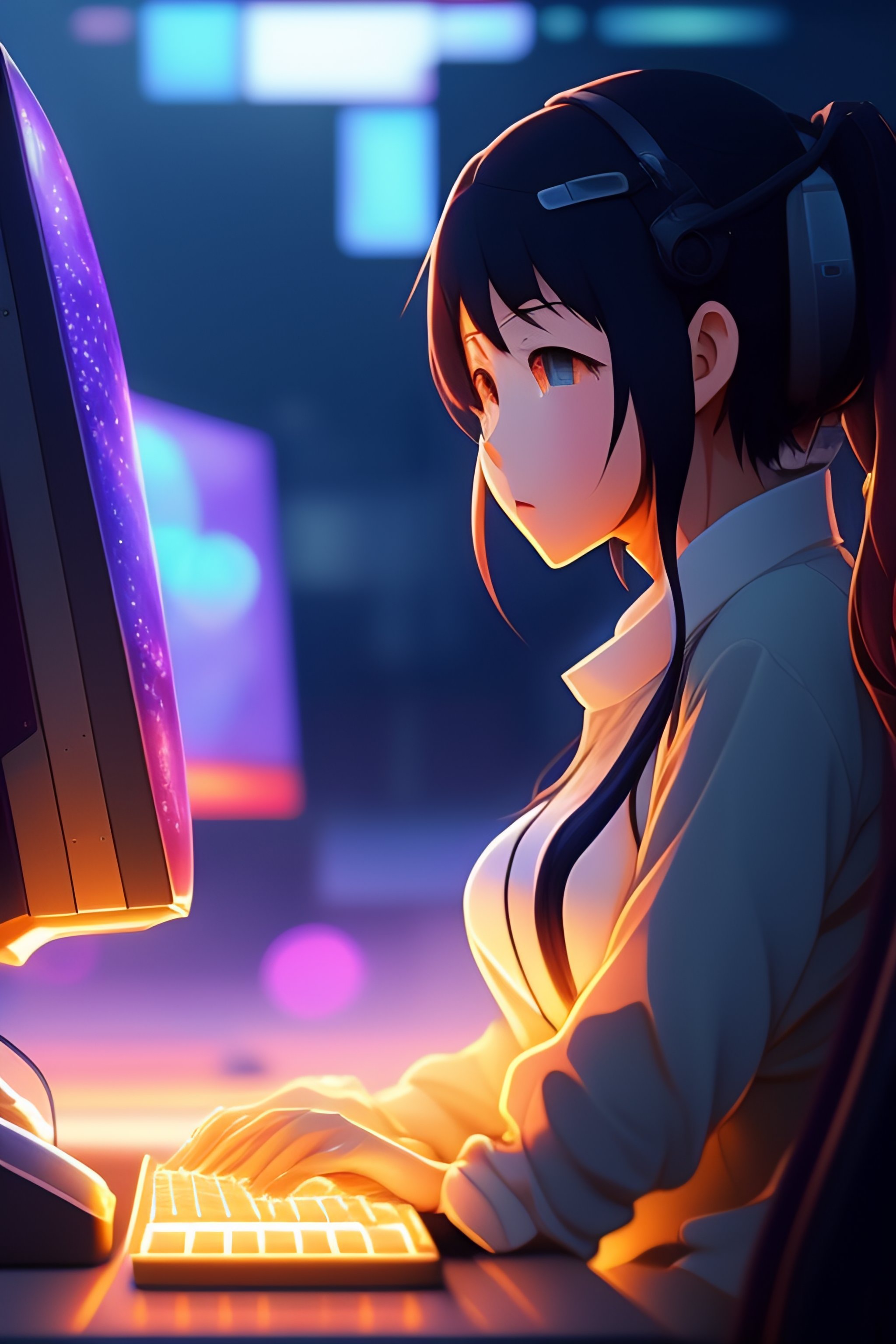 Create a high resolution artwork of anime girl is programming at a computer in a room full of gadgets, web developer, by makoto shinkai and ghibli studio, outlined silhouettes, dramatic lighting, highly detailed, incredible quality, trending on artstation, masterpiece, 8k