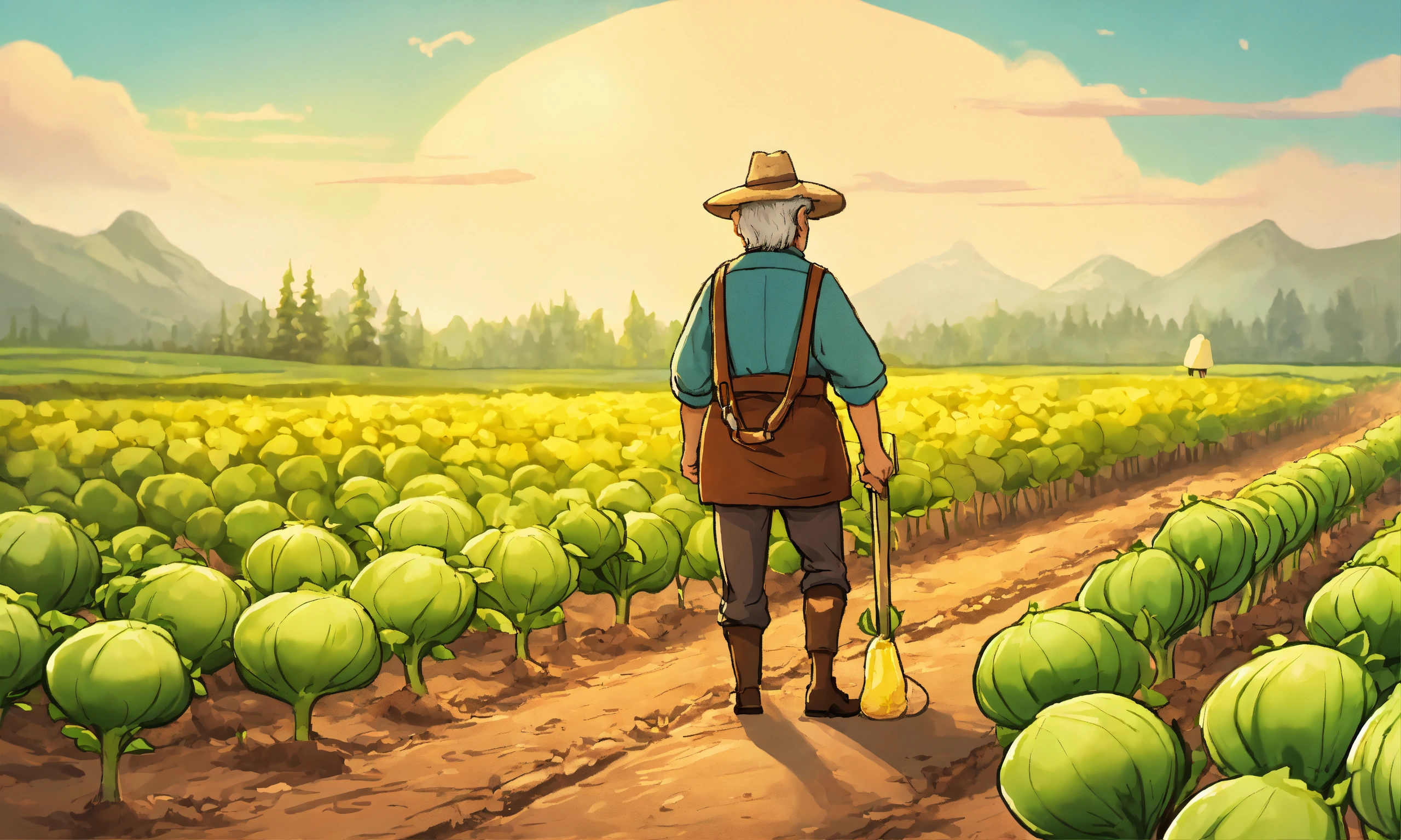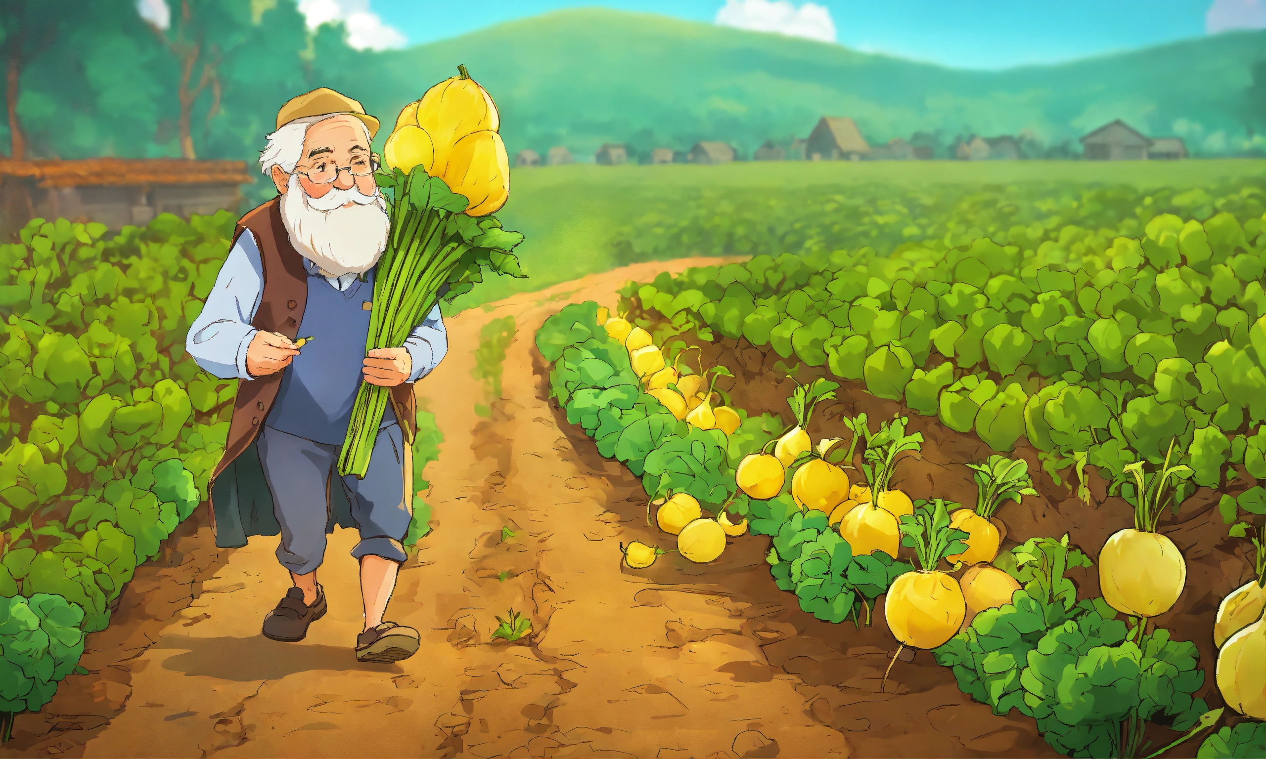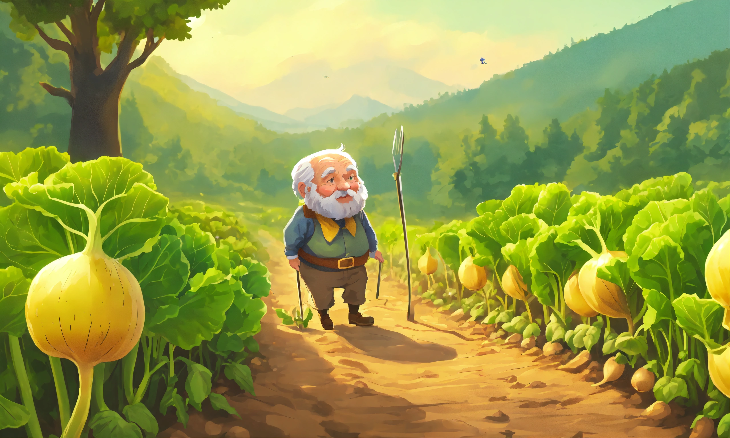 Cartoon style one huge yellow turnip is growing in the field, cute old man is going on the trail from the village towards the turnip, the turnip is still in the ground and the old man is on the other side of the screen