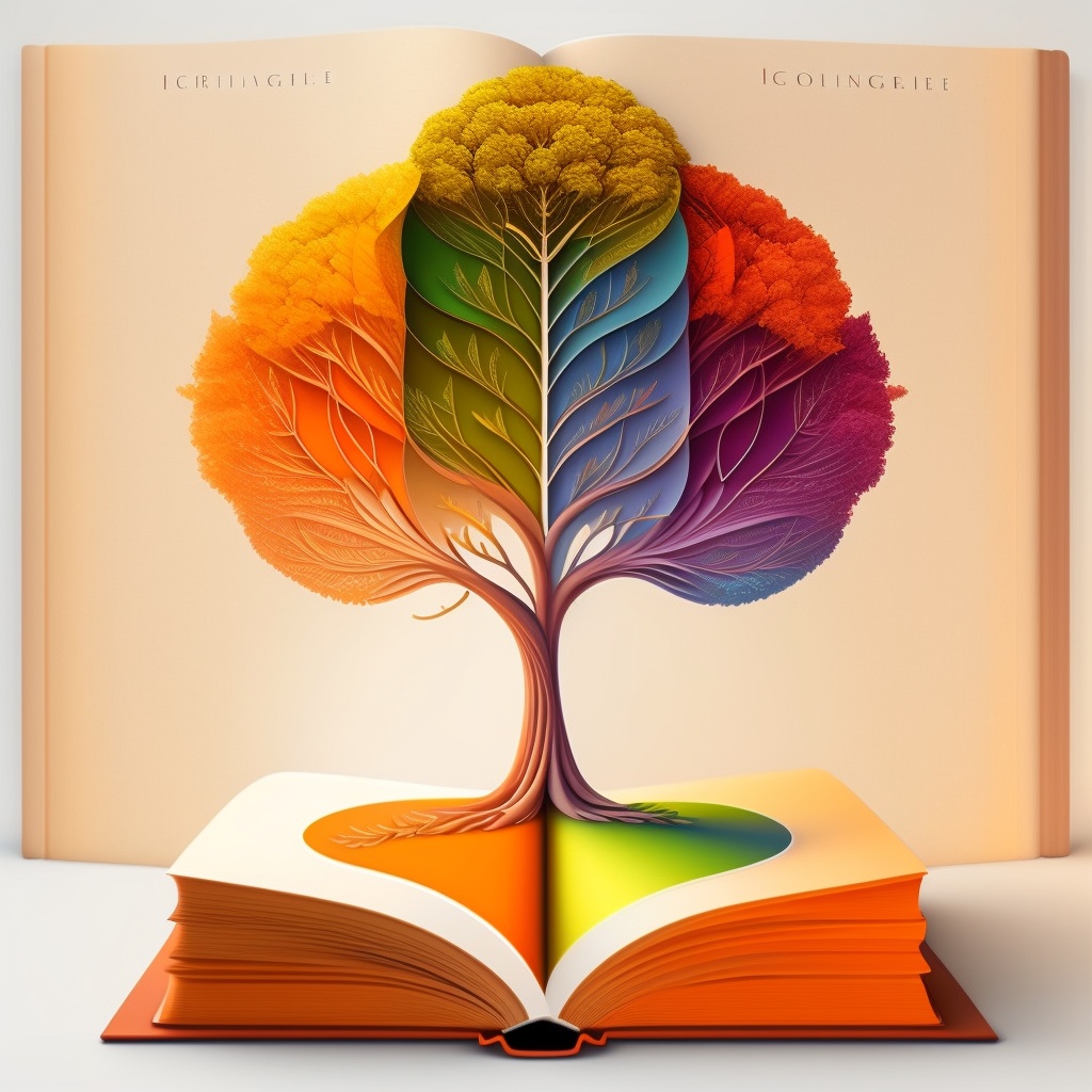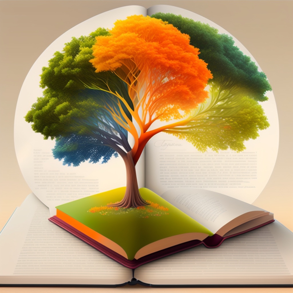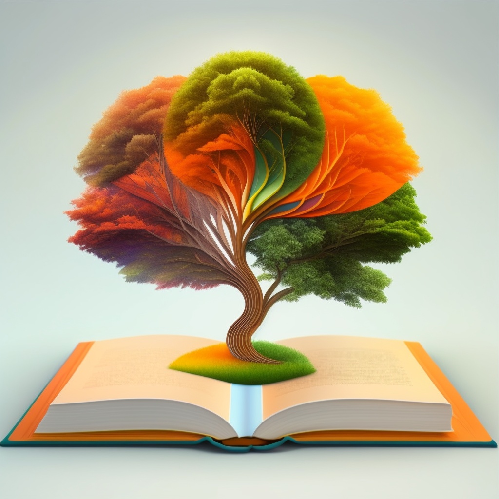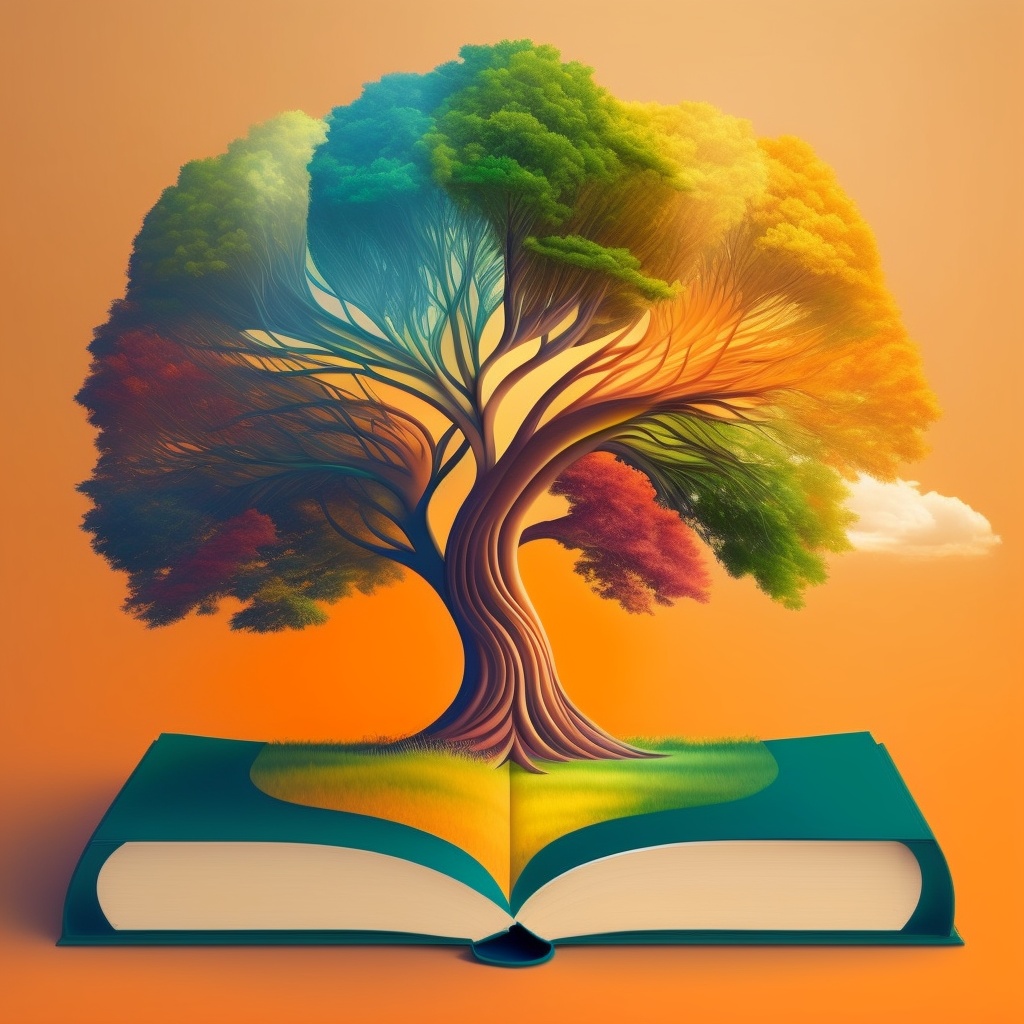 Incorporate an image of an open book with a vibrant and flourishing tree growing out of its pages. the book should be positioned vertically with the tree sprouting from its center, symbolizing growth and knowledge. use a combination of soft and bold colors to highlight the beauty of the tree, such as shades of green, yellow, and orange. the tree's leaves should contain different shades of these colors, representing the diversity and abundance of knowledge within the book. use this image style for the concept: vector illustration.