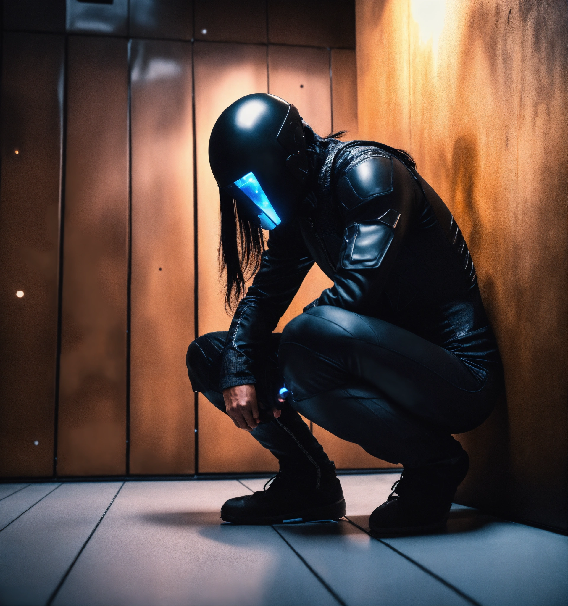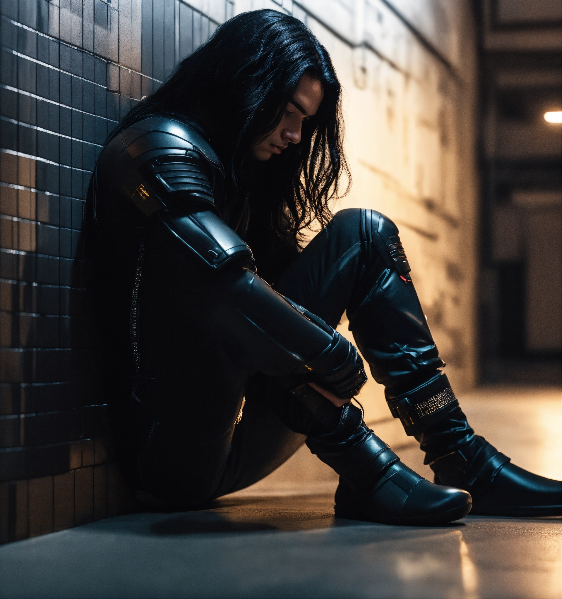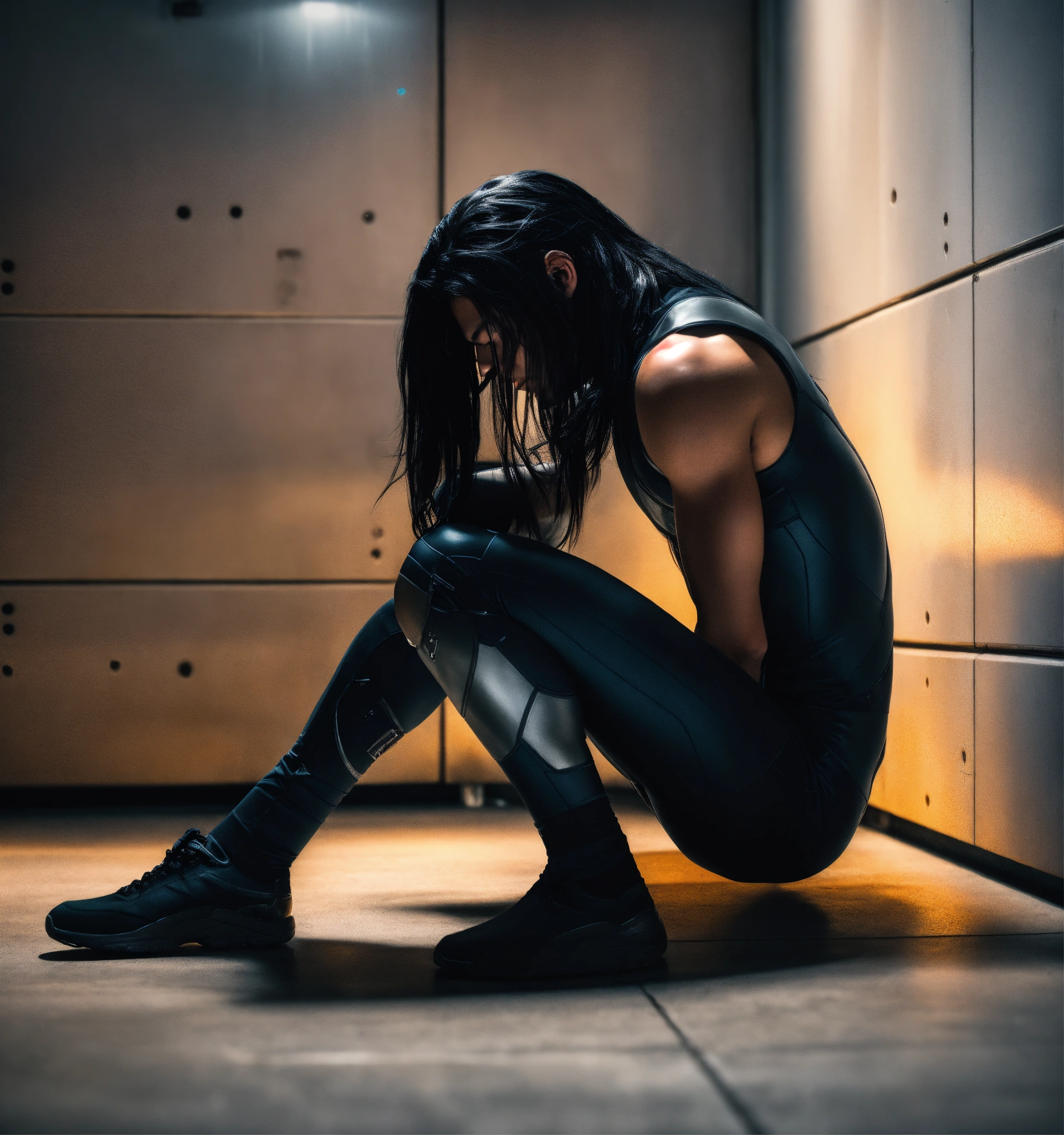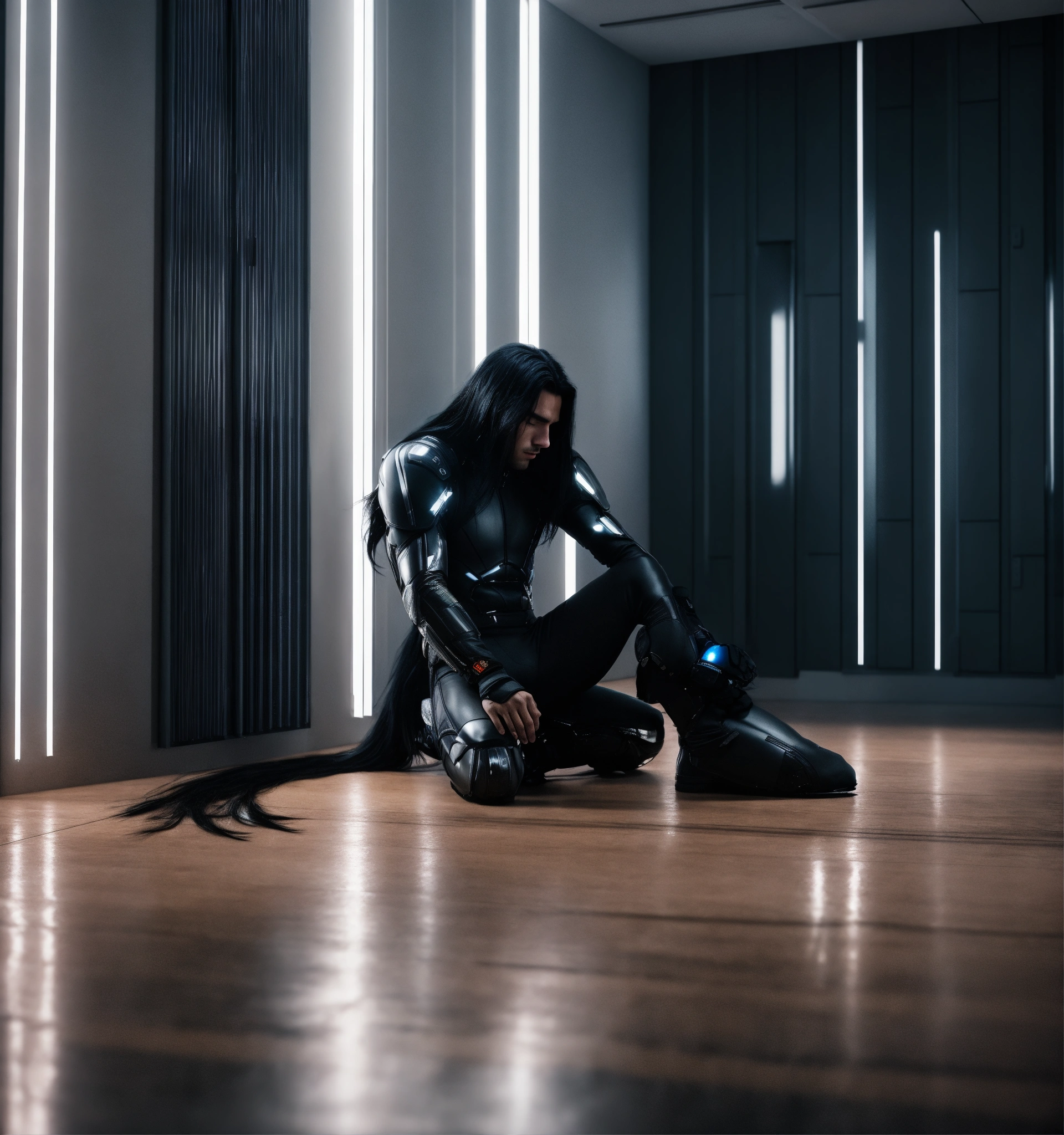 A realistic dark photo taken from above of a depressed strong 20-year-old boy, looking down to the ground, with very long black hair that covers his entire face, sitting in the corner on the floor, leaning back against the wall, looking down, wearing a black sci-fi tight suit, strong body, in a futuristic room with white metallic walls, dramatic illumination, hyperrealistic, 8 k